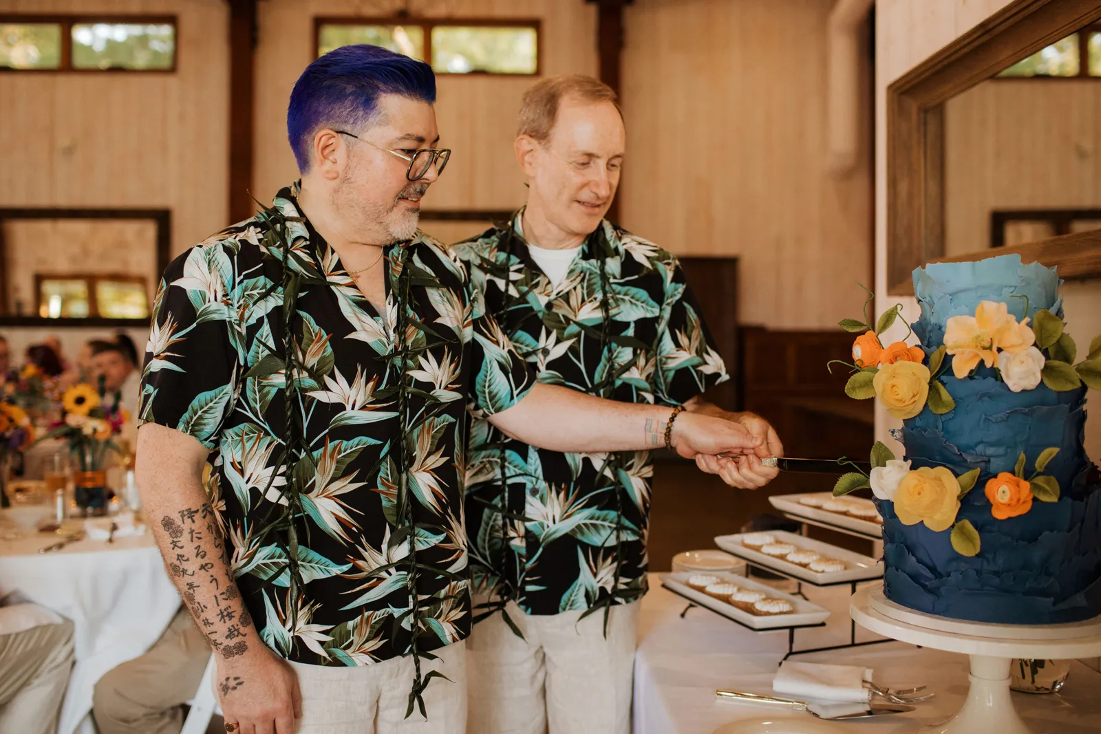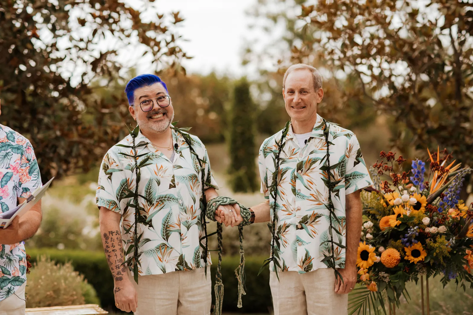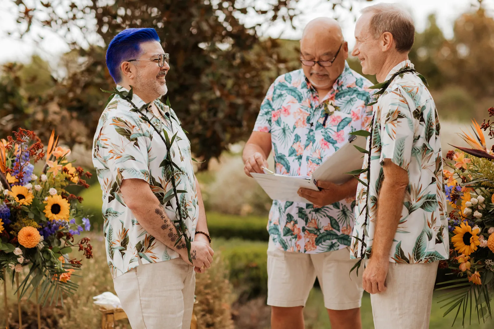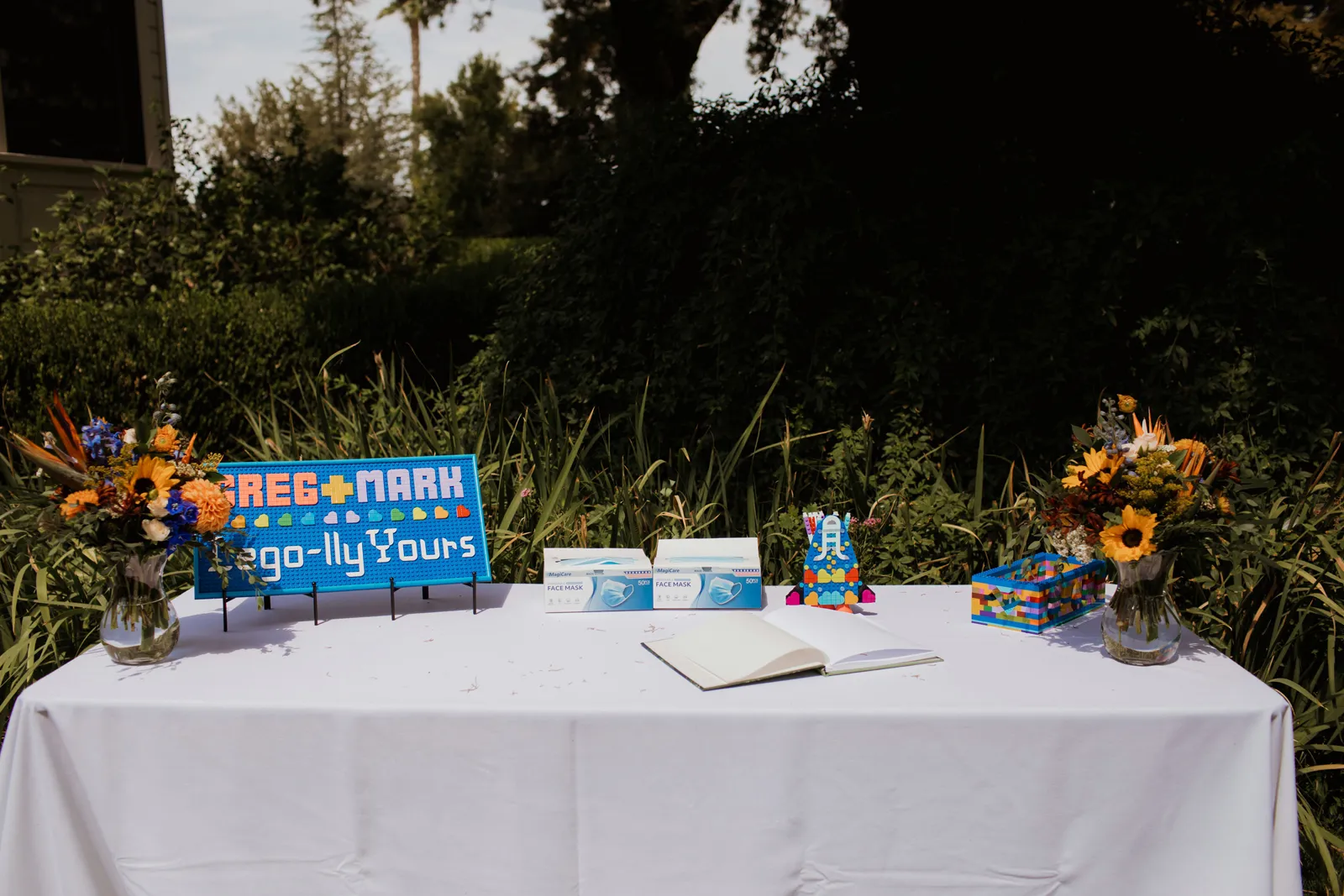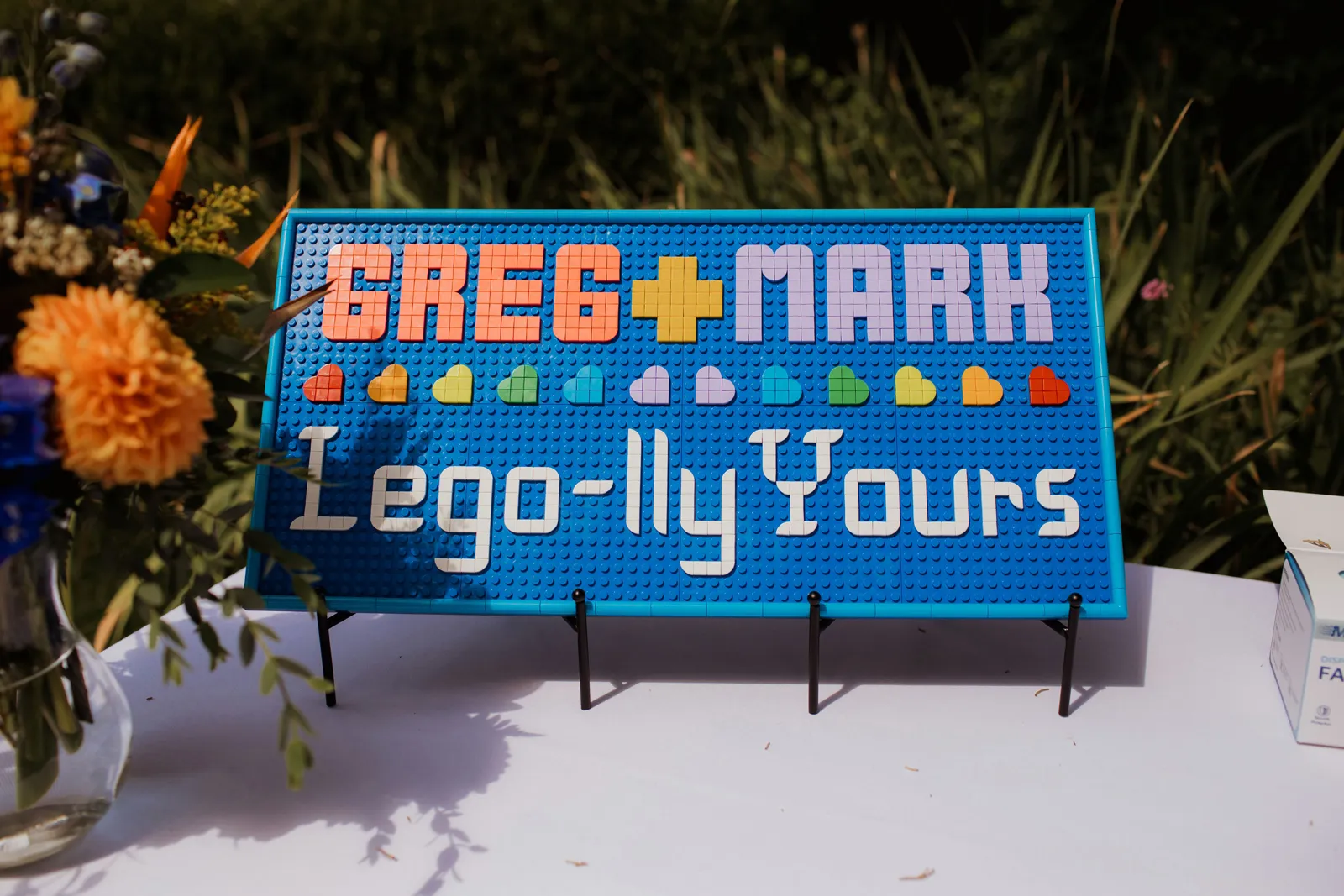Greg and I (Mark) met through an app; our first date was dinner and Star Wars: The Last Jedi. We dated for a year and moved in together almost a year after we met. Greg proposed to [me] using a Lego to hold the ring. After another year, we started planning for the wedding, looking for locations first, then getting recommendations for vendors from the location we chose and from friends and acquaintances.