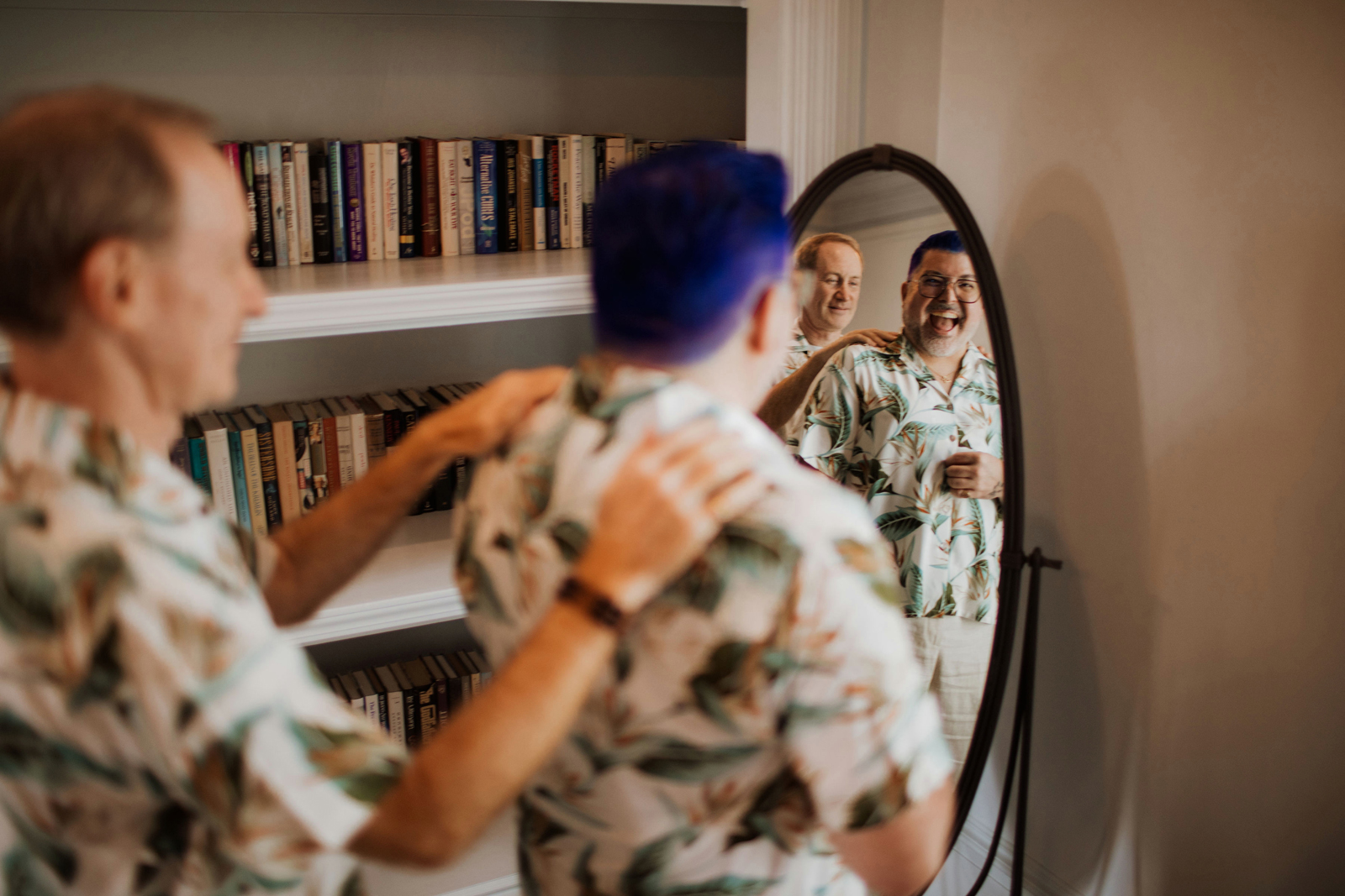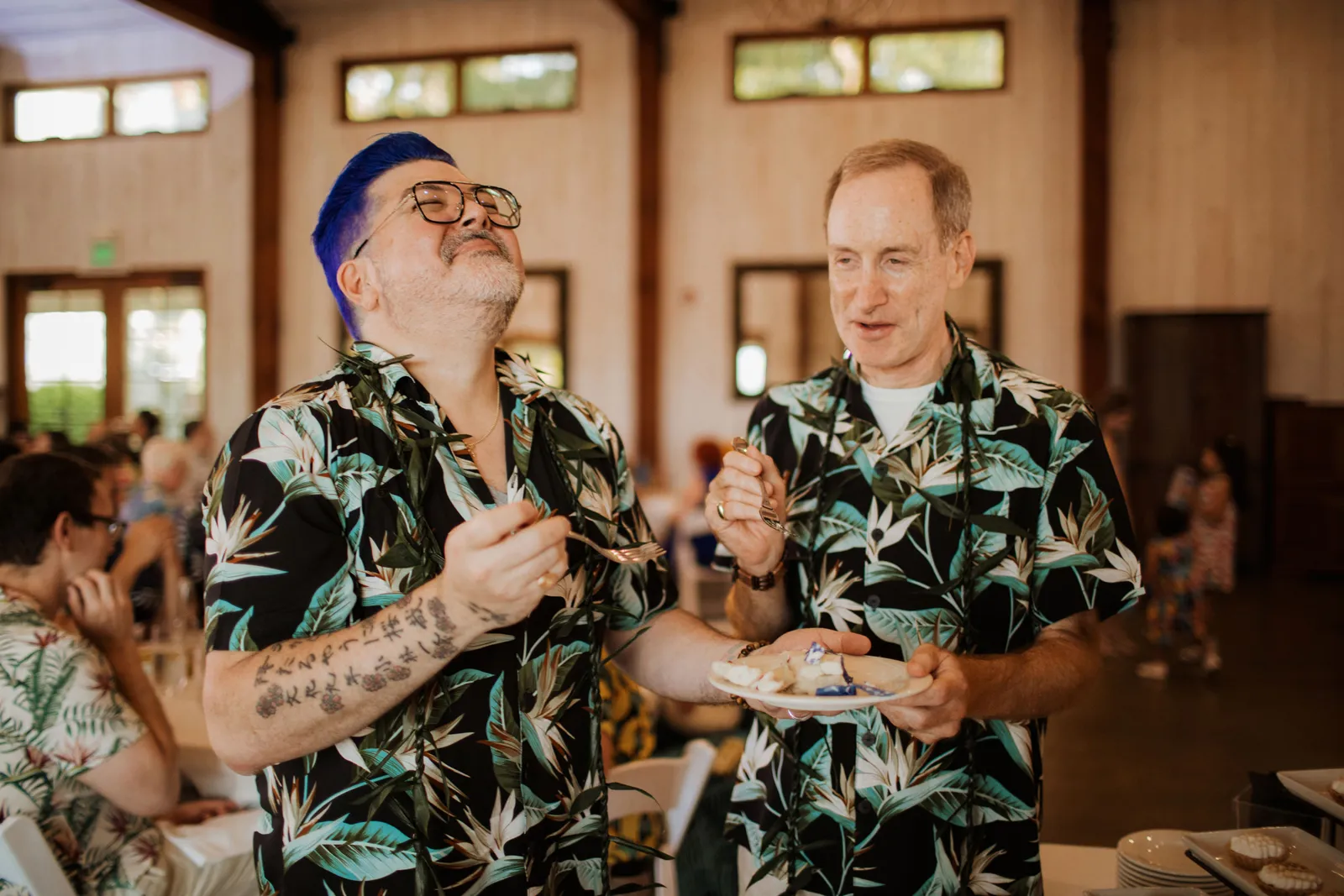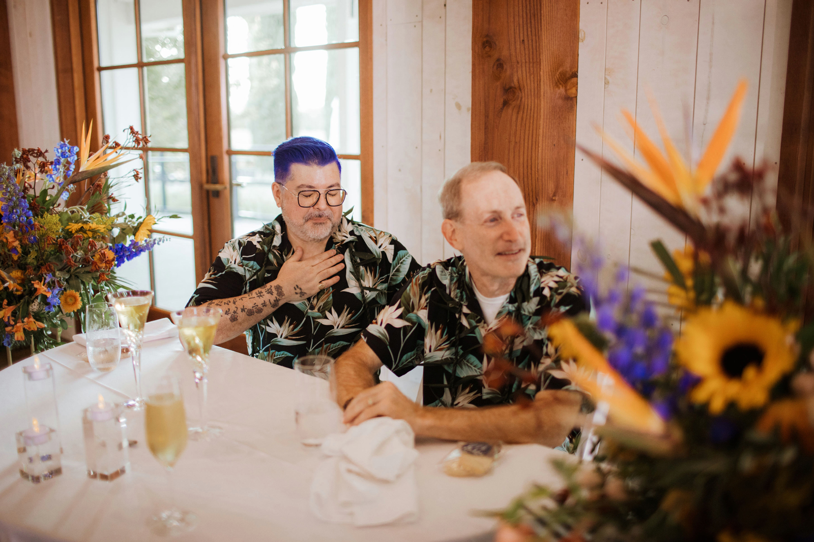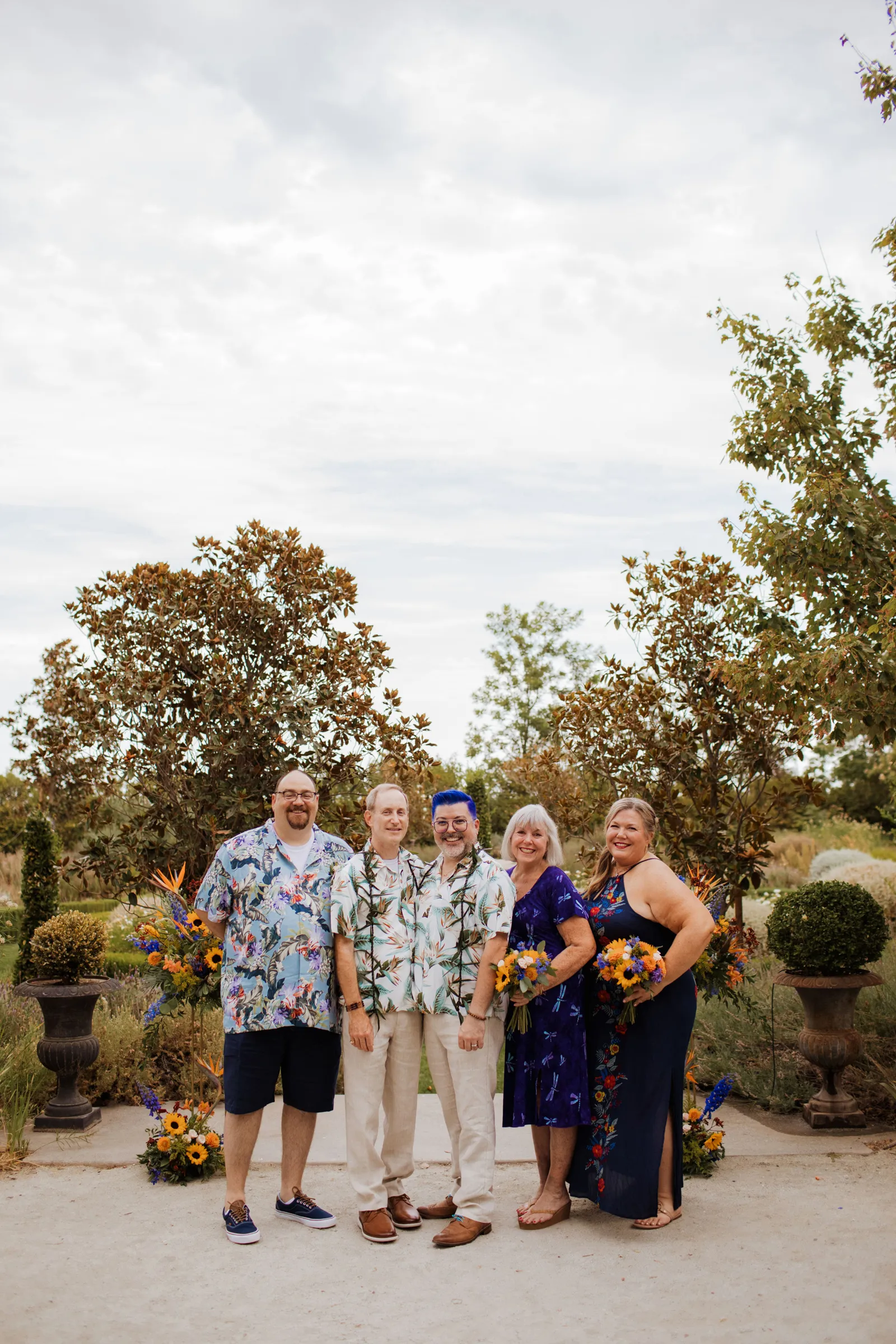 Greg and I (Mark) met through an app; our first date was dinner and Star Wars: The Last Jedi. We dated for a year and moved in together almost a year after we met. Greg proposed to [me] using a Lego to hold the ring. After another year, we started planning for the wedding, looking for locations first, then getting recommendations for vendors from the location we chose and from friends and acquaintances.