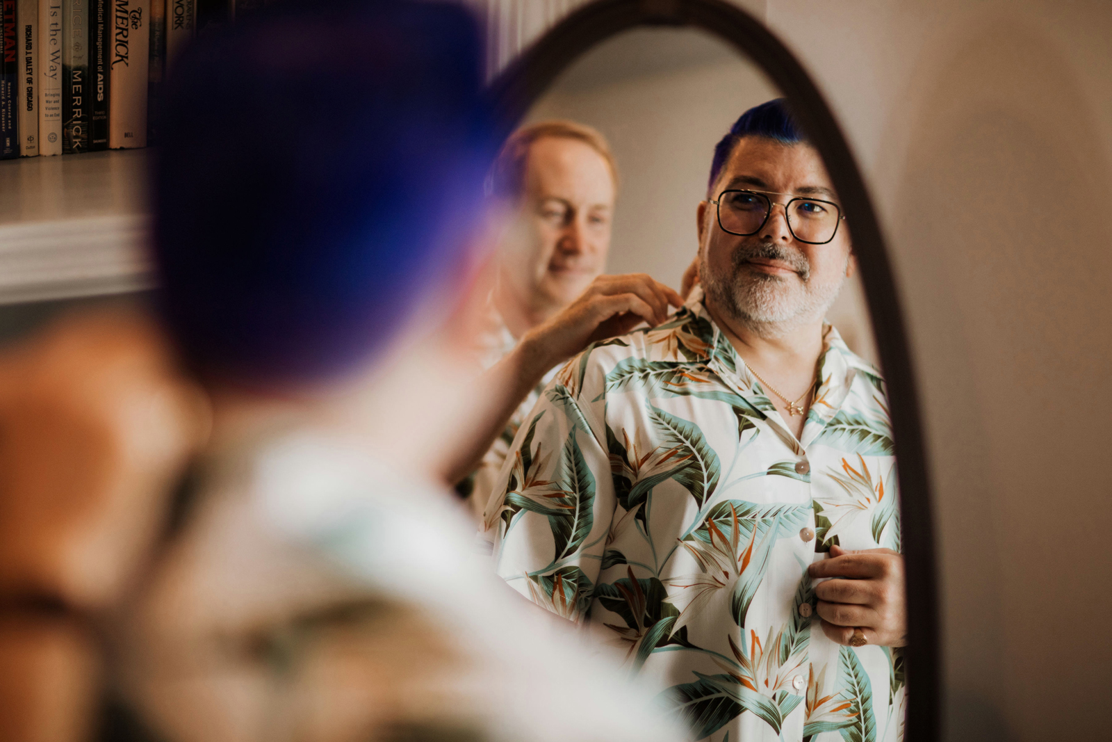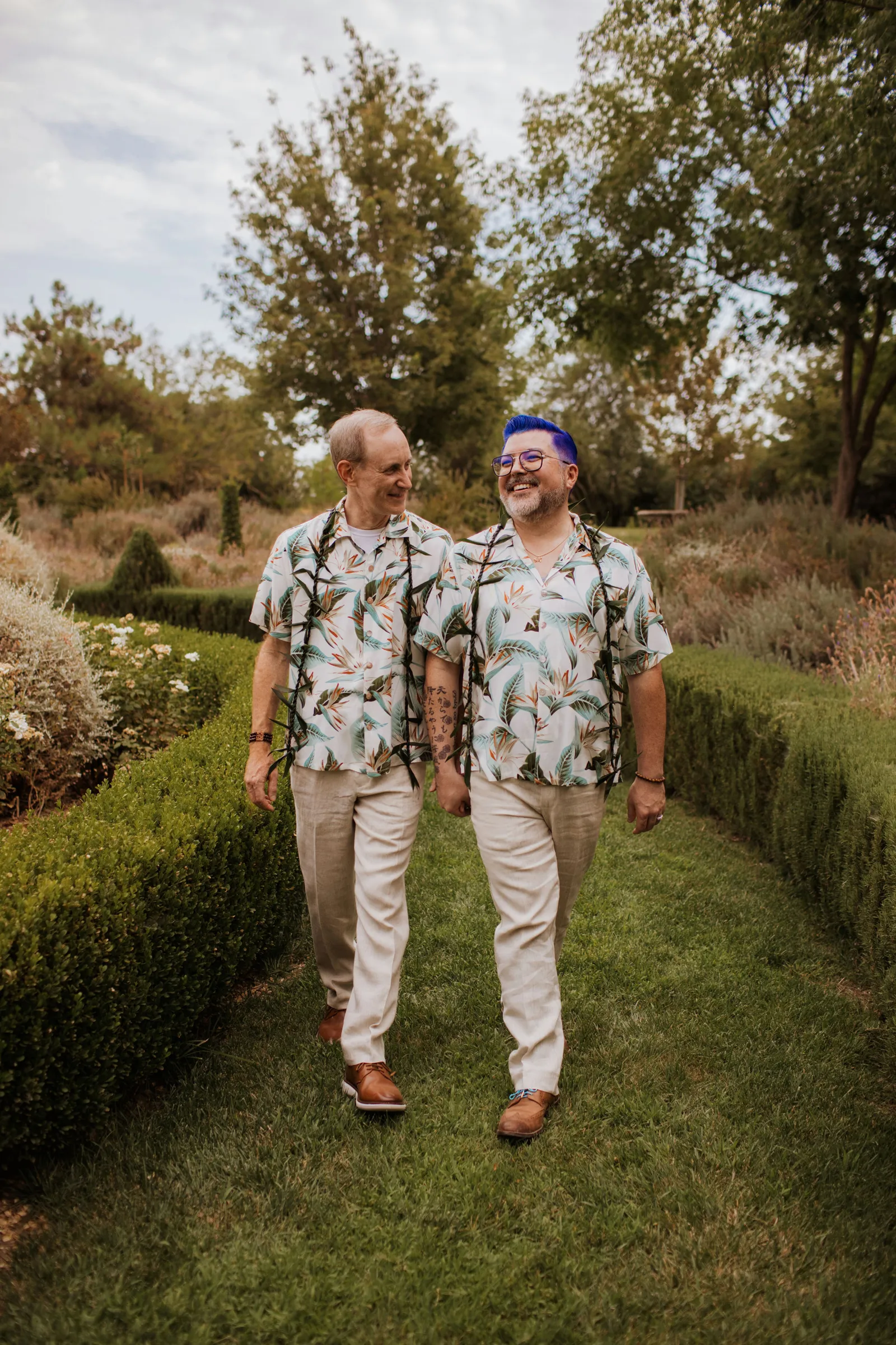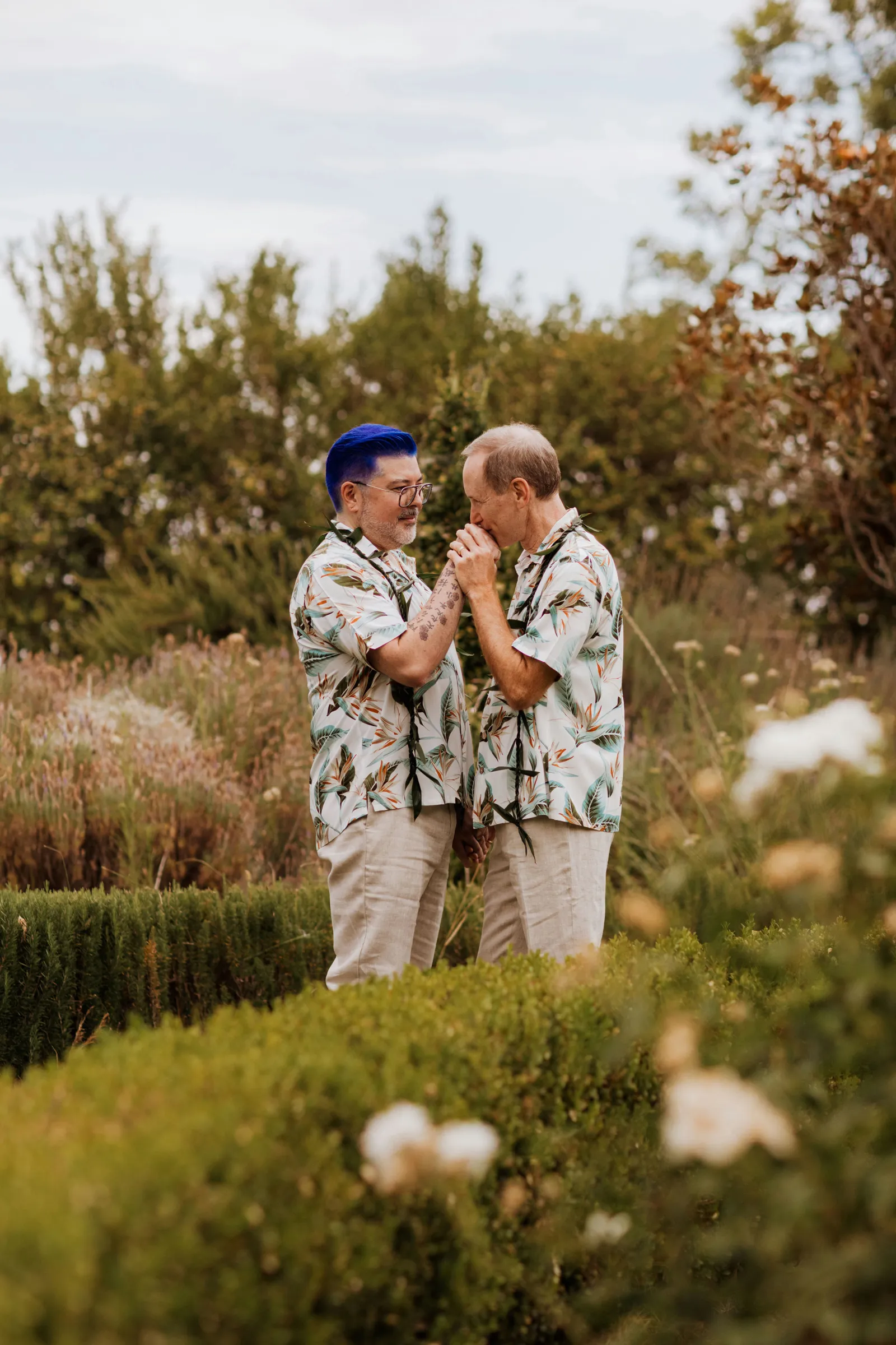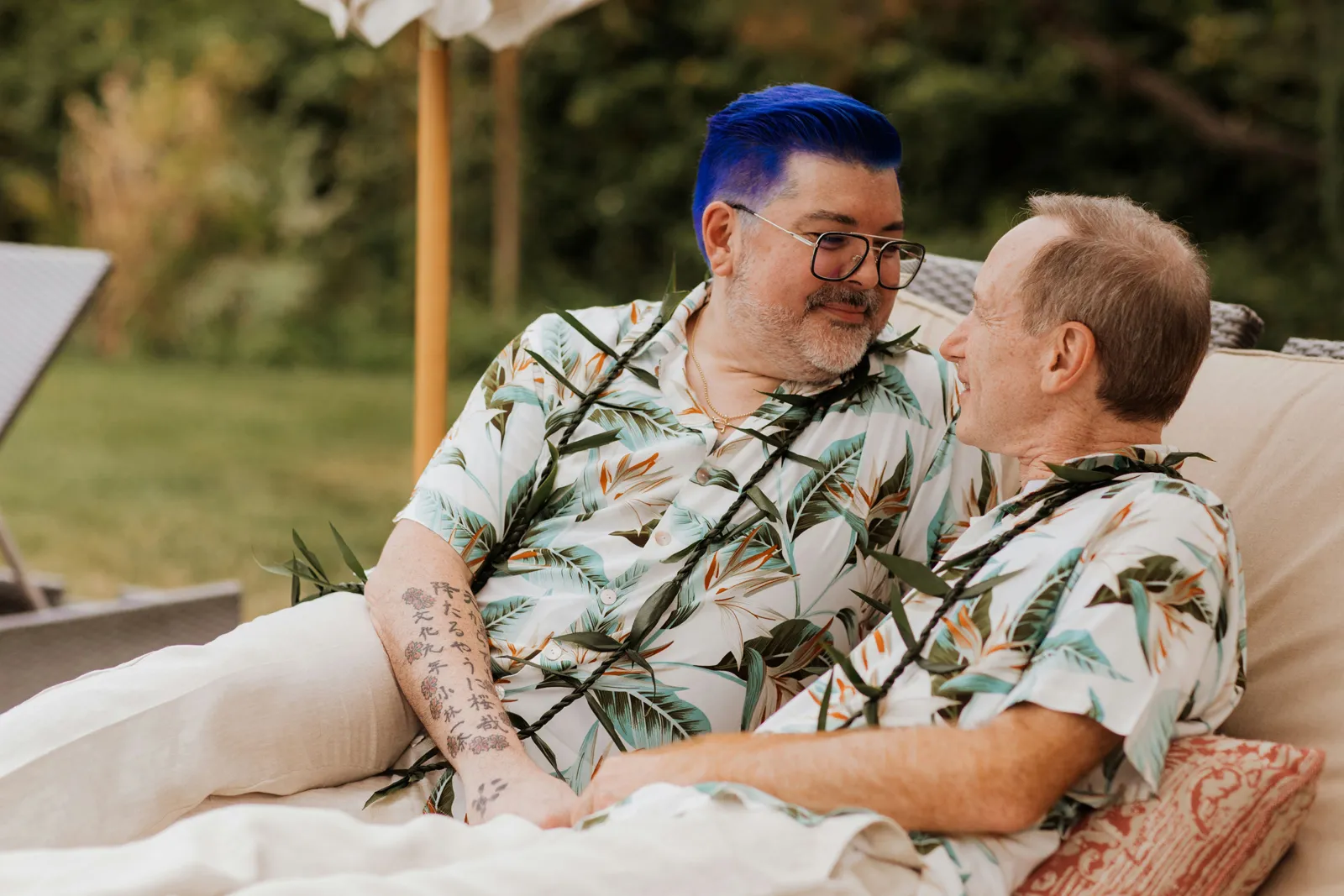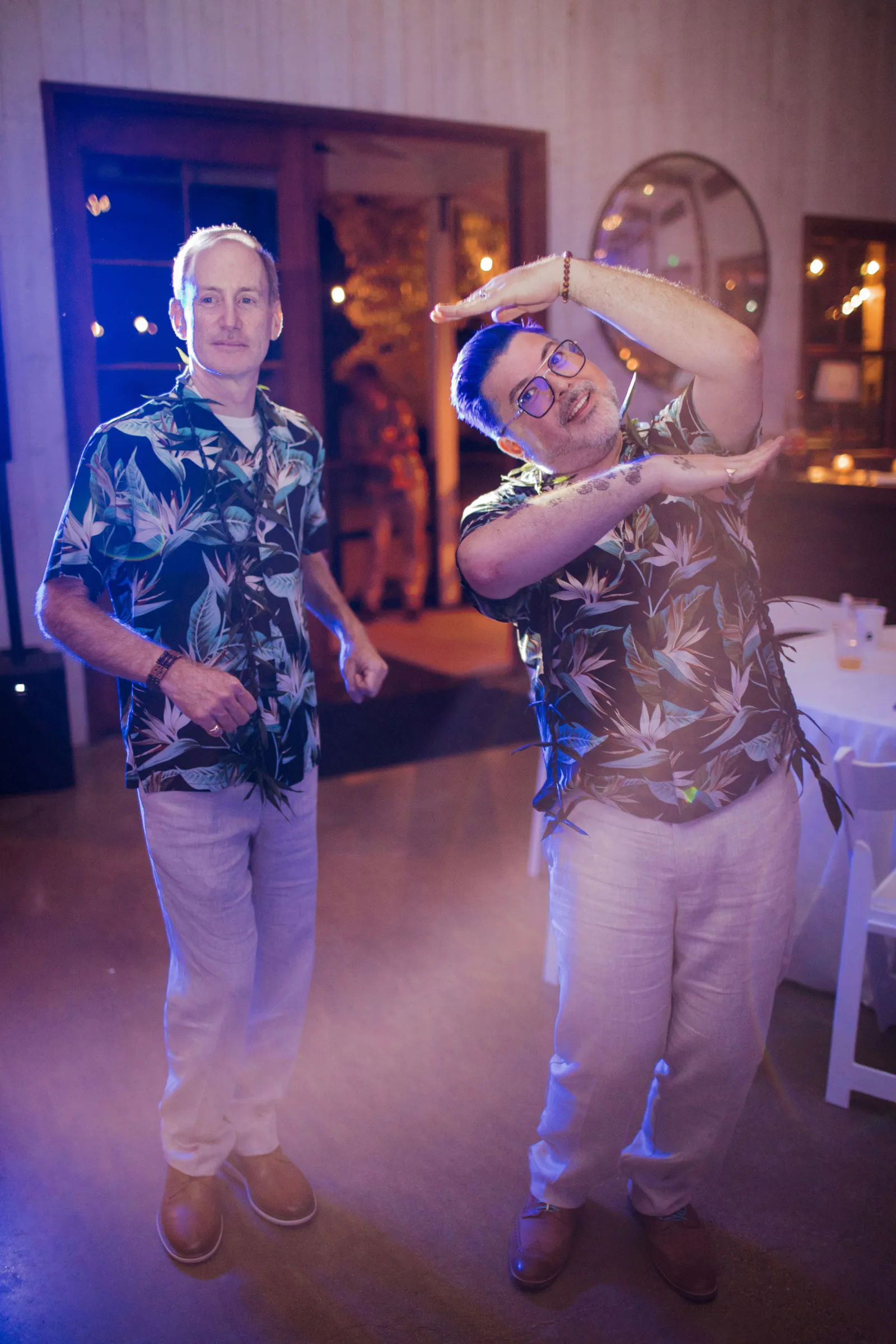 Greg and I (Mark) met through an app; our first date was dinner and Star Wars: The Last Jedi. We dated for a year and moved in together almost a year after we met. Greg proposed to [me] using a Lego to hold the ring. After another year, we started planning for the wedding, looking for locations first, then getting recommendations for vendors from the location we chose and from friends and acquaintances.