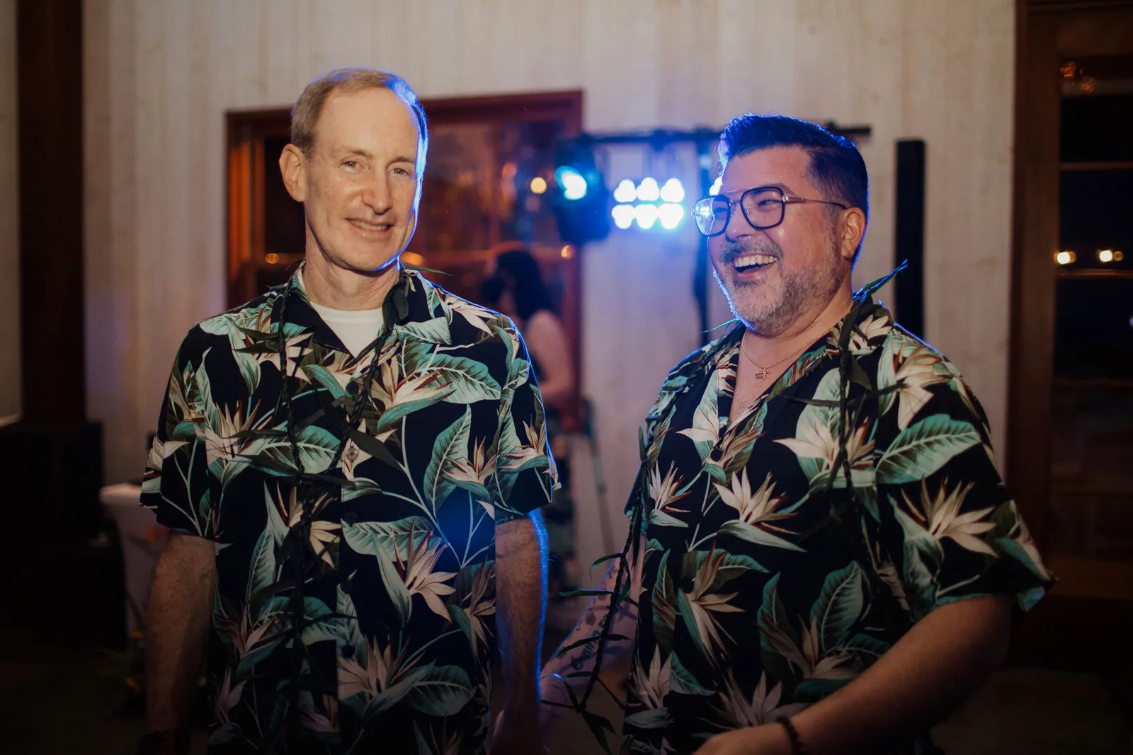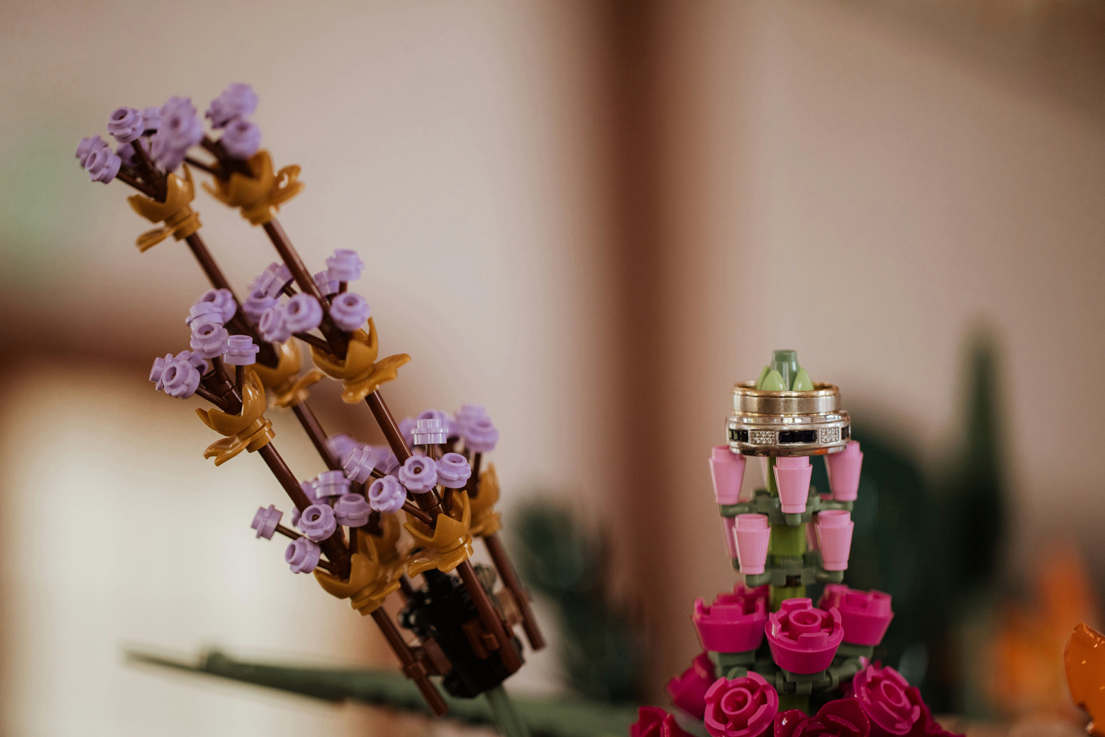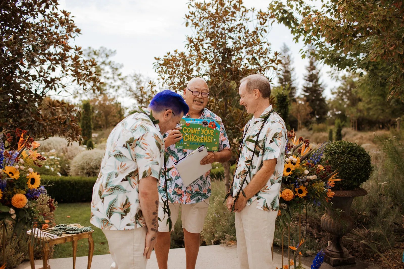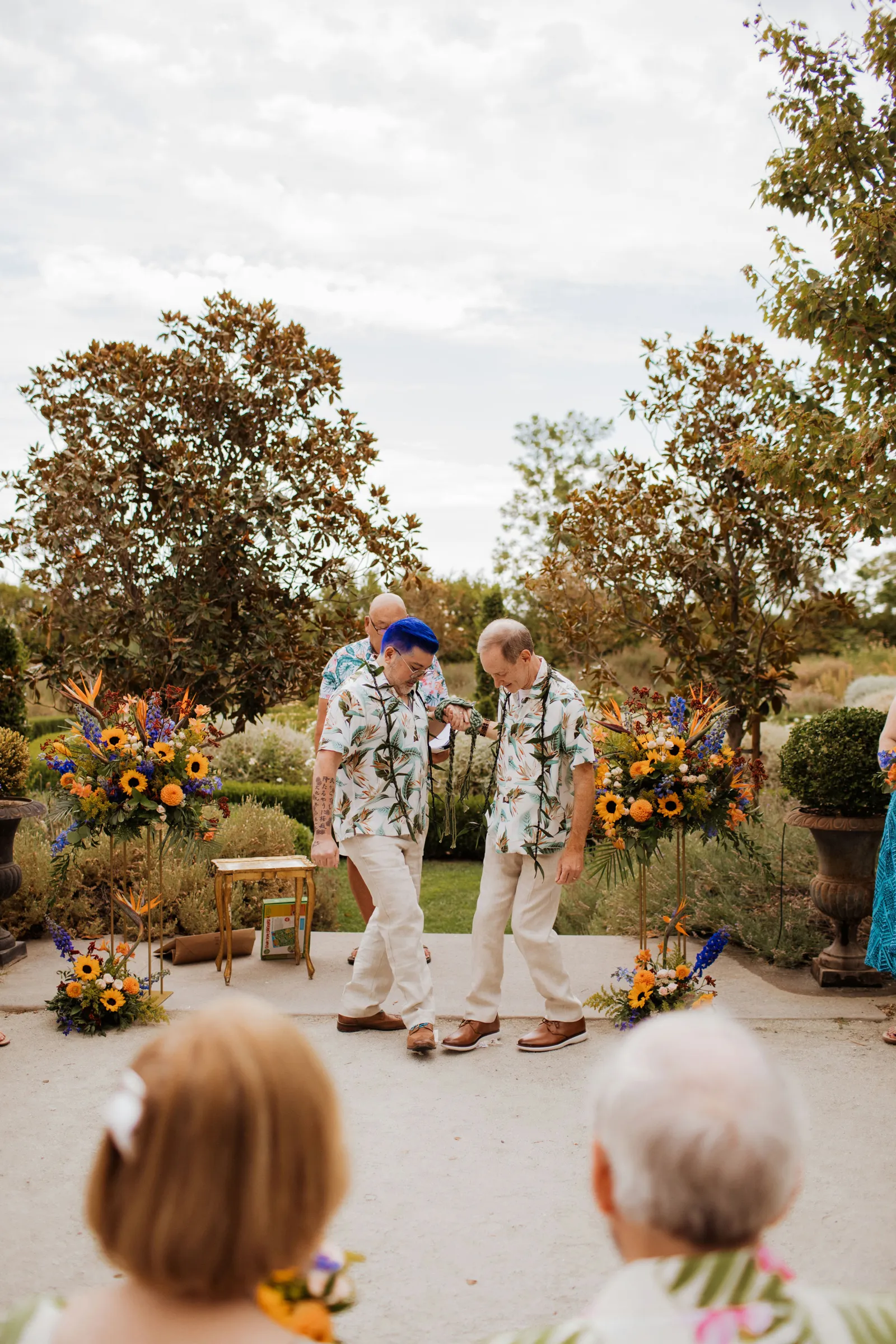Greg and I (Mark) met through an app; our first date was dinner and Star Wars: The Last Jedi. We dated for a year and moved in together almost a year after we met. Greg proposed to [me] using a Lego to hold the ring. After another year, we started planning for the wedding, looking for locations first, then getting recommendations for vendors from the location we chose and from friends and acquaintances.