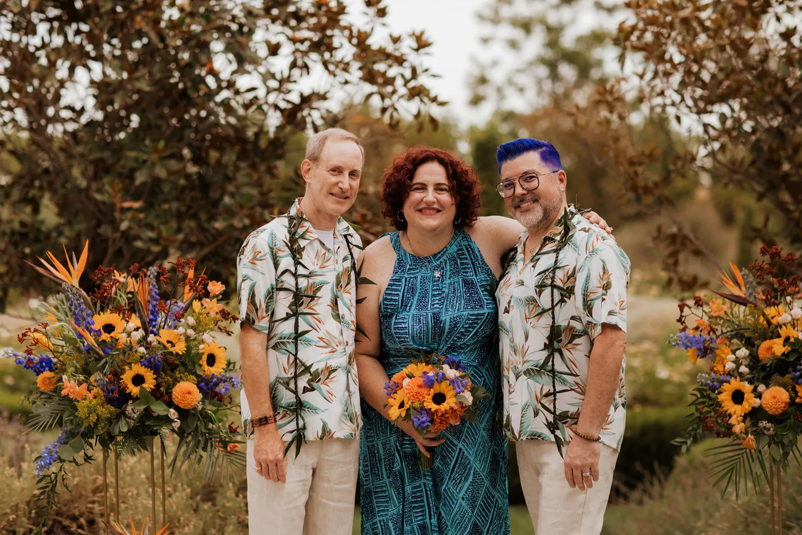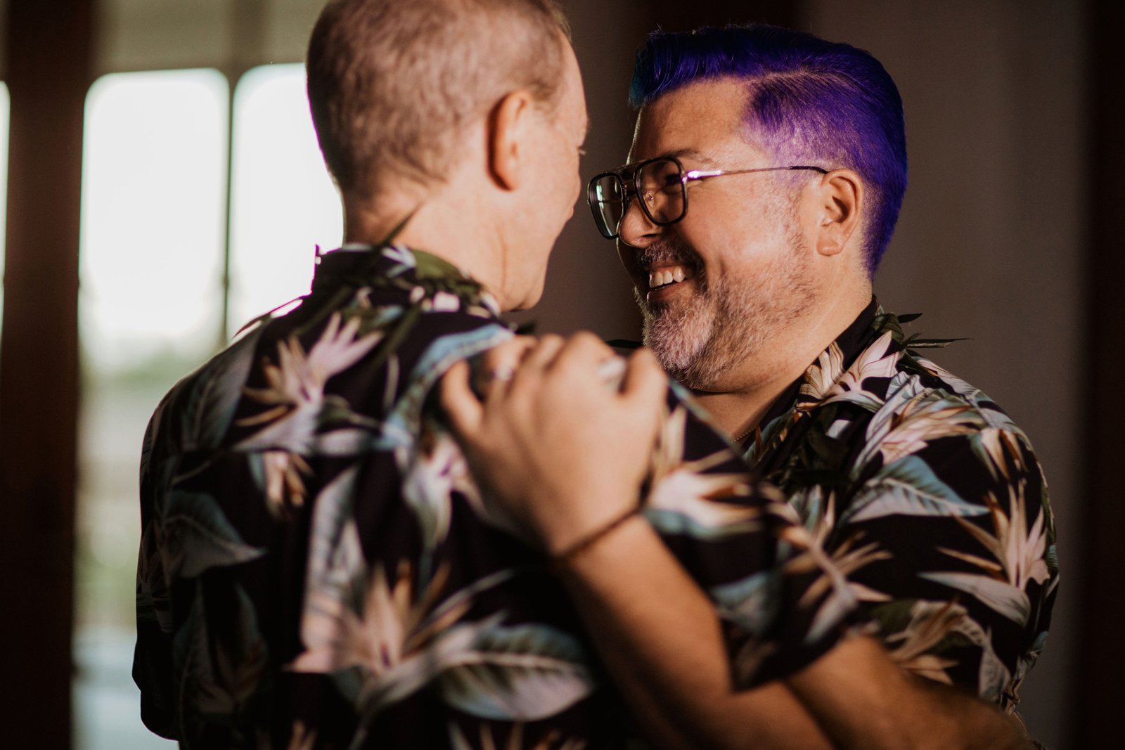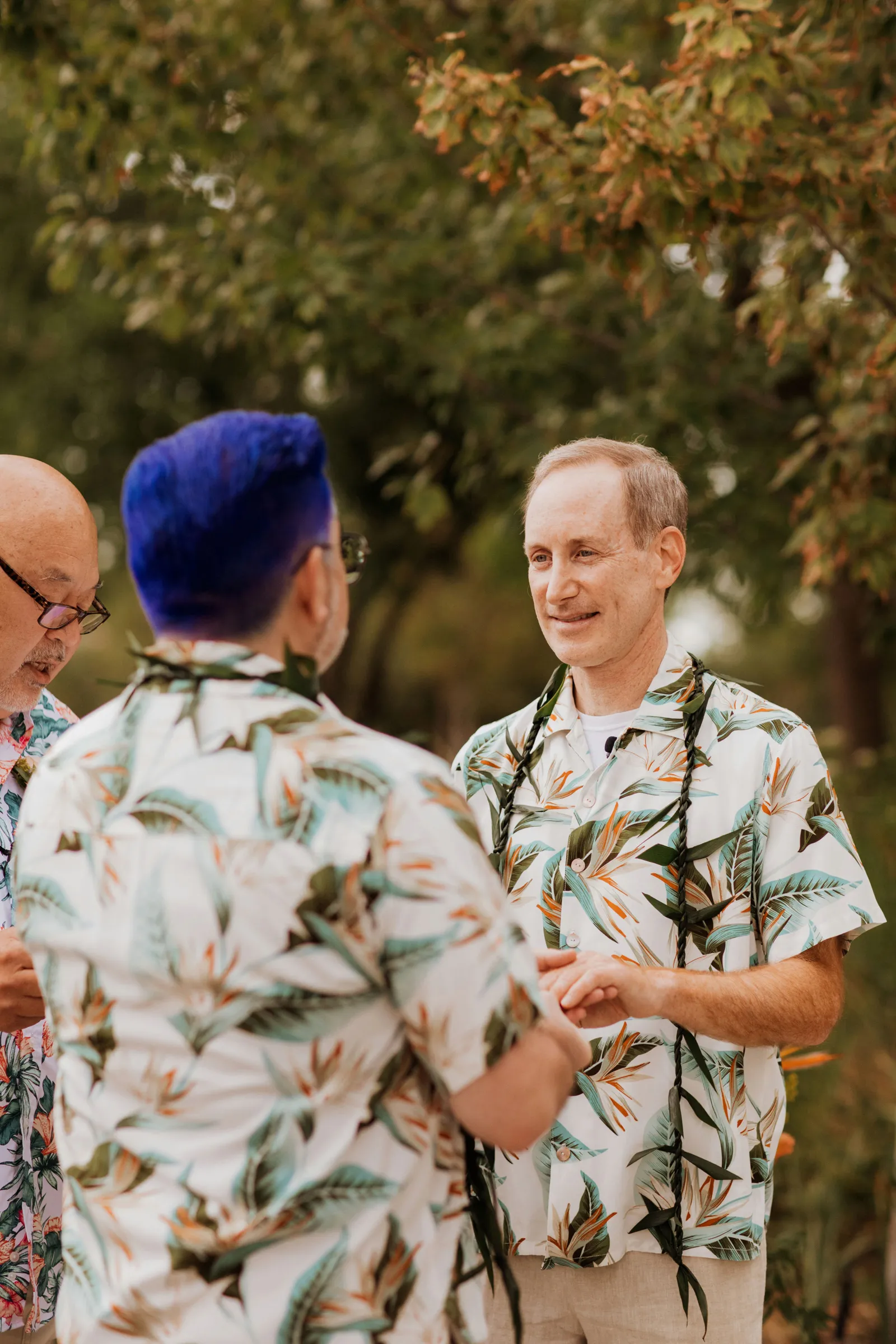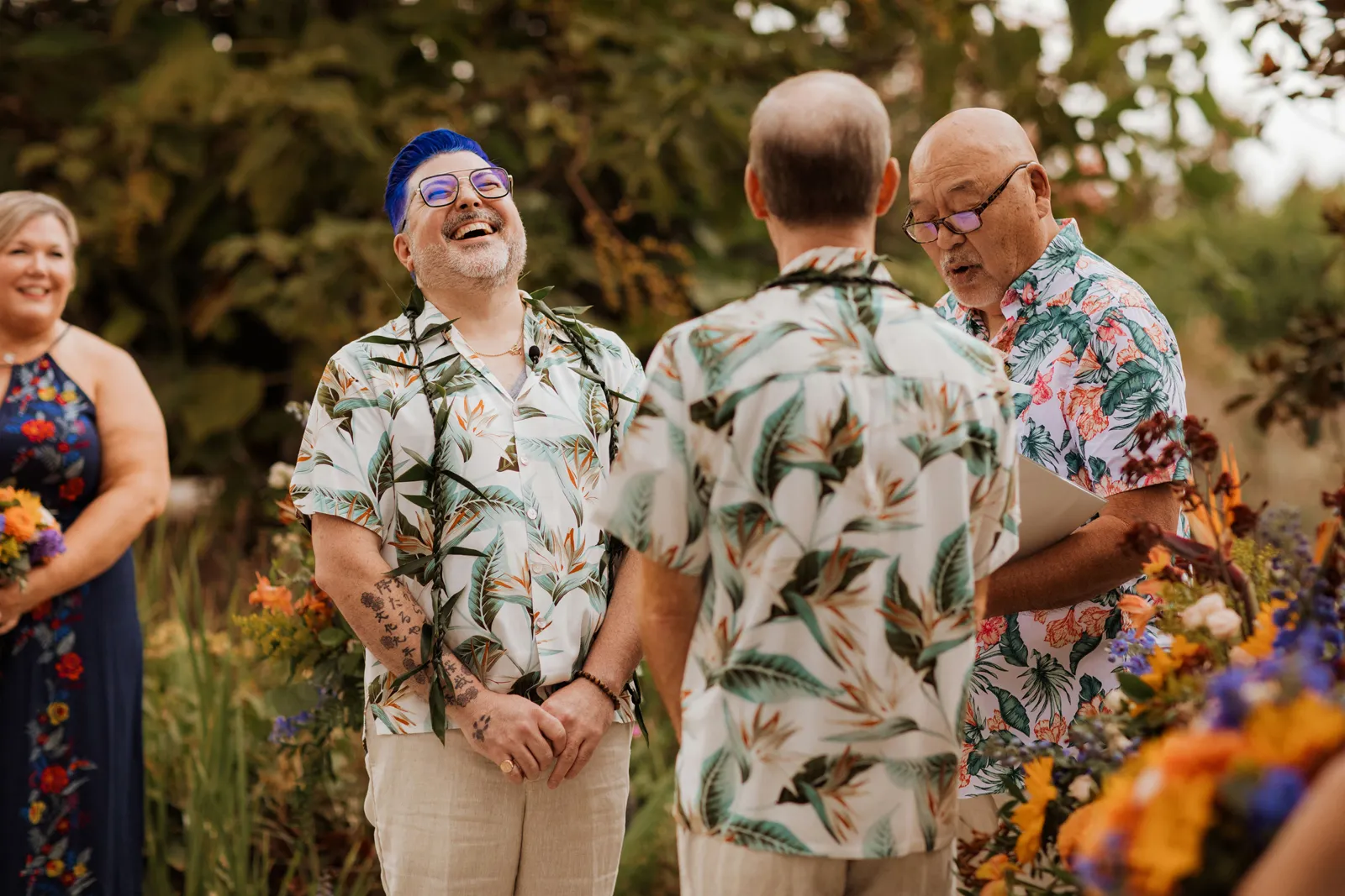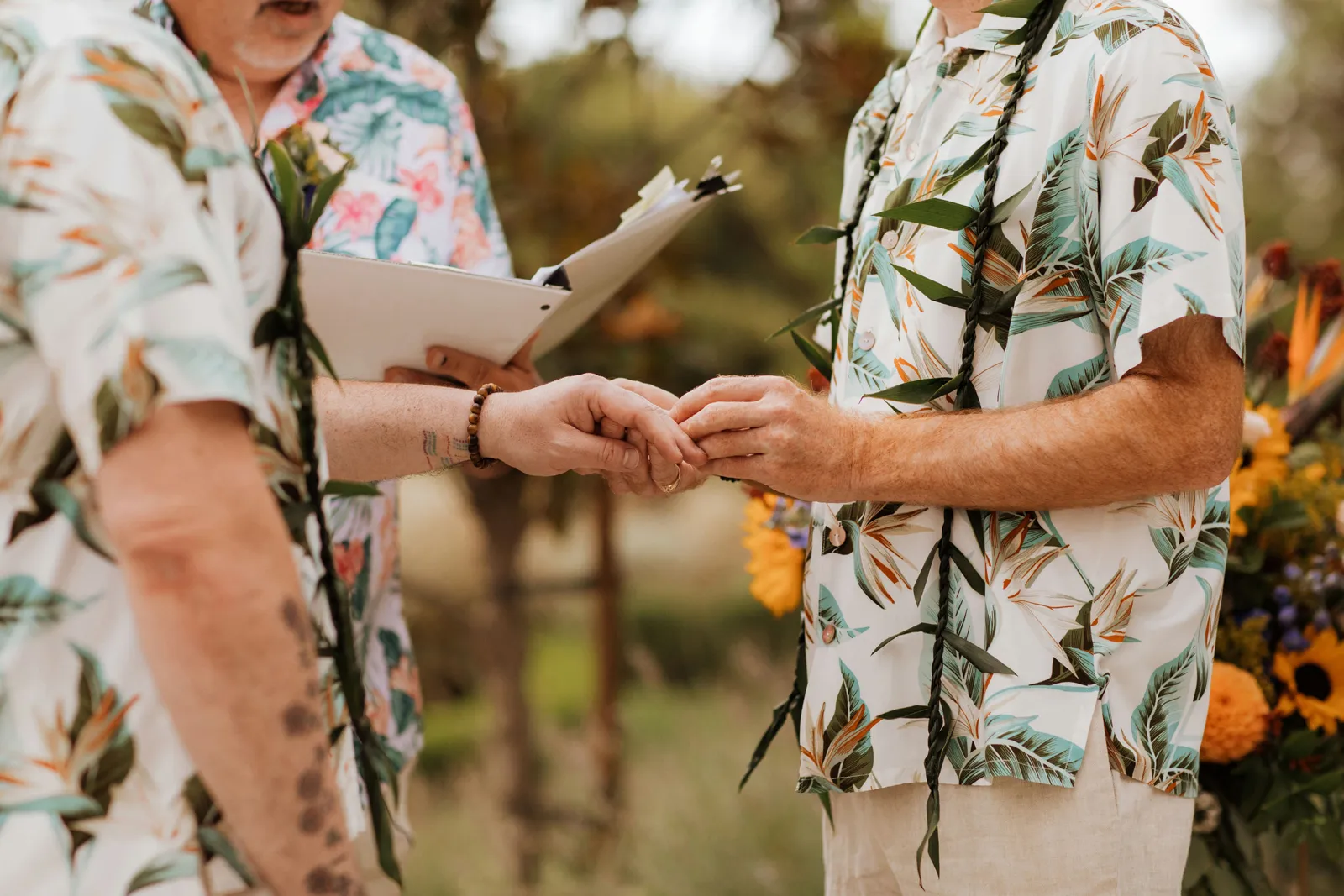 Greg and I (Mark) met through an app; our first date was dinner and Star Wars: The Last Jedi. We dated for a year and moved in together almost a year after we met. Greg proposed to [me] using a Lego to hold the ring. After another year, we started planning for the wedding, looking for locations first, then getting recommendations for vendors from the location we chose and from friends and acquaintances.