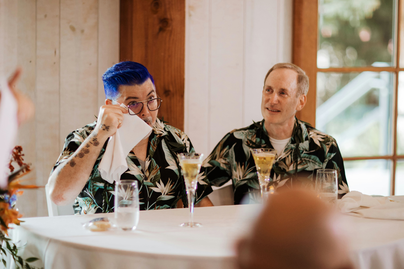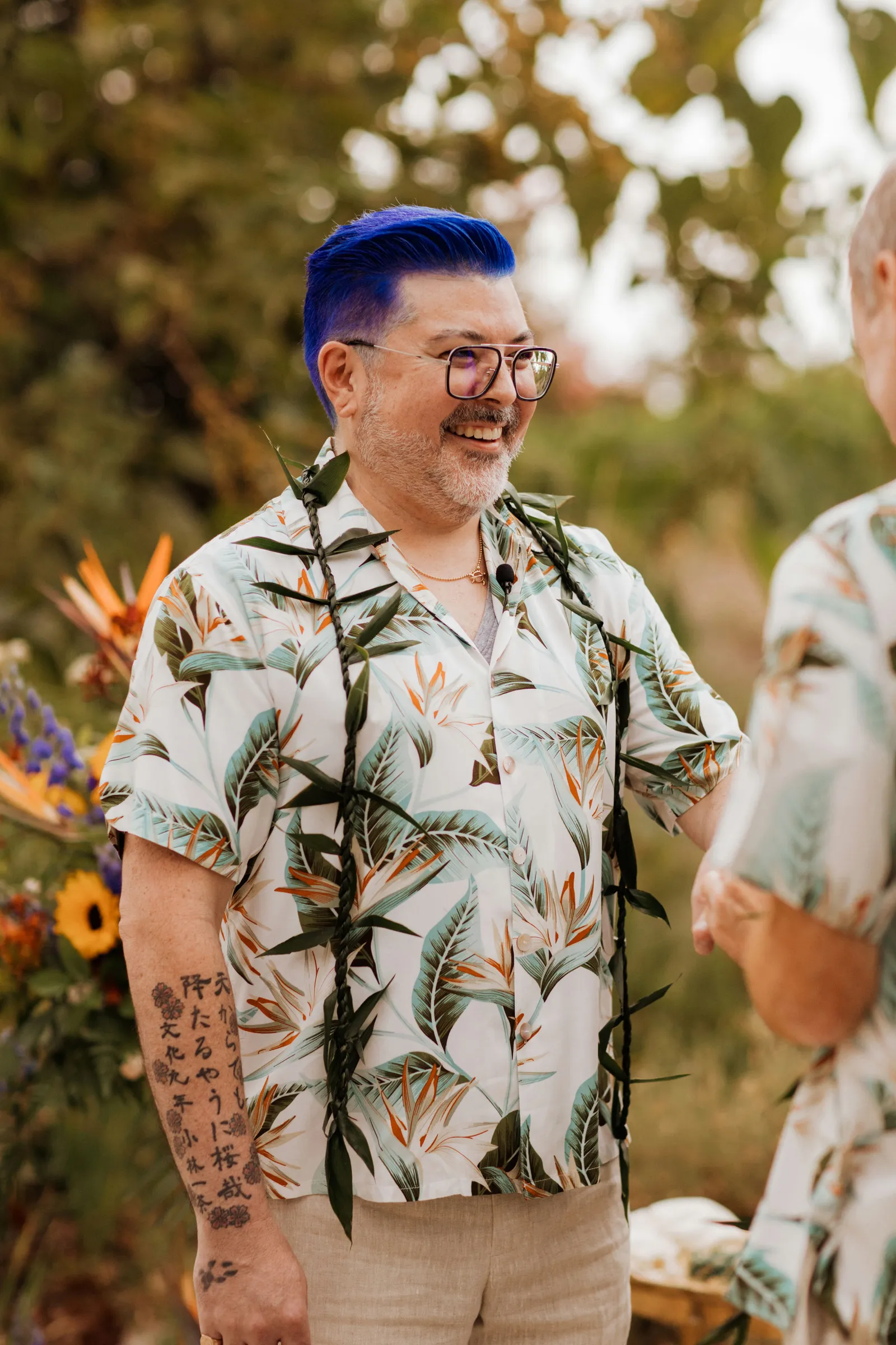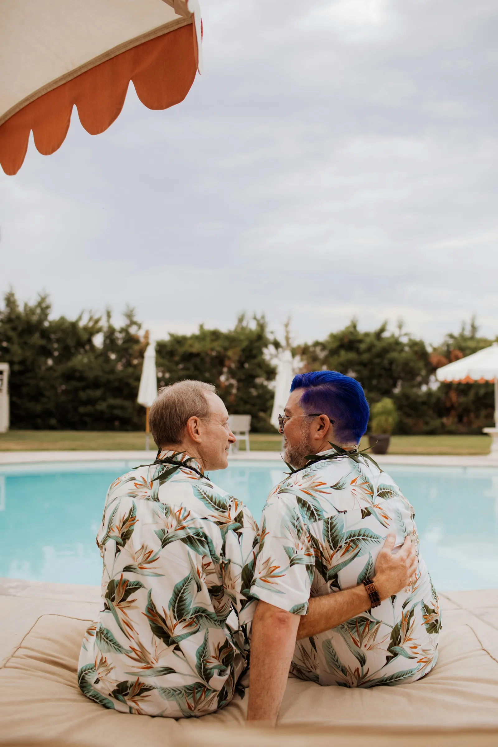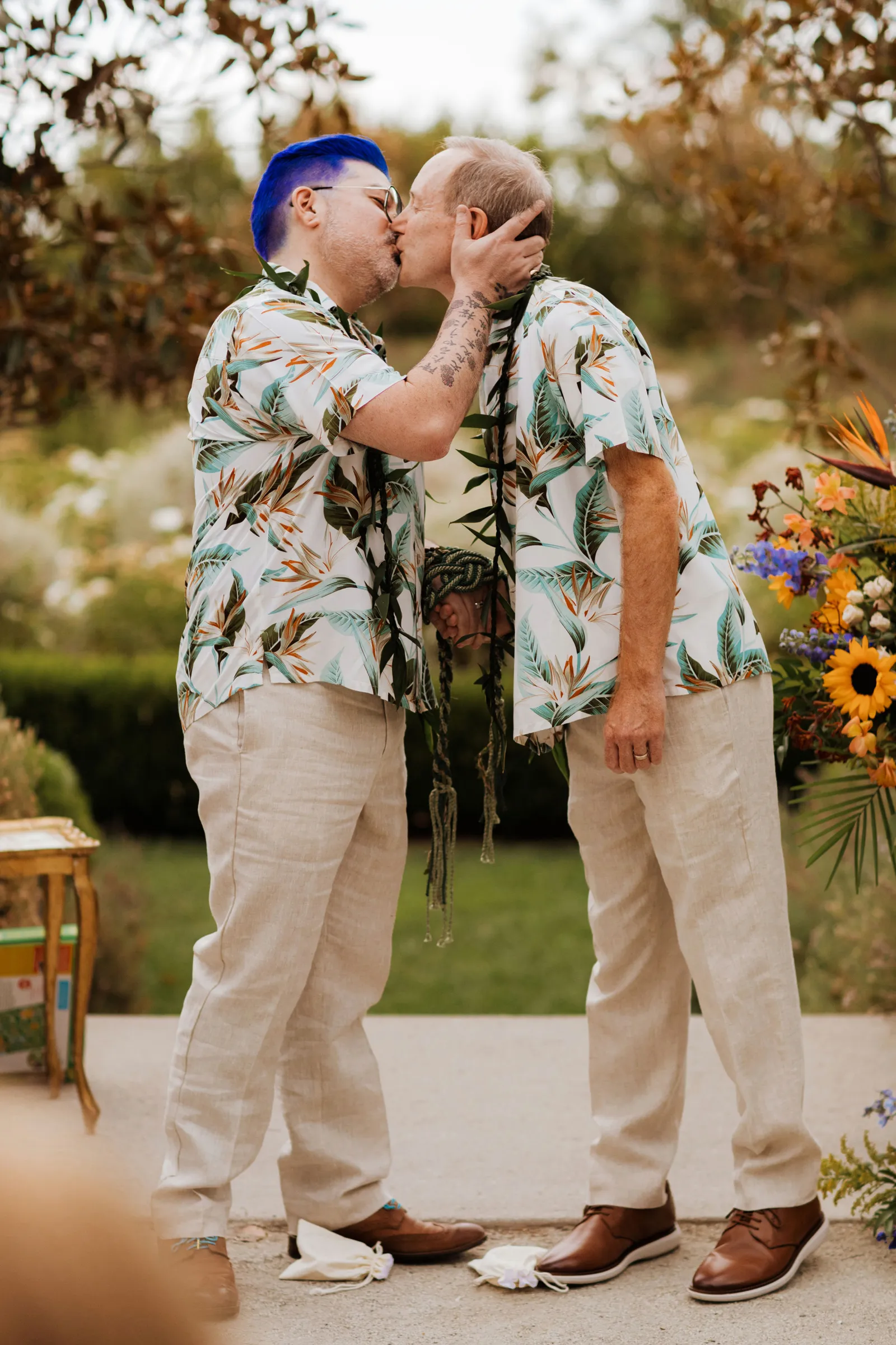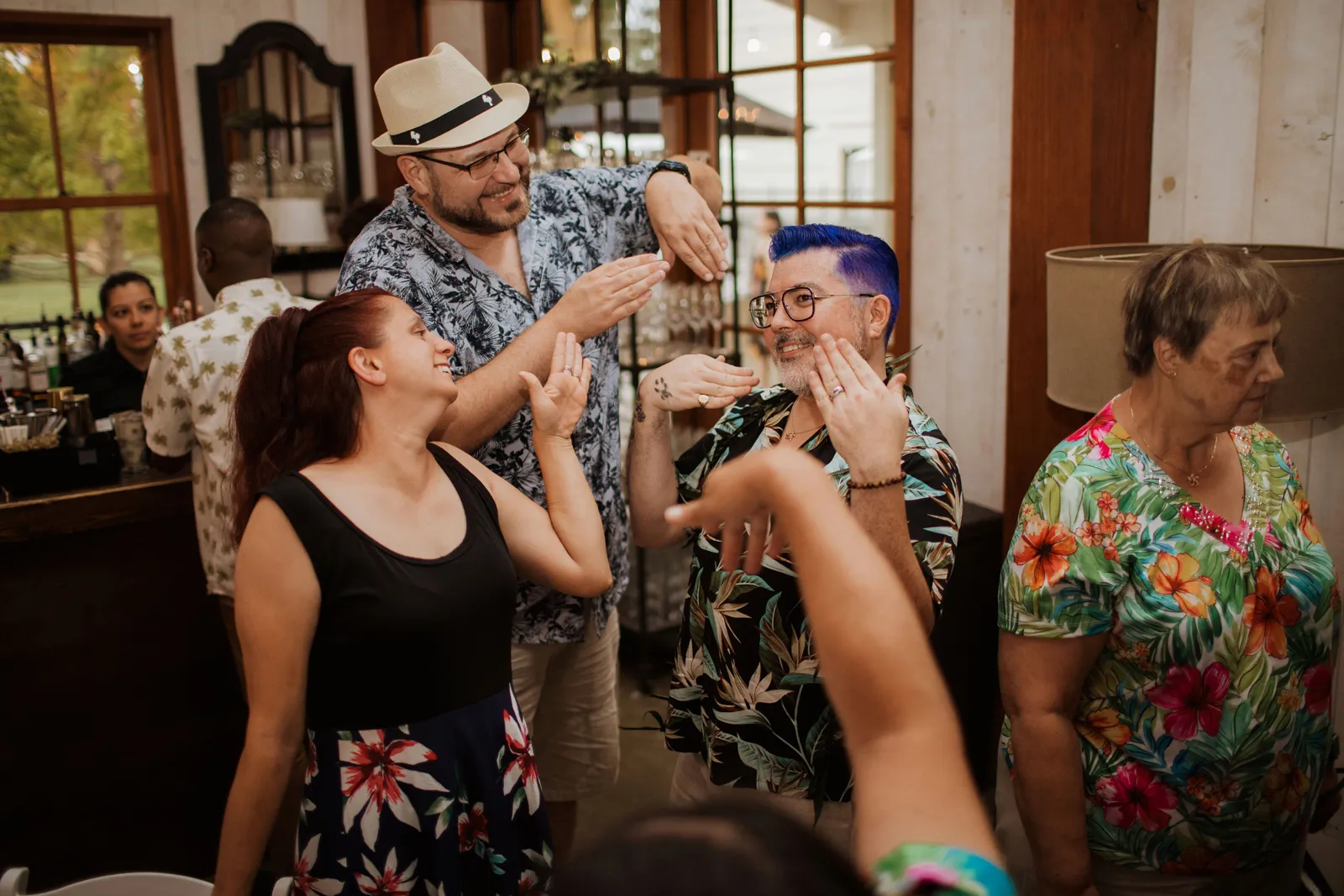 Greg and I (Mark) met through an app; our first date was dinner and Star Wars: The Last Jedi. We dated for a year and moved in together almost a year after we met. Greg proposed to [me] using a Lego to hold the ring. After another year, we started planning for the wedding, looking for locations first, then getting recommendations for vendors from the location we chose and from friends and acquaintances.
