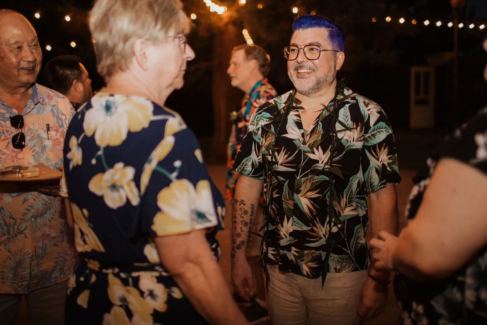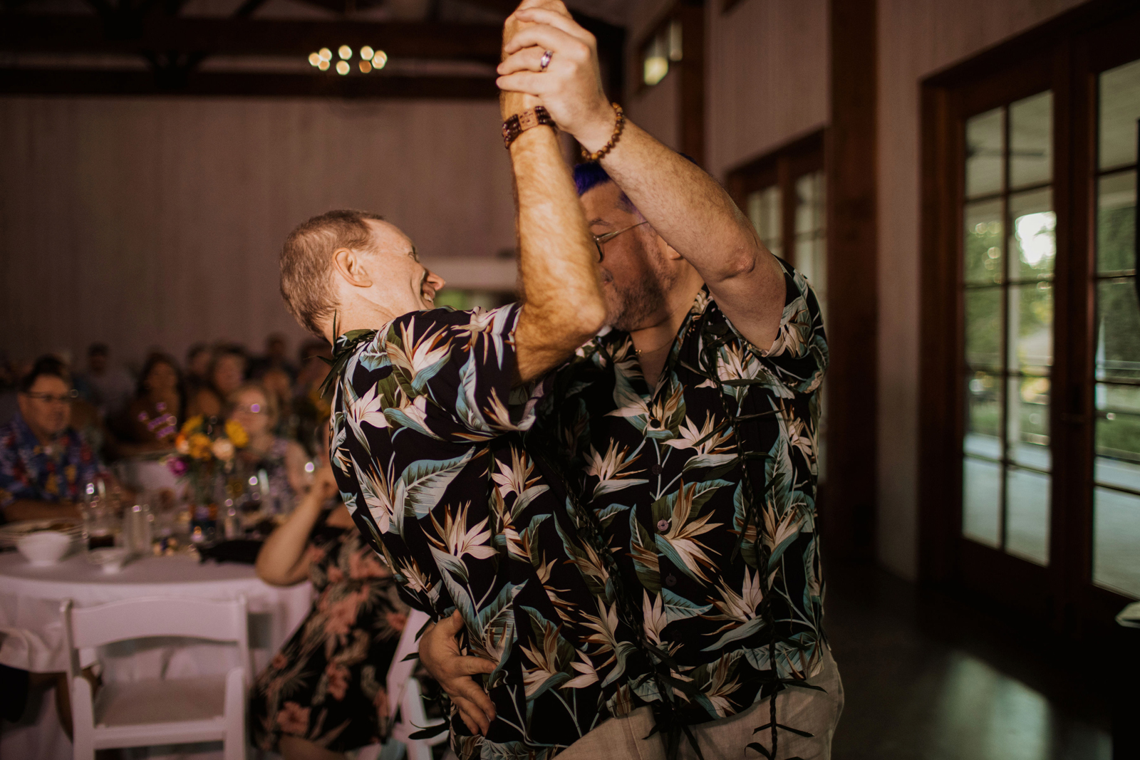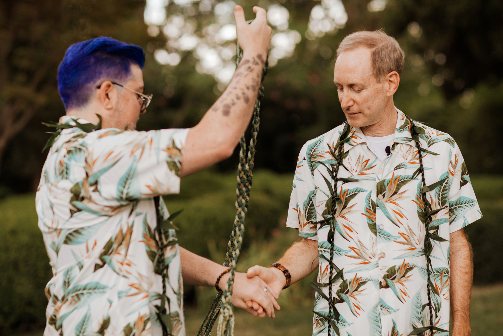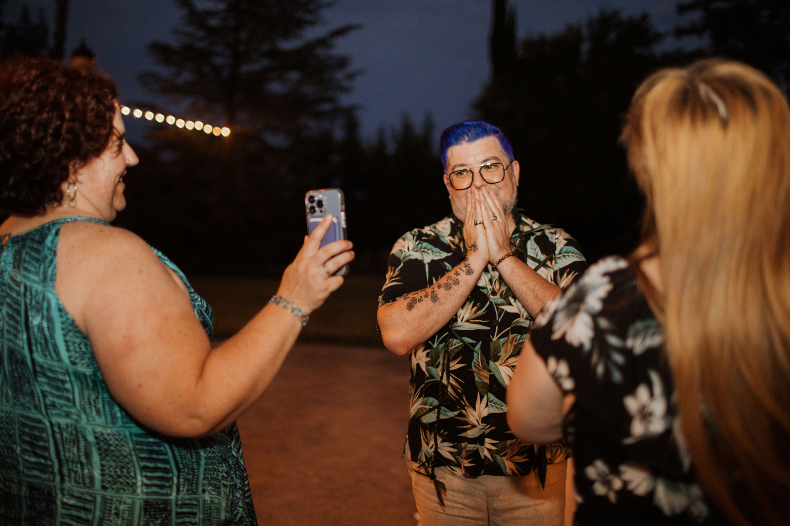 Greg and I (Mark) met through an app; our first date was dinner and Star Wars: The Last Jedi. We dated for a year and moved in together almost a year after we met. Greg proposed to [me] using a Lego to hold the ring. After another year, we started planning for the wedding, looking for locations first, then getting recommendations for vendors from the location we chose and from friends and acquaintances.