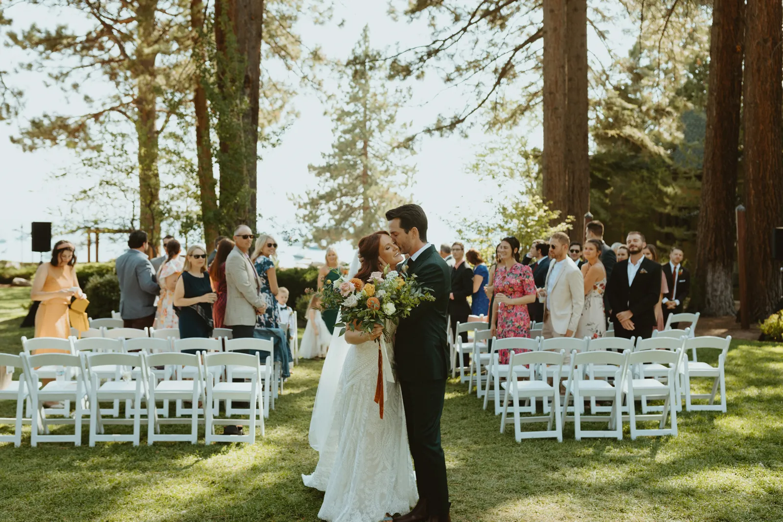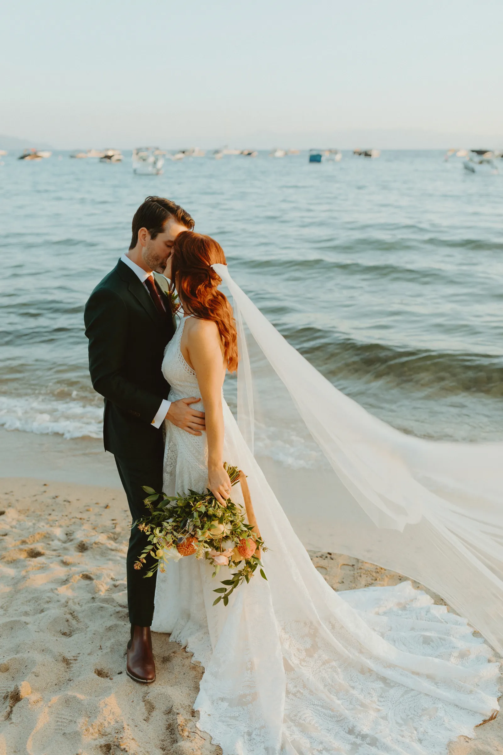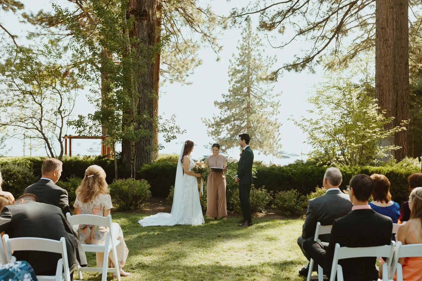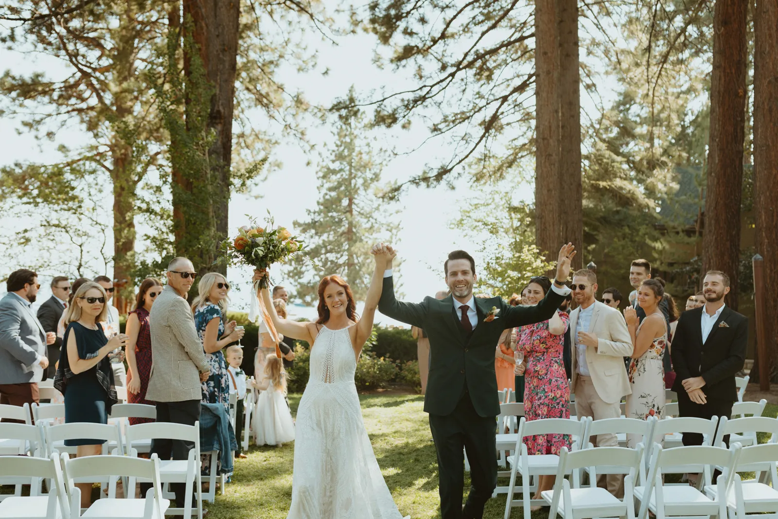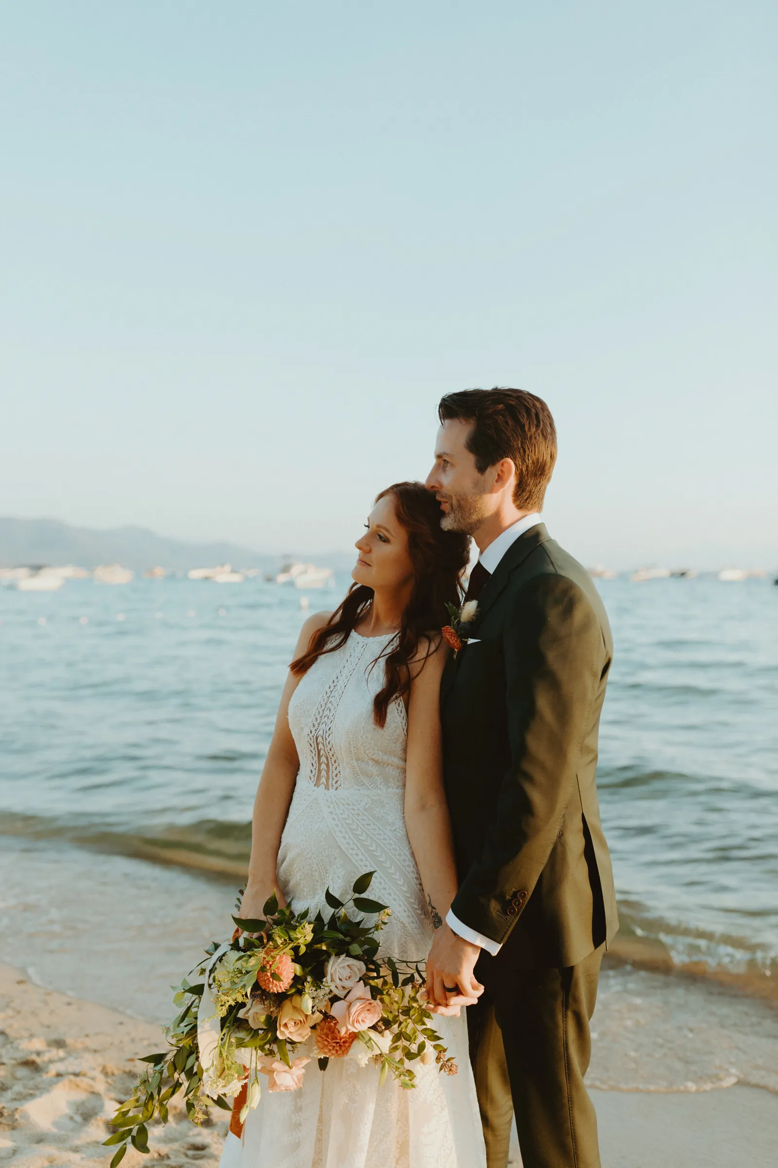 Good afternoon, everyone. It’s Wednesday — you know what that means. Happy Real Weddings Wednesday! Today, we’re celebrating Marla and Tom’s beautiful outdoor ceremony set at the beautiful Lake Tahoe. We’re talking gorgeous flower arrangements, jaw-dropping beach photos, and a larger-than-life surprise, (keep scrolling to find out what it is)! Happy Wednesday, and happy reading!