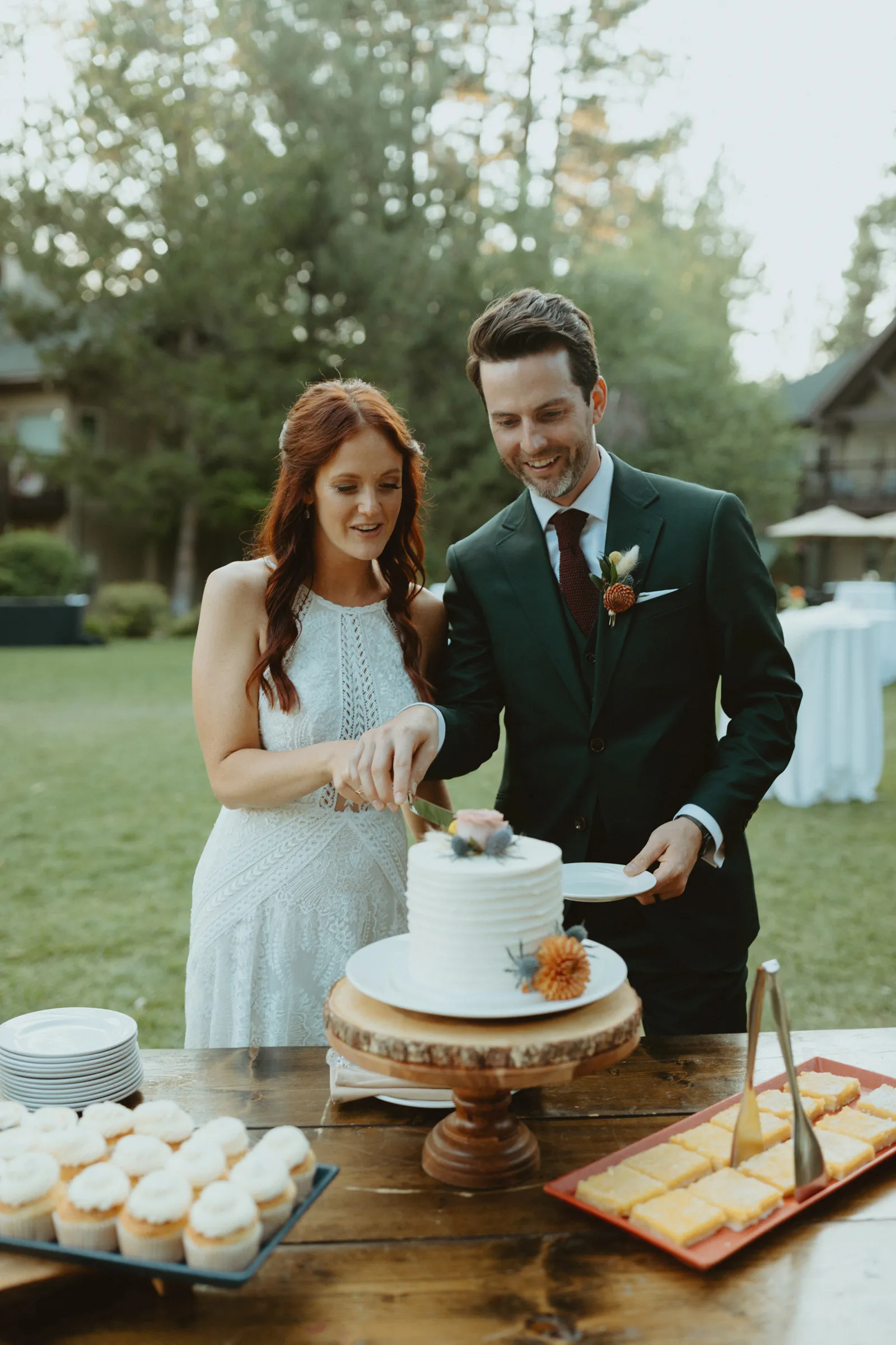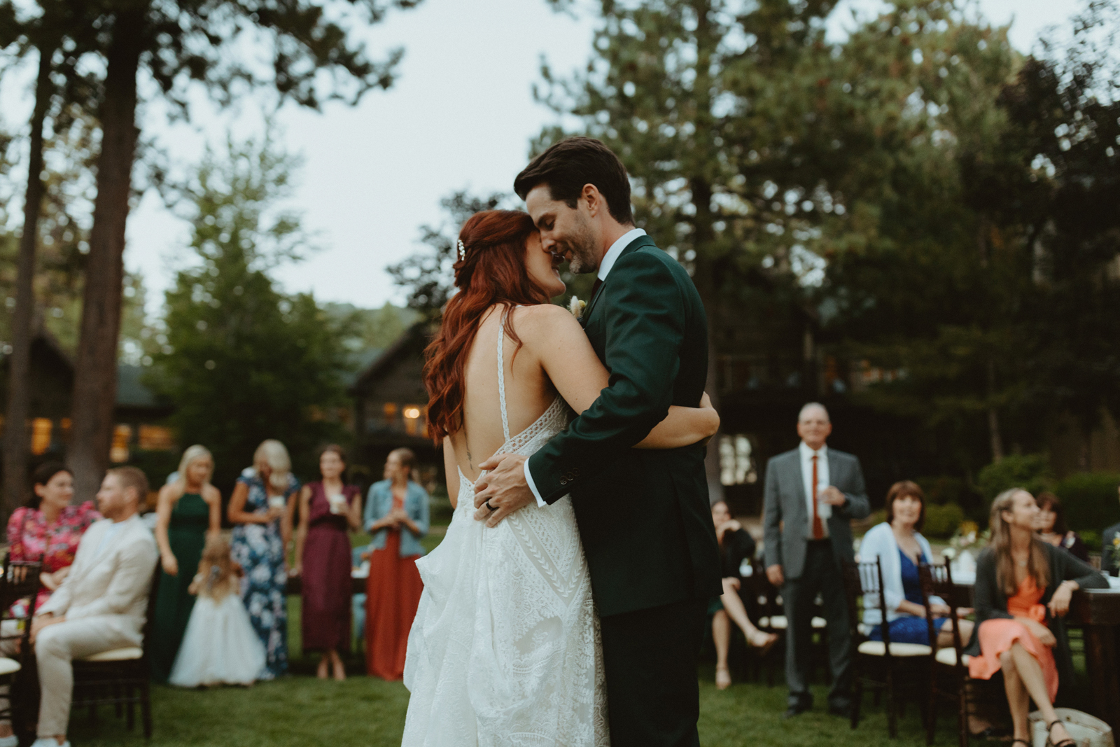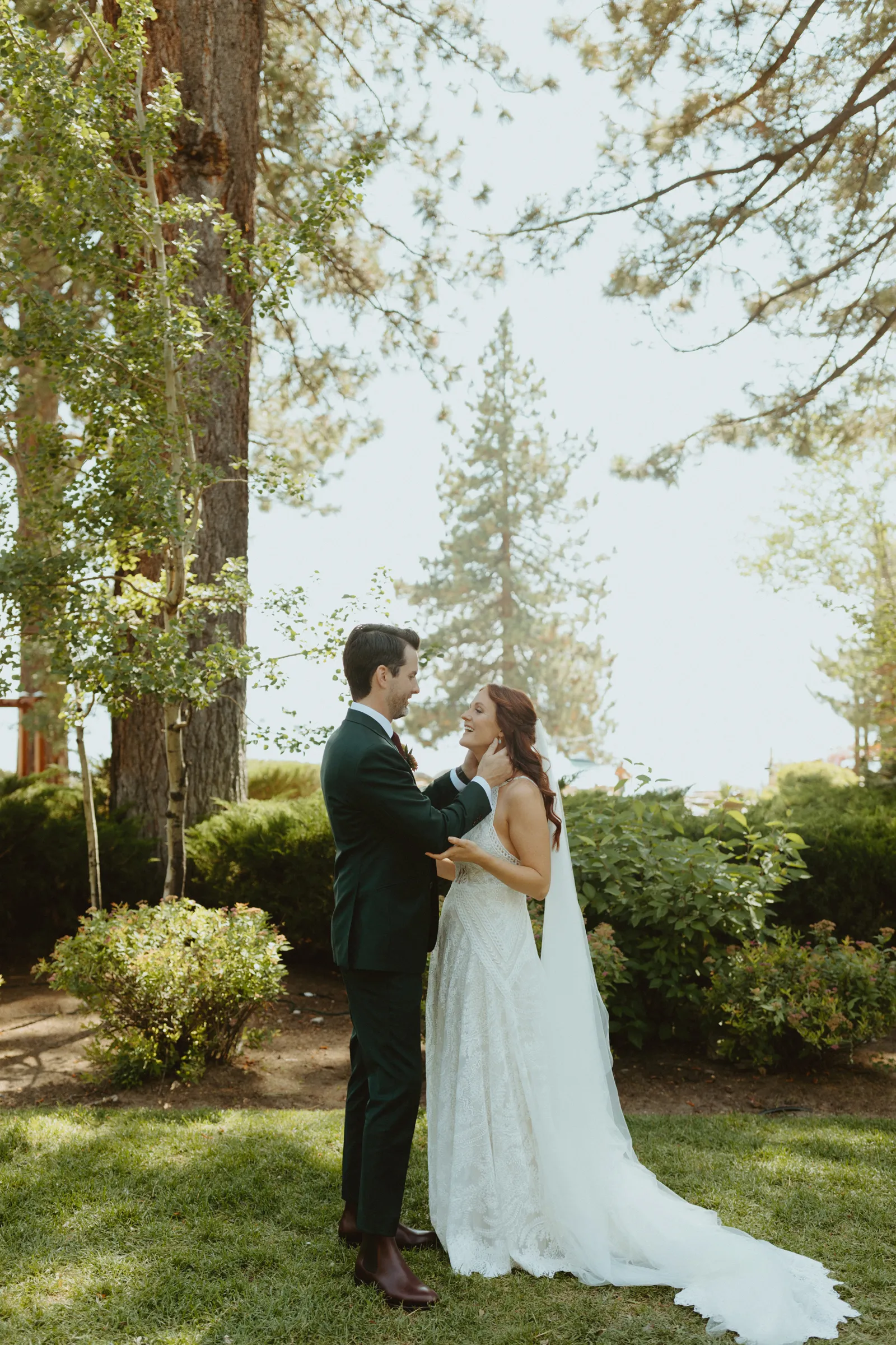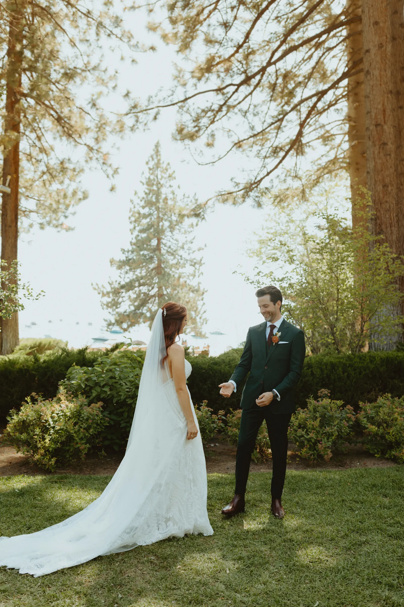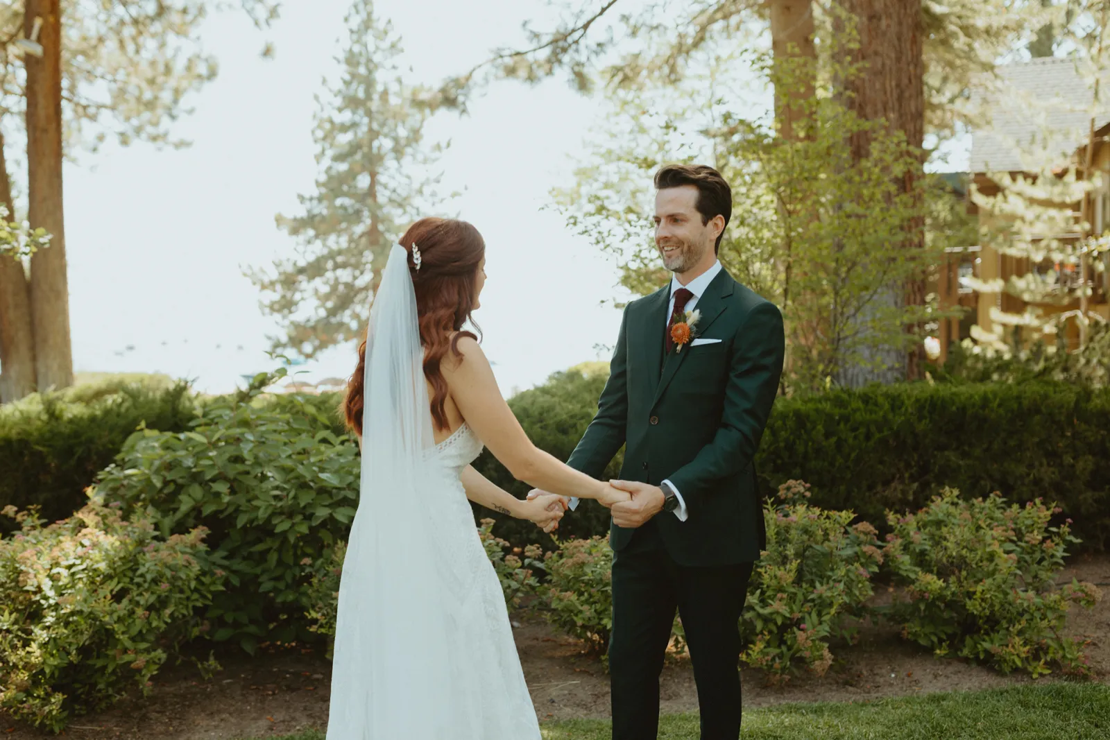 Tom and I met 10 years ago through my brother-in-law. We were friends for years before we started dating. We now have the best situation because my sister and I married into the same friend group! Tom proposed while we were on a weekend getaway to a lake house in Canada. He proposed while we were having a drink around the campfire and he asked if I wanted to go on another adventure with him. Our wedding planning was a bit of a roller coaster, (we were a COVID wedding couple). Our original wedding date was in August 2020, which was cancelled and rescheduled for 2021. In the long run, everything worked out exactly how it was supposed to! We are now living back in our hometown of Buffalo, NY but we did live on the West Coast in Portland, Oregon for a year. We love exploring and seeing new places. We also love our bulldog Leroy, our baby girl, Andi, and nerdy things like Game of Thrones and Harry Potter. Our wedding was such a special day for us. We got married in Lake Tahoe with 30 of our closest family and friends. We had our ceremony and reception at the Hyatt Regency Lake Tahoe on their cottage green, overlooking the lake. It was quiet and simple and exactly how we wanted to spend the day with our family and friends!