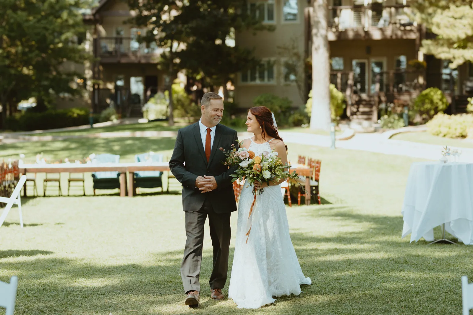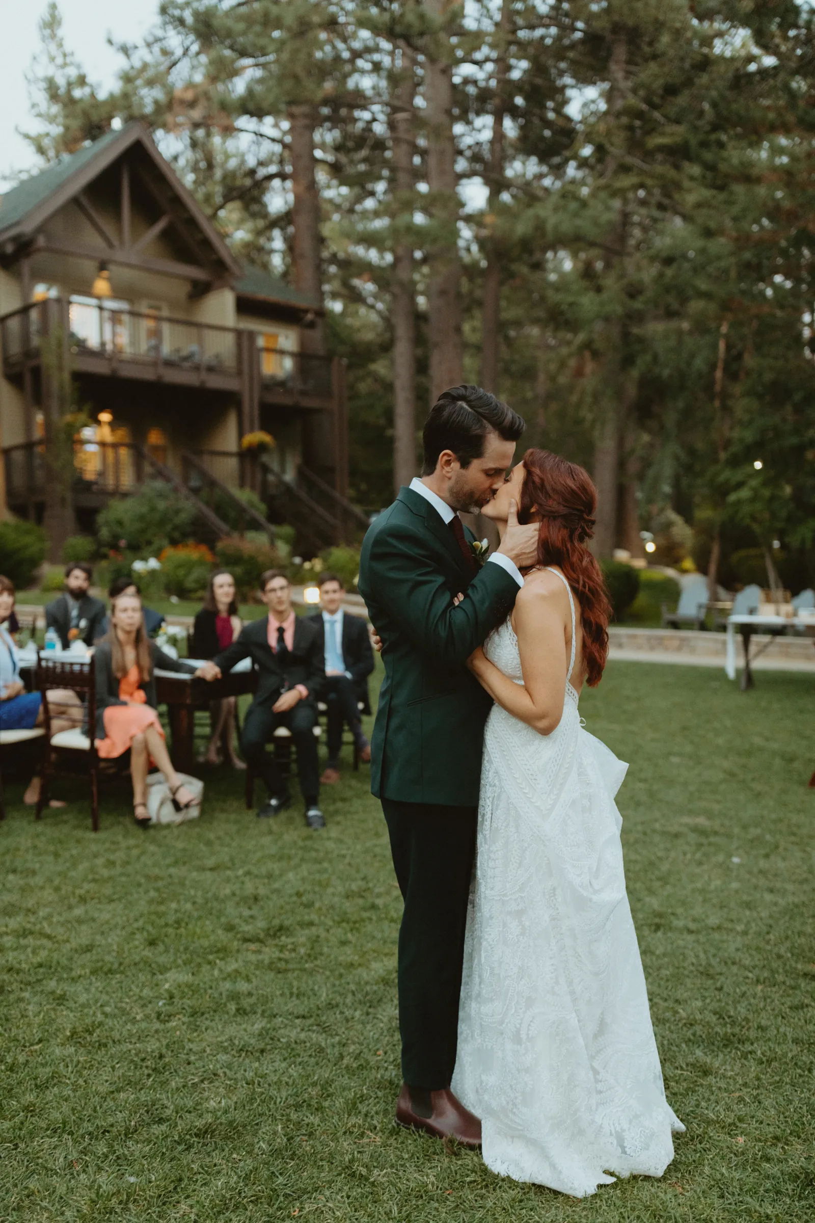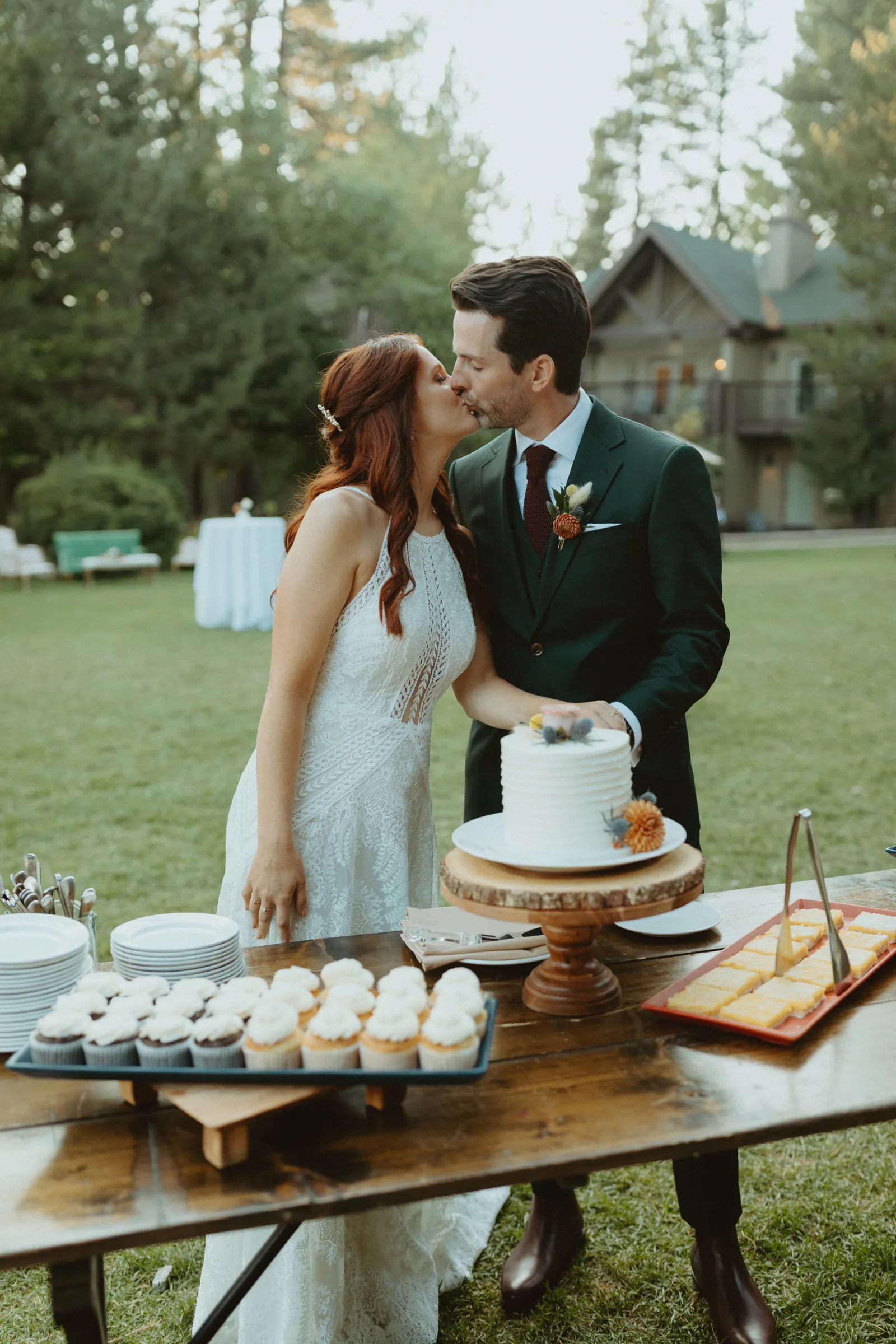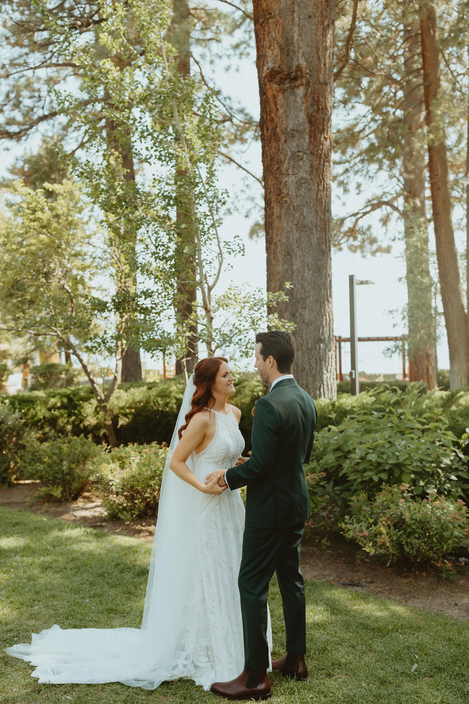 Tom and I met 10 years ago through my brother-in-law. We were friends for years before we started dating. We now have the best situation because my sister and I married into the same friend group! Tom proposed while we were on a weekend getaway to a lake house in Canada. He proposed while we were having a drink around the campfire and he asked if I wanted to go on another adventure with him. Our wedding planning was a bit of a roller coaster, (we were a COVID wedding couple). Our original wedding date was in August 2020, which was cancelled and rescheduled for 2021. In the long run, everything worked out exactly how it was supposed to! We are now living back in our hometown of Buffalo, NY but we did live on the West Coast in Portland, Oregon for a year. We love exploring and seeing new places. We also love our bulldog Leroy, our baby girl, Andi, and nerdy things like Game of Thrones and Harry Potter. Our wedding was such a special day for us. We got married in Lake Tahoe with 30 of our closest family and friends. We had our ceremony and reception at the Hyatt Regency Lake Tahoe on their cottage green, overlooking the lake. It was quiet and simple and exactly how we wanted to spend the day with our family and friends!