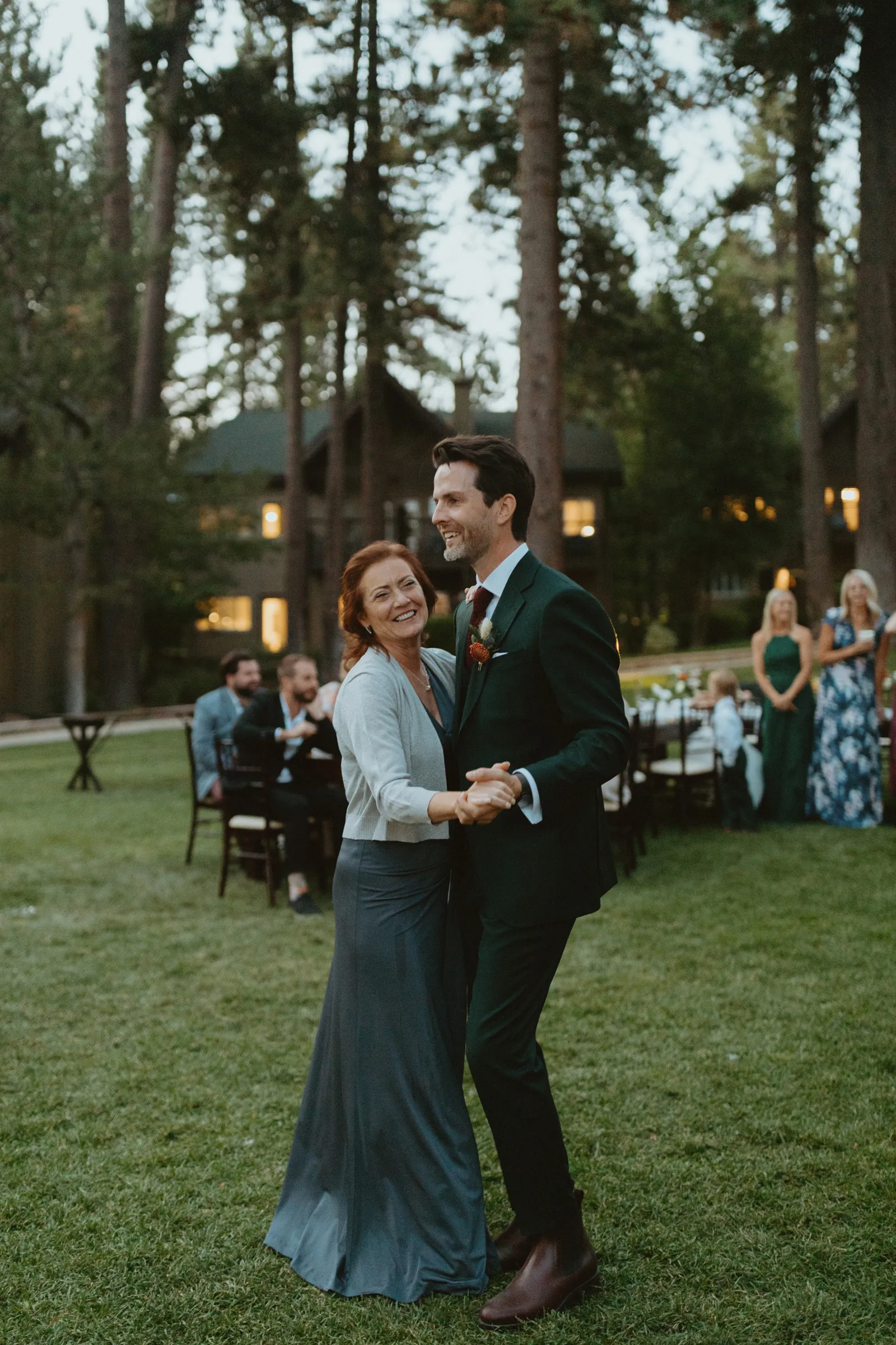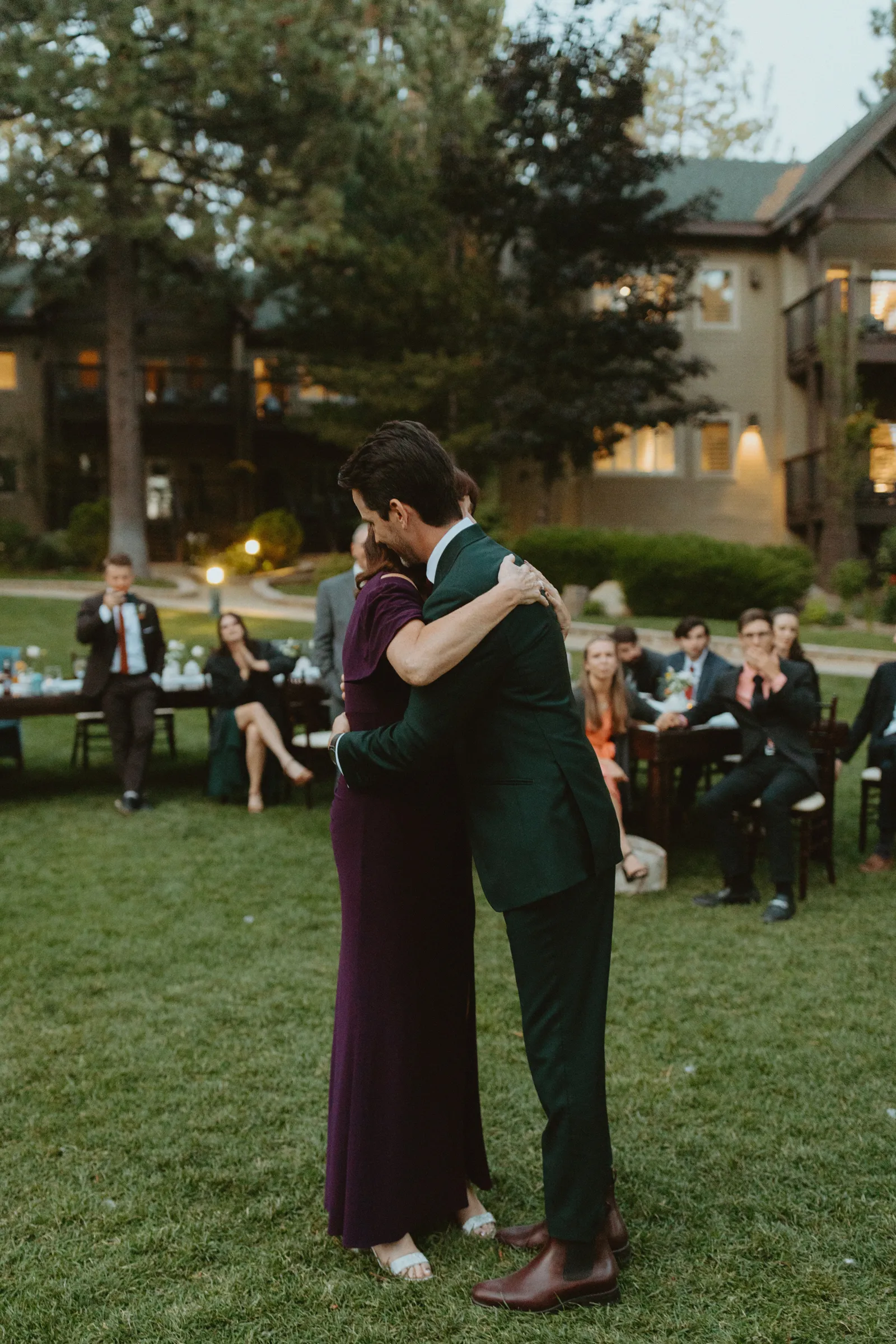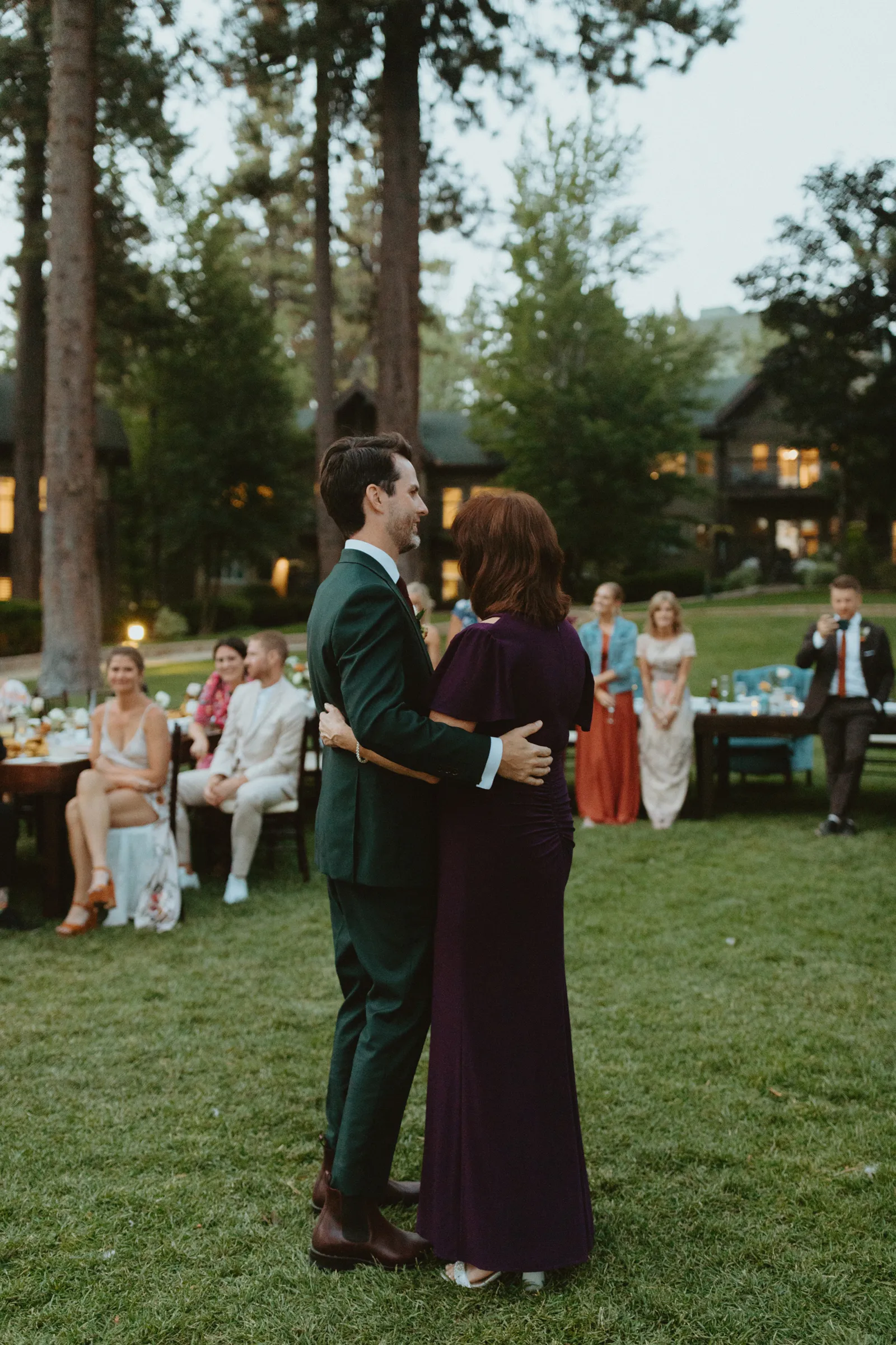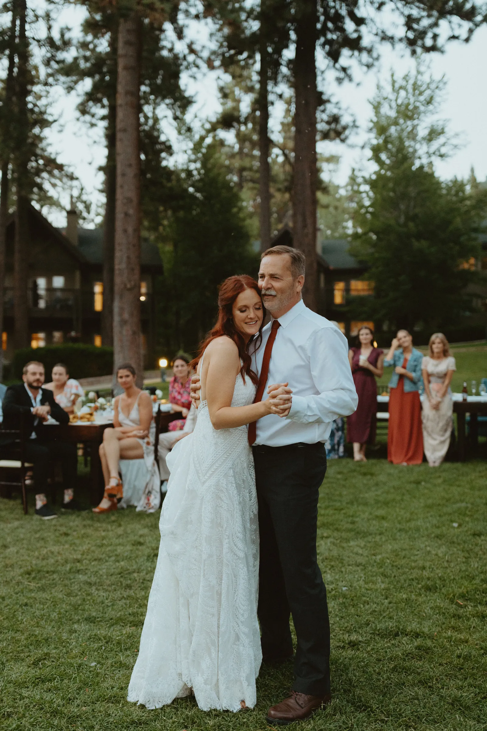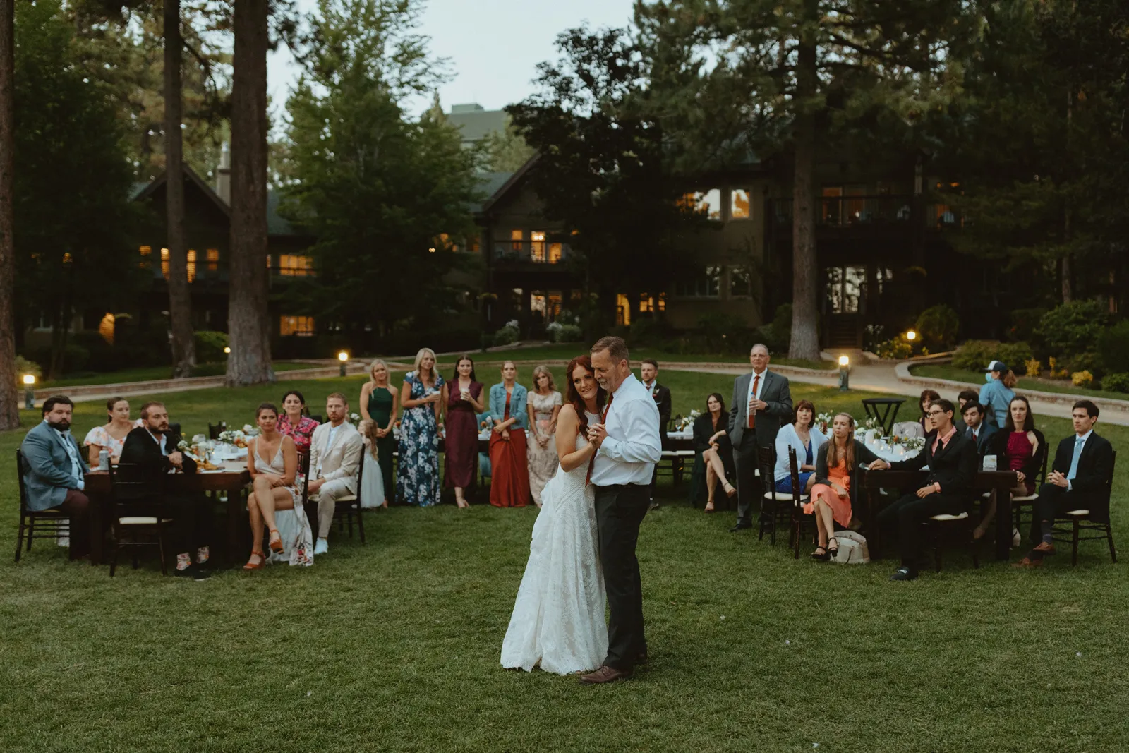 Tom and I met 10 years ago through my brother-in-law. We were friends for years before we started dating. We now have the best situation because my sister and I married into the same friend group! Tom proposed while we were on a weekend getaway to a lake house in Canada. He proposed while we were having a drink around the campfire and he asked if I wanted to go on another adventure with him. Our wedding planning was a bit of a roller coaster, (we were a COVID wedding couple). Our original wedding date was in August 2020, which was cancelled and rescheduled for 2021. In the long run, everything worked out exactly how it was supposed to! We are now living back in our hometown of Buffalo, NY but we did live on the West Coast in Portland, Oregon for a year. We love exploring and seeing new places. We also love our bulldog Leroy, our baby girl, Andi, and nerdy things like Game of Thrones and Harry Potter. Our wedding was such a special day for us. We got married in Lake Tahoe with 30 of our closest family and friends. We had our ceremony and reception at the Hyatt Regency Lake Tahoe on their cottage green, overlooking the lake. It was quiet and simple and exactly how we wanted to spend the day with our family and friends!