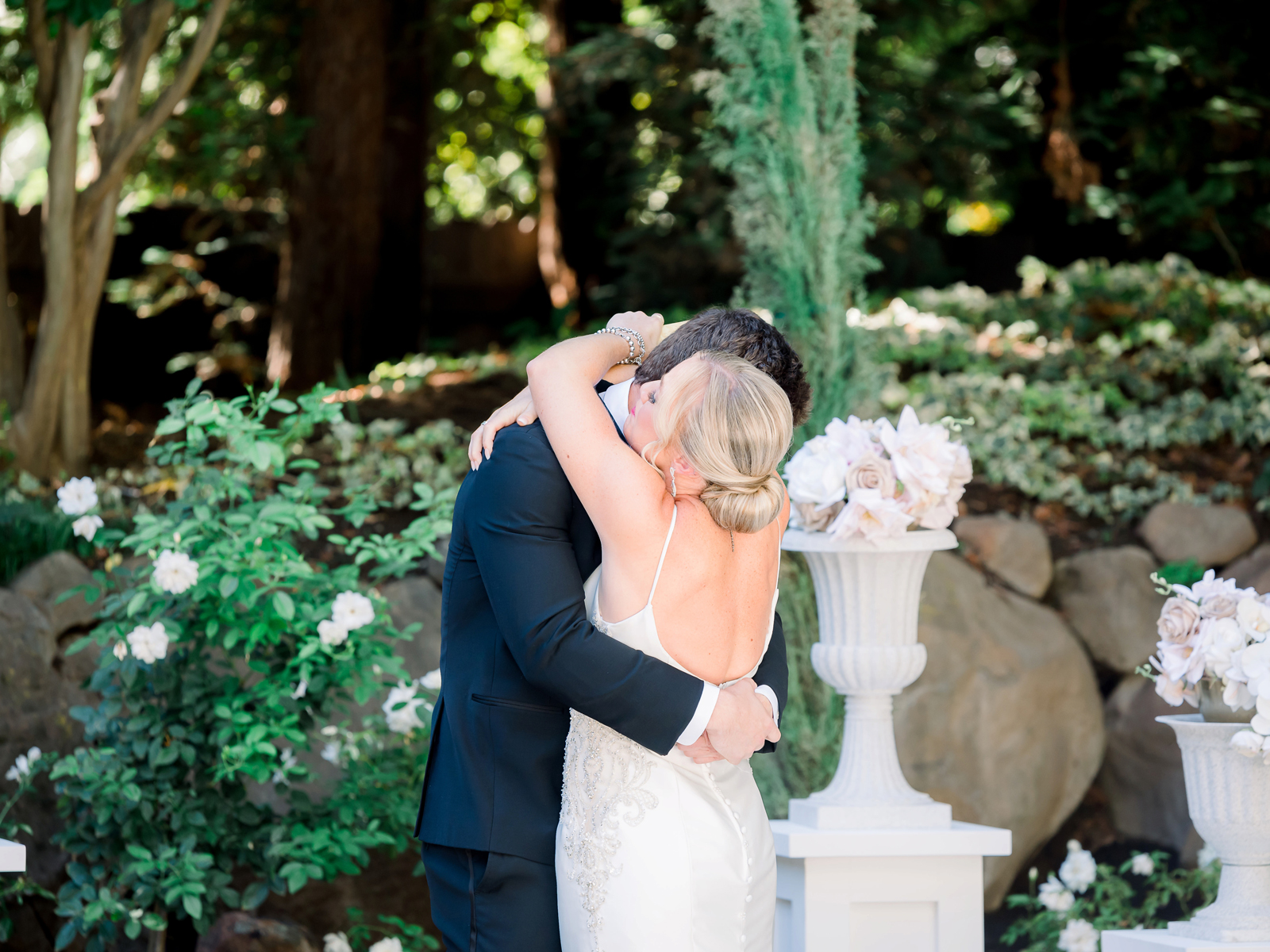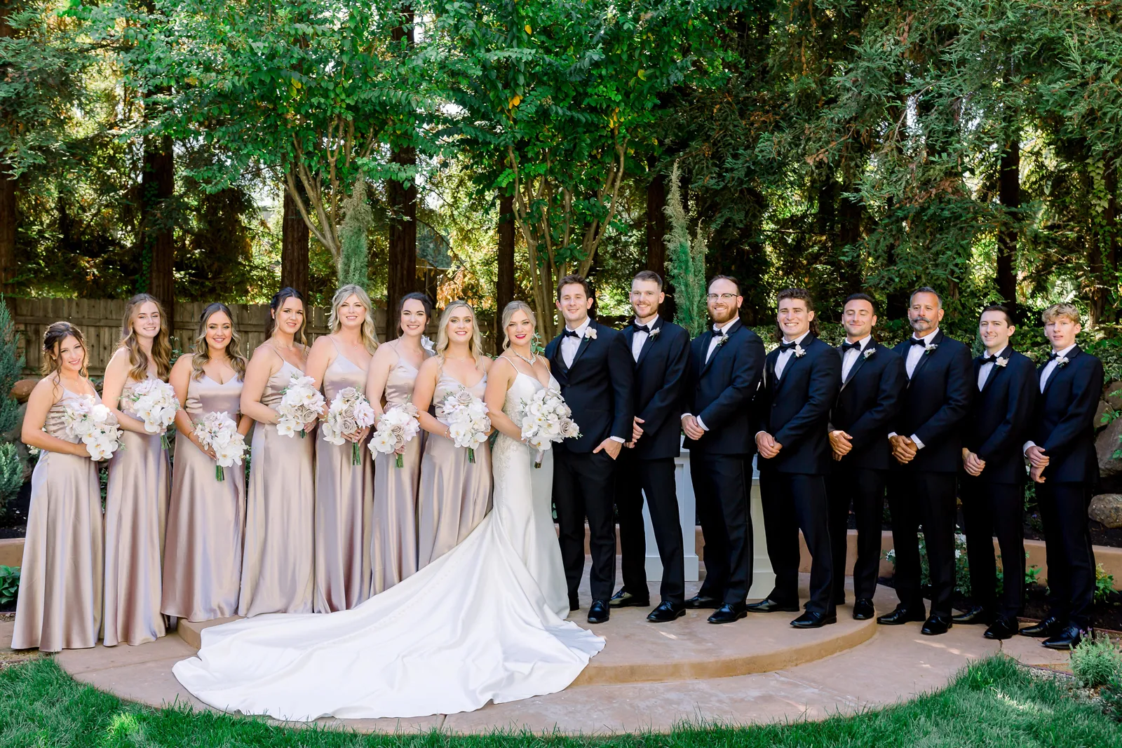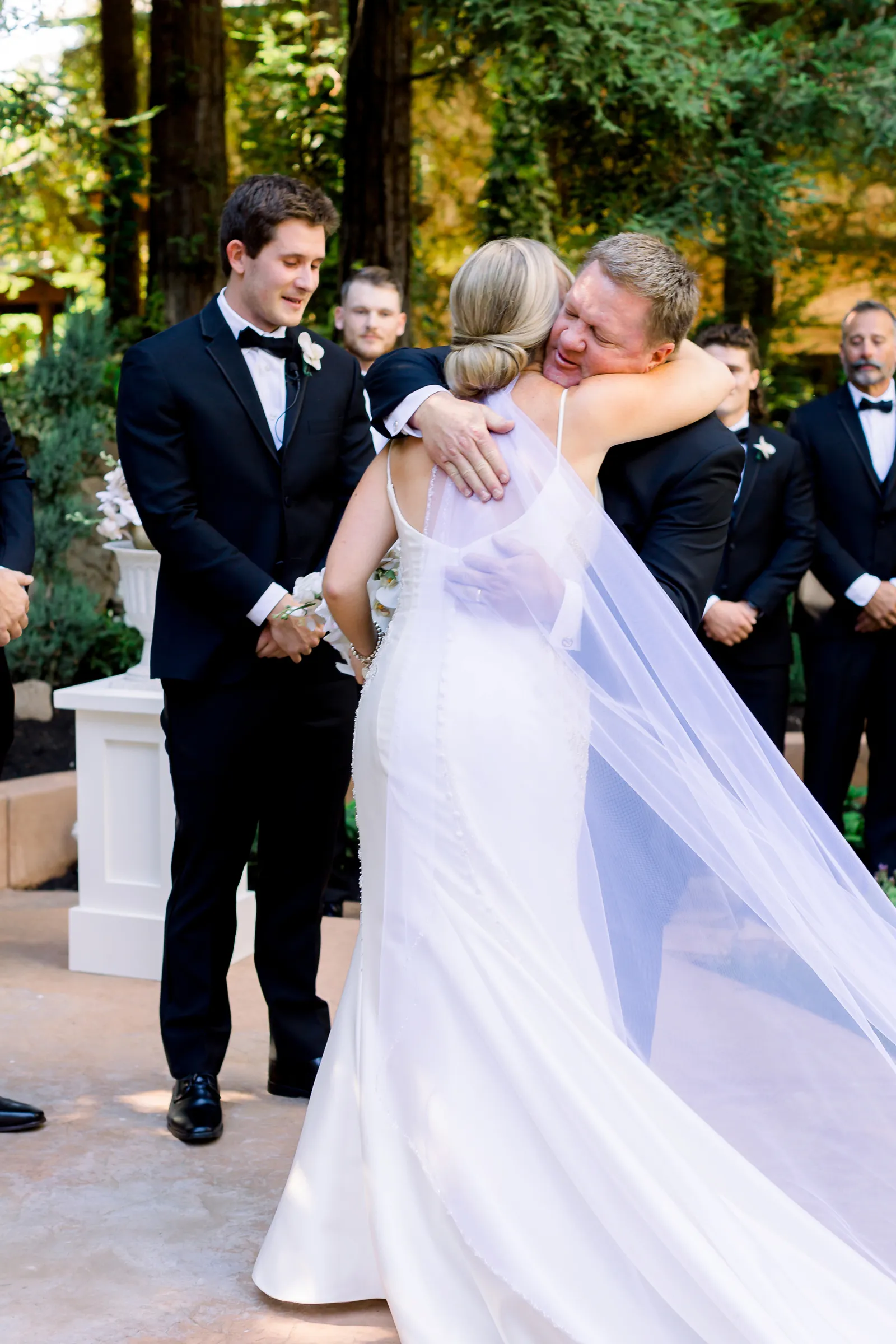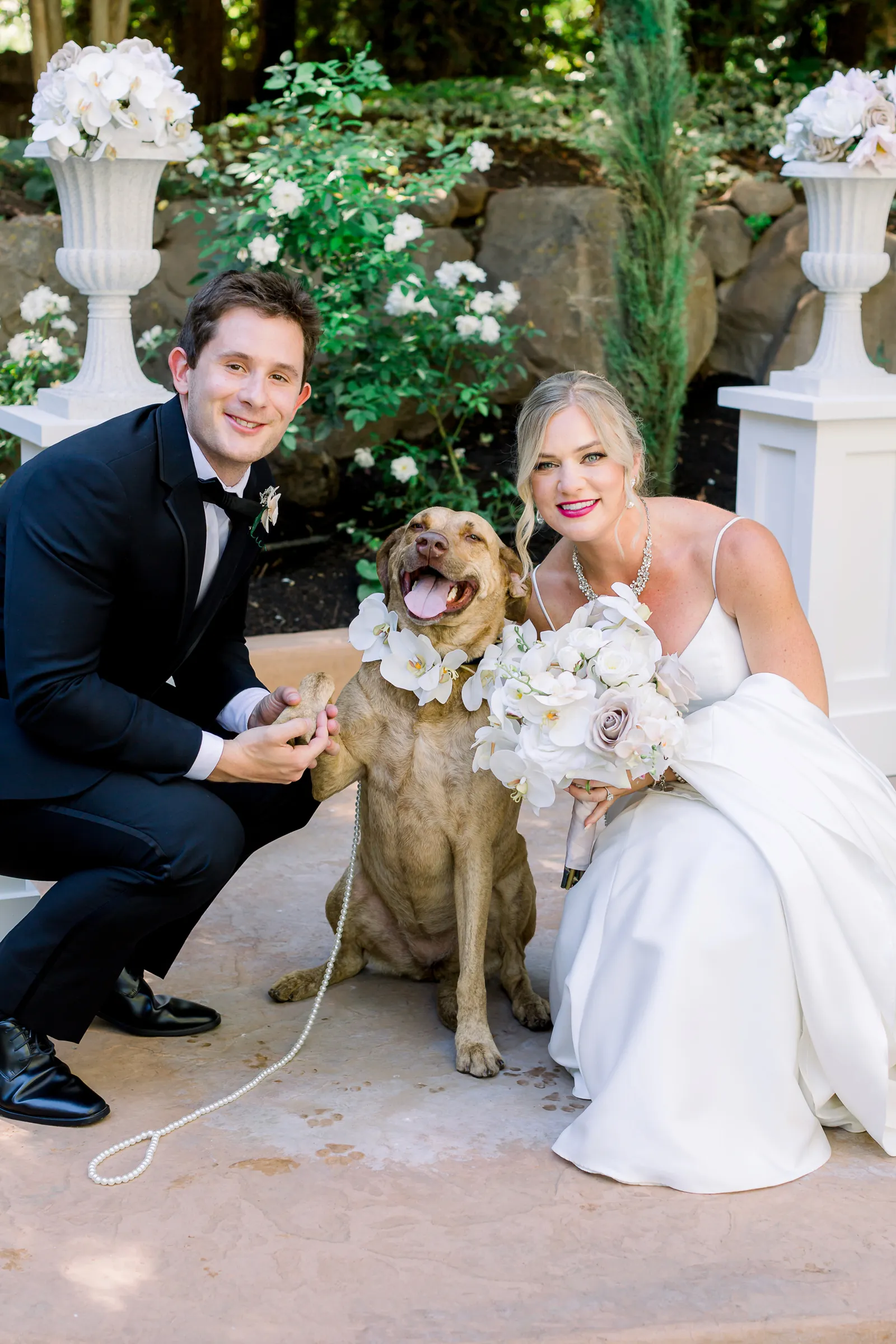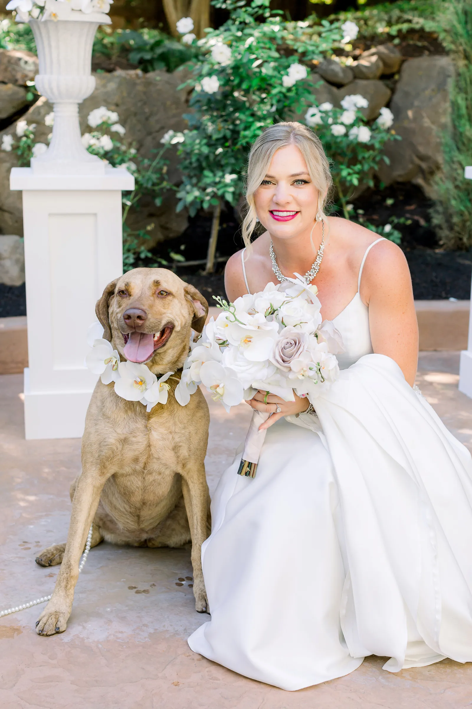 There were three things [that were] very important to my husband that we agreed to at the start of wedding planning. 1. Our dog Bella had to be involved. 2. The venue had to be climate controlled. 3.) He wanted a party! Including all of these items made the day perfect! Our sweet girl walked down the aisle with her own floral collar and pearl leash, and we got incredible photos with her that are so special. It was hot (as any summer in Northern California is) so the indoor reception with AC was brilliant. We did a first look, private vows, and bridal party pictures before the ceremony to expedite the timeline. The short ceremony started at 3:30, all extended family photos were complete by 4:15, and dinner was done by six, leaving the rest of the night for the party! Daniel never left the dance floor and we had so many people share it [with]. [It] was the most fun wedding they had been to in years!