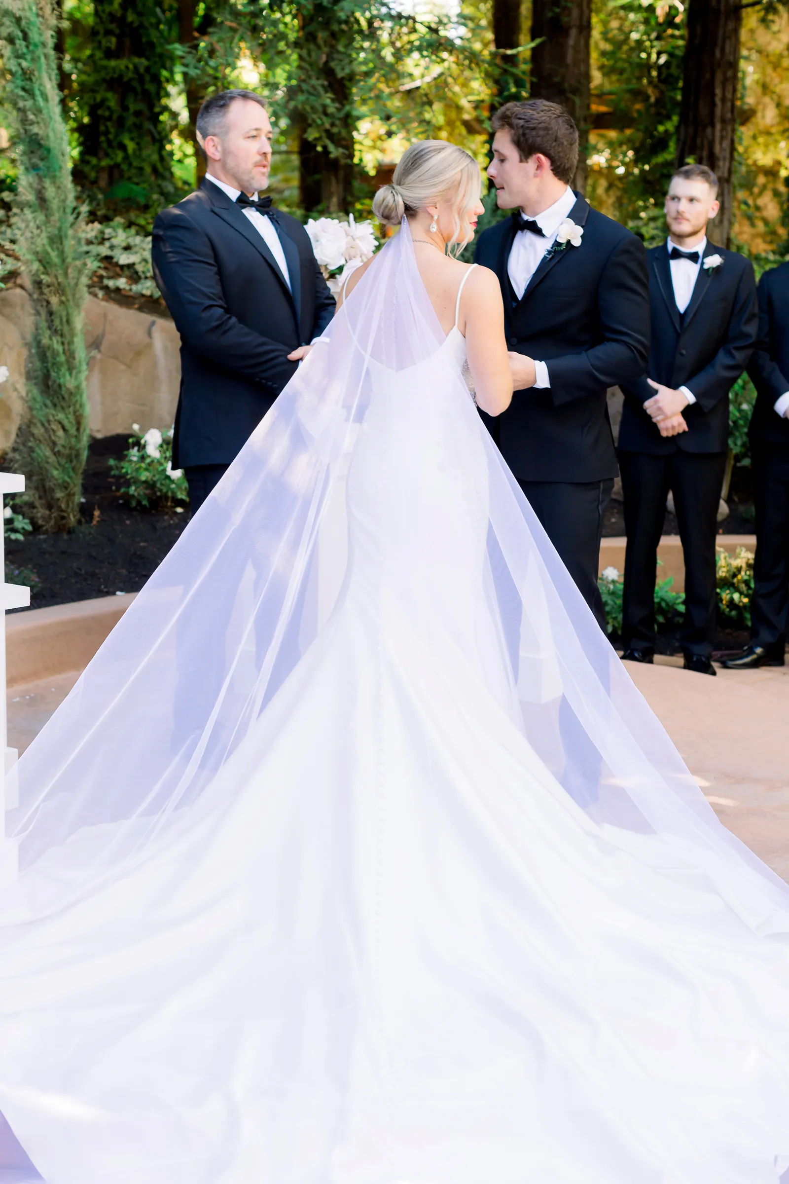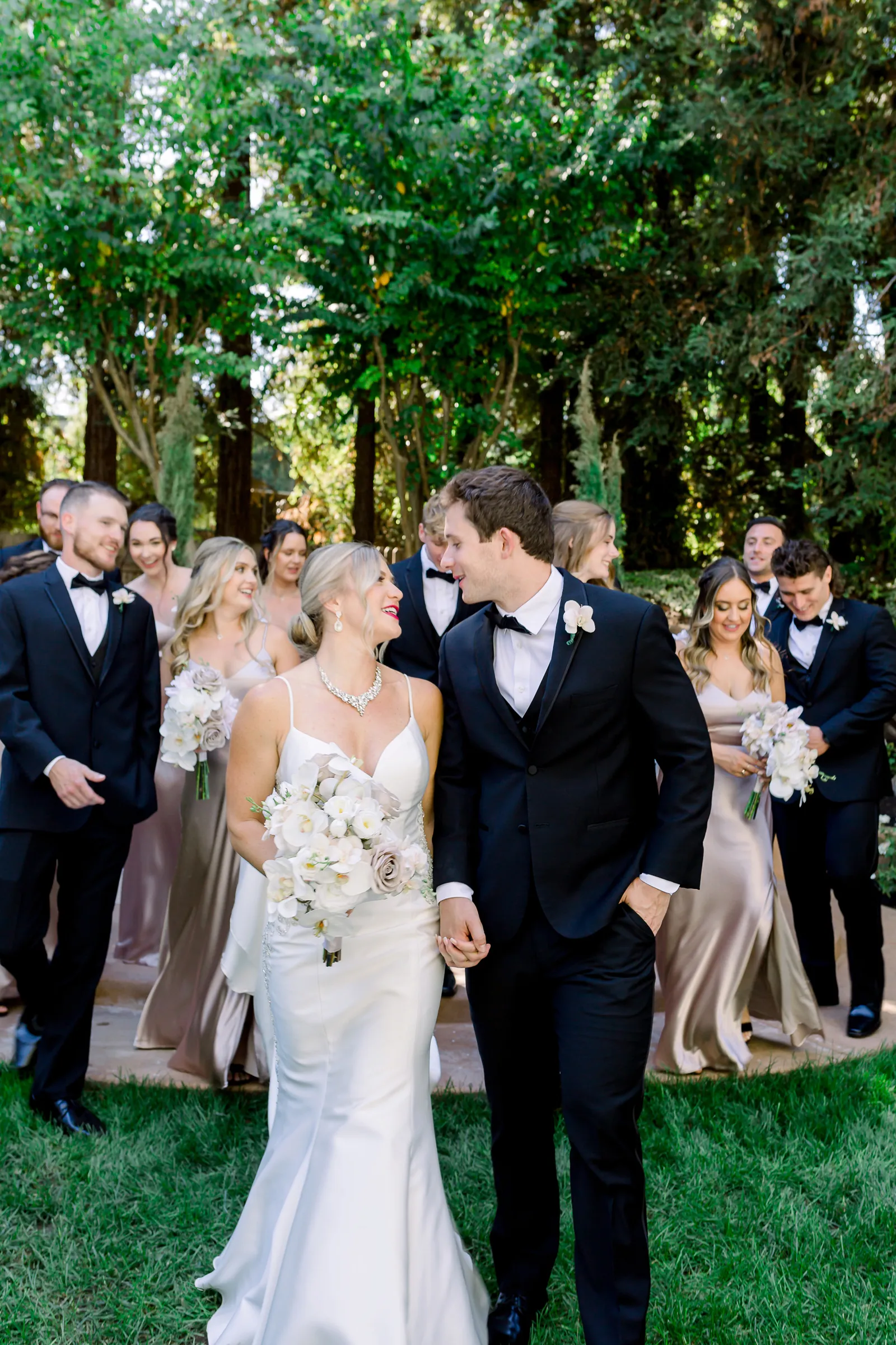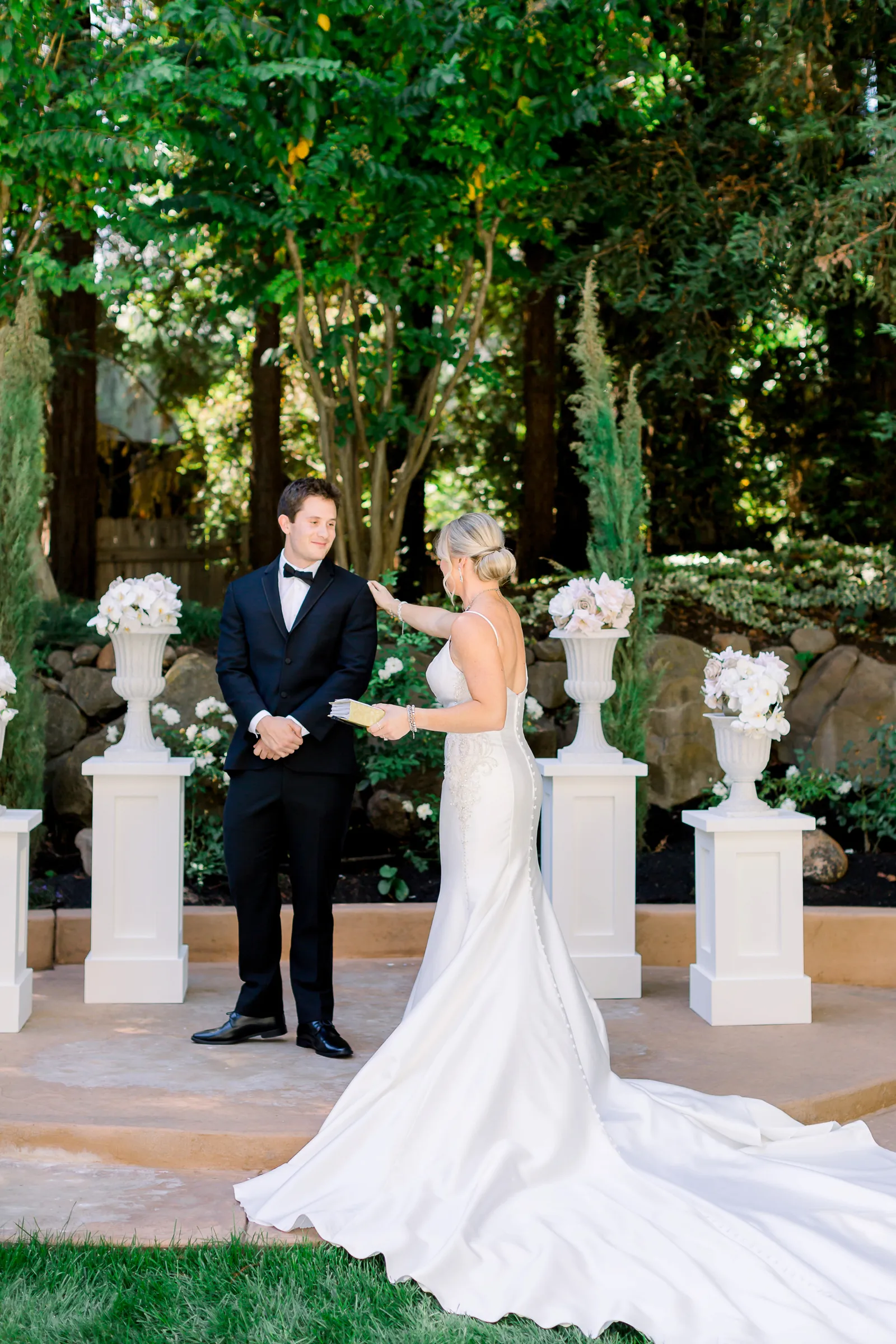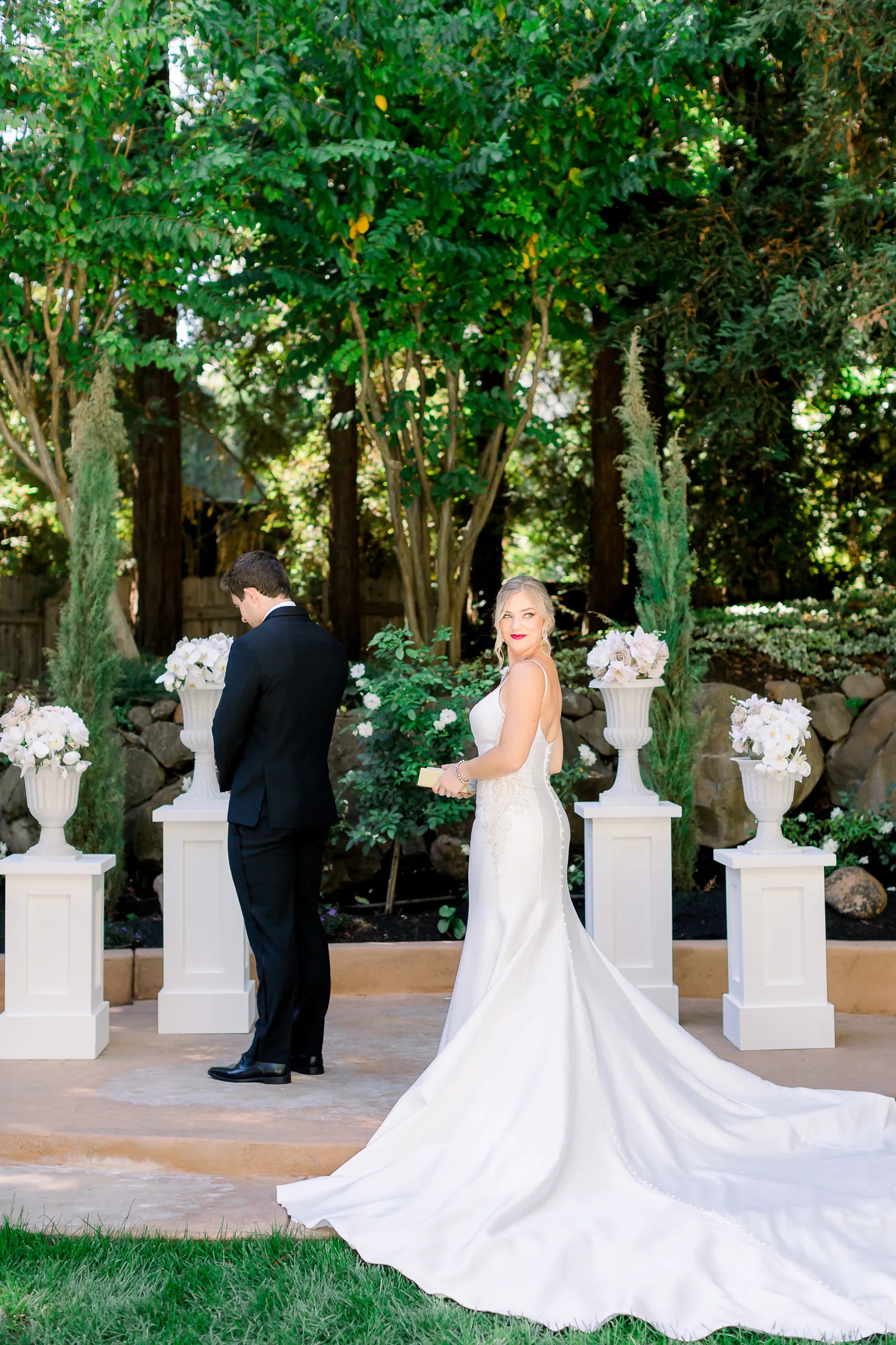 There were three things [that were] very important to my husband that we agreed to at the start of wedding planning. 1. Our dog Bella had to be involved. 2. The venue had to be climate controlled. 3.) He wanted a party! Including all of these items made the day perfect! Our sweet girl walked down the aisle with her own floral collar and pearl leash, and we got incredible photos with her that are so special. It was hot (as any summer in Northern California is) so the indoor reception with AC was brilliant. We did a first look, private vows, and bridal party pictures before the ceremony to expedite the timeline. The short ceremony started at 3:30, all extended family photos were complete by 4:15, and dinner was done by six, leaving the rest of the night for the party! Daniel never left the dance floor and we had so many people share it [with]. [It] was the most fun wedding they had been to in years!