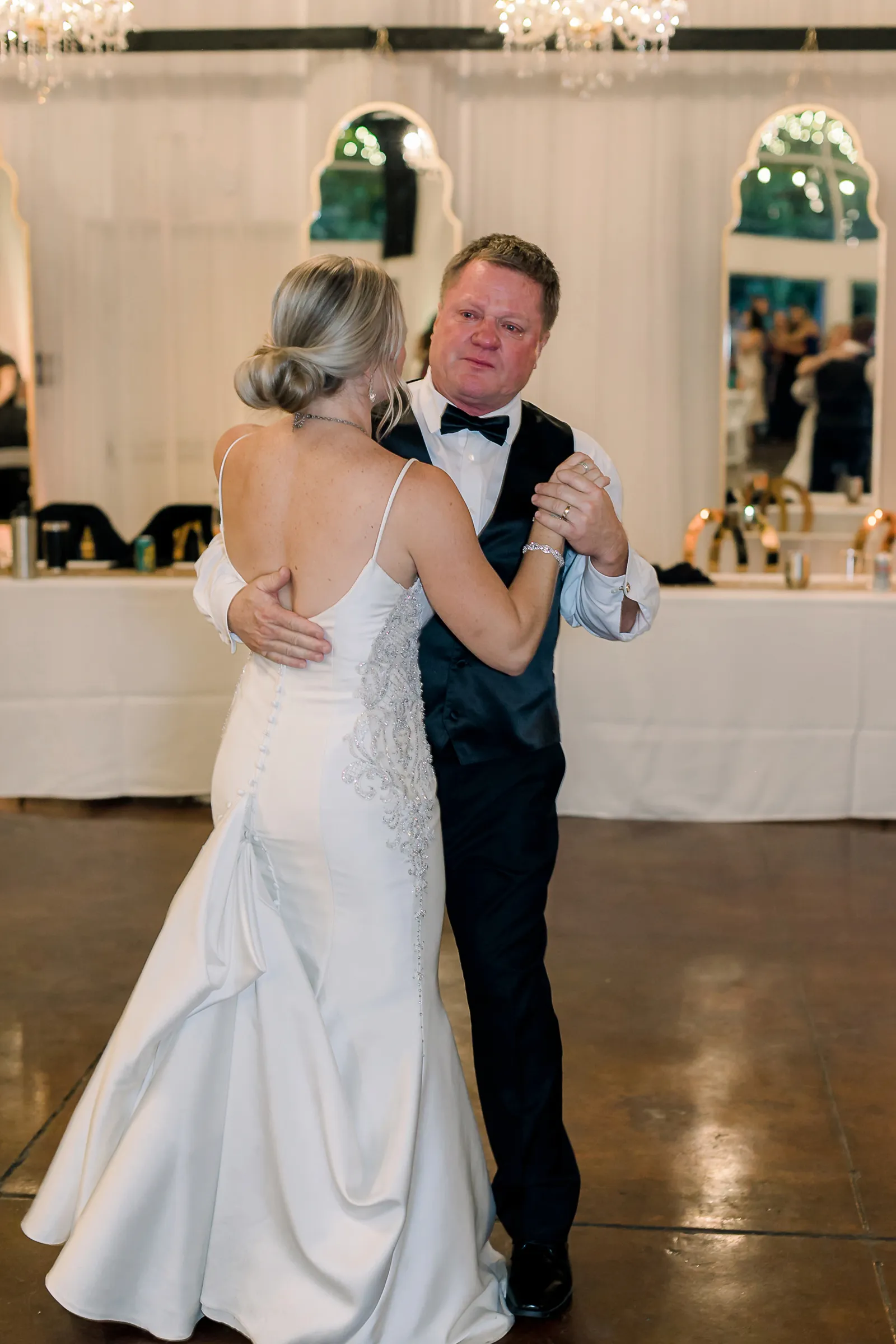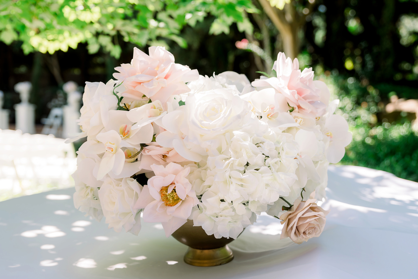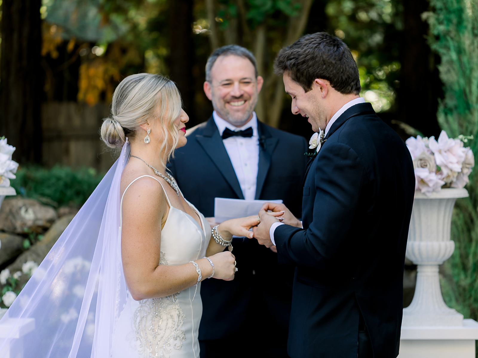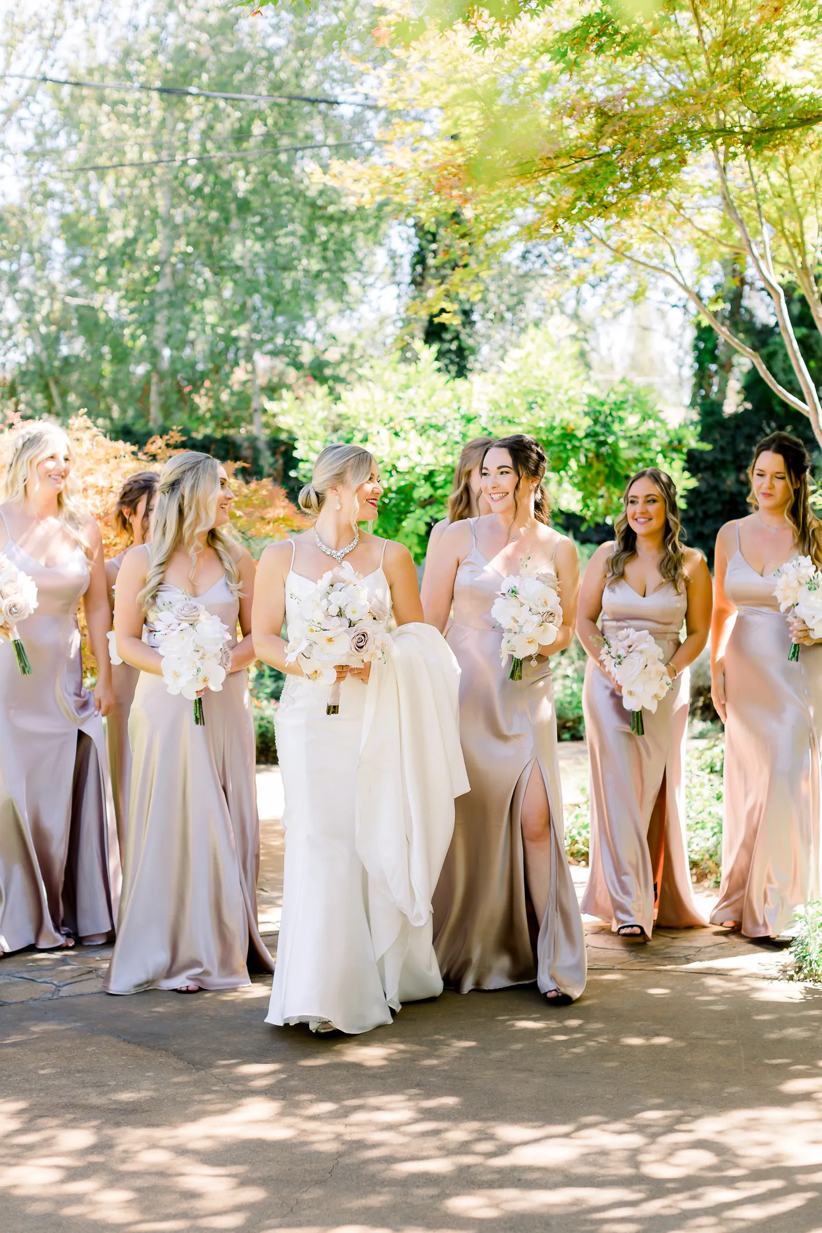 There were three things [that were] very important to my husband that we agreed to at the start of wedding planning. 1. Our dog Bella had to be involved. 2. The venue had to be climate controlled. 3.) He wanted a party! Including all of these items made the day perfect! Our sweet girl walked down the aisle with her own floral collar and pearl leash, and we got incredible photos with her that are so special. It was hot (as any summer in Northern California is) so the indoor reception with AC was brilliant. We did a first look, private vows, and bridal party pictures before the ceremony to expedite the timeline. The short ceremony started at 3:30, all extended family photos were complete by 4:15, and dinner was done by six, leaving the rest of the night for the party! Daniel never left the dance floor and we had so many people share it [with]. [It] was the most fun wedding they had been to in years!