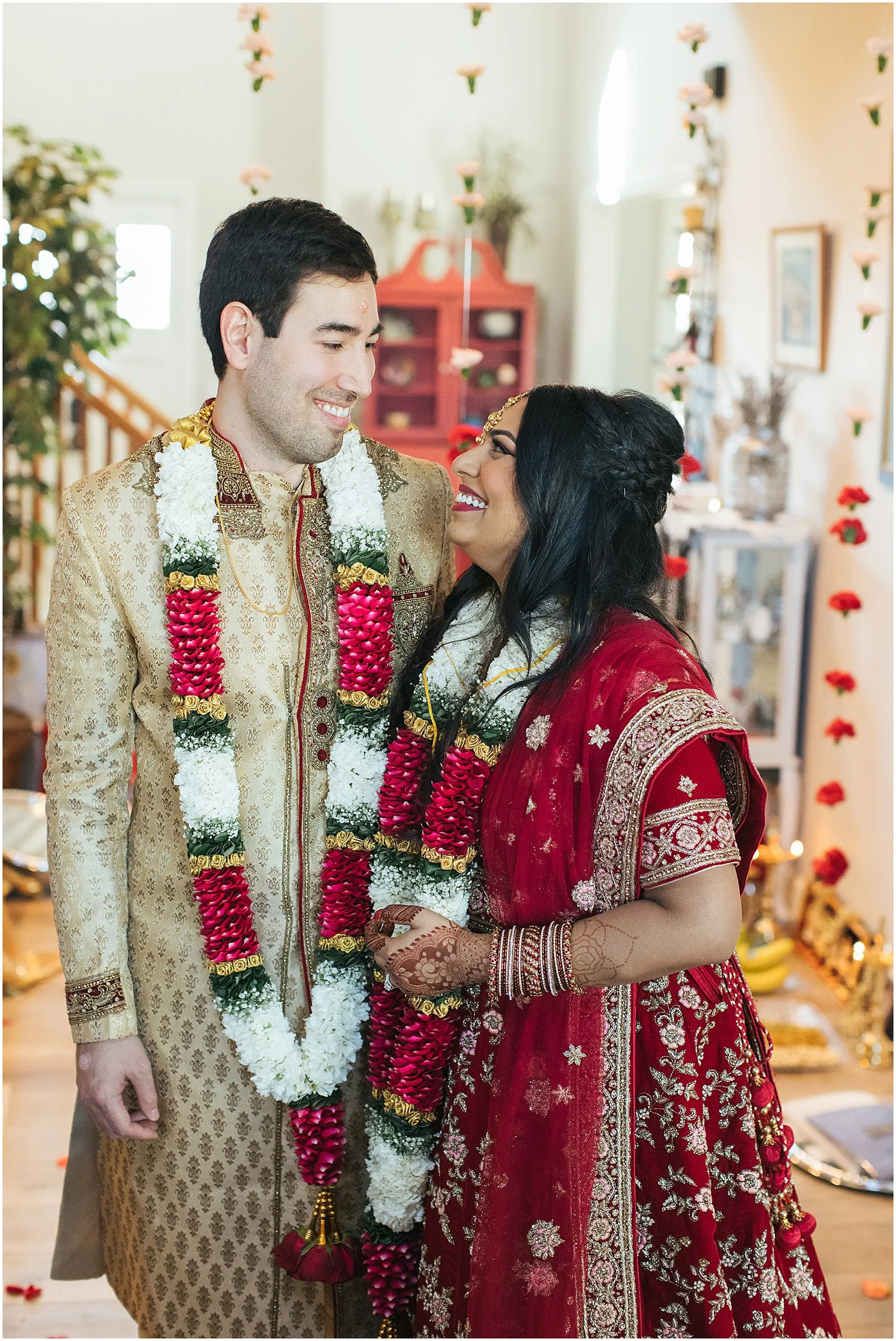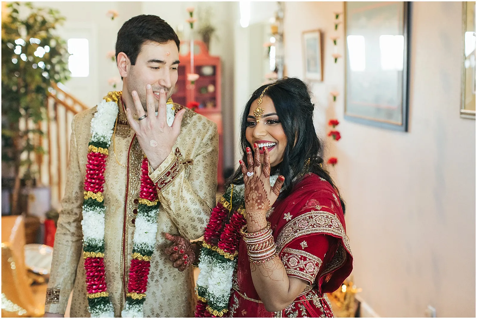 Tell us a little about you and your beloved: Chris and I worked on the same floor at work, and after over a year of us sneaking glances at each other, one day in 2017, I decided to ask if he’d like my number. In writing this, I realize now that this little gesture has played itself out in a big way through the course of our relationship. The two of us are always anticipating the other’s thoughts and proactively responding to them. I think it’s part of what makes us such a great team, and this was no exception when it came to when he proposed or how our wedding was planned. In October 2019, Chris proposed in Tahoe. He told me he had something special for me, and expecting the ring, I started mentally considering the best angles for a photo. Imagine my surprise when, knowing I’d do this, he pulled out a ring pop instead. While I was busy fumbling with my shock (and more importantly, the ring pop), Chris was busy getting down on one knee with an actual ring. At that point, I’m not sure which came first: me crying or me saying yes. As we started planning our wedding and hearing little bits and pieces about COVID-19, we thought we’d be okay. What we didn’t know is that much like the rest of the world, we’d go on to watch in horror as COVID-19 shut down all plans of our wedding, honeymoon, and all of the other fun things we’d planned. I think the sting of planning (and re-planning again, and again, and again…) wouldn’t have hurt so much if we hadn’t planned so many little surprises for our own family. It felt like we were perpetually delaying a surprise that we couldn’t wait to give them. As we neared our October wedding date, I started feeling more and more hopeless. I had planned our wedding four different times at this point, and every detail just hurt to think about because I felt like it would never happen. Chris helped me realize that we could still get married and not let the pandemic take away our happiness, and he was right! We ended up having a traditional South Indian micro-wedding with our immediate families in October. Like I said…we’re a pretty great team!