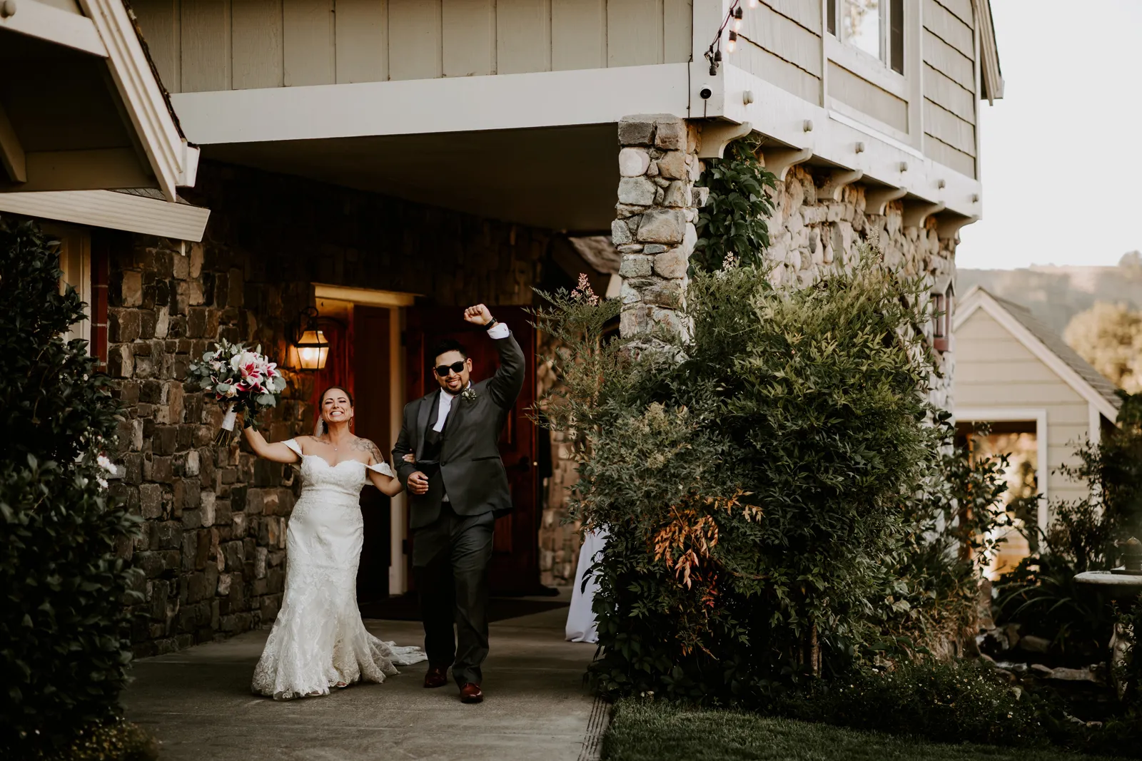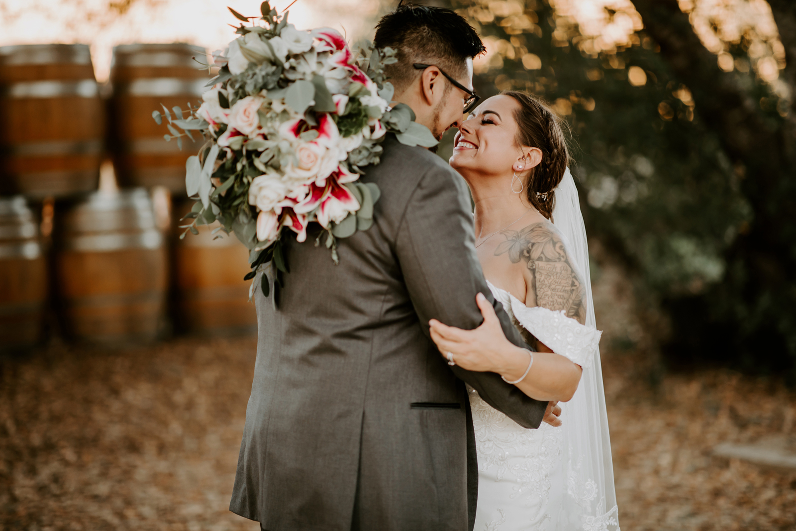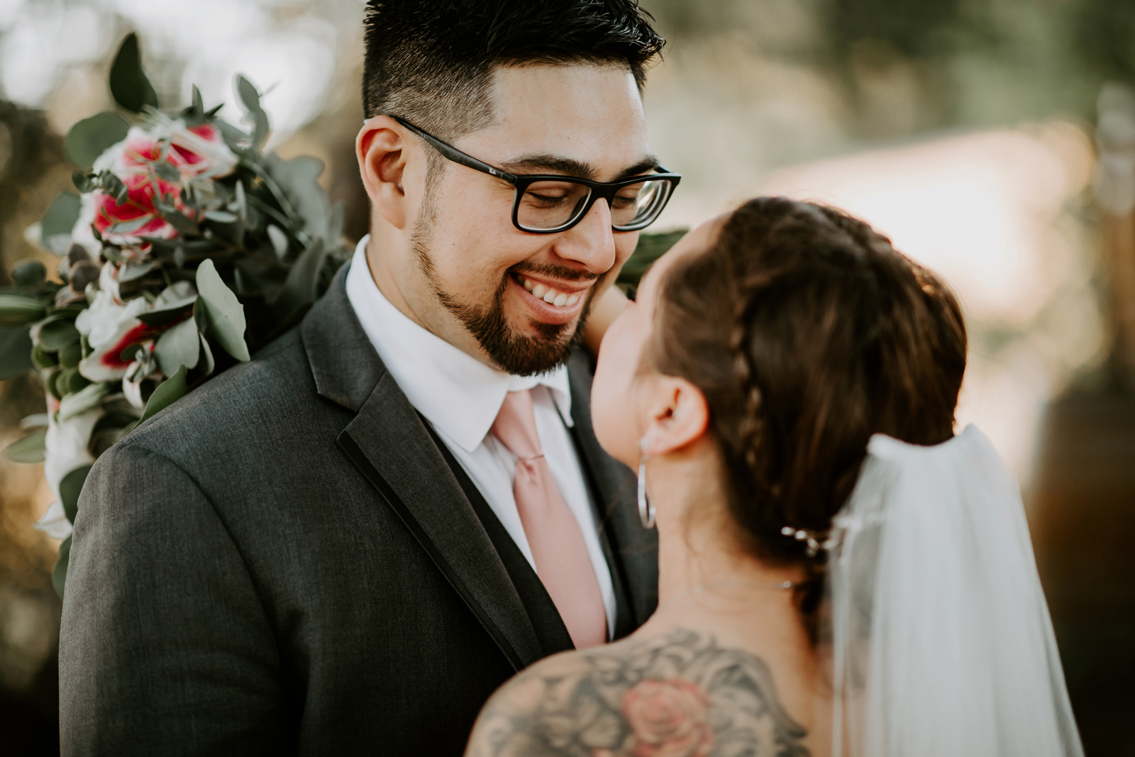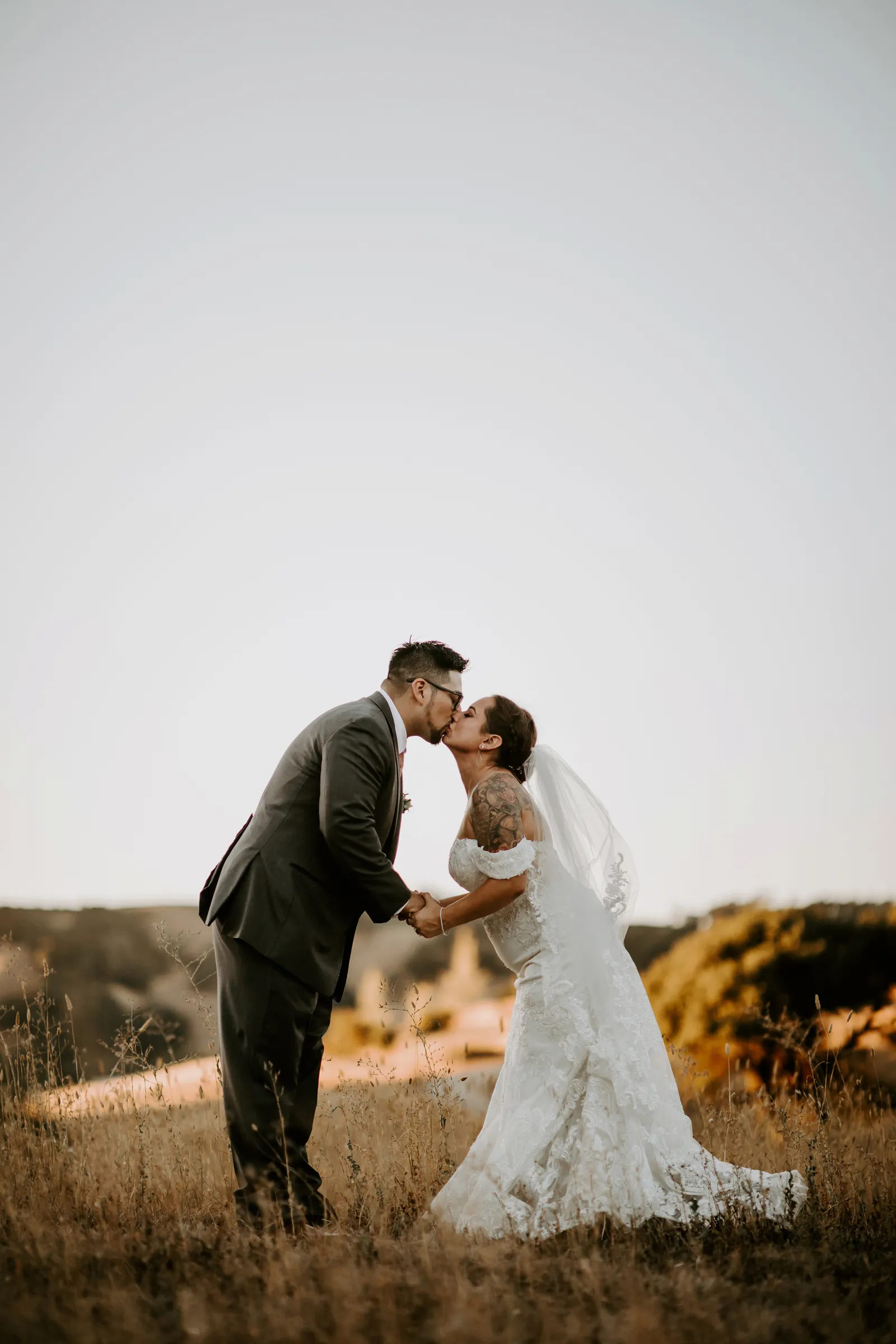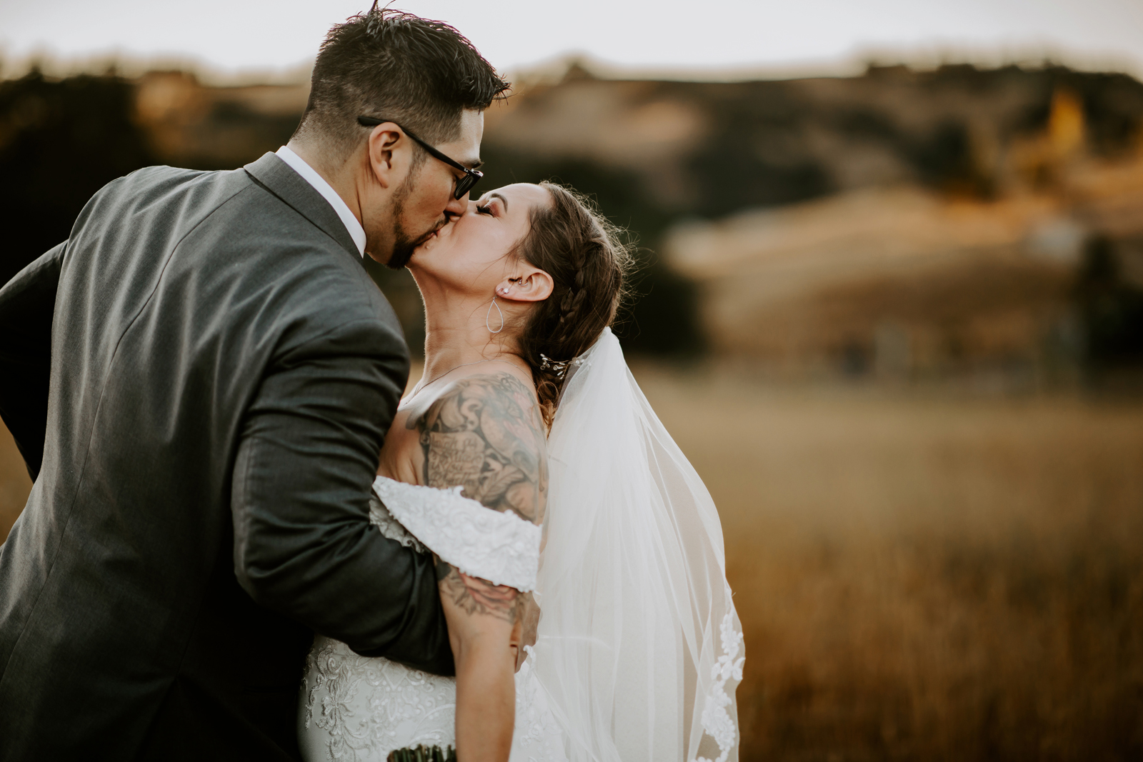 Happy Real Weddings Wednesdays, everyone. Today, we’re celebrating Leslie + Rudy’s beautiful Mountain House Estate wedding, complete with beautiful sunset photos, a stunning rose-petal wedding cake, and more. Keep scrolling to read more about the couple, and to see more amazing photos!