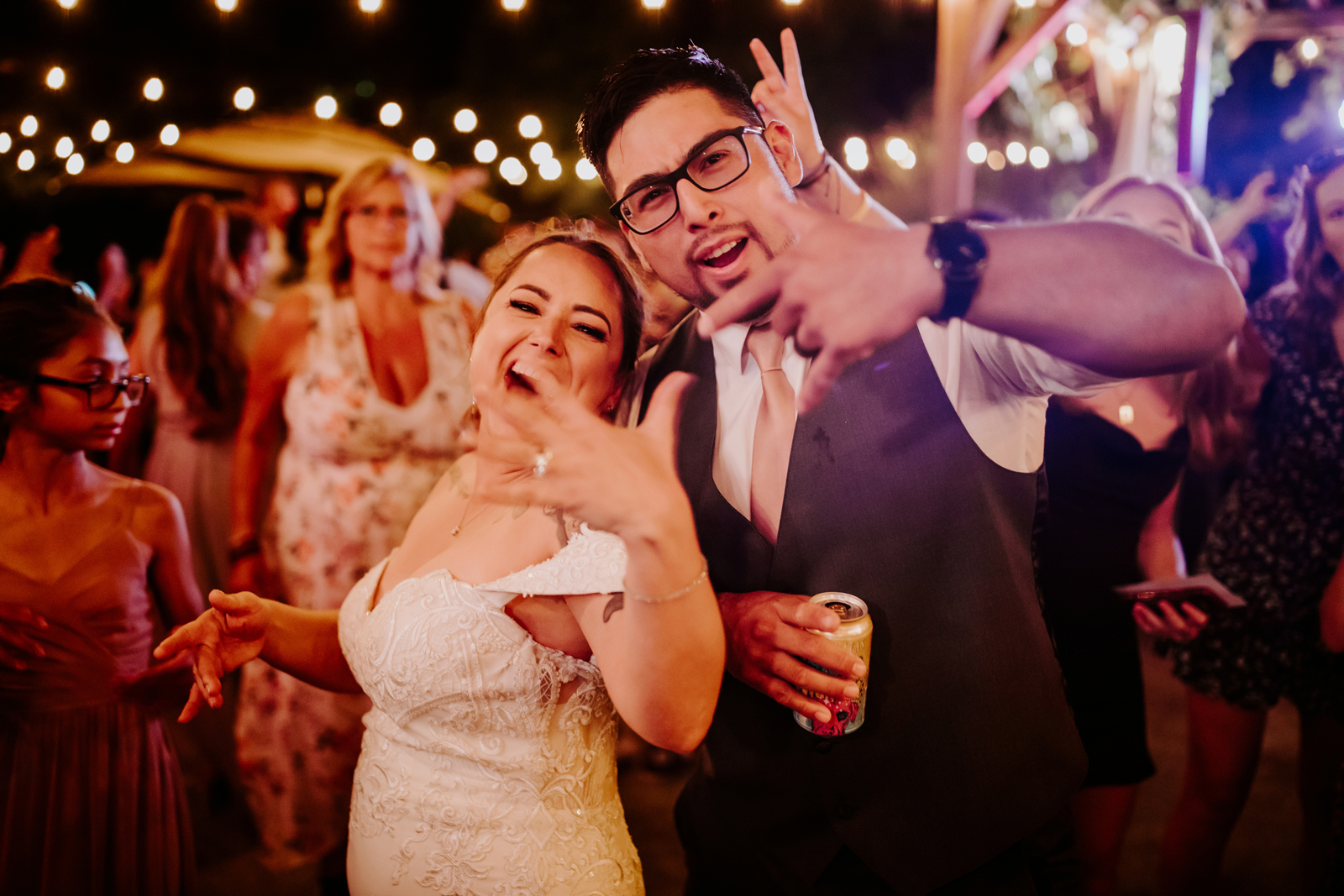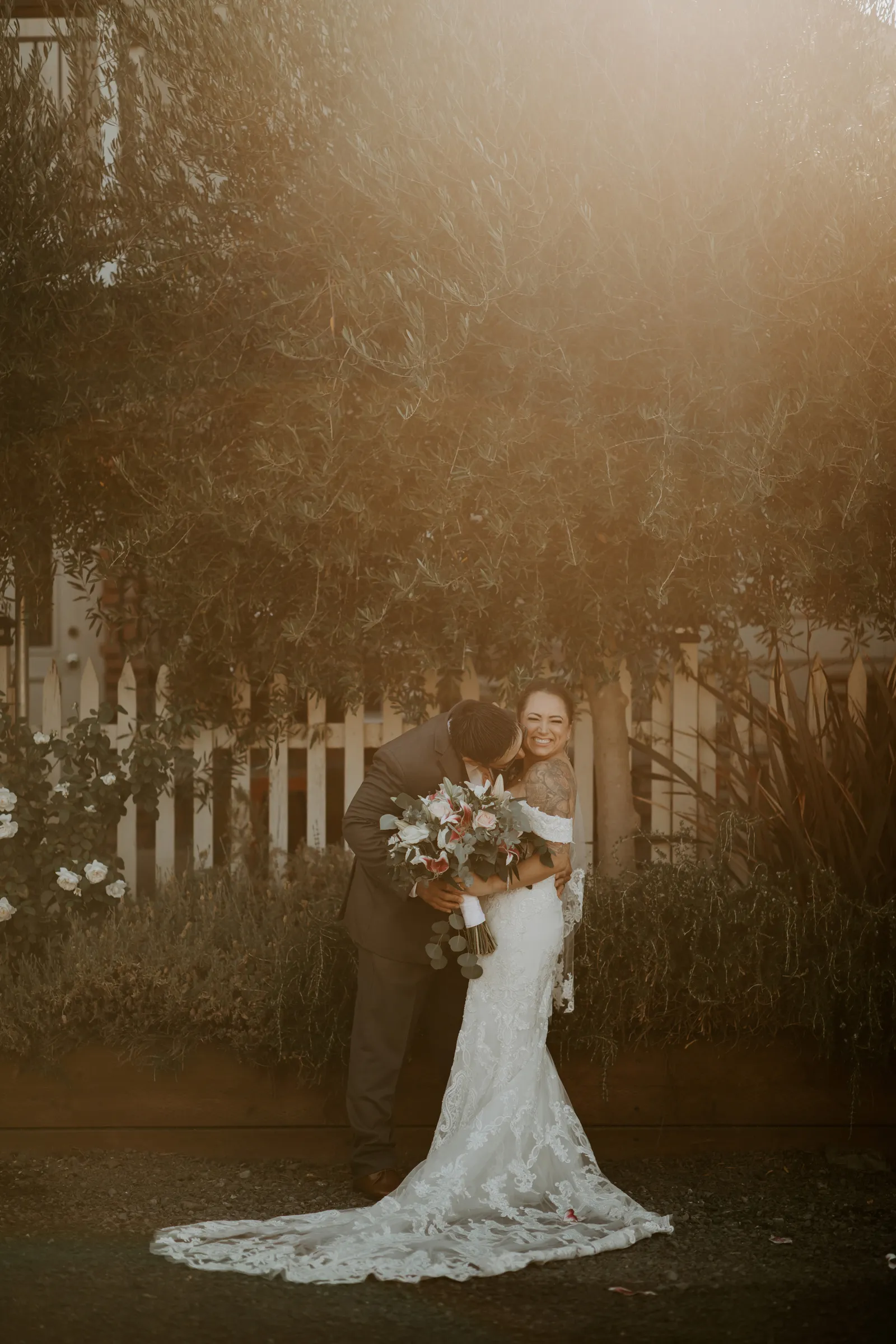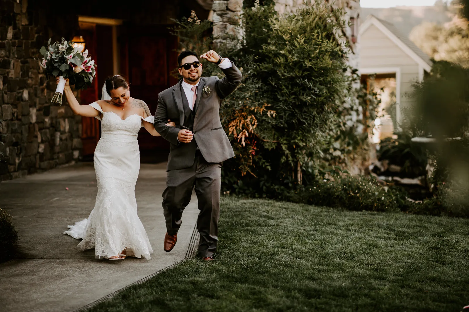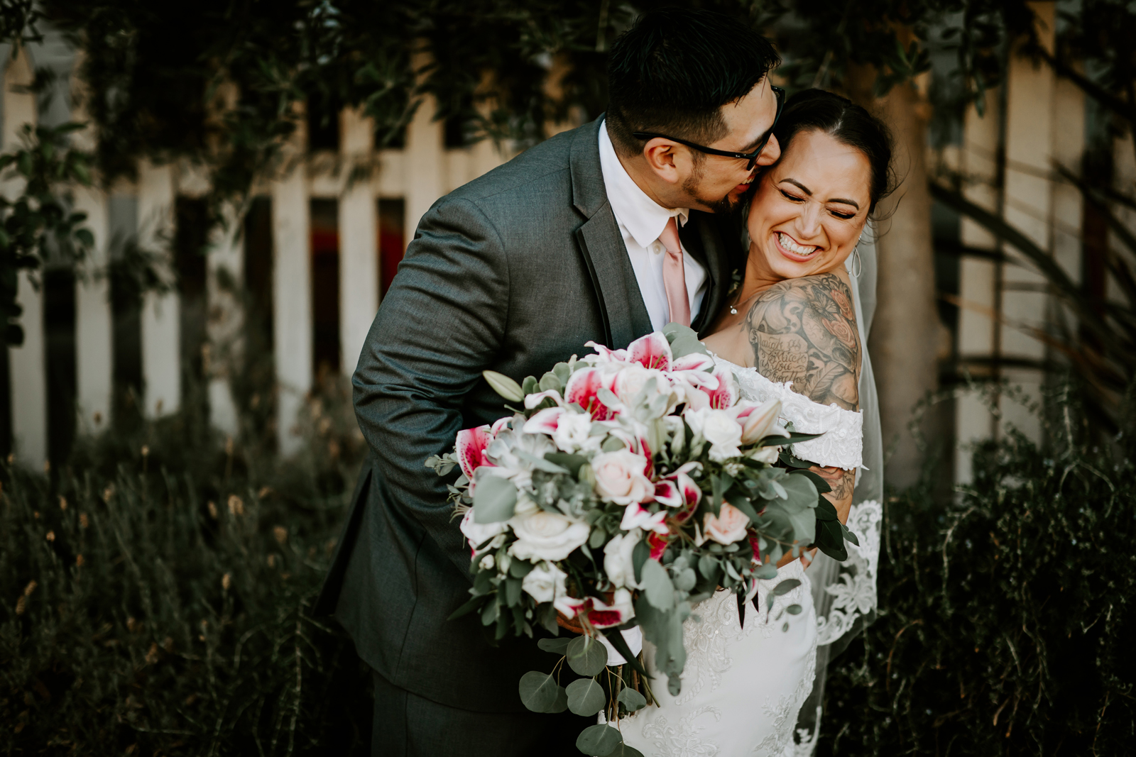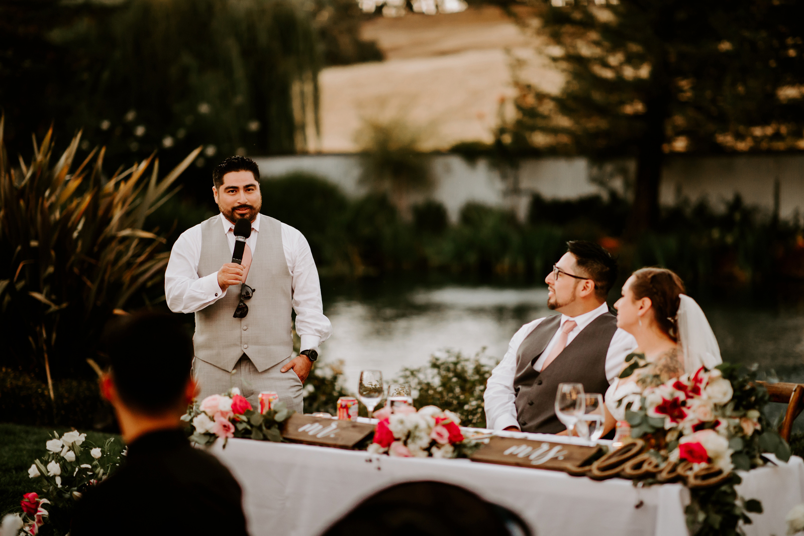 Happy Real Weddings Wednesdays, everyone. Today, we’re celebrating Leslie + Rudy’s beautiful Mountain House Estate wedding, complete with beautiful sunset photos, a stunning rose-petal wedding cake, and more. Keep scrolling to read more about the couple, and to see more amazing photos!