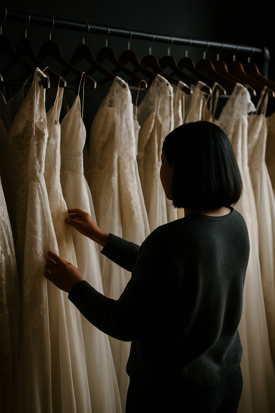 I bring a hand-picked rack of gowns straight to your home, tailored to your style, your body, and your vibe.