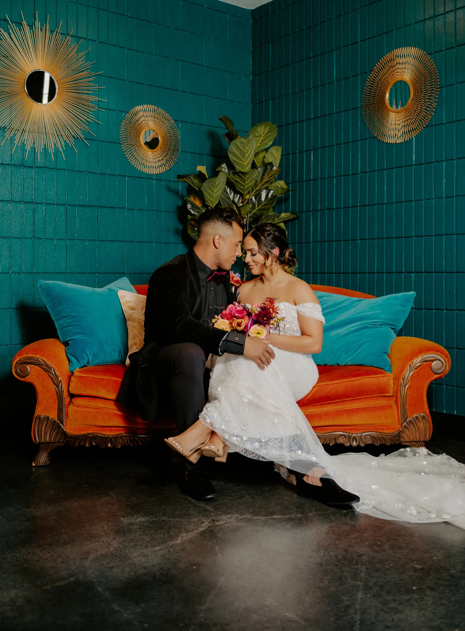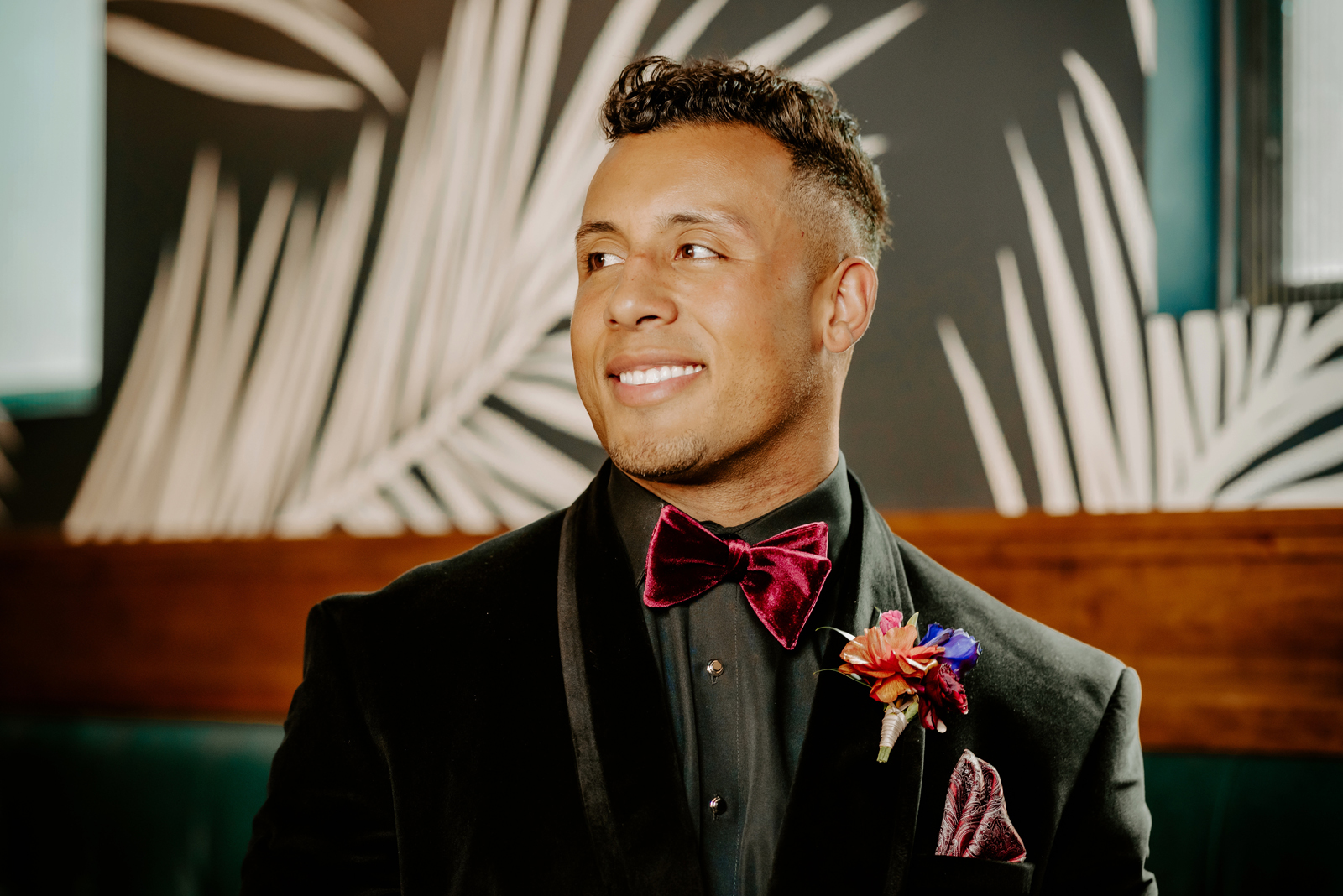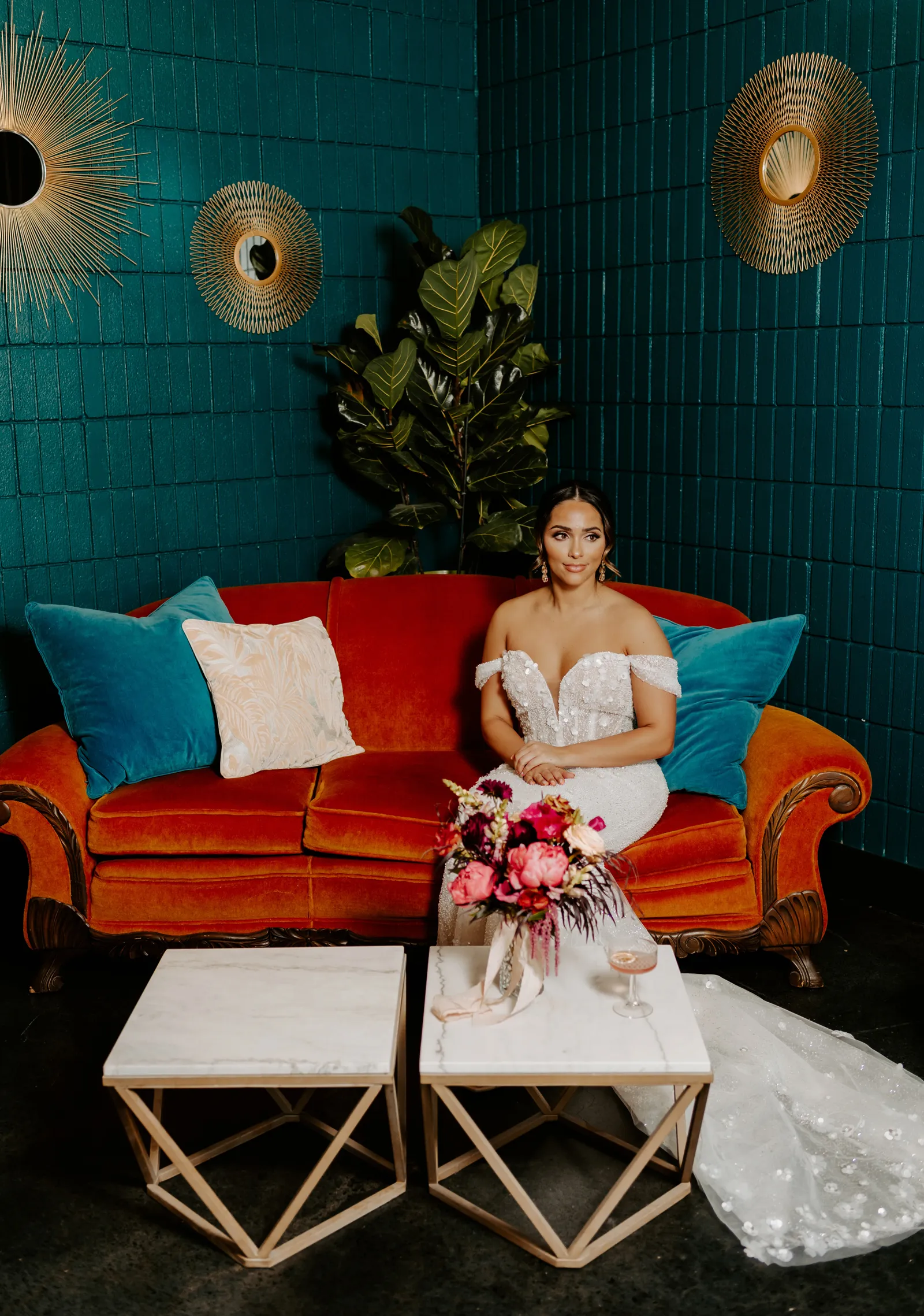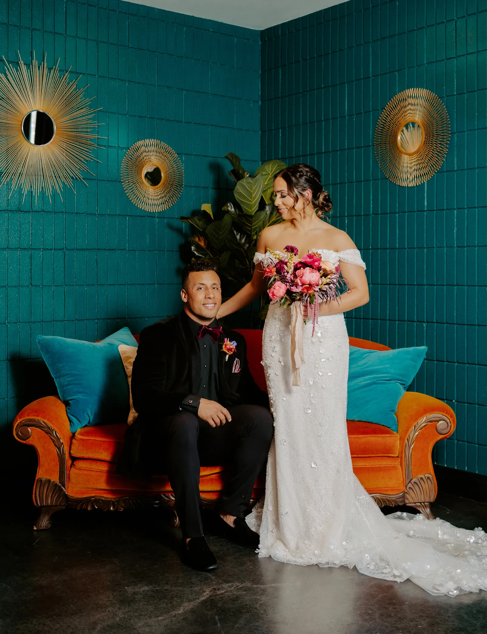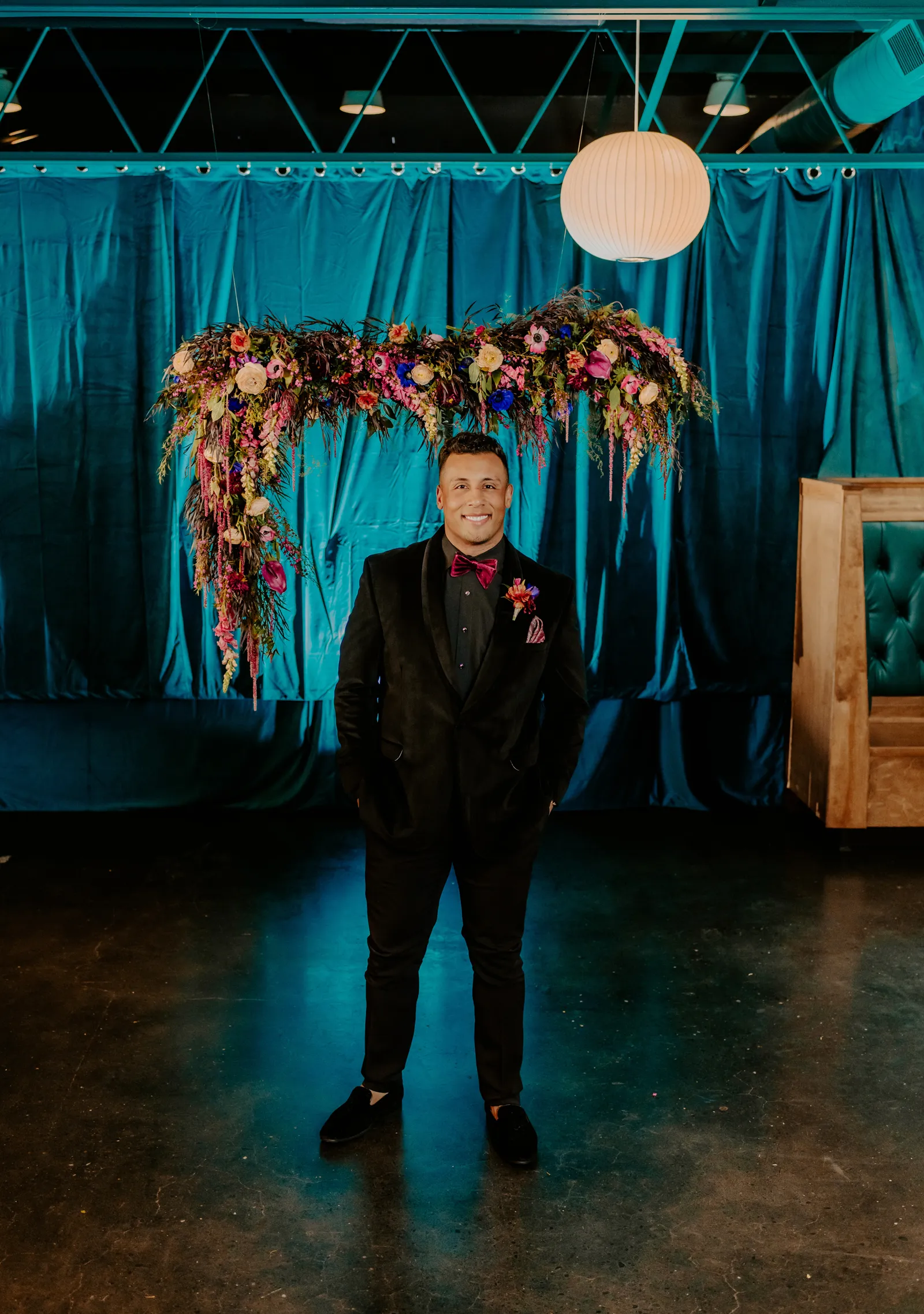 Happy Submitted Styled Shoot Sunday, folks! Today, we have an absolutely unique and colorful styled shoot with tons of teal and pops of deep fuchsia. This beautiful shoot has a bit of everything for everyone, be it sleek tuxedos, courtesy of Tuxedo Den, a too-pretty-to-eat wedding cake, a venue full of retro vibes (thanks Shangri-la Fair Oaks!), or a mouthwatering food and drink setup. Keep scrolling to get in on all the fun details. Happy Sunday, and happy reading!