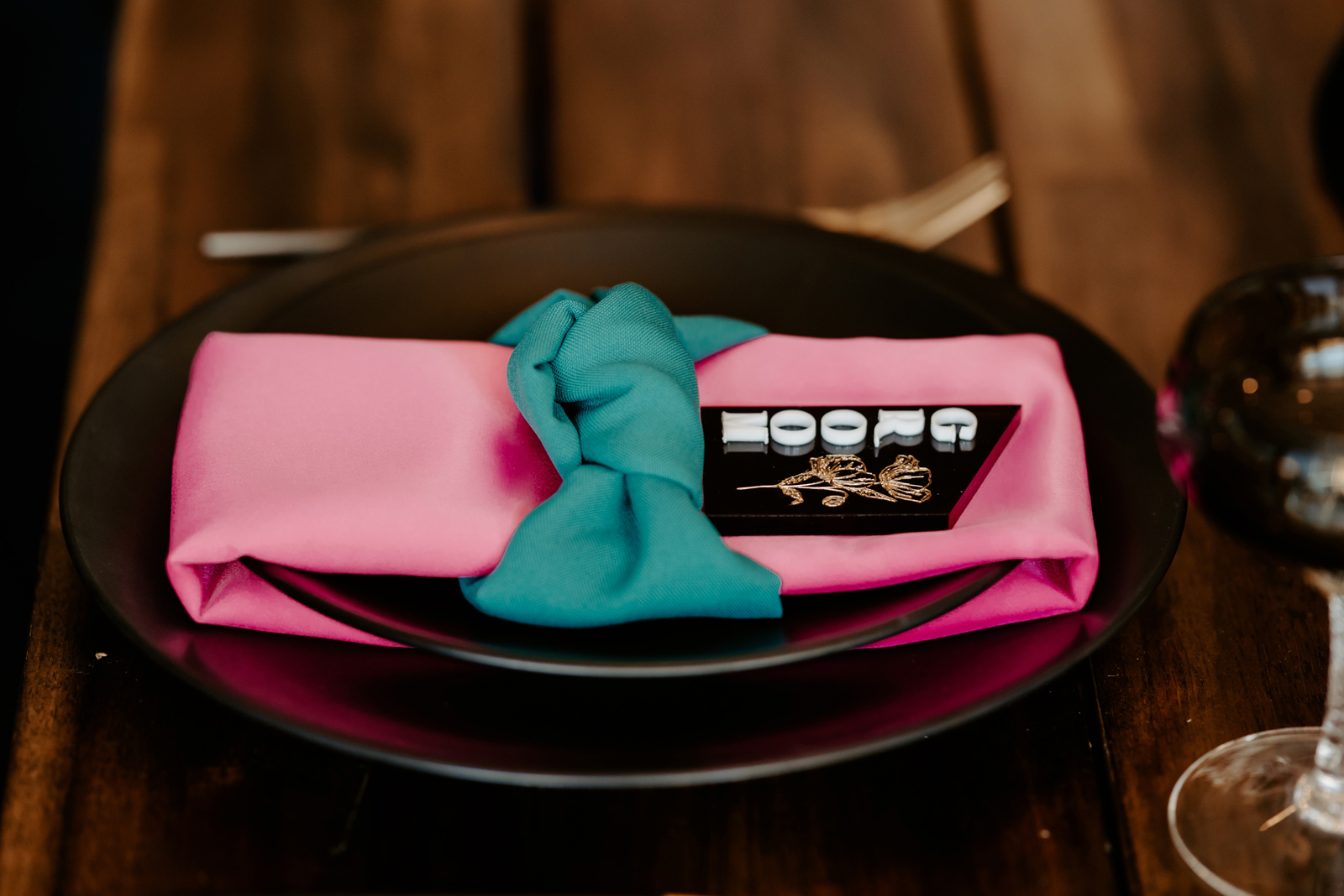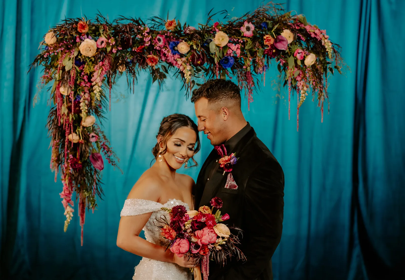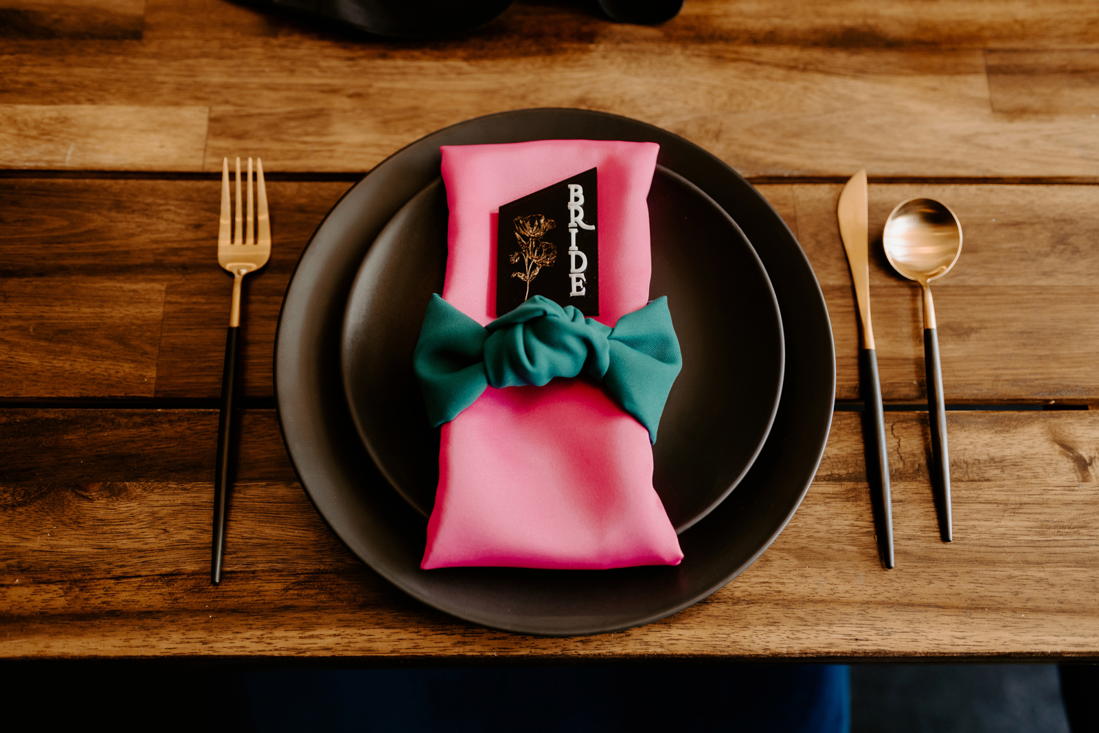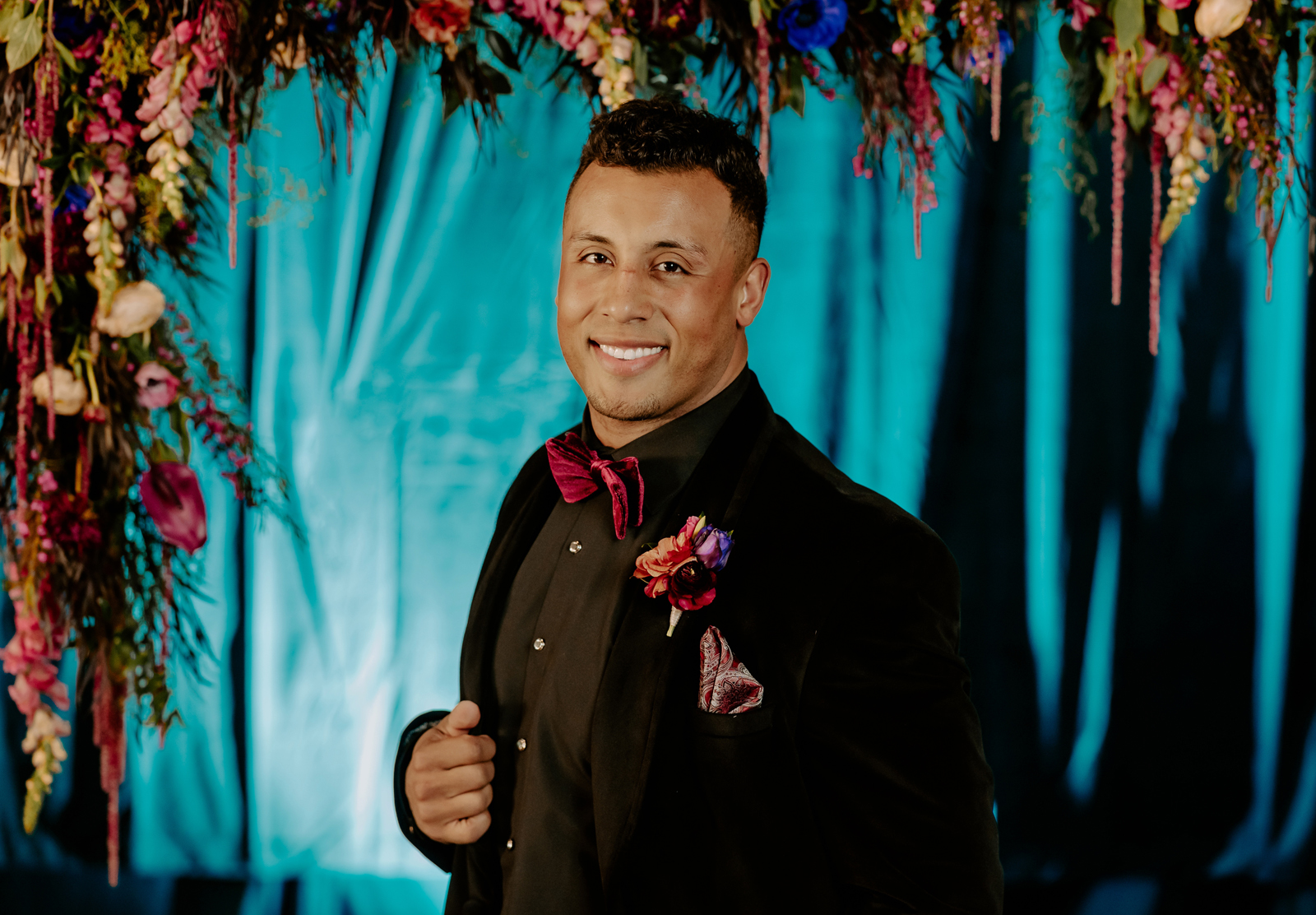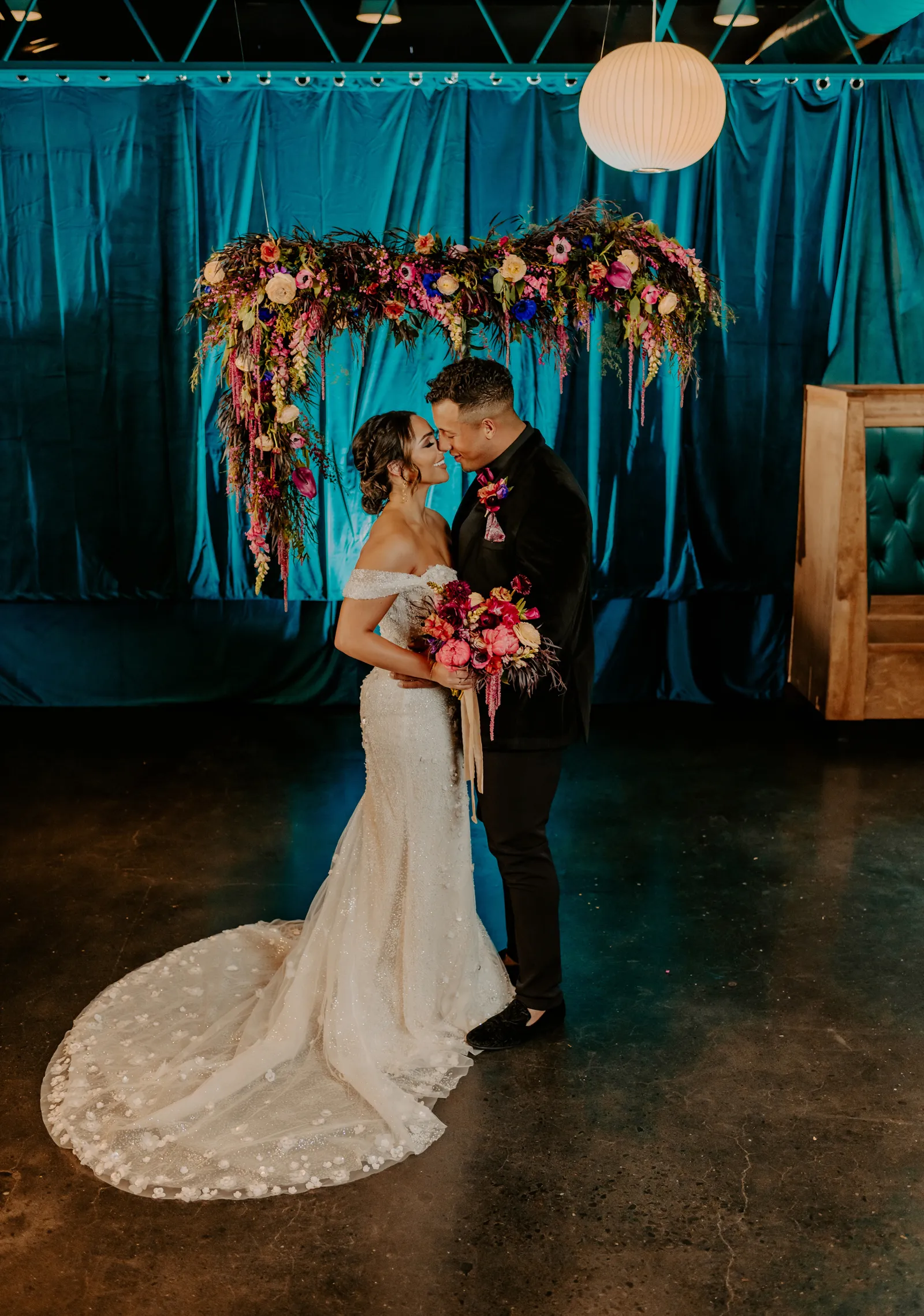 Happy Submitted Styled Shoot Sunday, folks! Today, we have an absolutely unique and colorful styled shoot with tons of teal and pops of deep fuchsia. This beautiful shoot has a bit of everything for everyone, be it sleek tuxedos, courtesy of Tuxedo Den, a too-pretty-to-eat wedding cake, a venue full of retro vibes (thanks Shangri-la Fair Oaks!), or a mouthwatering food and drink setup. Keep scrolling to get in on all the fun details. Happy Sunday, and happy reading!