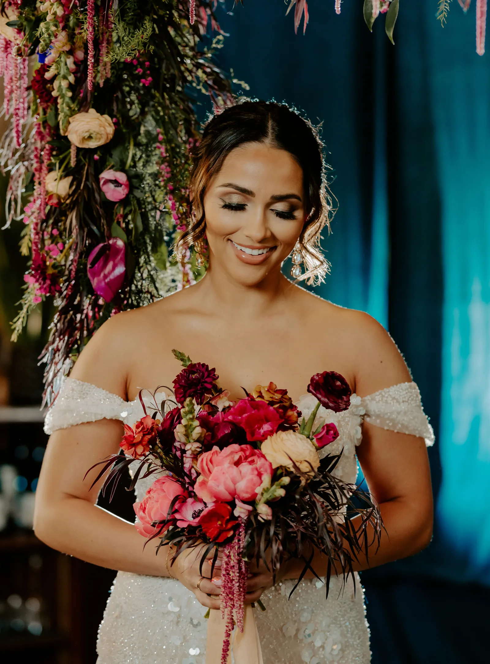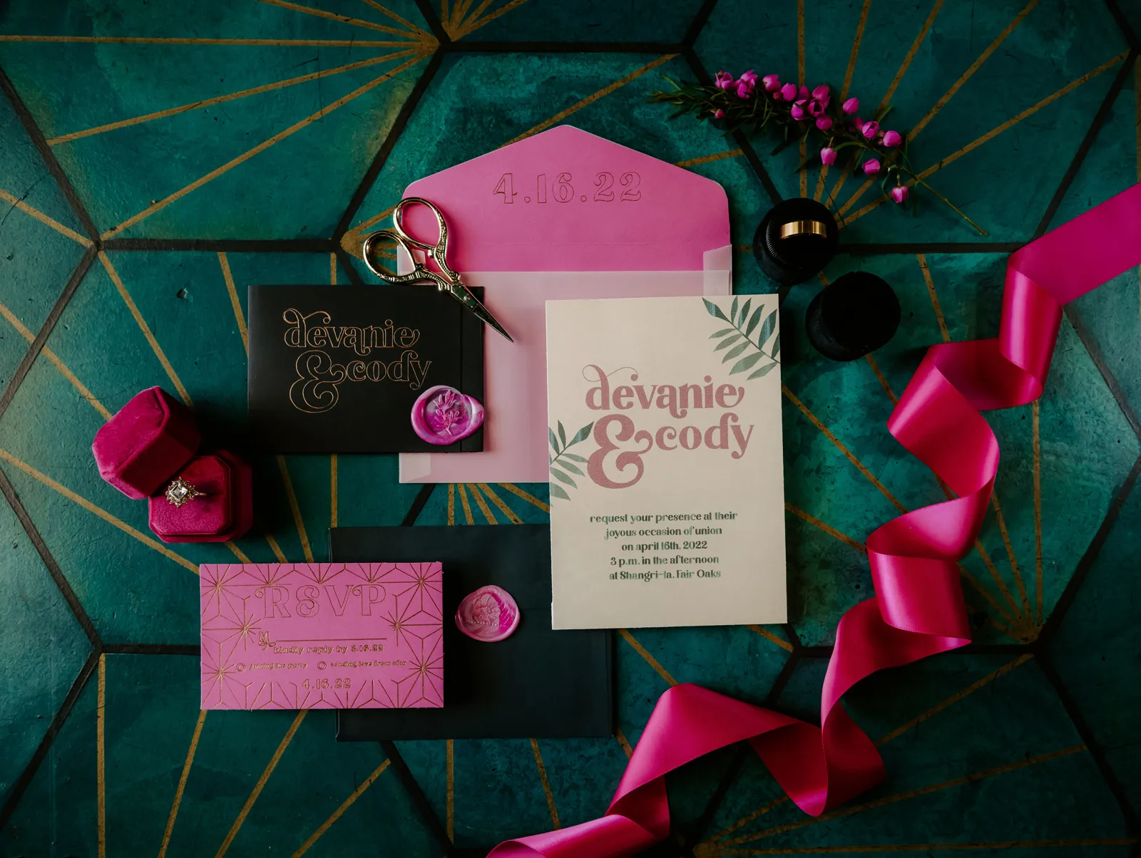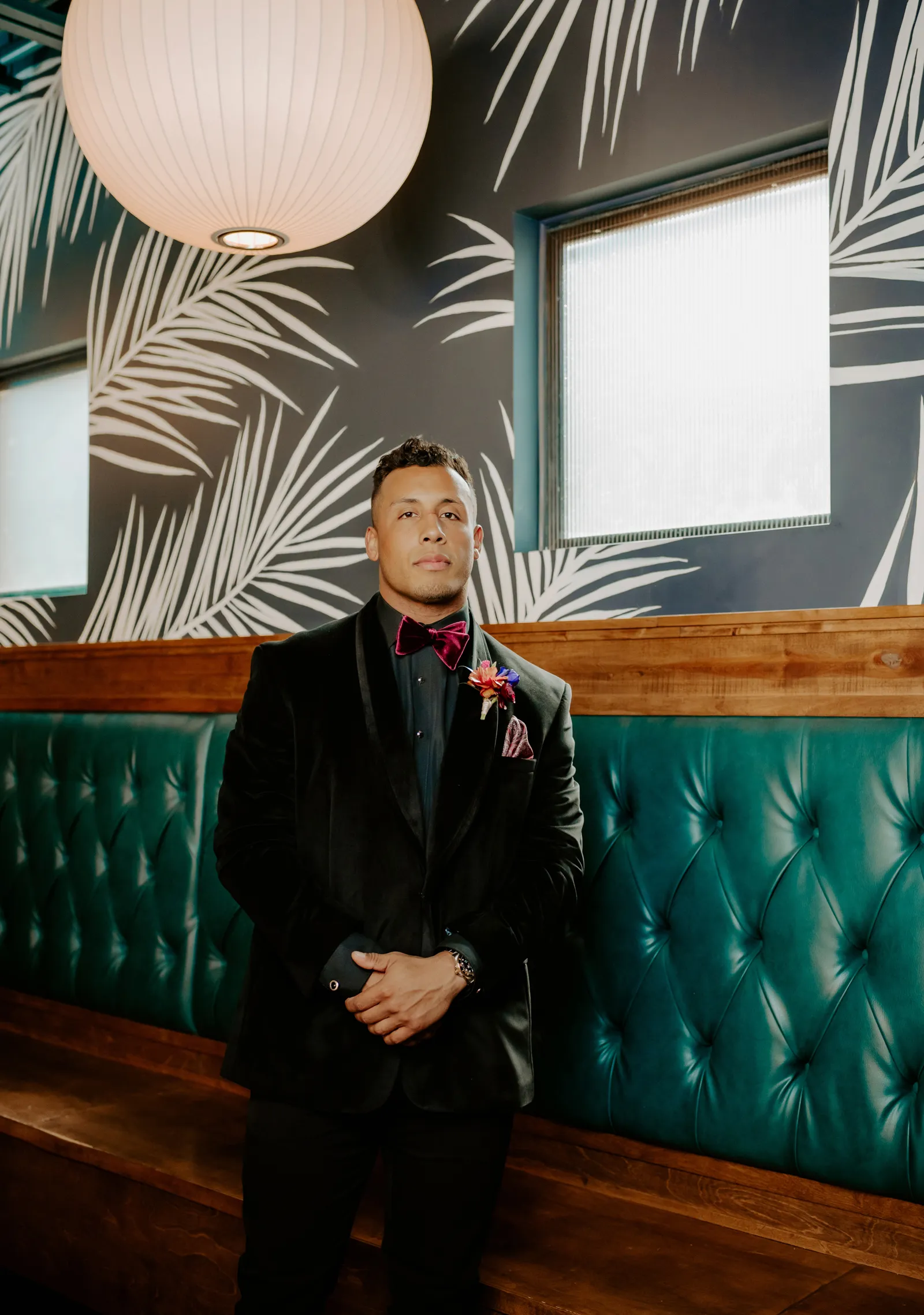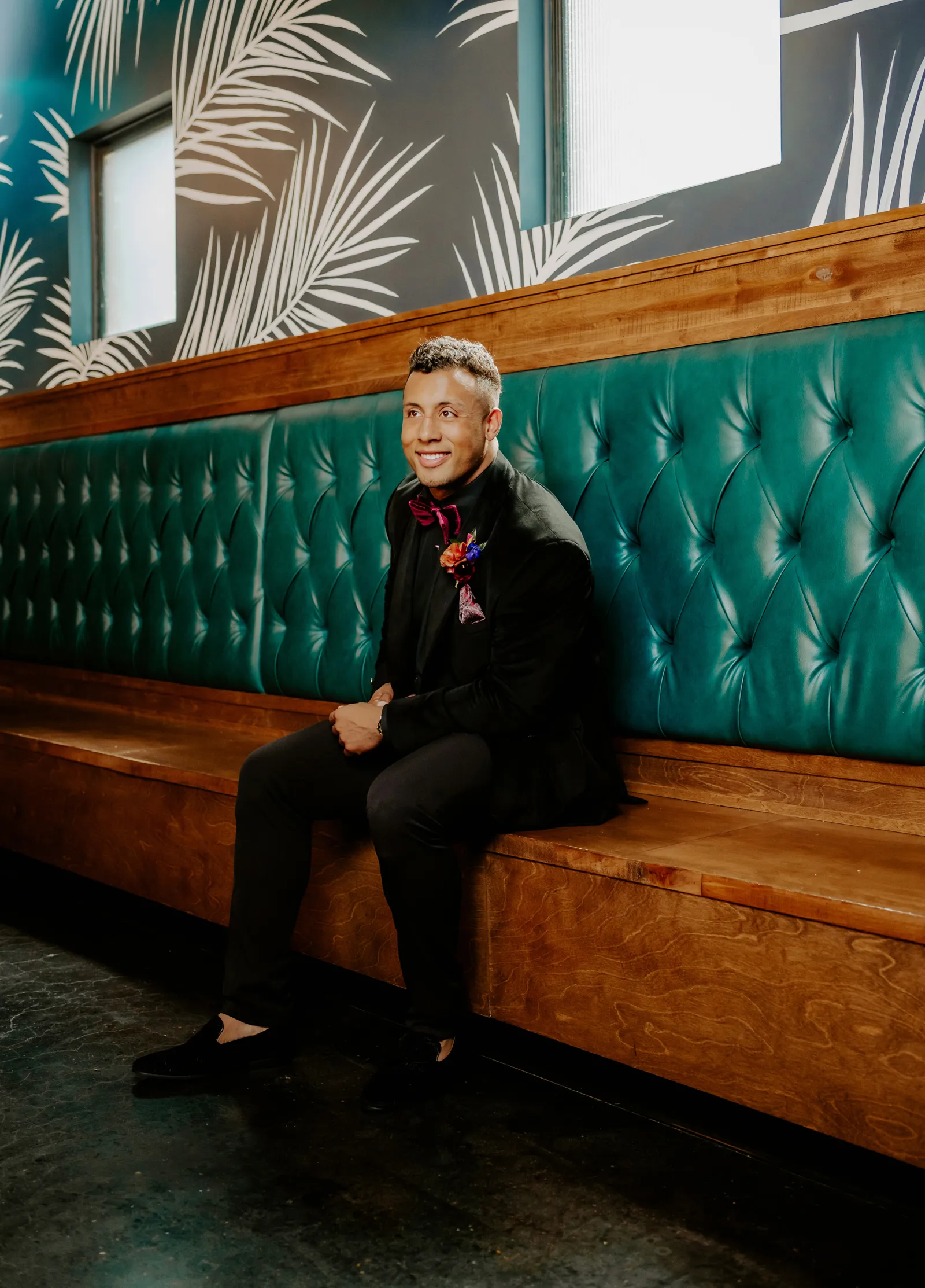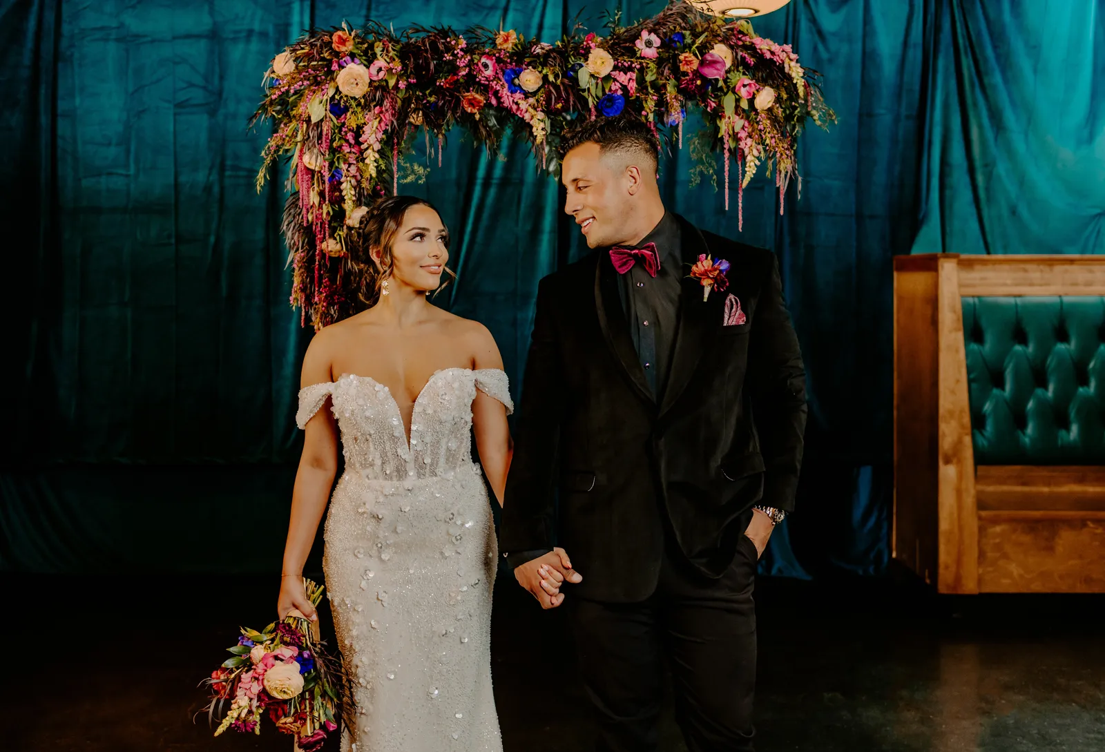 Happy Submitted Styled Shoot Sunday, folks! Today, we have an absolutely unique and colorful styled shoot with tons of teal and pops of deep fuchsia. This beautiful shoot has a bit of everything for everyone, be it sleek tuxedos, courtesy of Tuxedo Den, a too-pretty-to-eat wedding cake, a venue full of retro vibes (thanks Shangri-la Fair Oaks!), or a mouthwatering food and drink setup. Keep scrolling to get in on all the fun details. Happy Sunday, and happy reading!