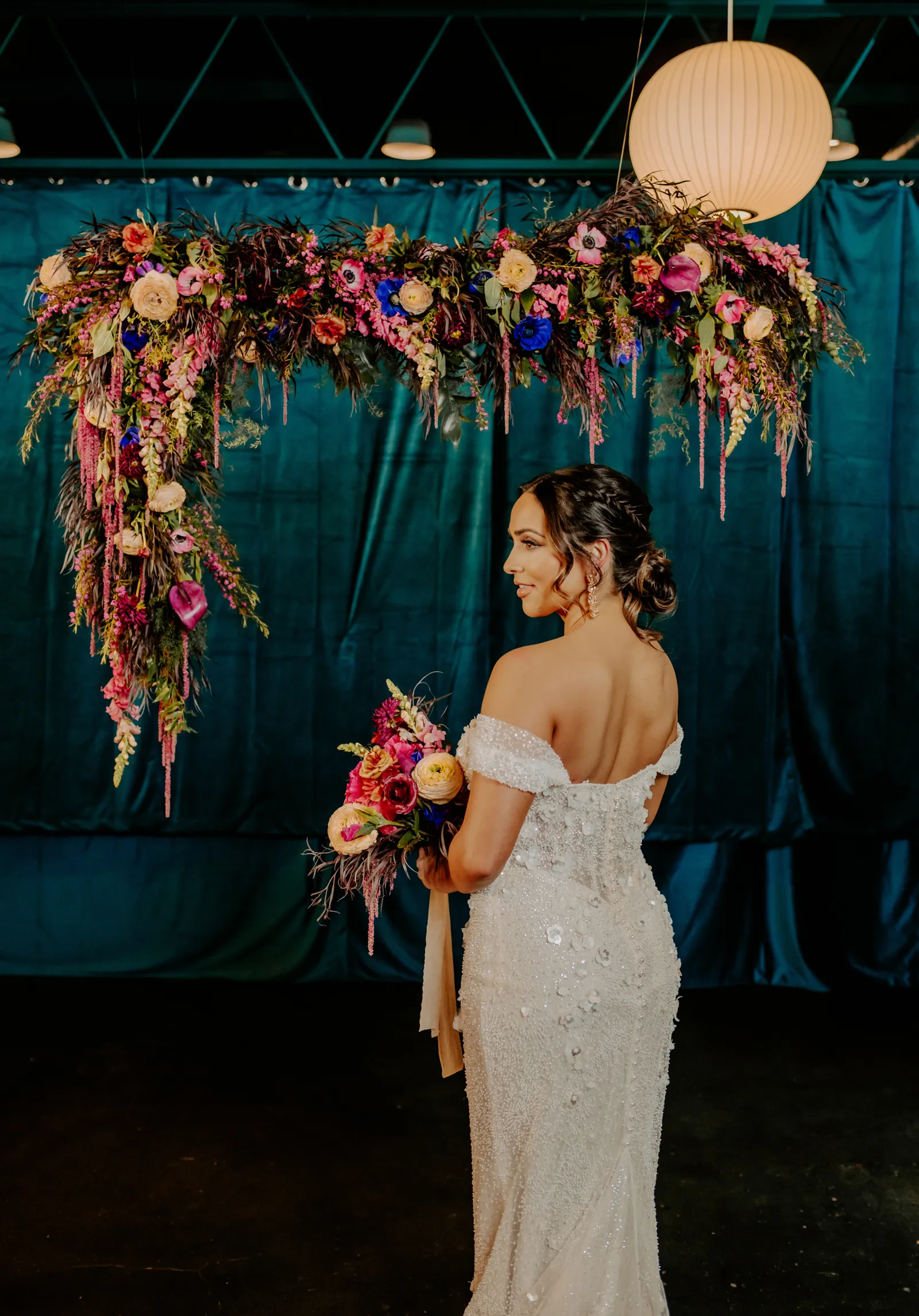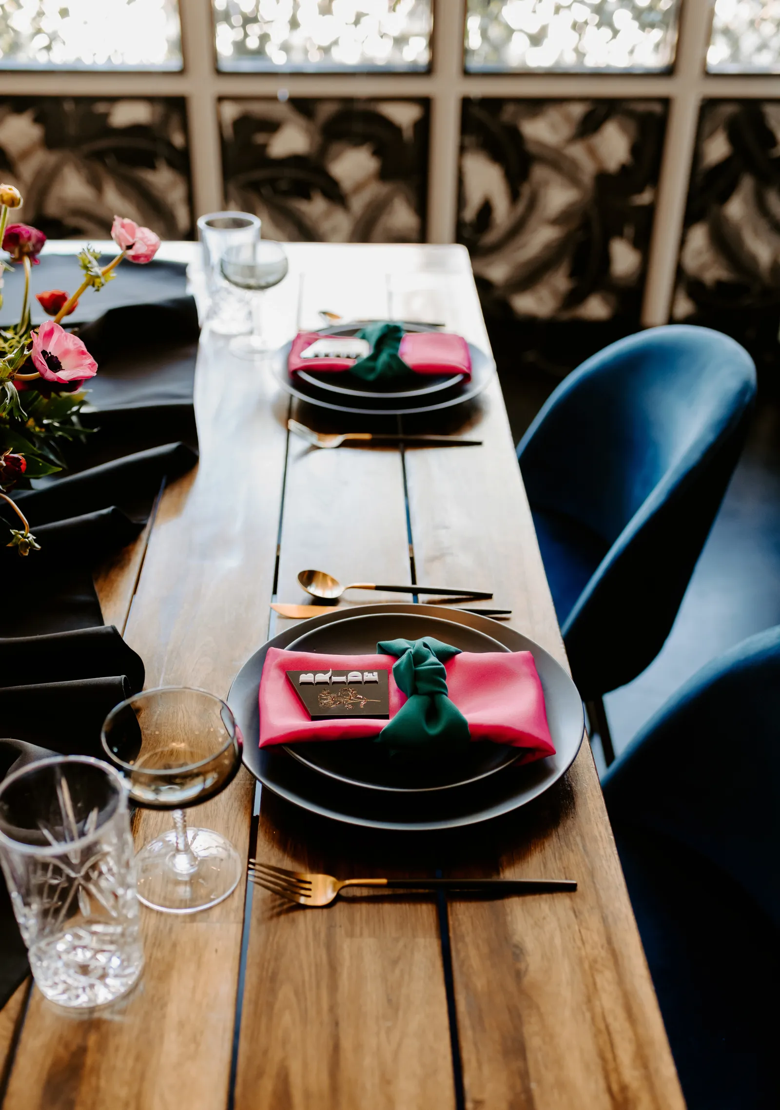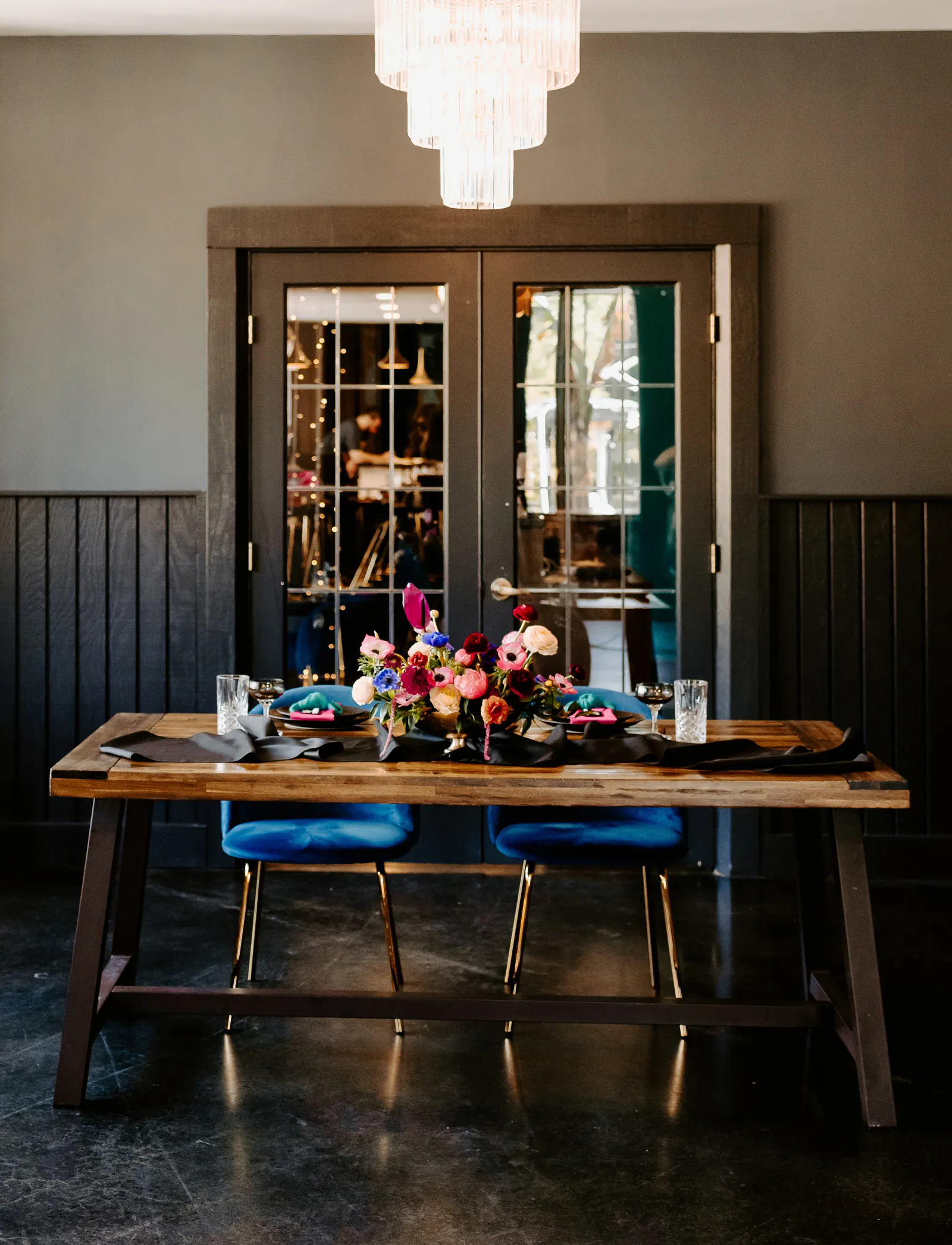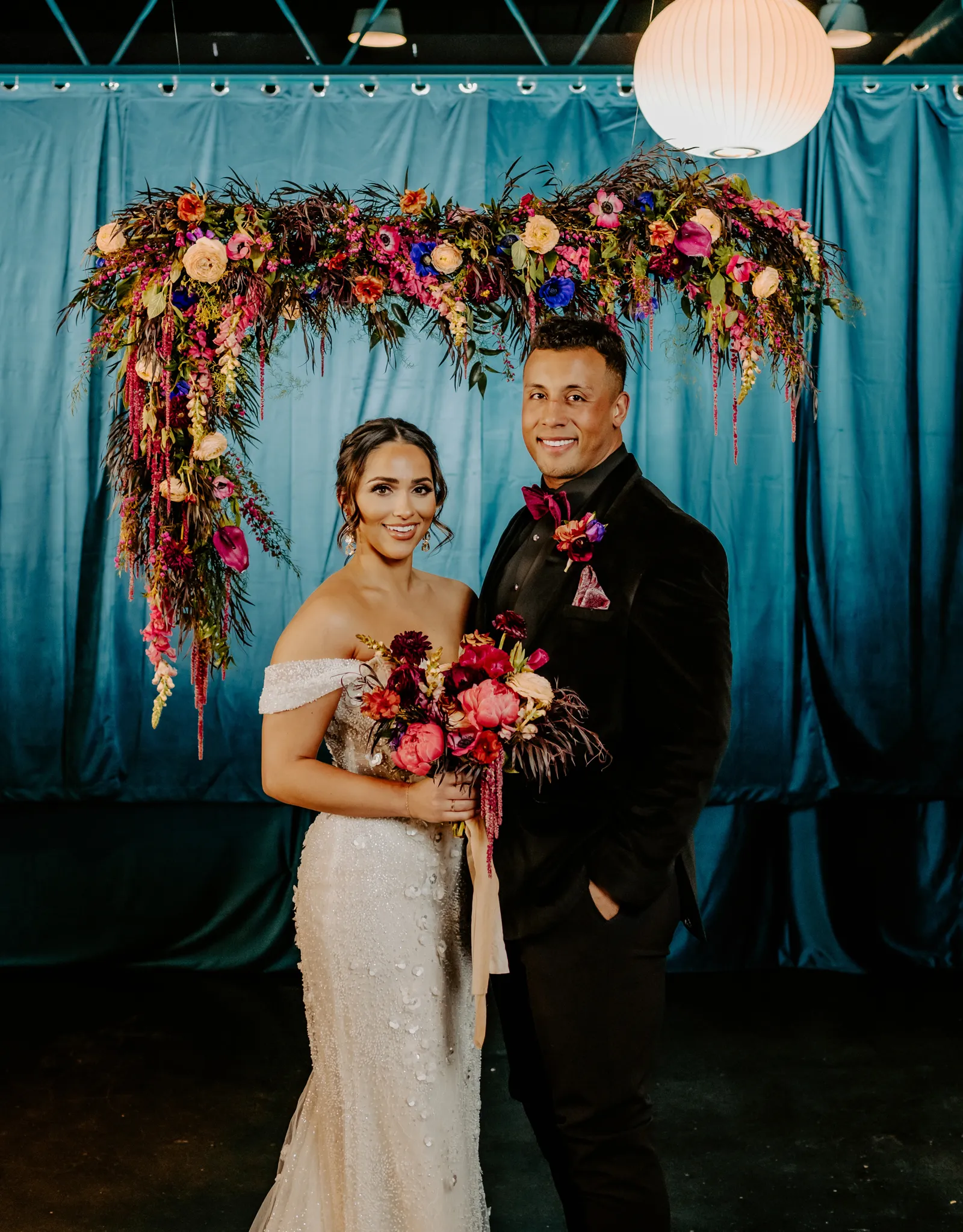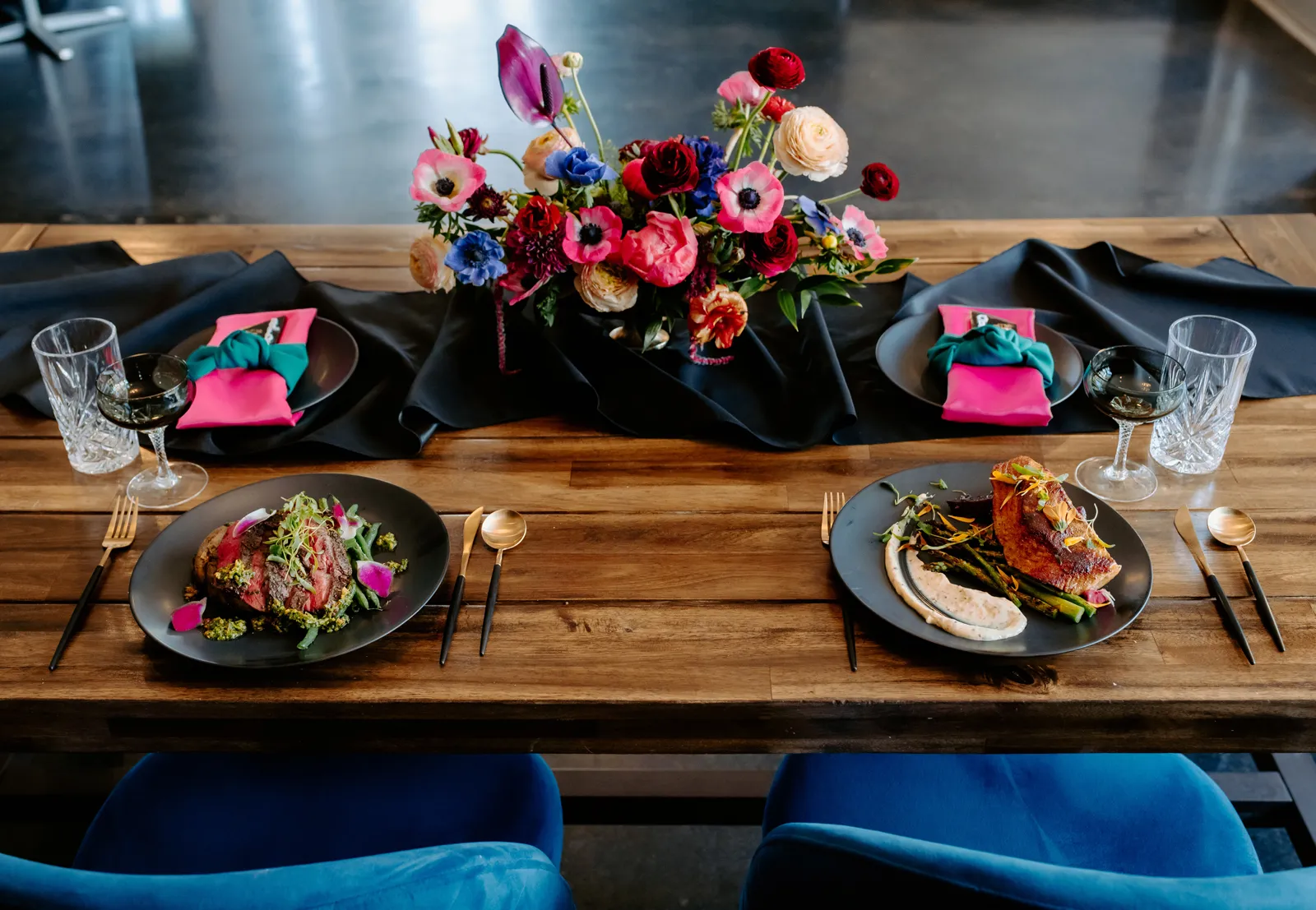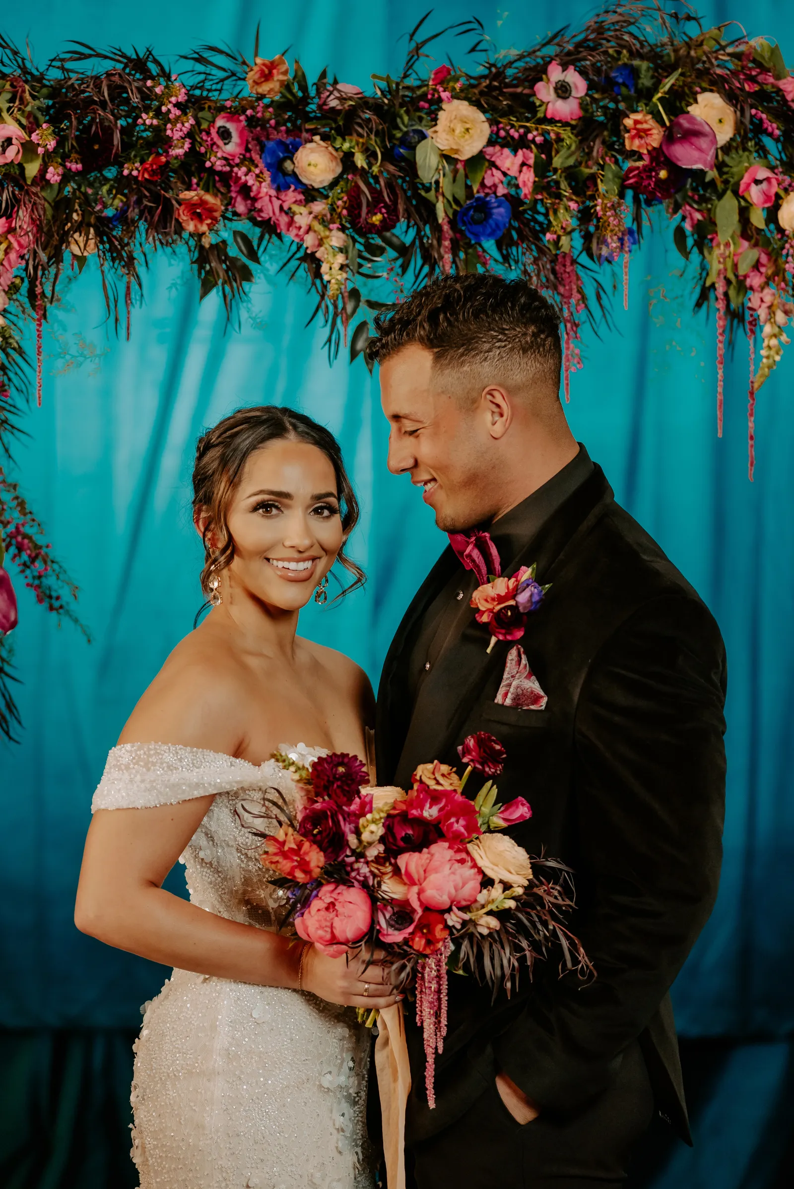 Happy Submitted Styled Shoot Sunday, folks! Today, we have an absolutely unique and colorful styled shoot with tons of teal and pops of deep fuchsia. This beautiful shoot has a bit of everything for everyone, be it sleek tuxedos, courtesy of Tuxedo Den, a too-pretty-to-eat wedding cake, a venue full of retro vibes (thanks Shangri-la Fair Oaks!), or a mouthwatering food and drink setup. Keep scrolling to get in on all the fun details. Happy Sunday, and happy reading!