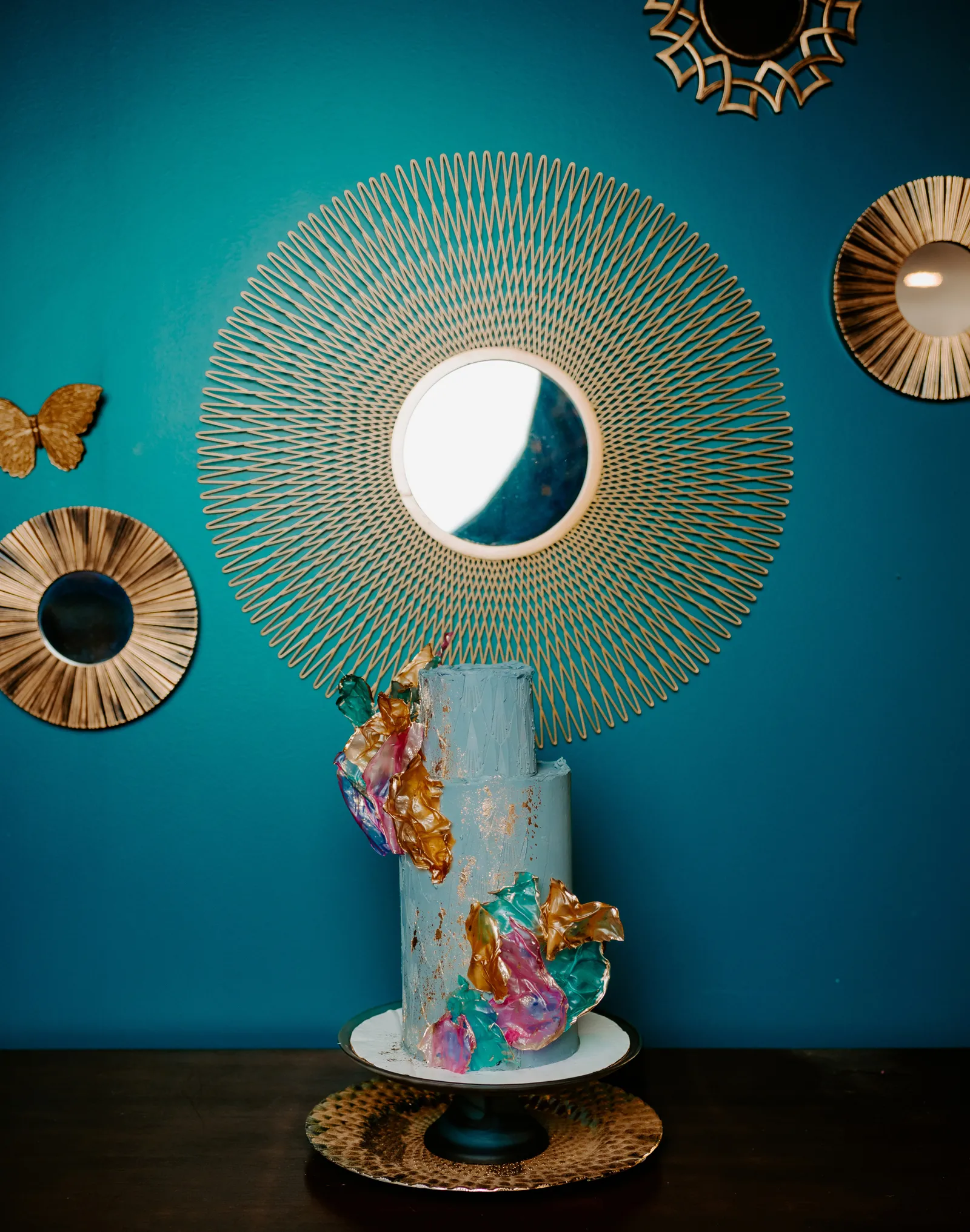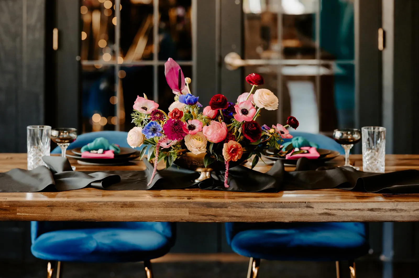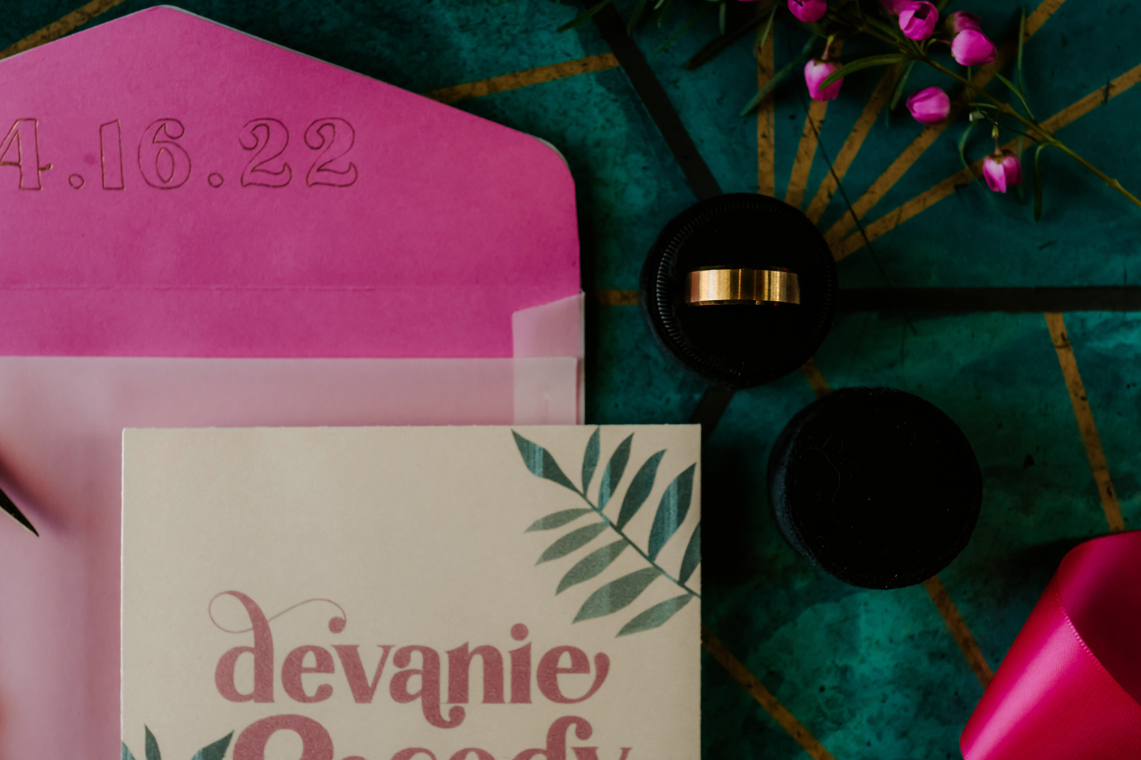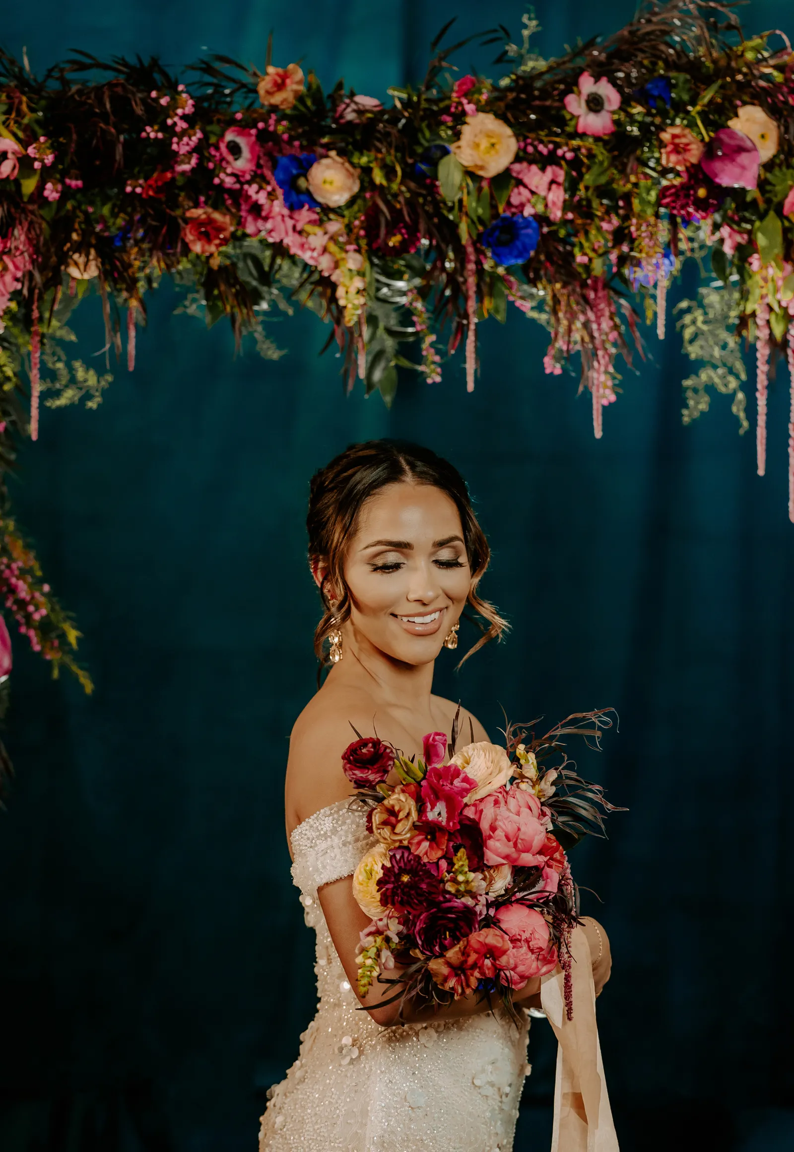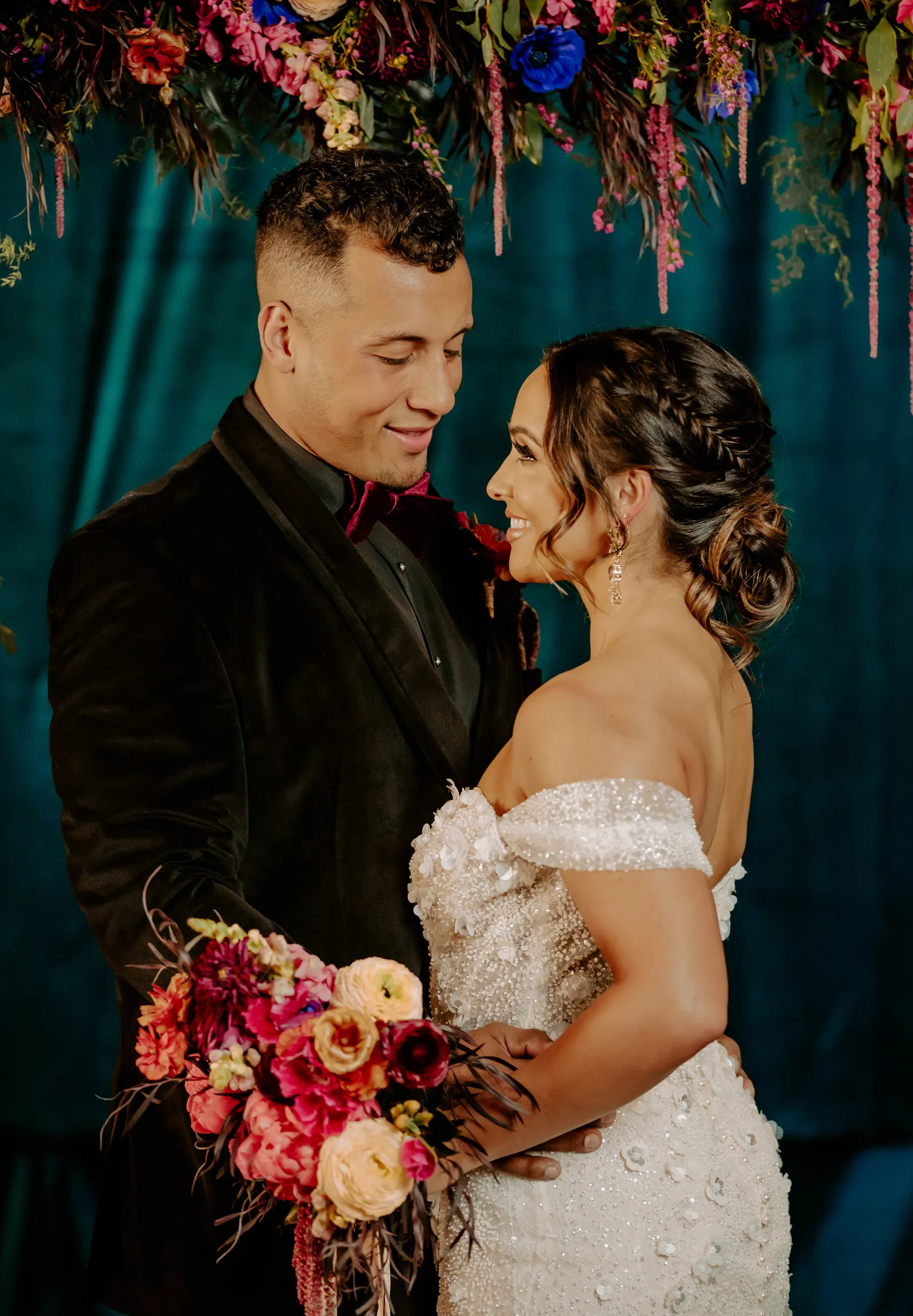 Happy Submitted Styled Shoot Sunday, folks! Today, we have an absolutely unique and colorful styled shoot with tons of teal and pops of deep fuchsia. This beautiful shoot has a bit of everything for everyone, be it sleek tuxedos, courtesy of Tuxedo Den, a too-pretty-to-eat wedding cake, a venue full of retro vibes (thanks Shangri-la Fair Oaks!), or a mouthwatering food and drink setup. Keep scrolling to get in on all the fun details. Happy Sunday, and happy reading!