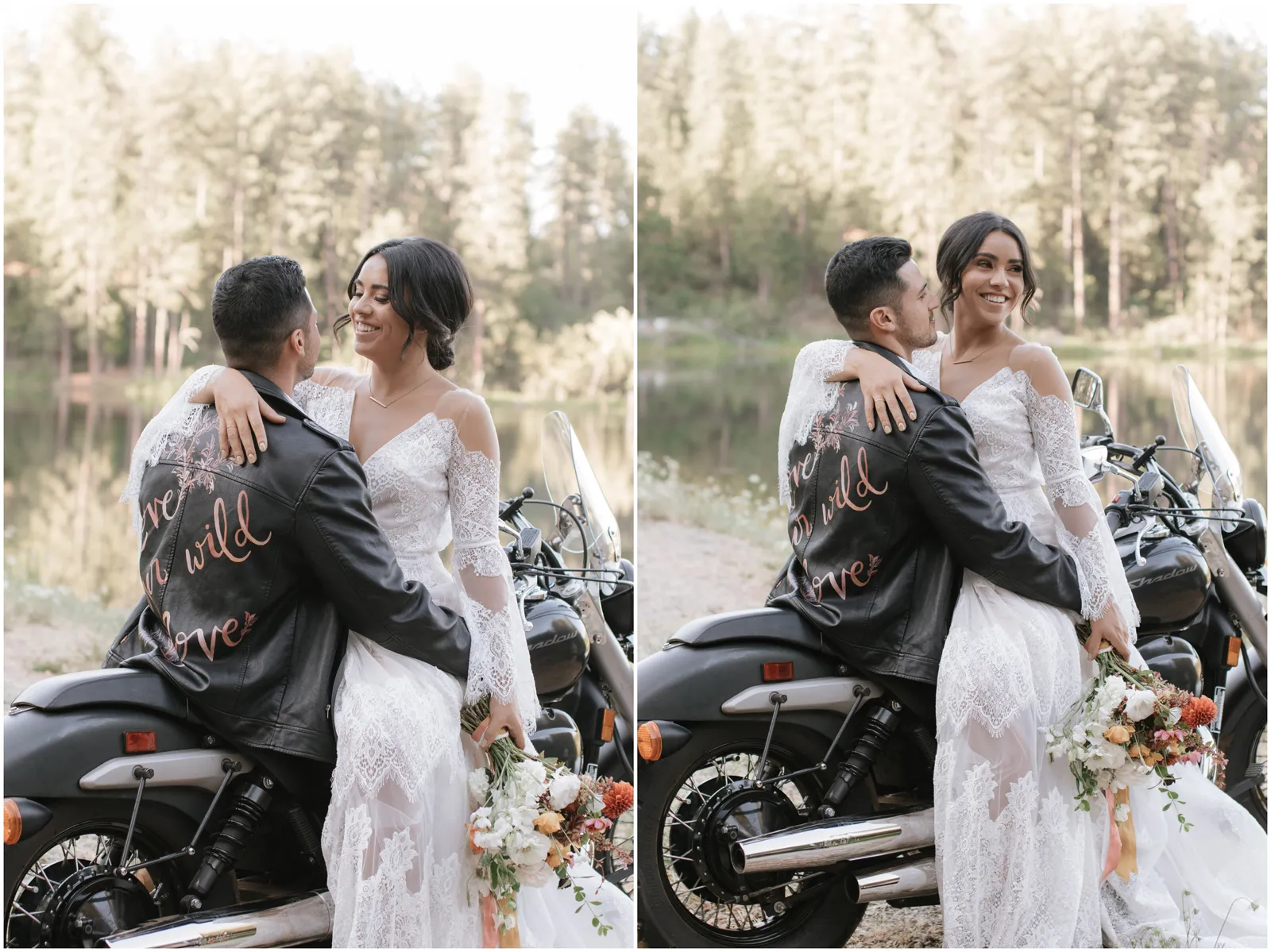 Here’s what Jess from Joyeux Events said about the inspiration for the shoot, “Our inspiration for this shoot was to help couples feel comfortable with making their wedding their own. We wanted them to know they can mix textures, have the groom in the custom painted leather jacket, have their wedding be moody and edgy but still play with color. Leave on a motorcycle if that’s what they want. It’s your wedding and you’re allowed to feel comfortable, unique and elegant all at the same time.”