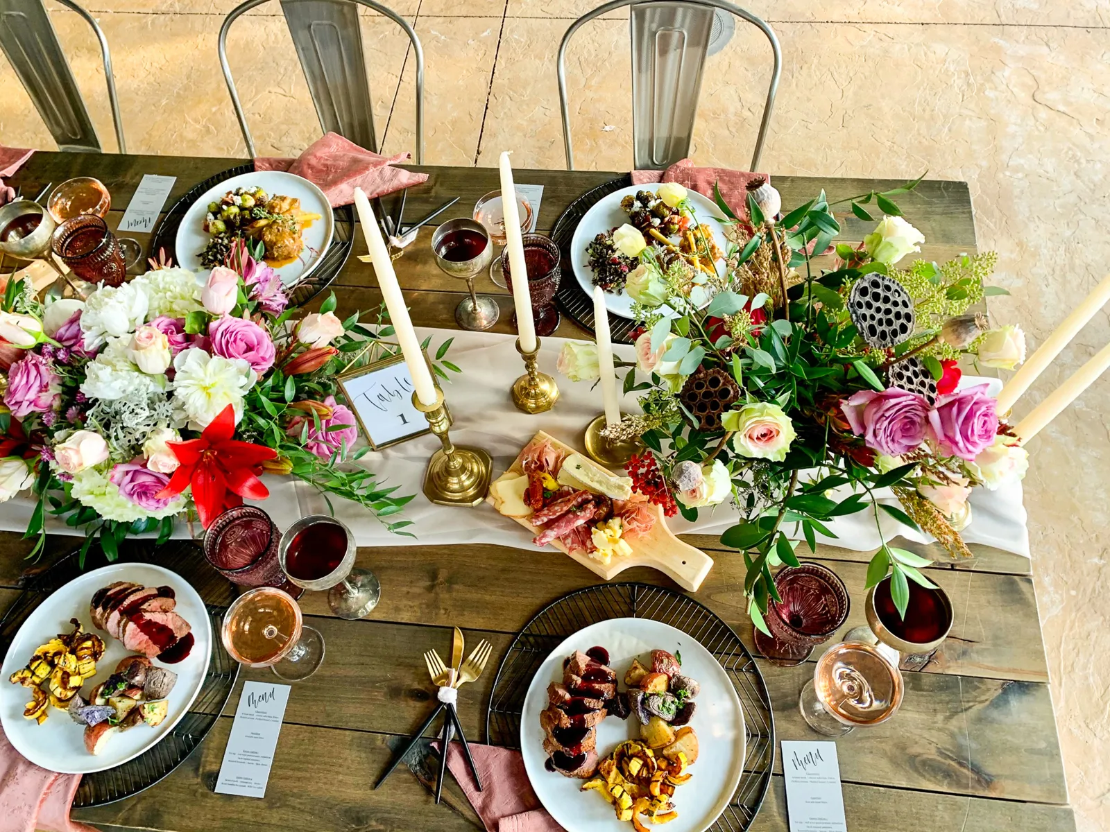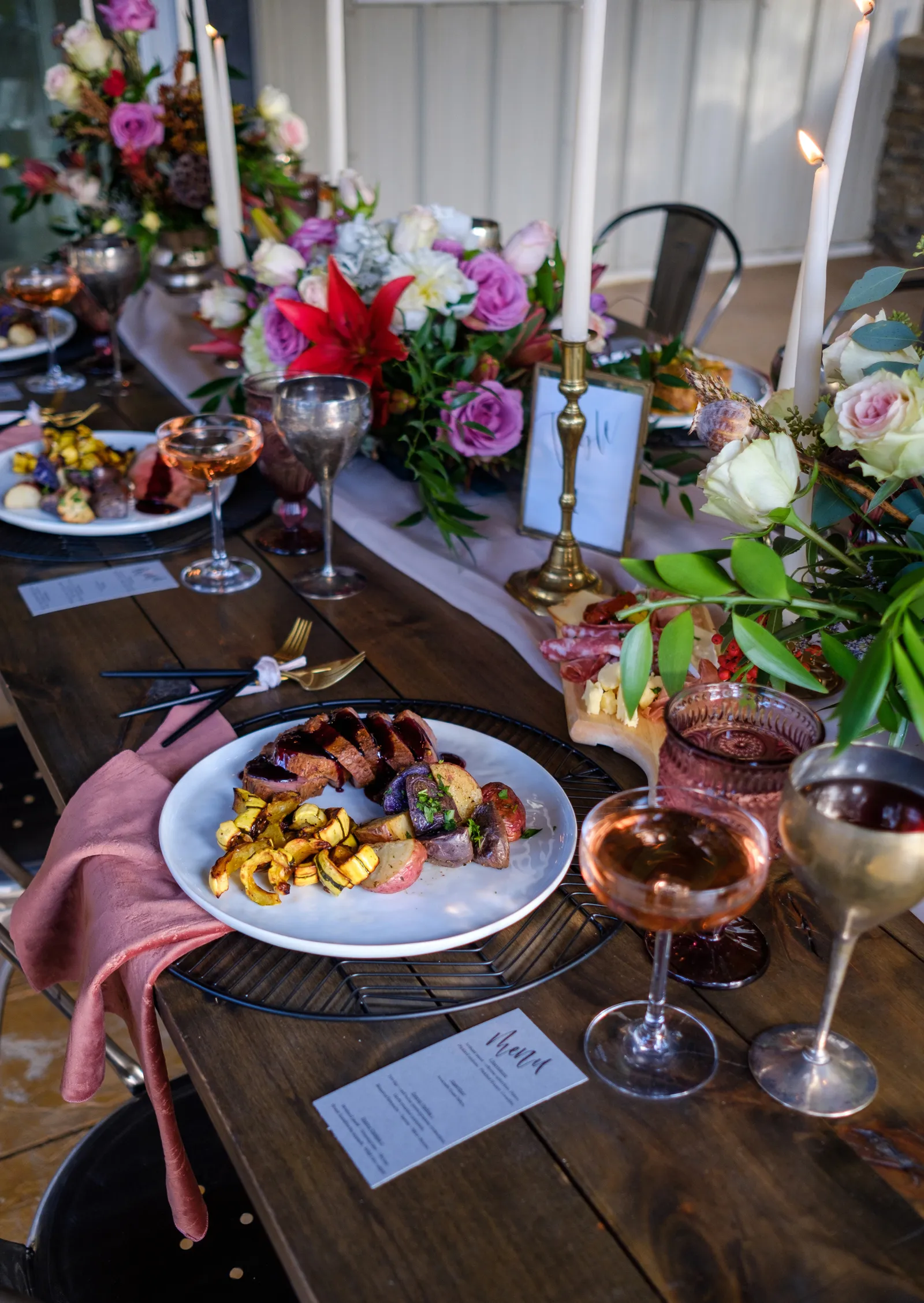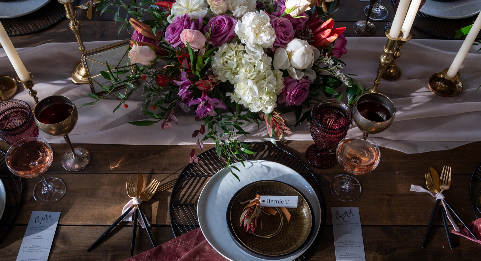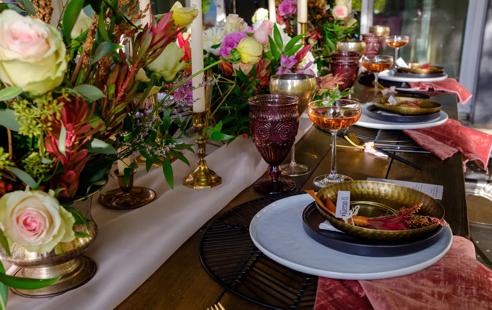 When asked about the inspiration for the shoot, Kendall Melissa says, “I pulled inspiration by leaning into the industrial structure surrounded by the lush gardens. I called this “A Romantic Industrial Garden” inspired shoot. I wanted to lean into the hard lines, dark iron accents, and soften them a little by bringing in hints of mauve and wood. I wanted to pair the modernness of the venue with antique gold pieces, that appear in the vintage candlesticks, brass goblets, and flatware accents. I love the juxtaposition of hard and soft, structure and romance, and new and old to create a cohesive design that is inviting. I wanted to contrast the masculinity of the villa with soft, feminine touches that can be seen in the lush florals seen on the tablescape and in the lounge. Overall I wanted to intertwine the feel of a lush garden with the hard structure of the villa.”