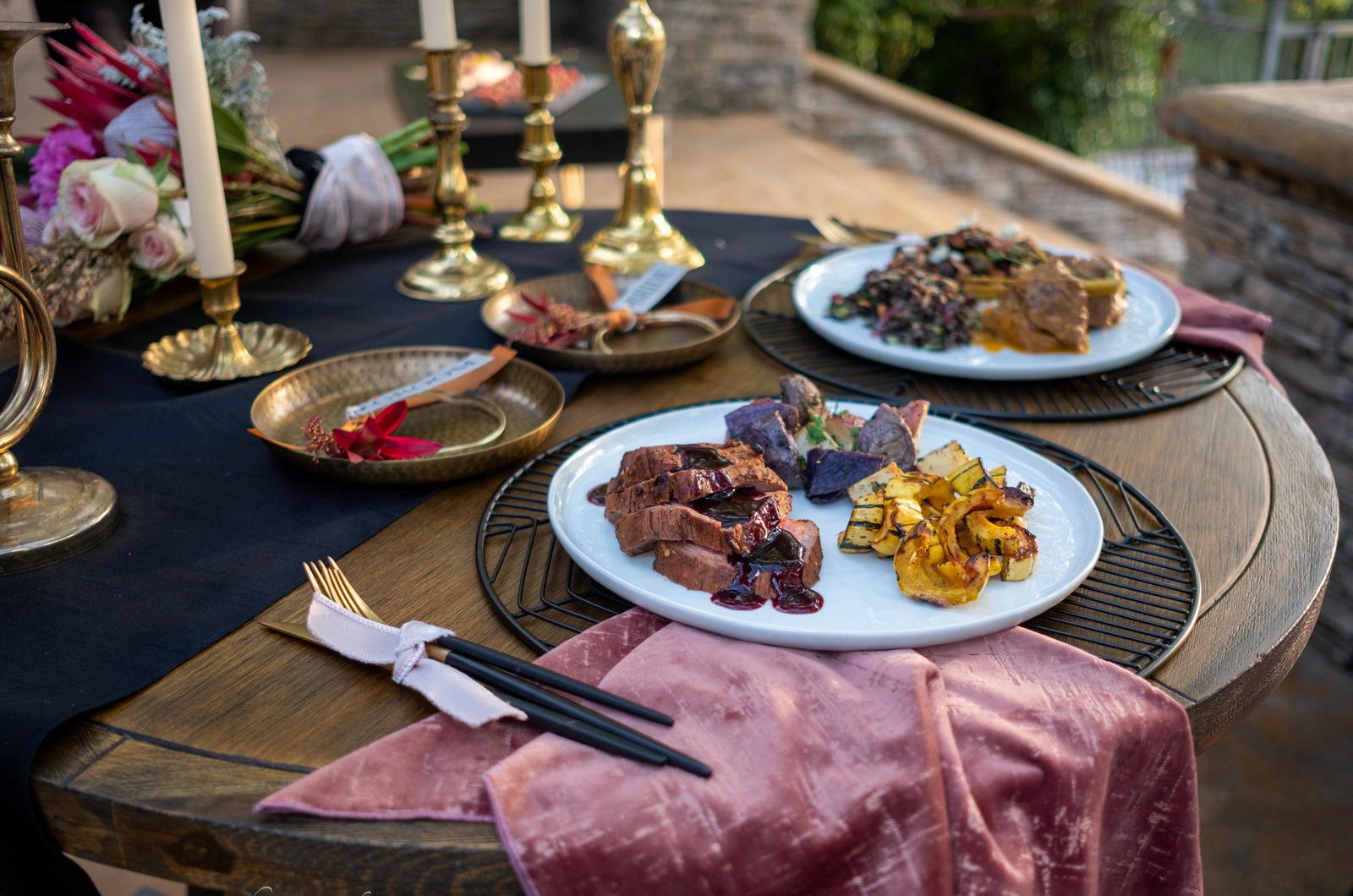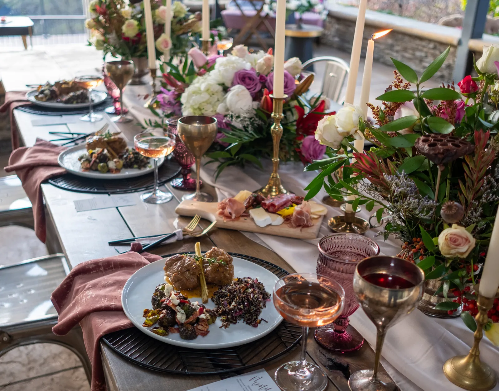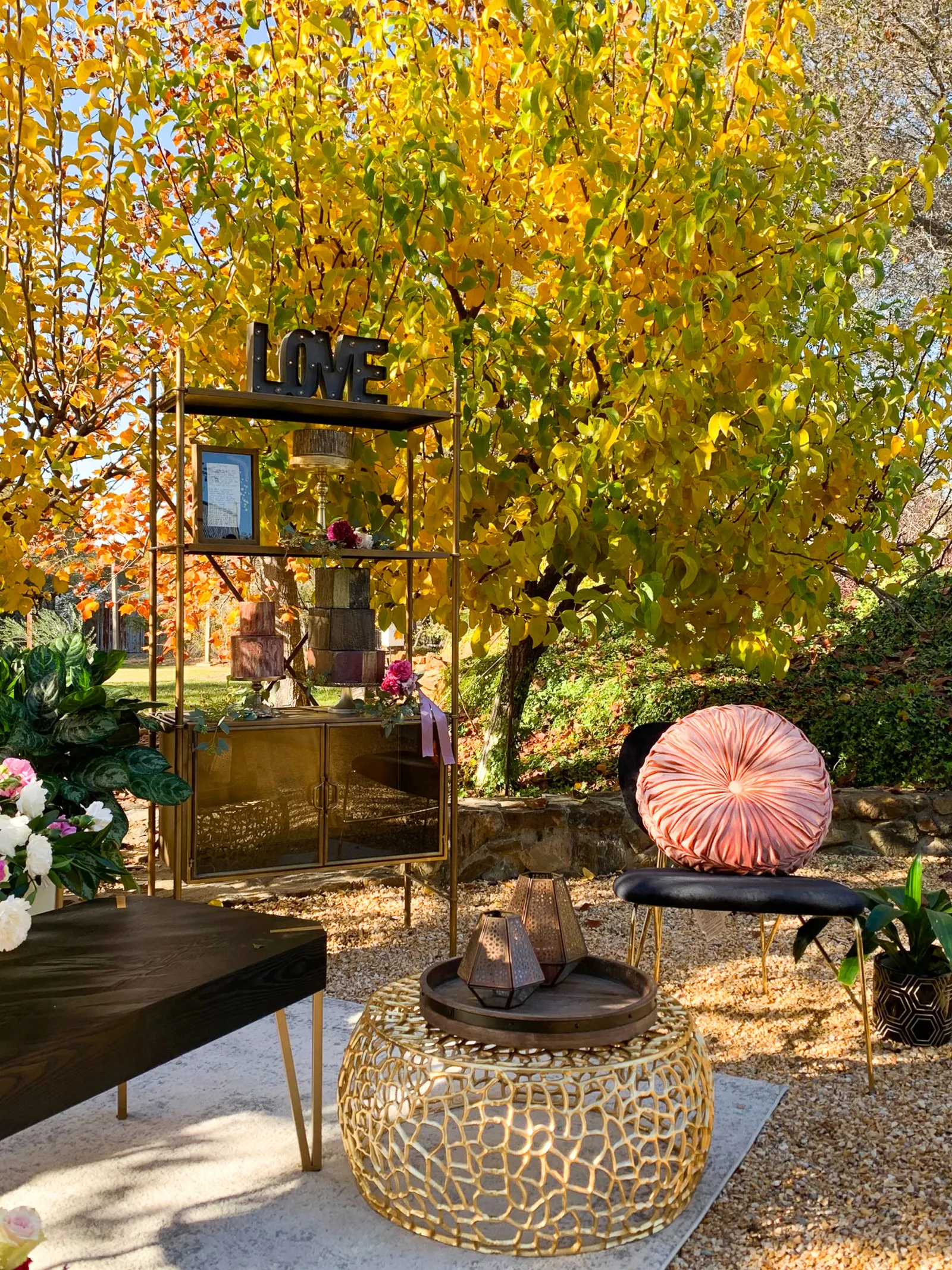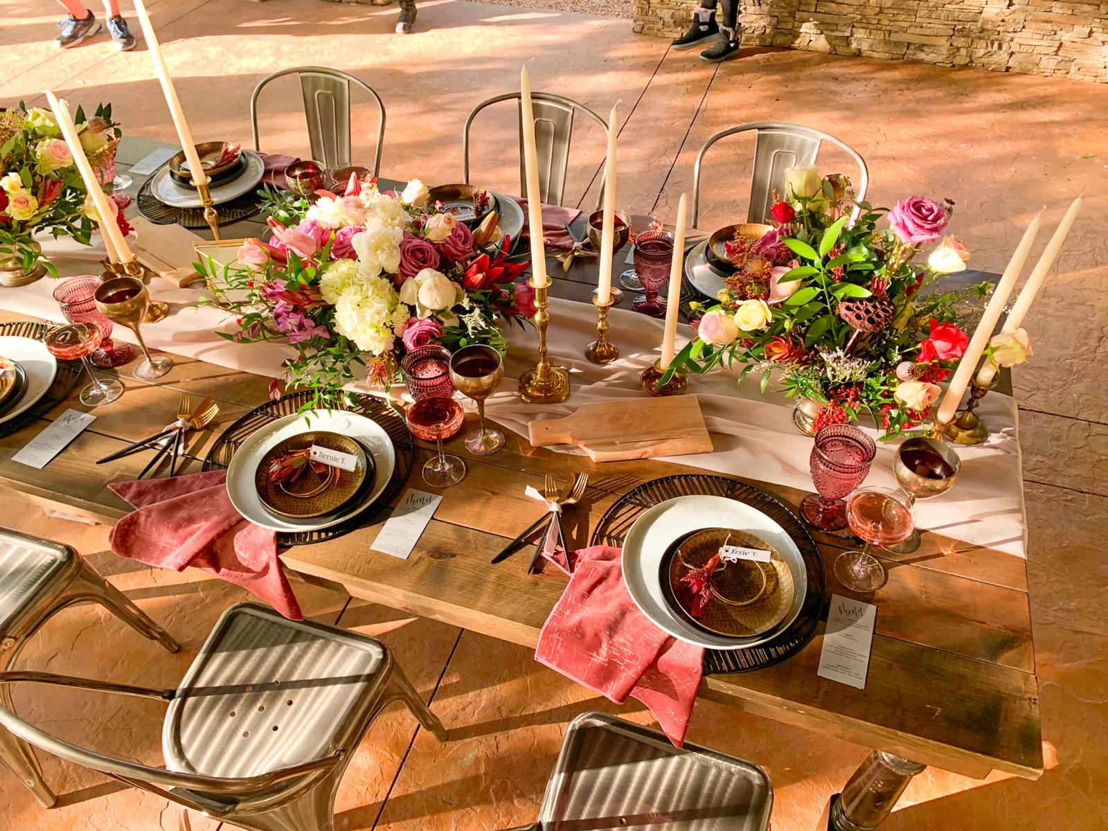 When asked about the inspiration for the shoot, Kendall Melissa says, “I pulled inspiration by leaning into the industrial structure surrounded by the lush gardens. I called this “A Romantic Industrial Garden” inspired shoot. I wanted to lean into the hard lines, dark iron accents, and soften them a little by bringing in hints of mauve and wood. I wanted to pair the modernness of the venue with antique gold pieces, that appear in the vintage candlesticks, brass goblets, and flatware accents. I love the juxtaposition of hard and soft, structure and romance, and new and old to create a cohesive design that is inviting. I wanted to contrast the masculinity of the villa with soft, feminine touches that can be seen in the lush florals seen on the tablescape and in the lounge. Overall I wanted to intertwine the feel of a lush garden with the hard structure of the villa.”