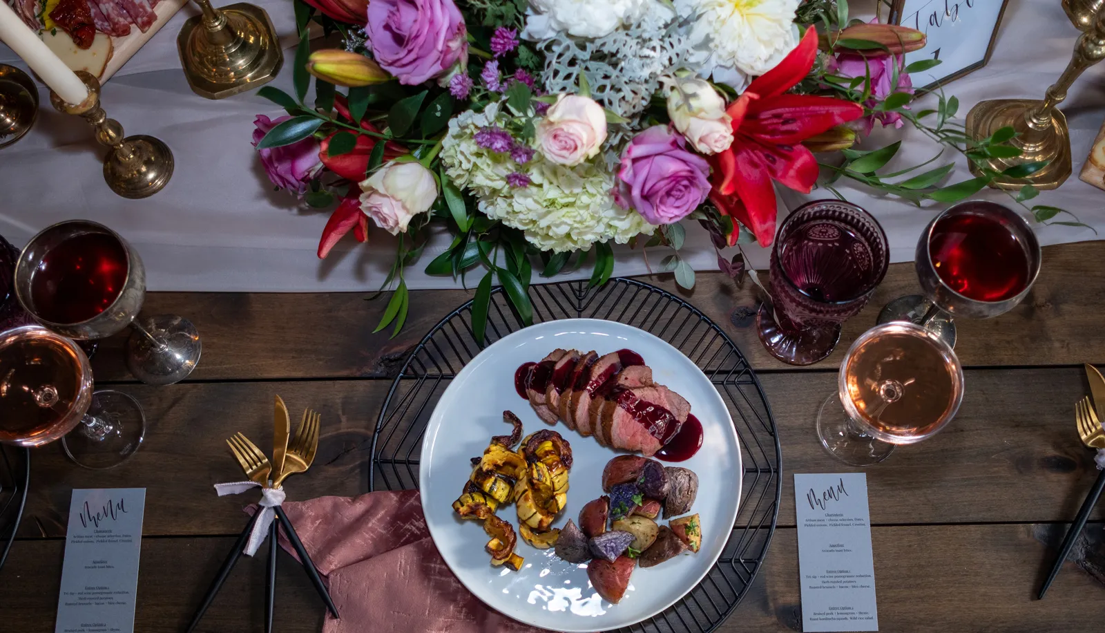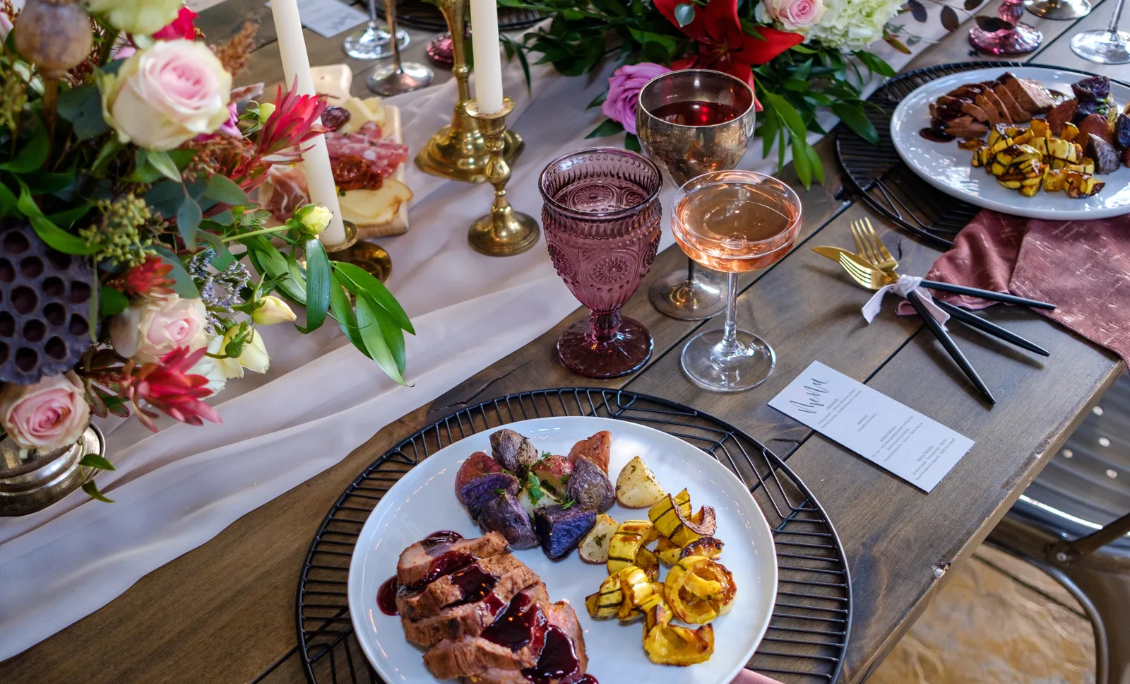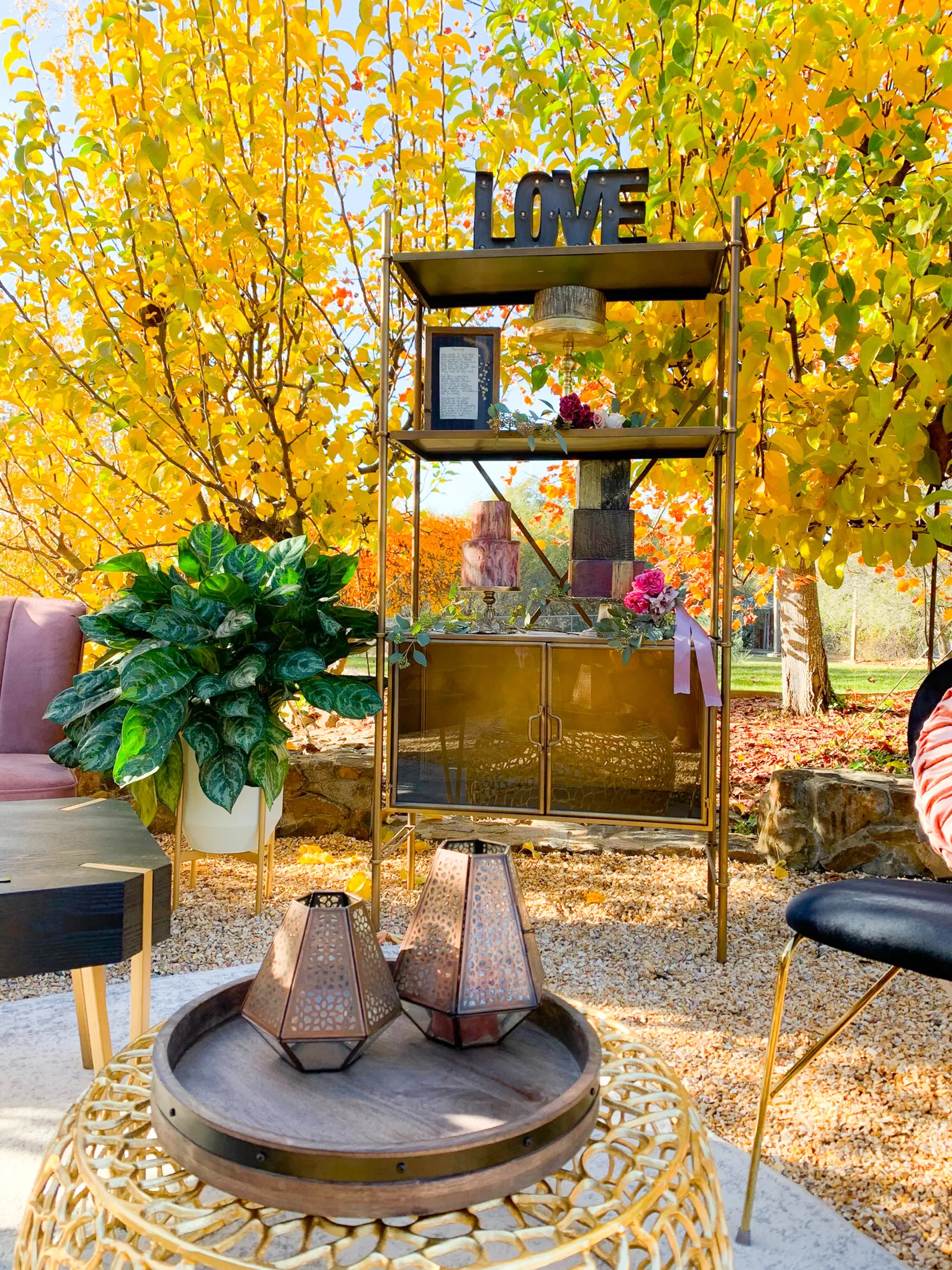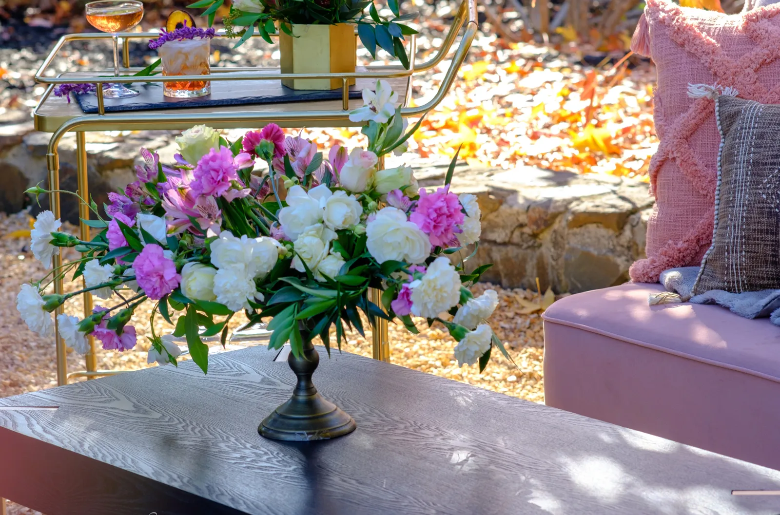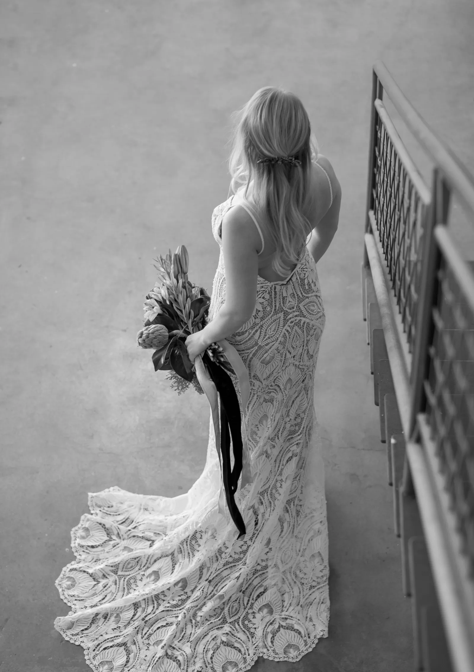 When asked about the inspiration for the shoot, Kendall Melissa says, “I pulled inspiration by leaning into the industrial structure surrounded by the lush gardens. I called this “A Romantic Industrial Garden” inspired shoot. I wanted to lean into the hard lines, dark iron accents, and soften them a little by bringing in hints of mauve and wood. I wanted to pair the modernness of the venue with antique gold pieces, that appear in the vintage candlesticks, brass goblets, and flatware accents. I love the juxtaposition of hard and soft, structure and romance, and new and old to create a cohesive design that is inviting. I wanted to contrast the masculinity of the villa with soft, feminine touches that can be seen in the lush florals seen on the tablescape and in the lounge. Overall I wanted to intertwine the feel of a lush garden with the hard structure of the villa.”
