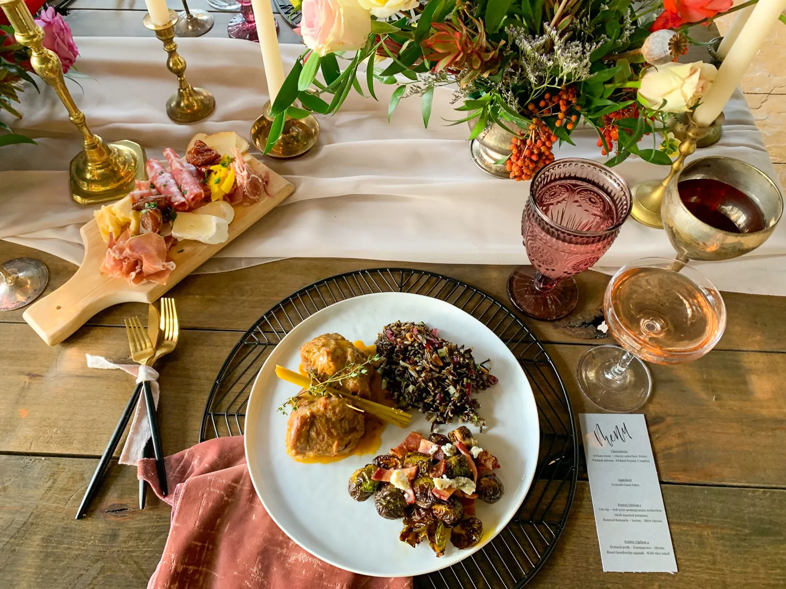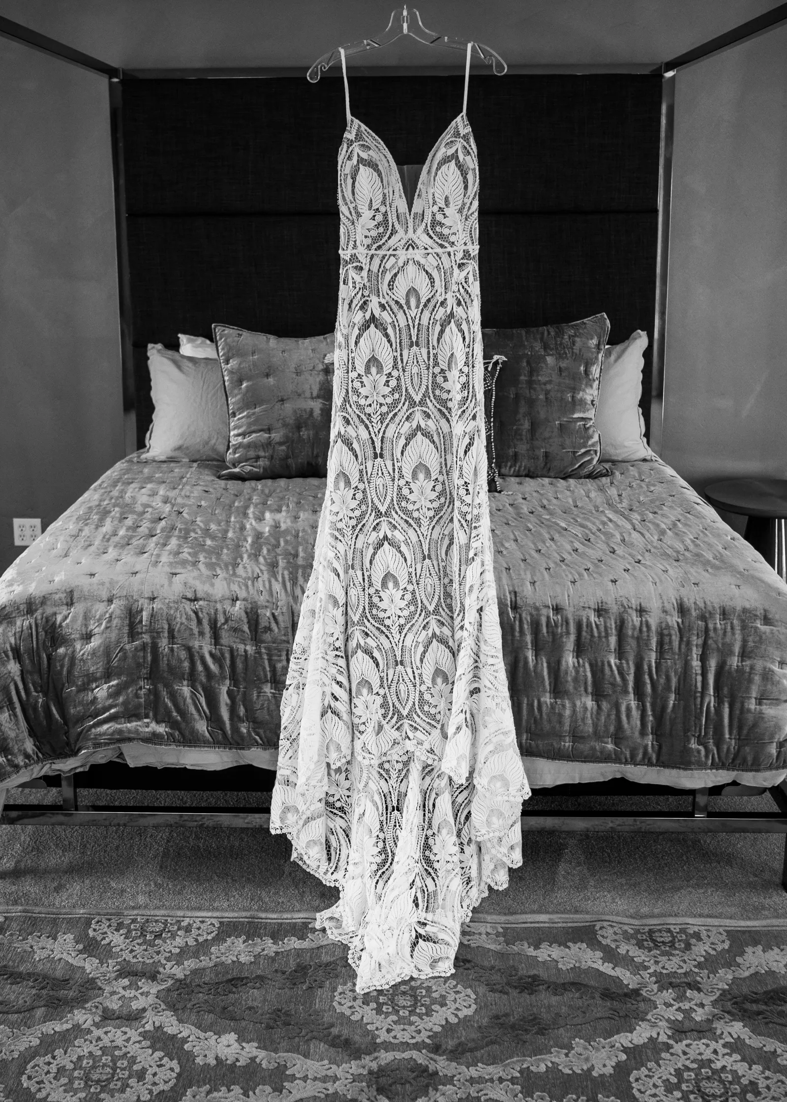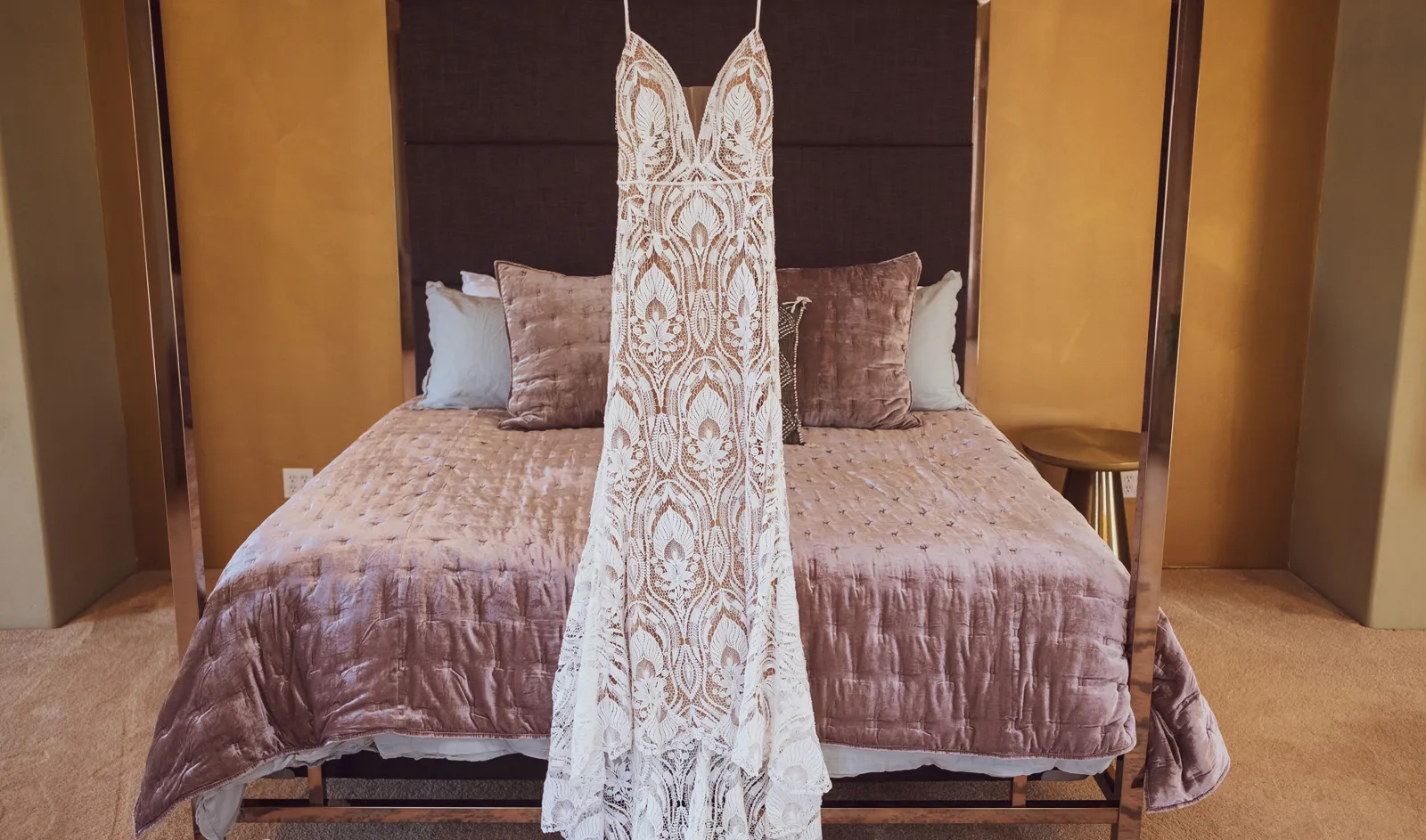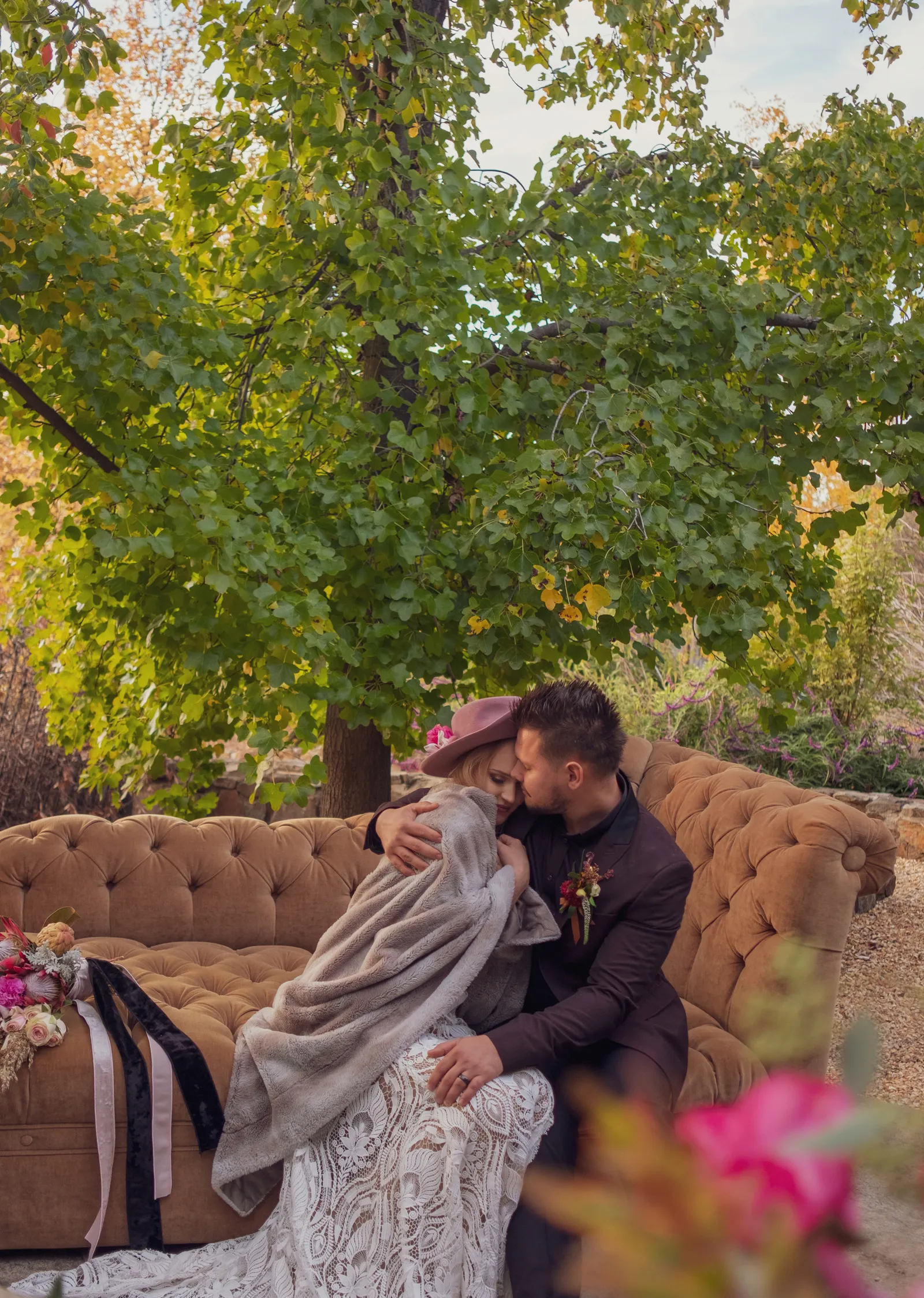 When asked about the inspiration for the shoot, Kendall Melissa says, “I pulled inspiration by leaning into the industrial structure surrounded by the lush gardens. I called this “A Romantic Industrial Garden” inspired shoot. I wanted to lean into the hard lines, dark iron accents, and soften them a little by bringing in hints of mauve and wood. I wanted to pair the modernness of the venue with antique gold pieces, that appear in the vintage candlesticks, brass goblets, and flatware accents. I love the juxtaposition of hard and soft, structure and romance, and new and old to create a cohesive design that is inviting. I wanted to contrast the masculinity of the villa with soft, feminine touches that can be seen in the lush florals seen on the tablescape and in the lounge. Overall I wanted to intertwine the feel of a lush garden with the hard structure of the villa.”