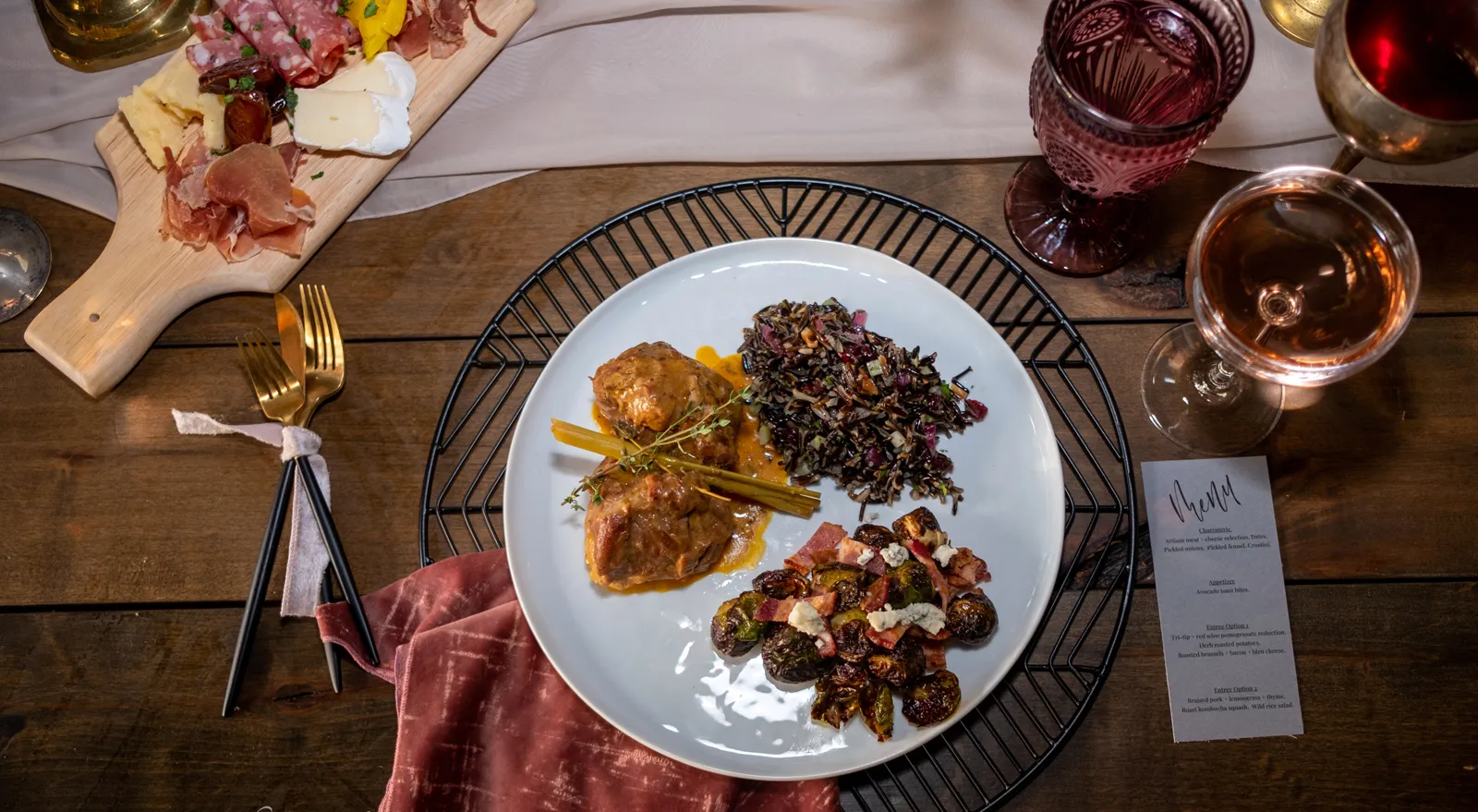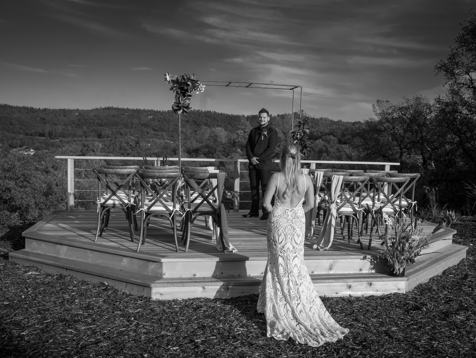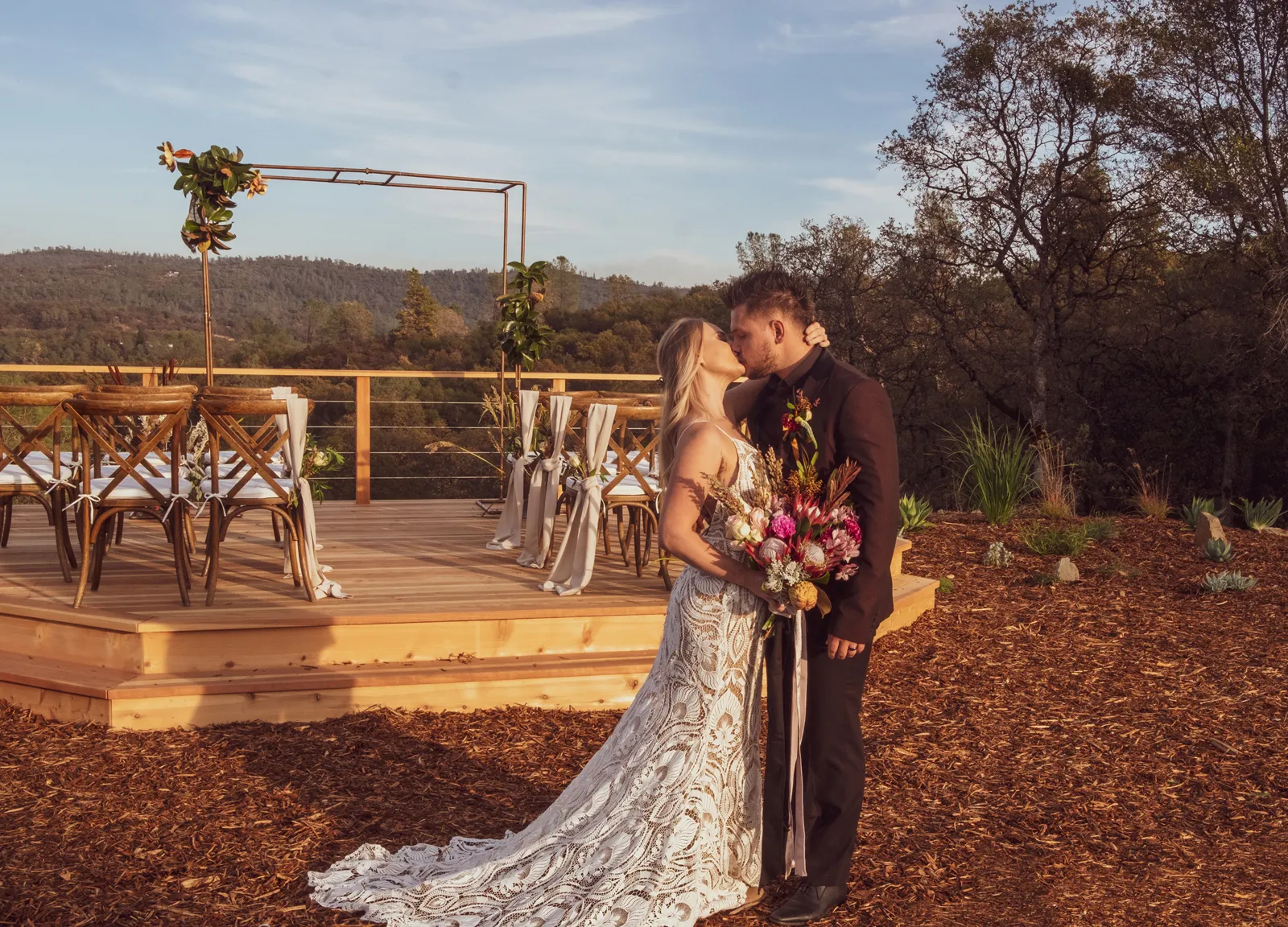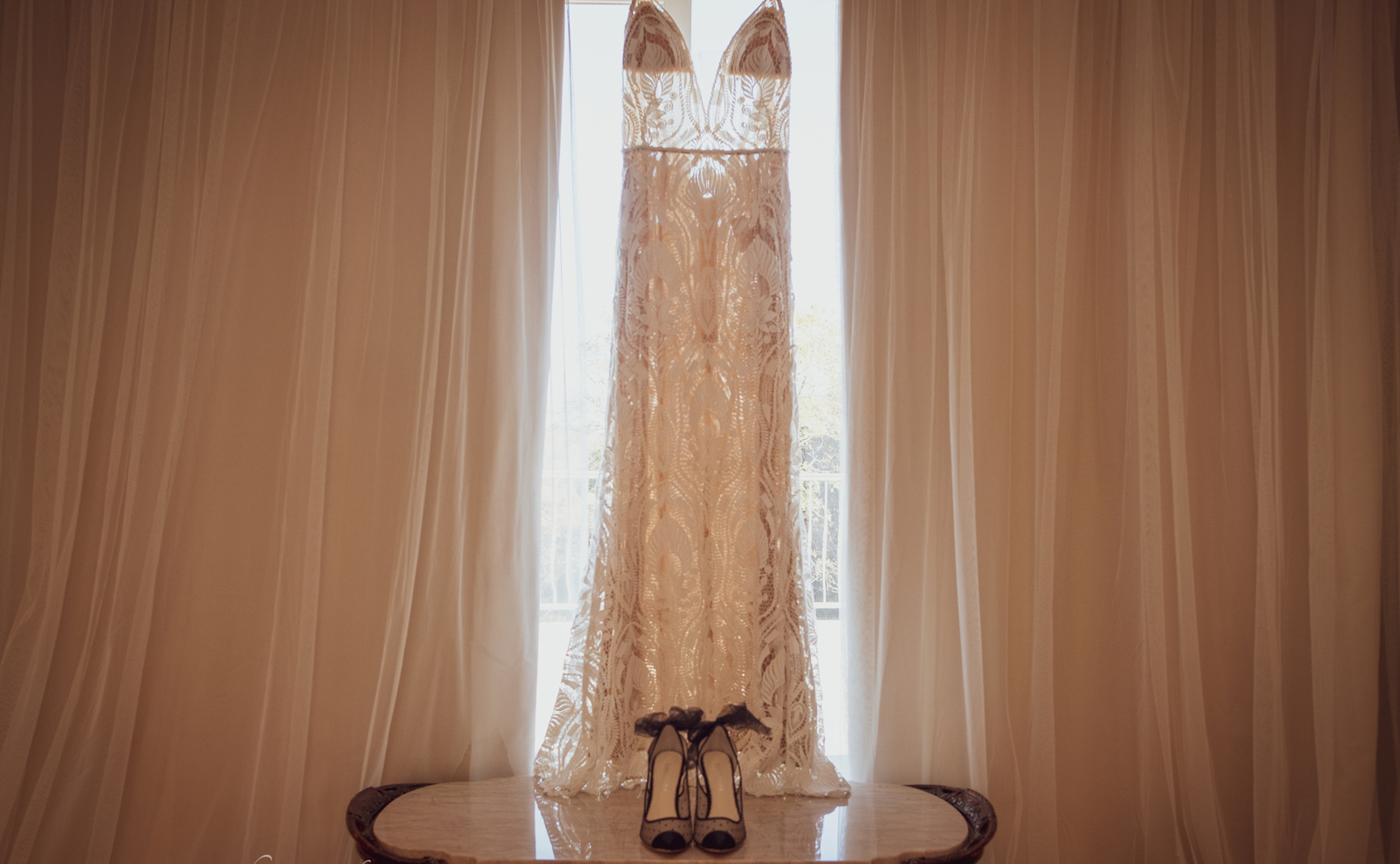 When asked about the inspiration for the shoot, Kendall Melissa says, “I pulled inspiration by leaning into the industrial structure surrounded by the lush gardens. I called this “A Romantic Industrial Garden” inspired shoot. I wanted to lean into the hard lines, dark iron accents, and soften them a little by bringing in hints of mauve and wood. I wanted to pair the modernness of the venue with antique gold pieces, that appear in the vintage candlesticks, brass goblets, and flatware accents. I love the juxtaposition of hard and soft, structure and romance, and new and old to create a cohesive design that is inviting. I wanted to contrast the masculinity of the villa with soft, feminine touches that can be seen in the lush florals seen on the tablescape and in the lounge. Overall I wanted to intertwine the feel of a lush garden with the hard structure of the villa.”