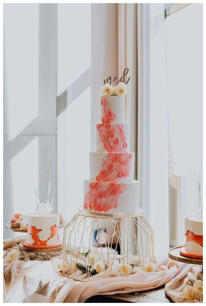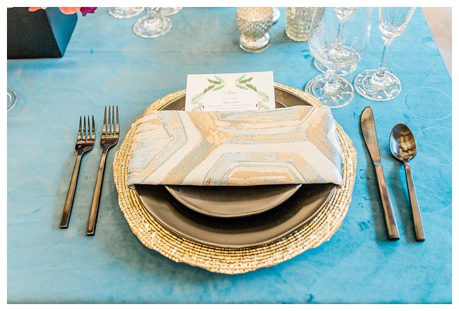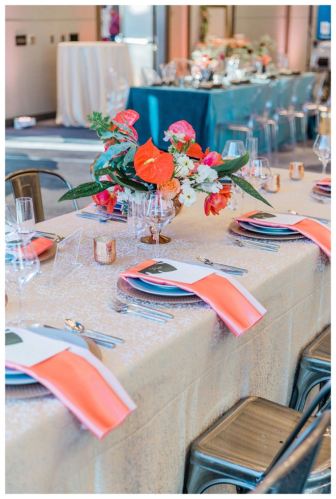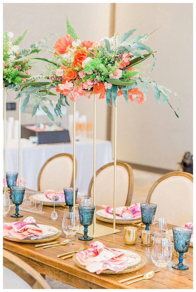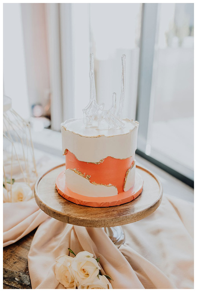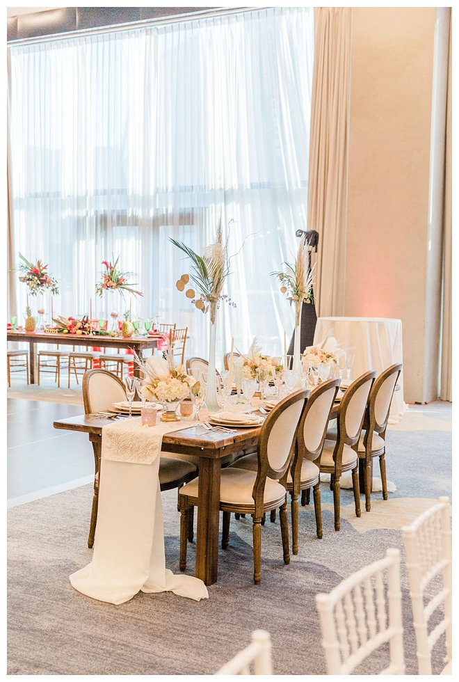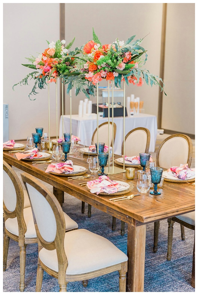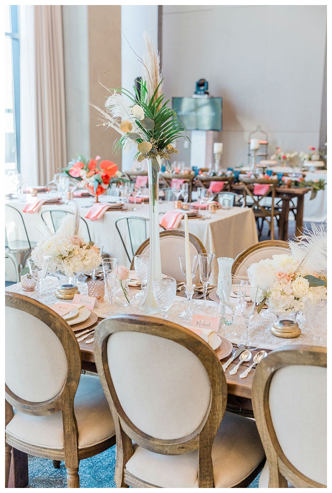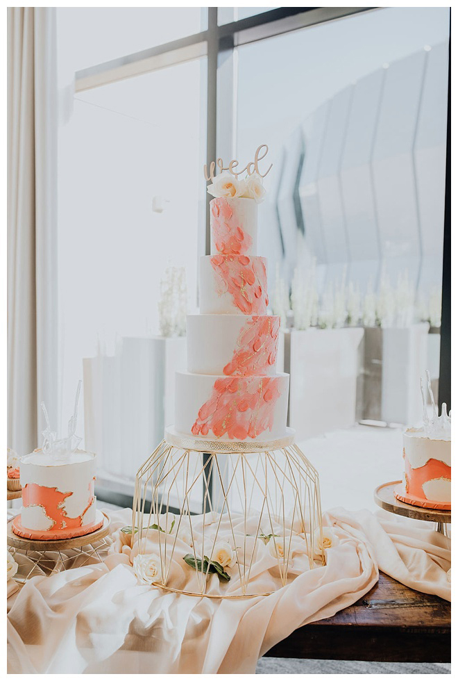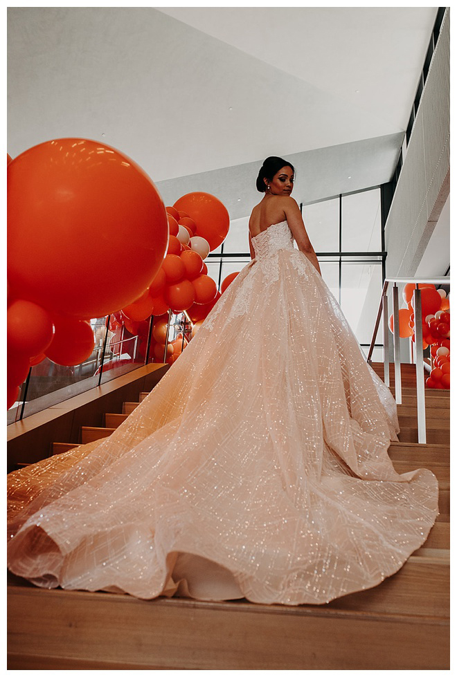 The show producer says, “We challenged our vendors to use the energizing colors found in nature to wow our guests. Think of it as a modern take on land, sky, and sea. Spoiler alert: they killed it. Between the balloon installation, rose gold dress and the blown sugar glass cakes, we couldn’t possibly pick a favorite detail. If Pantone had a Color of the Year party, this would be it.”