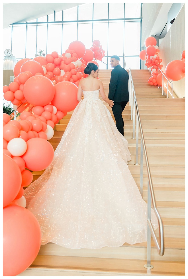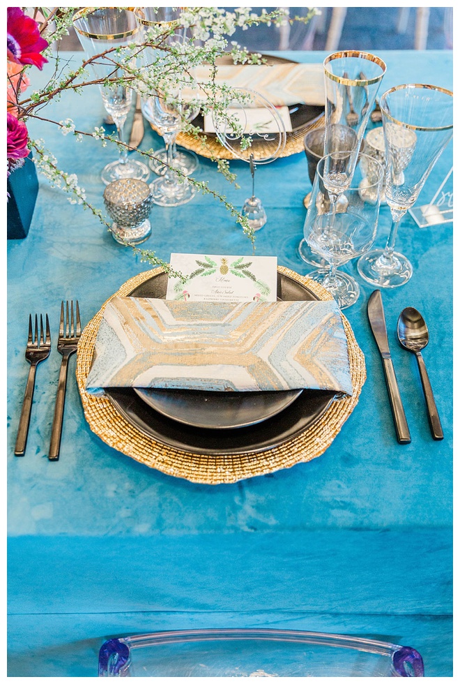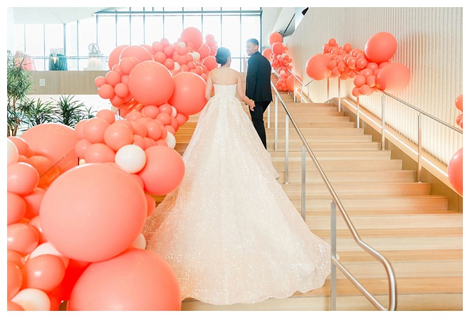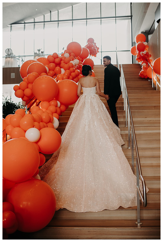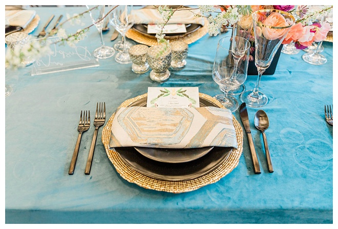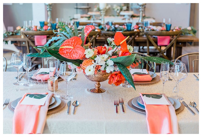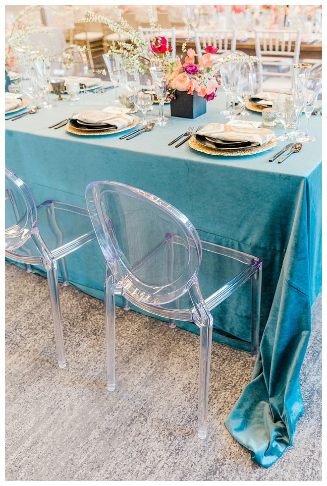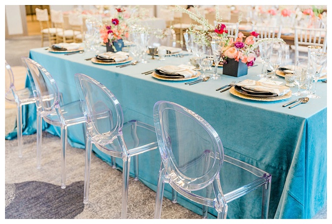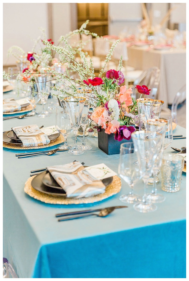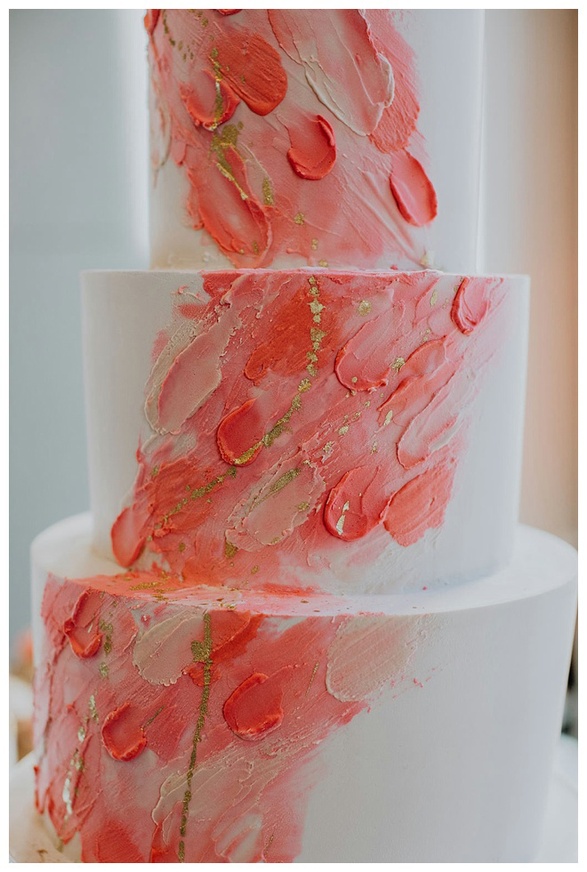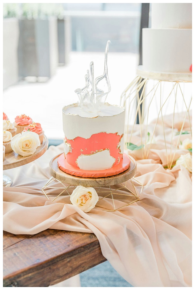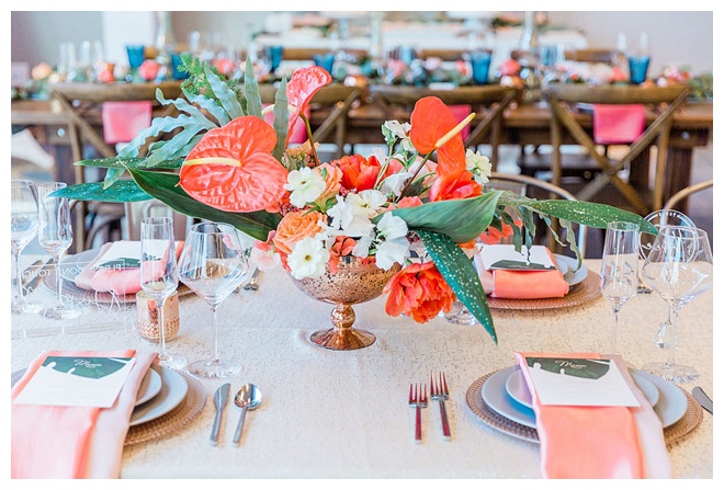 The show producer says, “We challenged our vendors to use the energizing colors found in nature to wow our guests. Think of it as a modern take on land, sky, and sea. Spoiler alert: they killed it. Between the balloon installation, rose gold dress and the blown sugar glass cakes, we couldn’t possibly pick a favorite detail. If Pantone had a Color of the Year party, this would be it.”