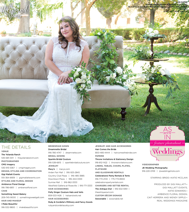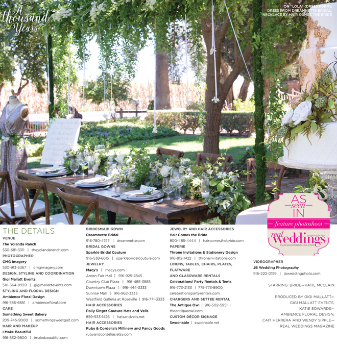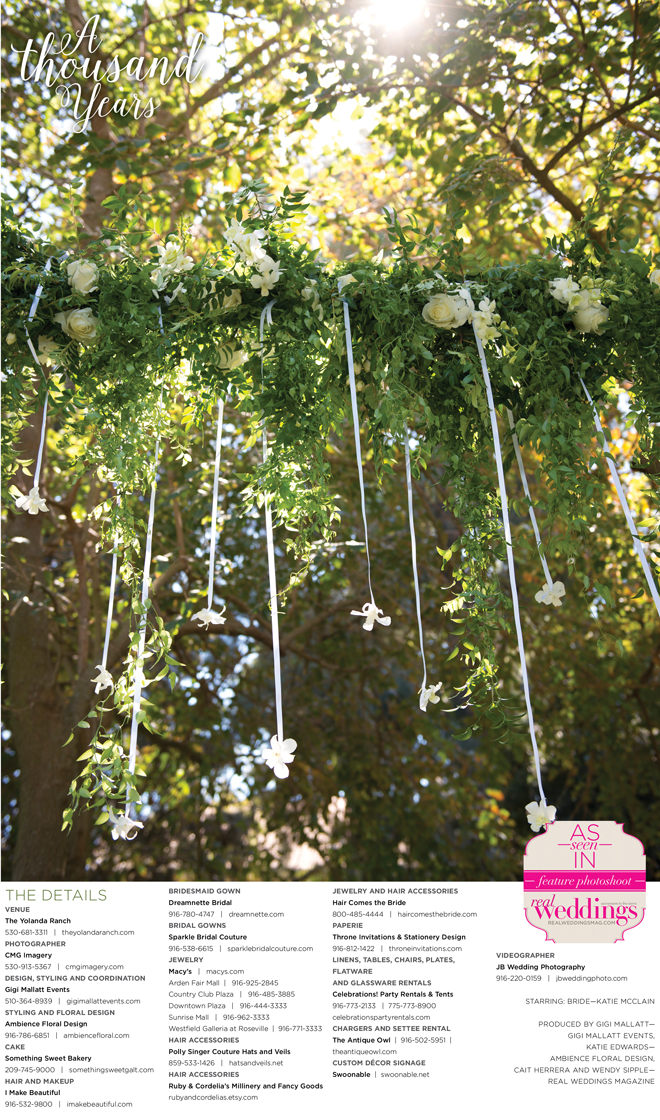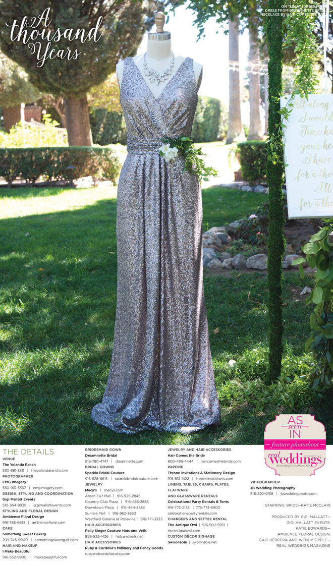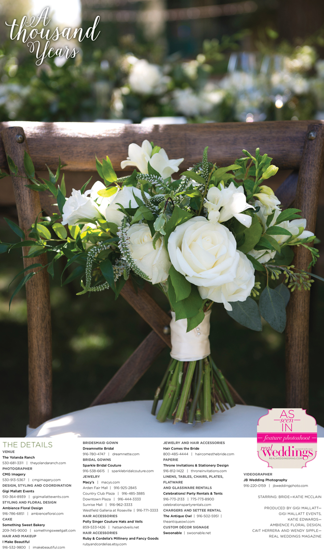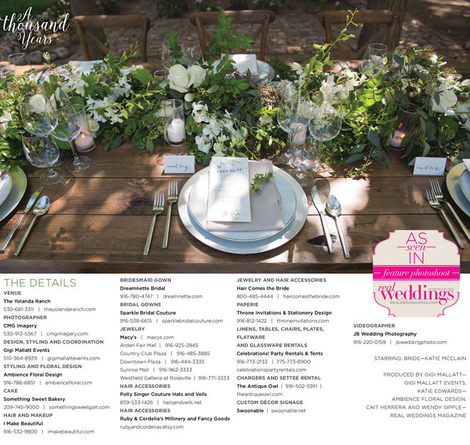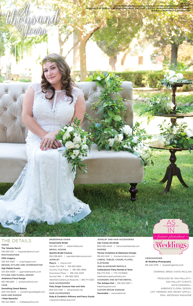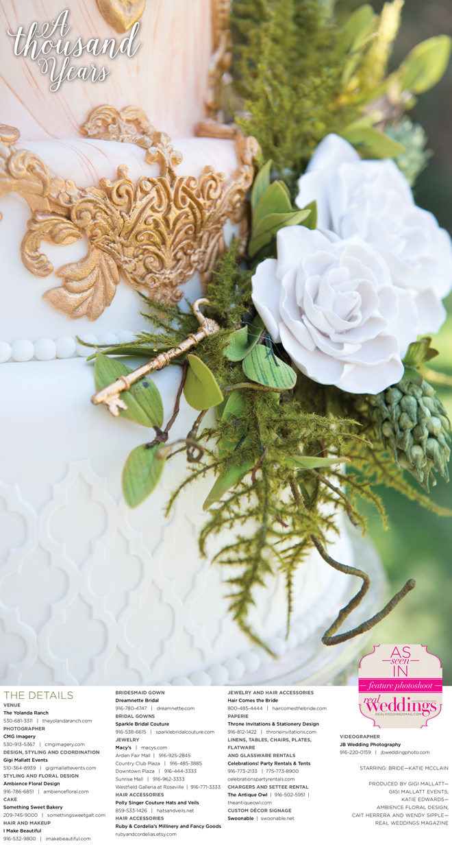“A Thousand Years” styled shoot was produced by Gigi Mallatt—Gigi Mallatt Events, Katie Edwards—Ambience Floral Design, Cait Herrera and Wendy Sipple—Real Weddings Magazine.