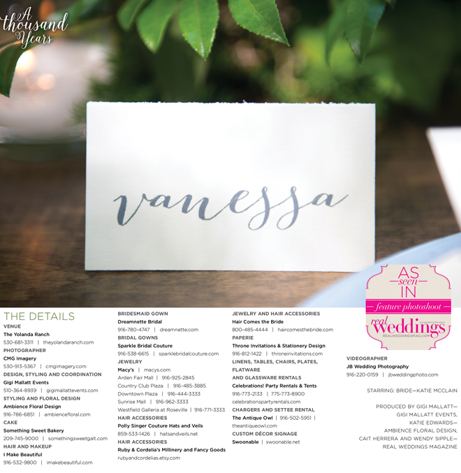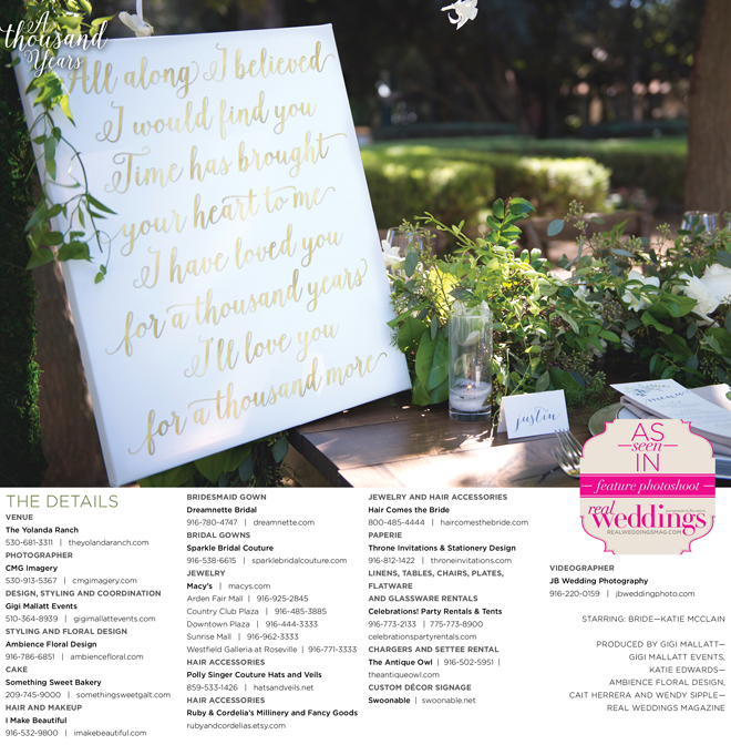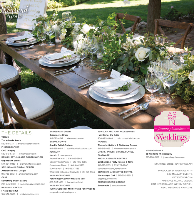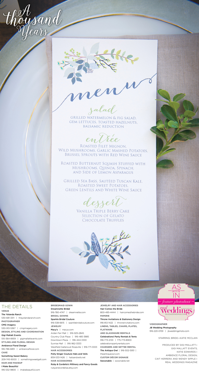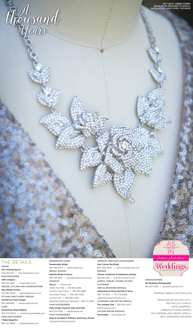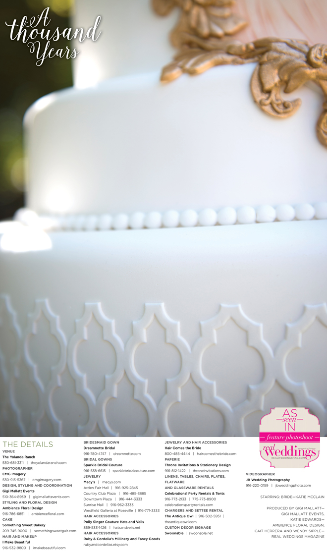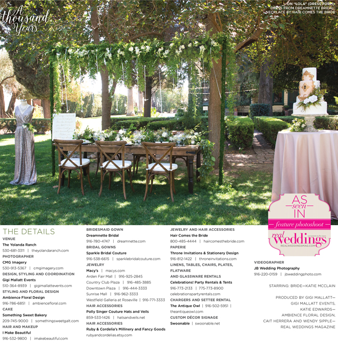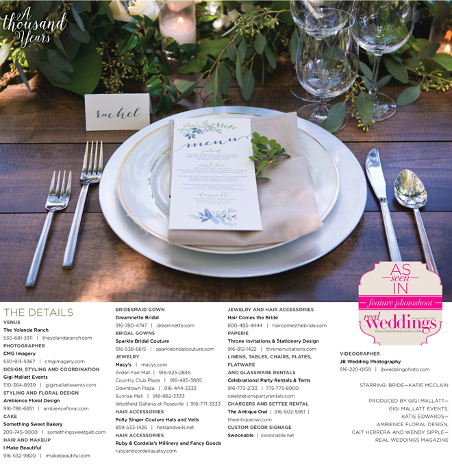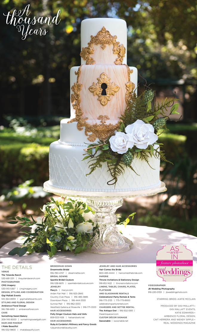 “A Thousand Years” styled shoot was produced by Gigi Mallatt—Gigi Mallatt Events, Katie Edwards—Ambience Floral Design, Cait Herrera and Wendy Sipple—Real Weddings Magazine.
