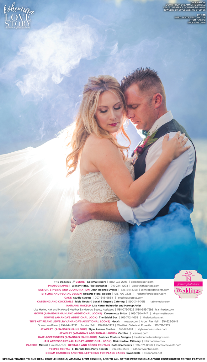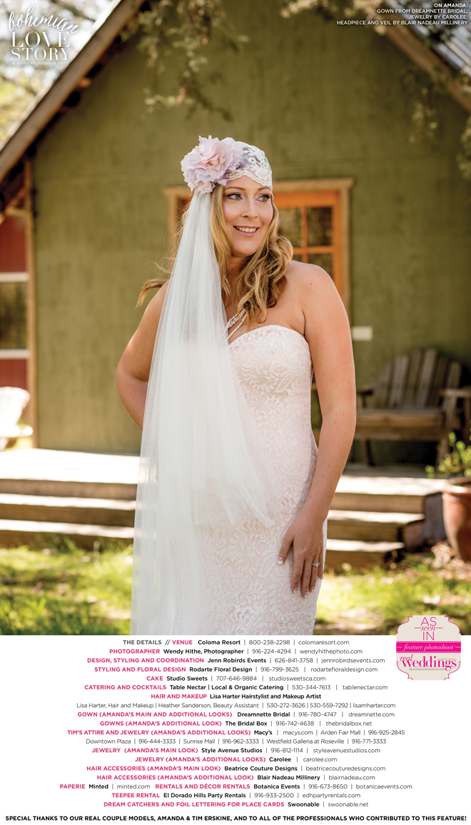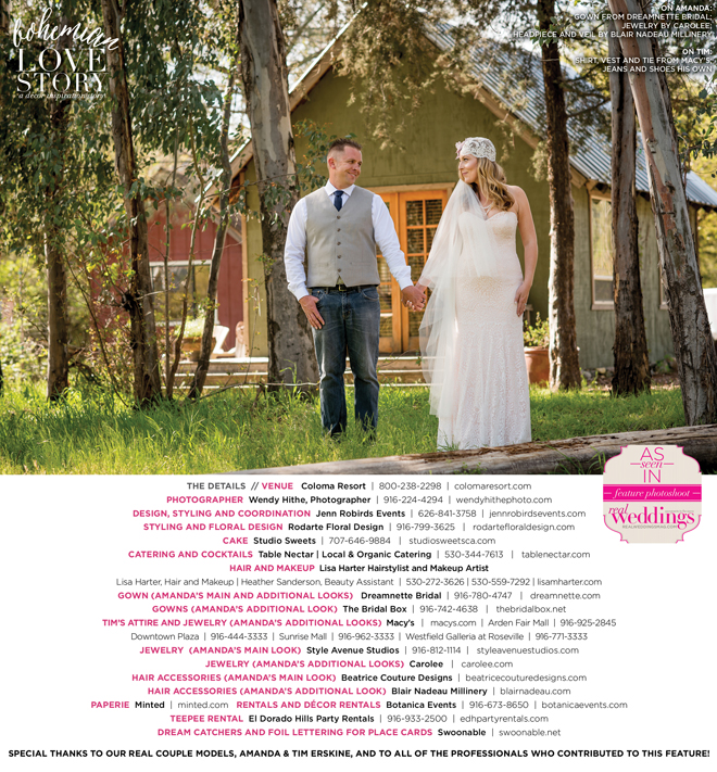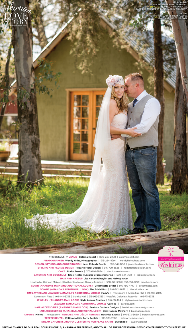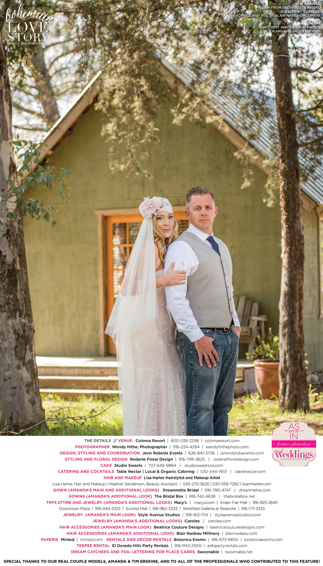 Did you know that we only use real brides, real grooms and real couples as our models in Real Weddings?! It’s true! For our “Bohemian Love Story” styled shoot in the current Summer/Fall 2016 issue, we were lucky enough to have newlyweds Amanda and Tim Erskine as our real couple models!