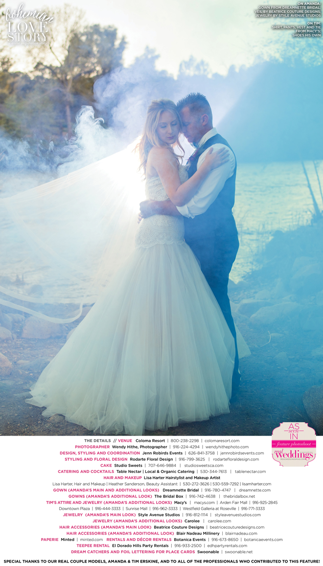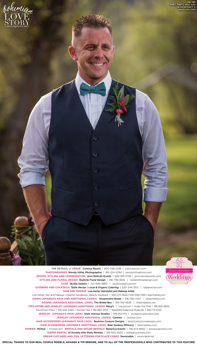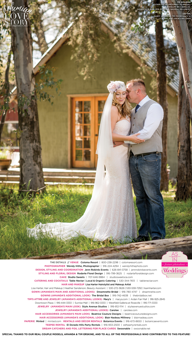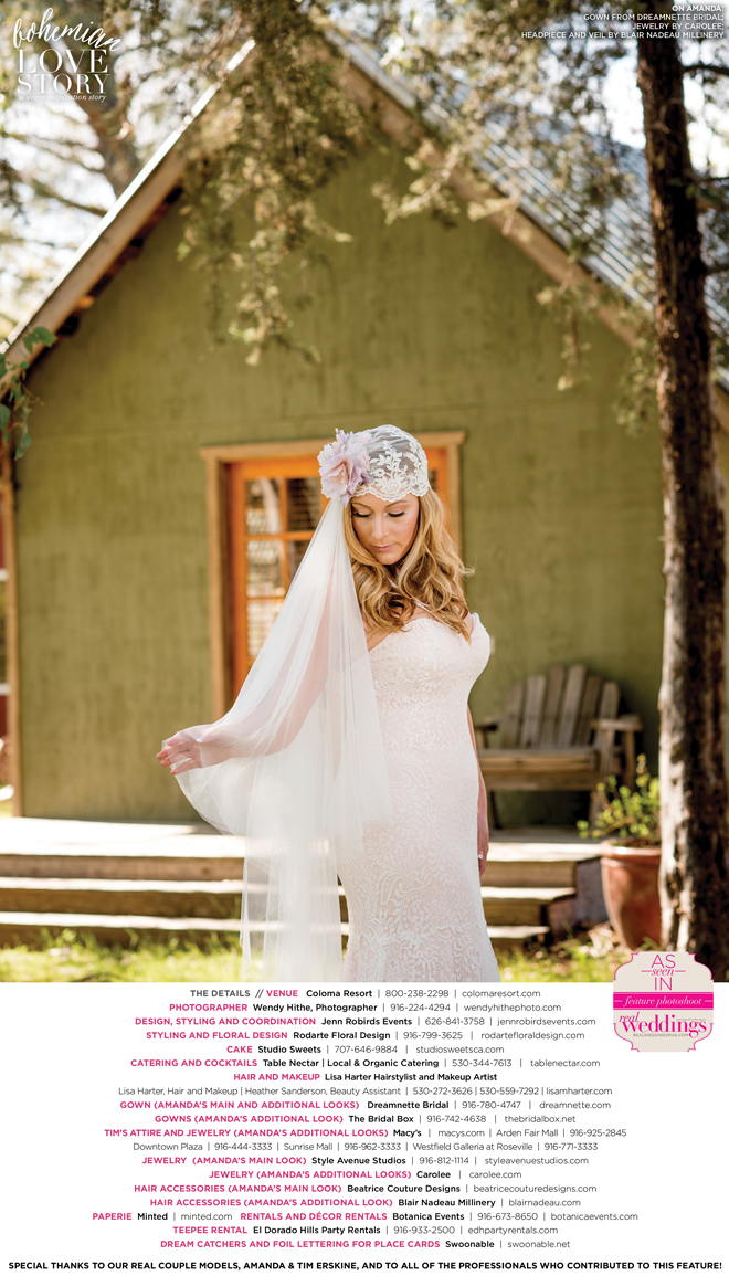 Did you know that we only use real brides, real grooms and real couples as our models in Real Weddings?! It’s true! For our “Bohemian Love Story” styled shoot in the current Summer/Fall 2016 issue, we were lucky enough to have newlyweds Amanda and Tim Erskine as our real couple models!