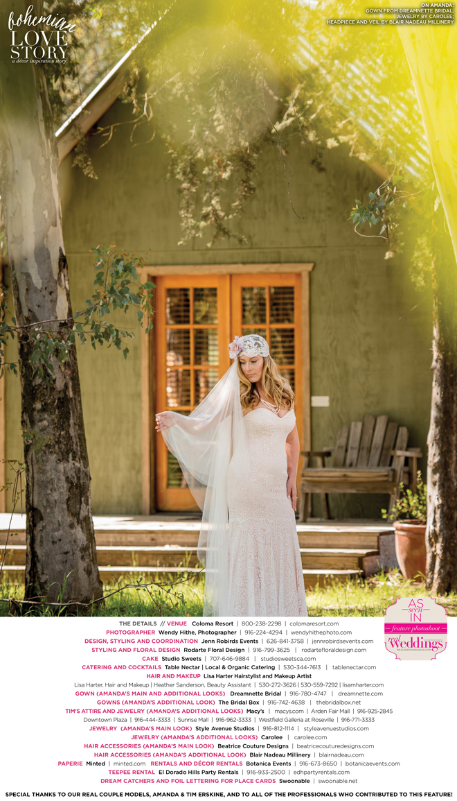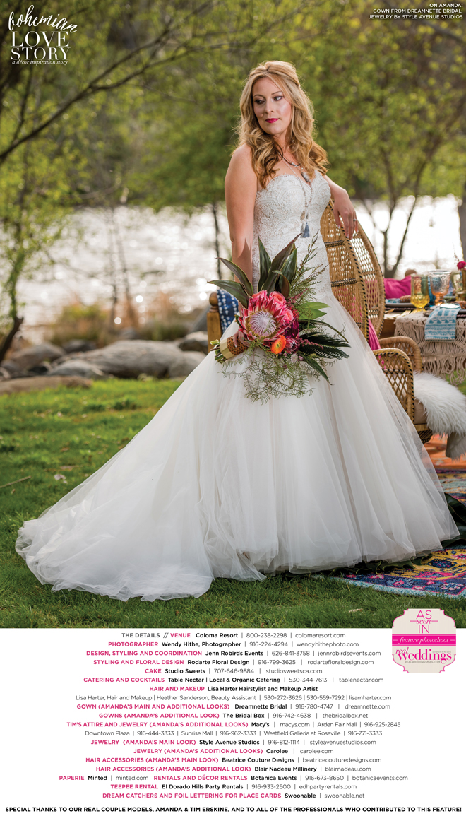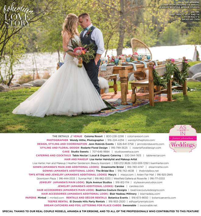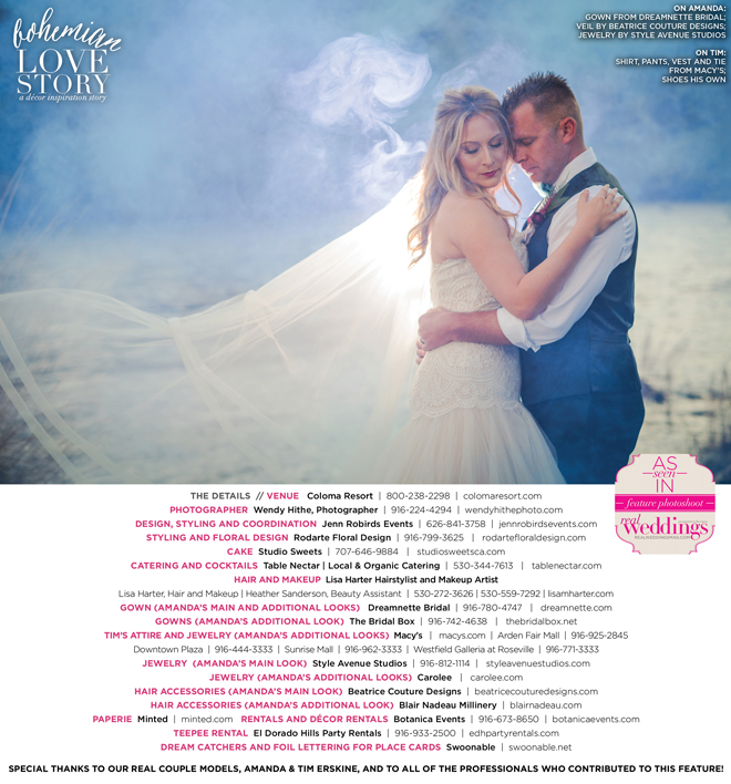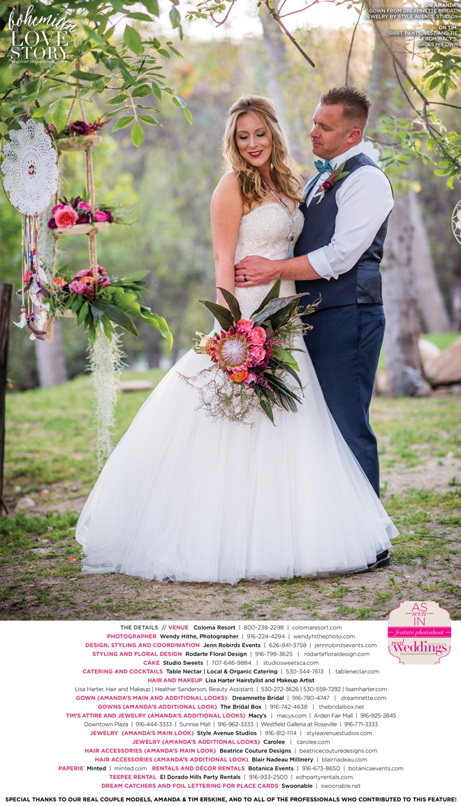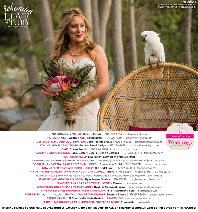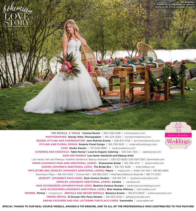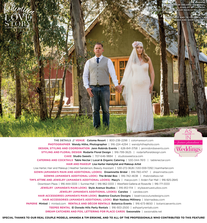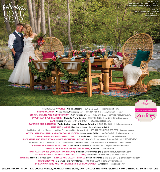 “Bohemian Love Story” was produced by Jenn Robirds—Jenn Robirds Events; DeAnn Rodarte—Rodarte Floral Design; Emily Peter, Aaron Roseli and Wendy Sipple—Real Weddings Magazine.