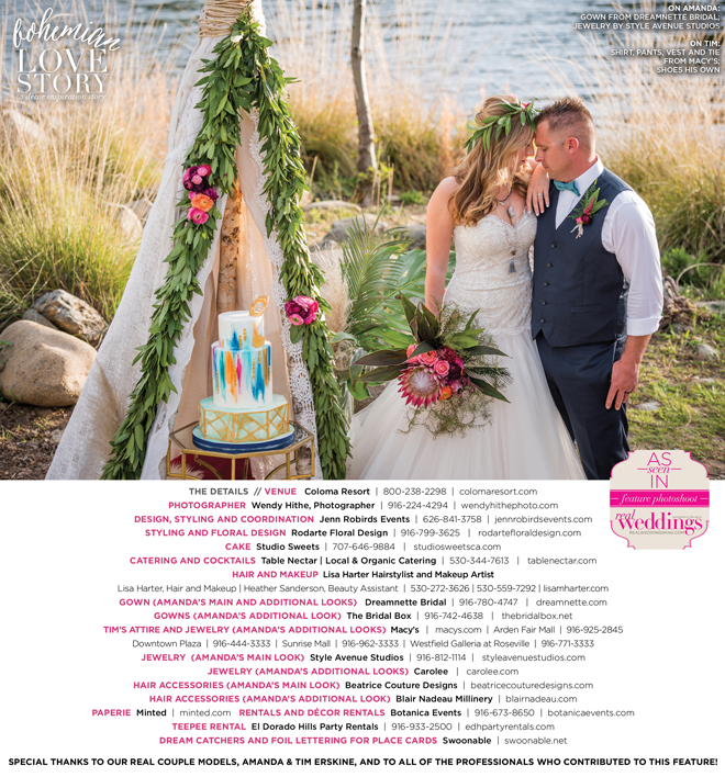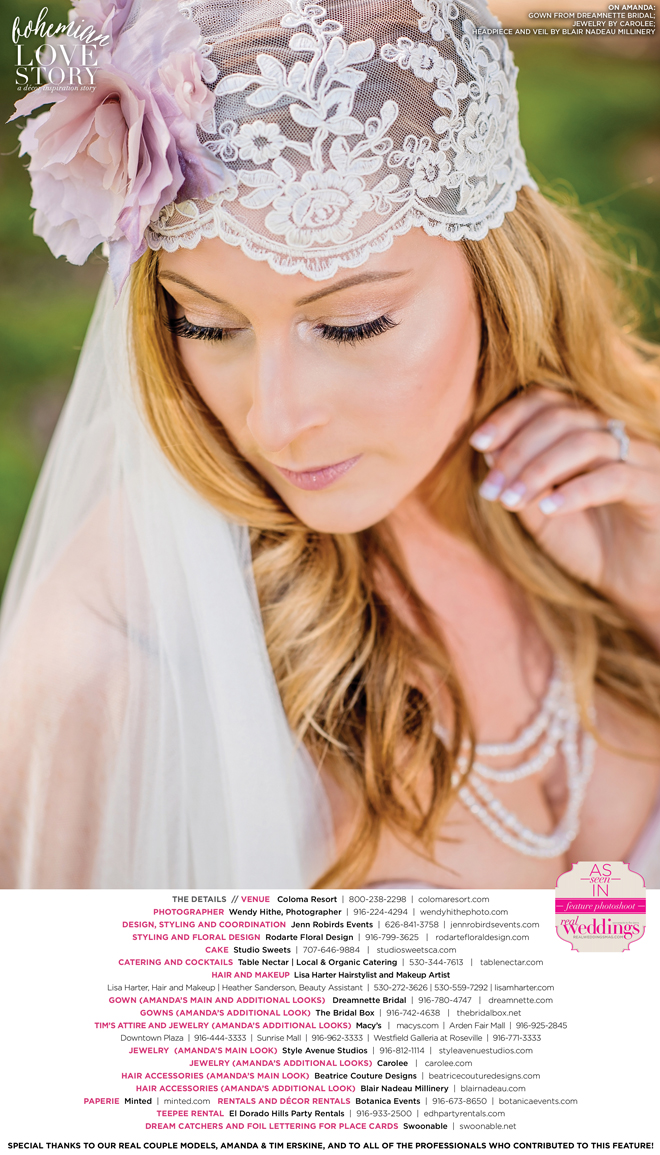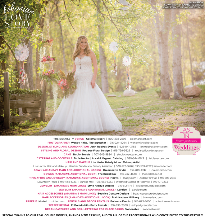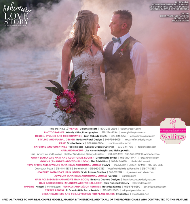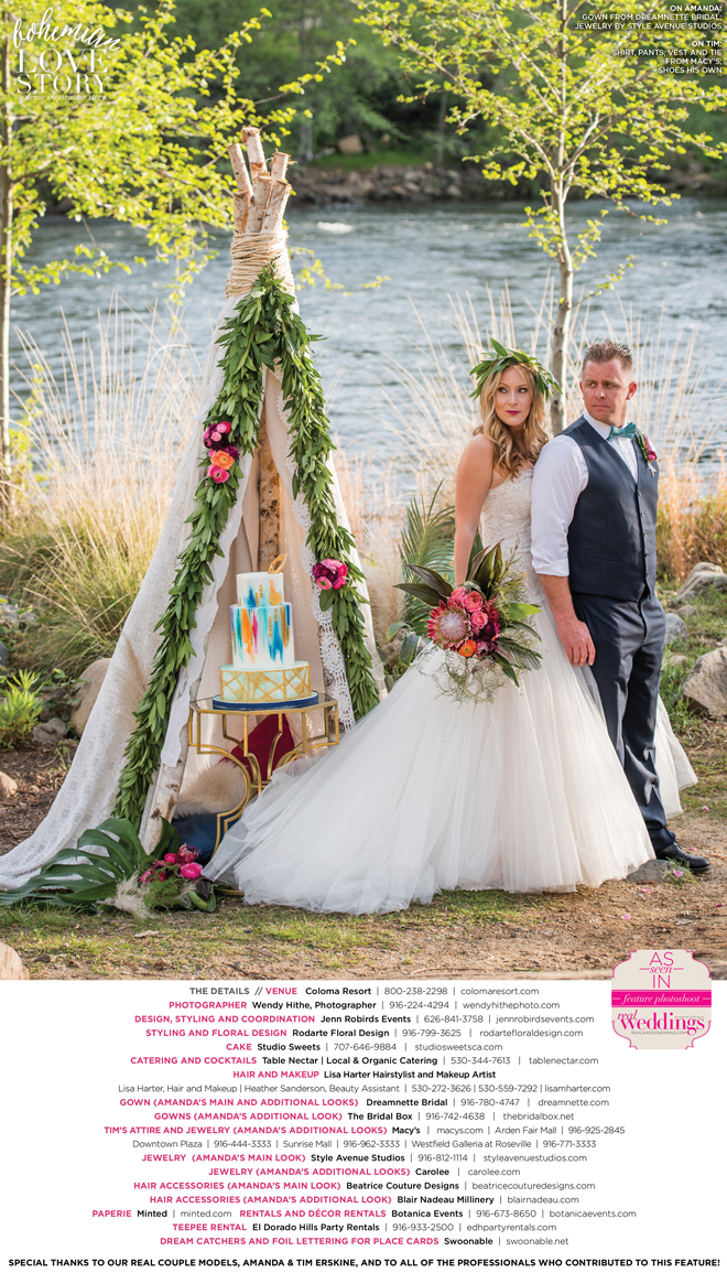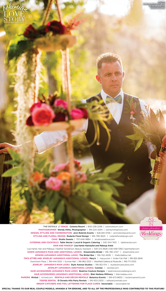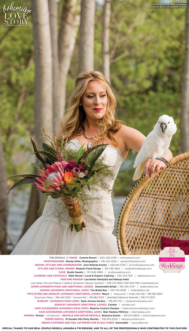 “Bohemian Love Story” was produced by Jenn Robirds—Jenn Robirds Events; DeAnn Rodarte—Rodarte Floral Design; Emily Peter, Aaron Roseli and Wendy Sipple—Real Weddings Magazine.
