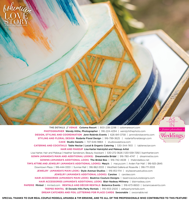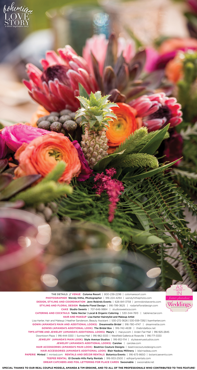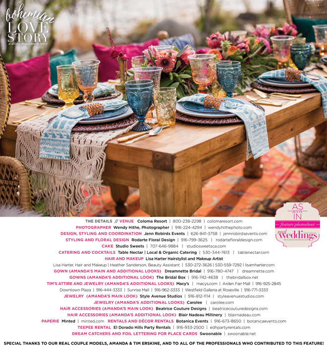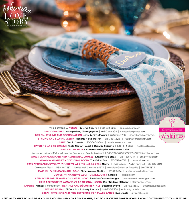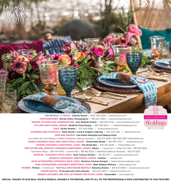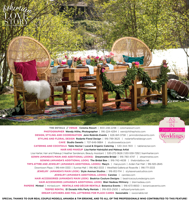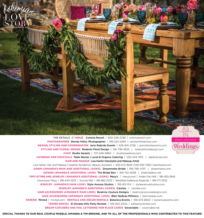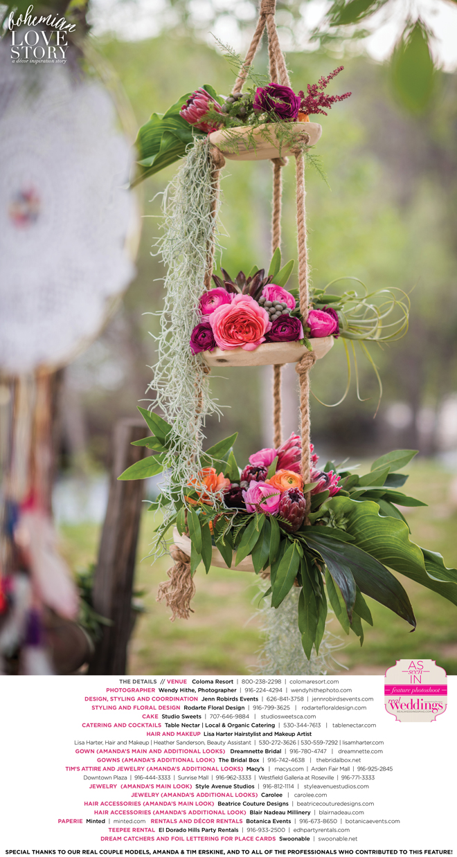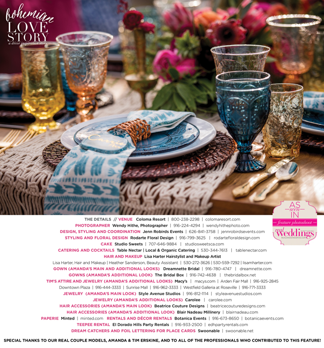 “Bohemian Love Story” was produced by Jenn Robirds—Jenn Robirds Events; DeAnn Rodarte—Rodarte Floral Design; Emily Peter, Aaron Roseli and Wendy Sipple—Real Weddings Magazine.
