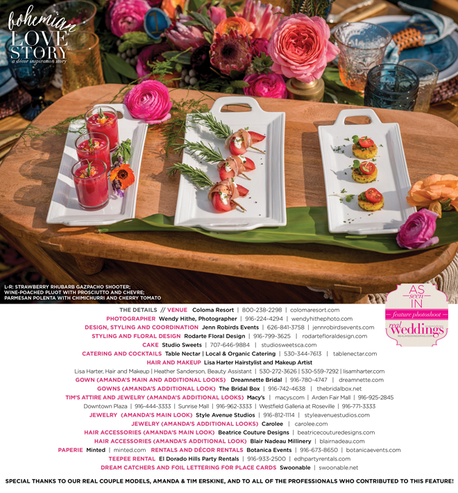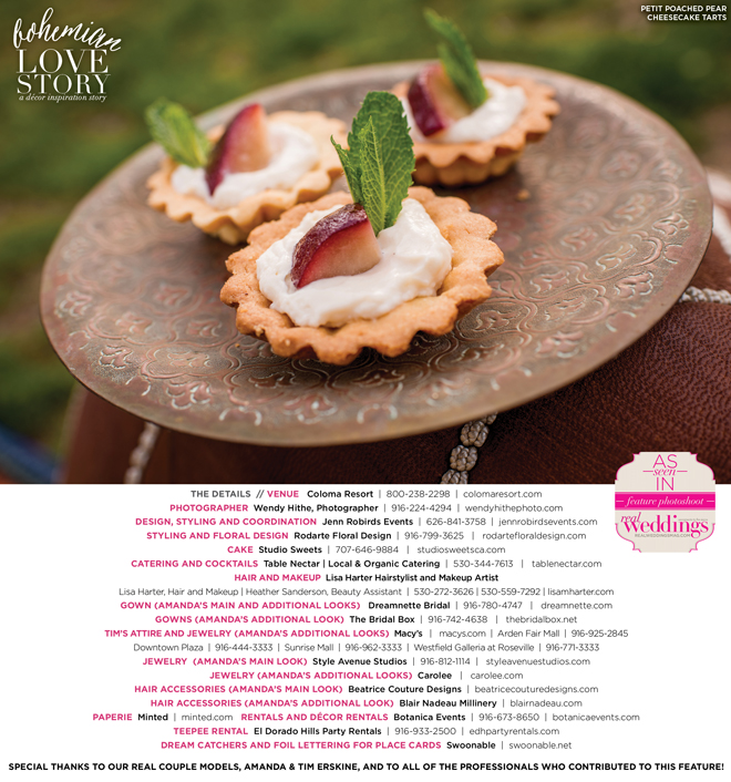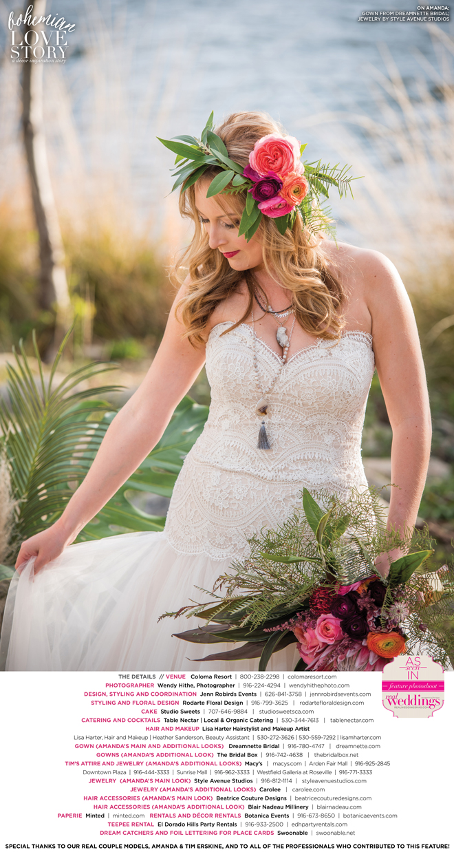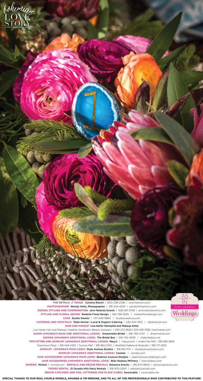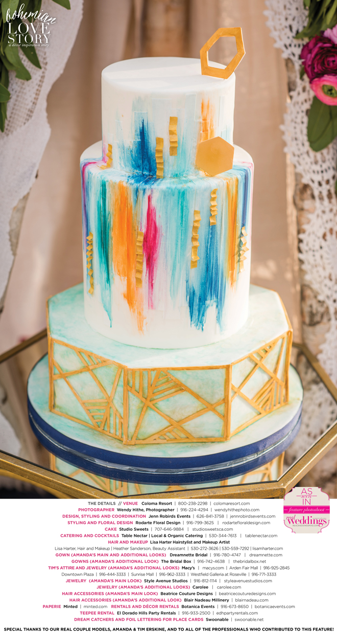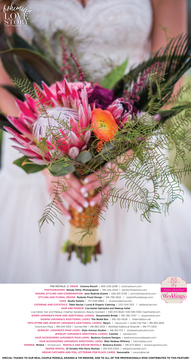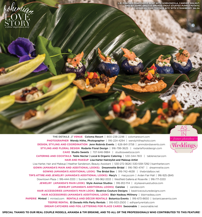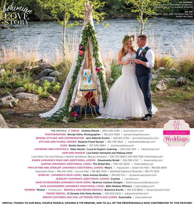 “Bohemian Love Story” was produced by Jenn Robirds—Jenn Robirds Events; DeAnn Rodarte—Rodarte Floral Design; Emily Peter, Aaron Roseli and Wendy Sipple—Real Weddings Magazine.