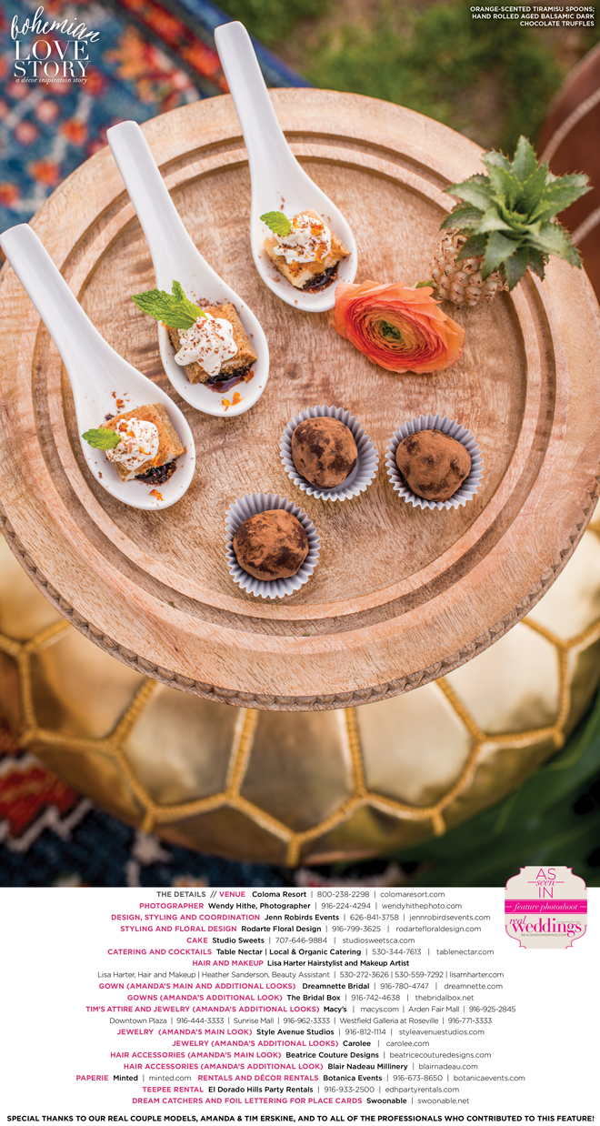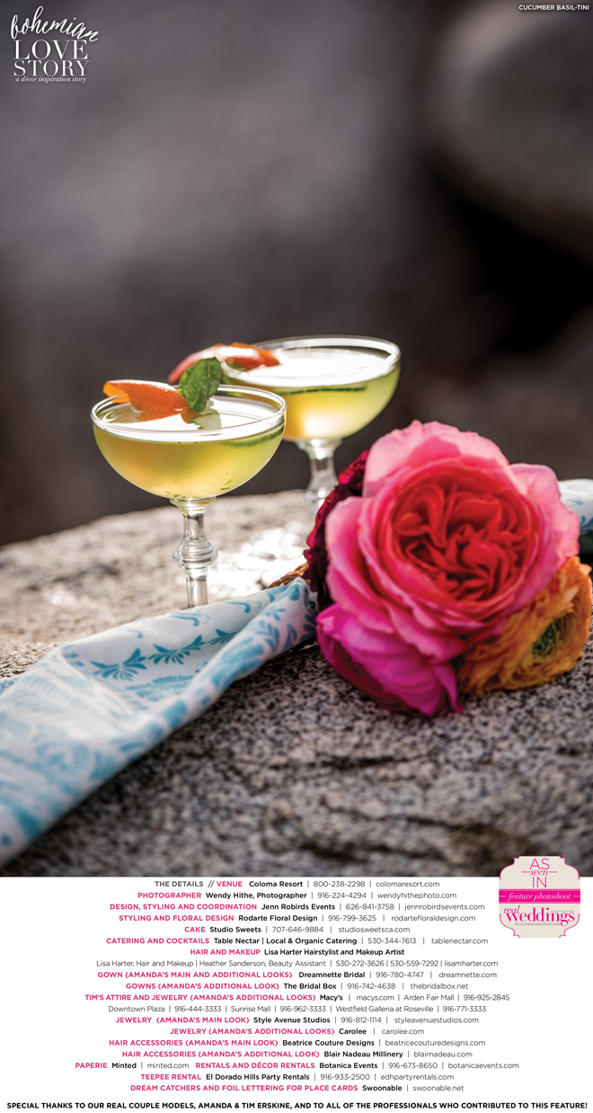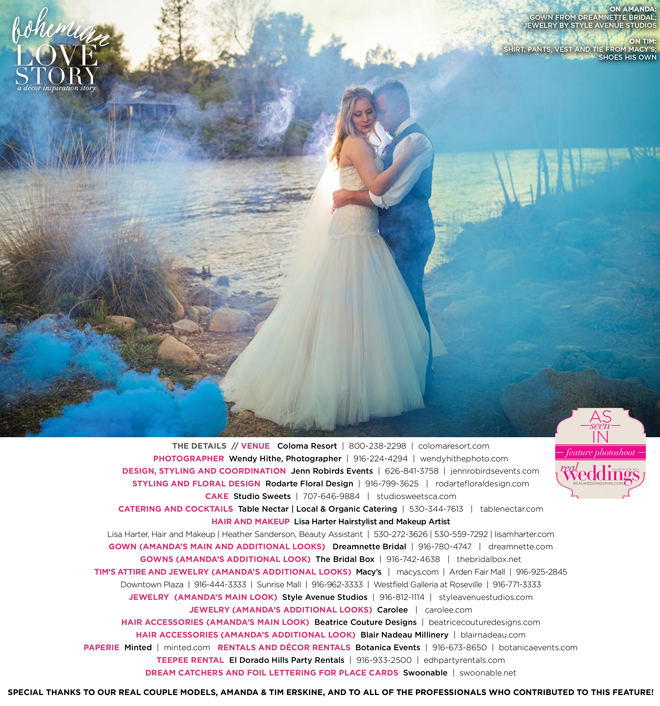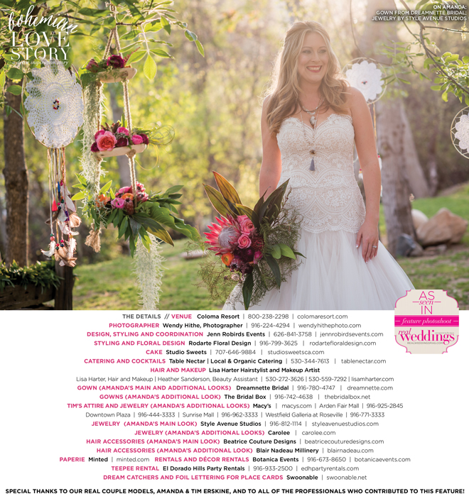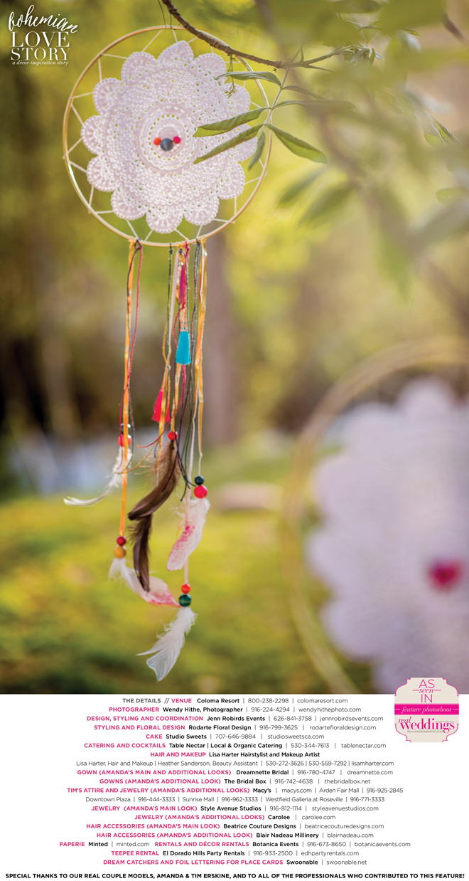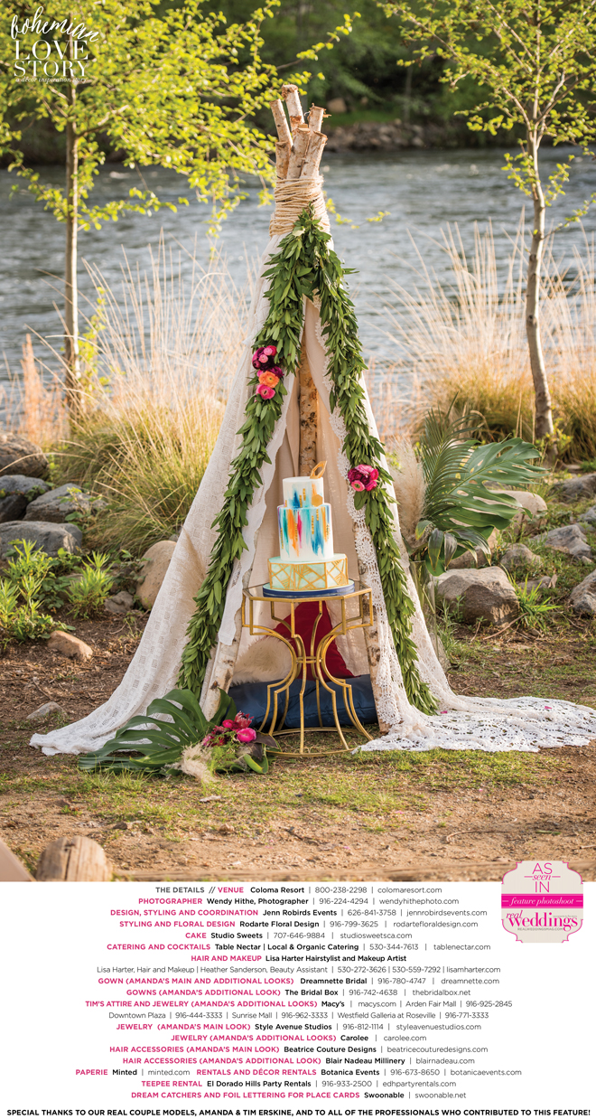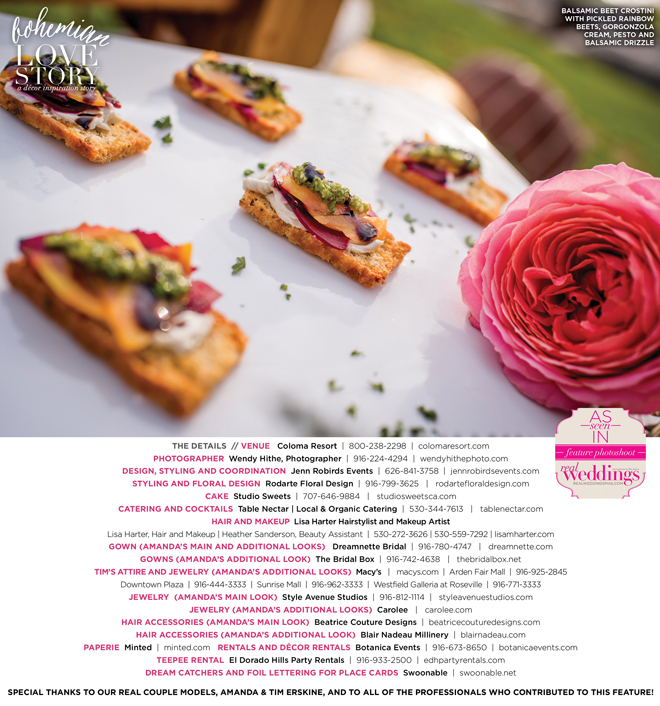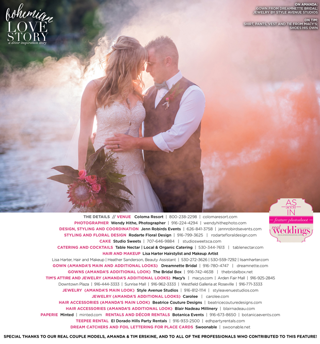 “Bohemian Love Story” was produced by Jenn Robirds—Jenn Robirds Events; DeAnn Rodarte—Rodarte Floral Design; Emily Peter, Aaron Roseli and Wendy Sipple—Real Weddings Magazine.