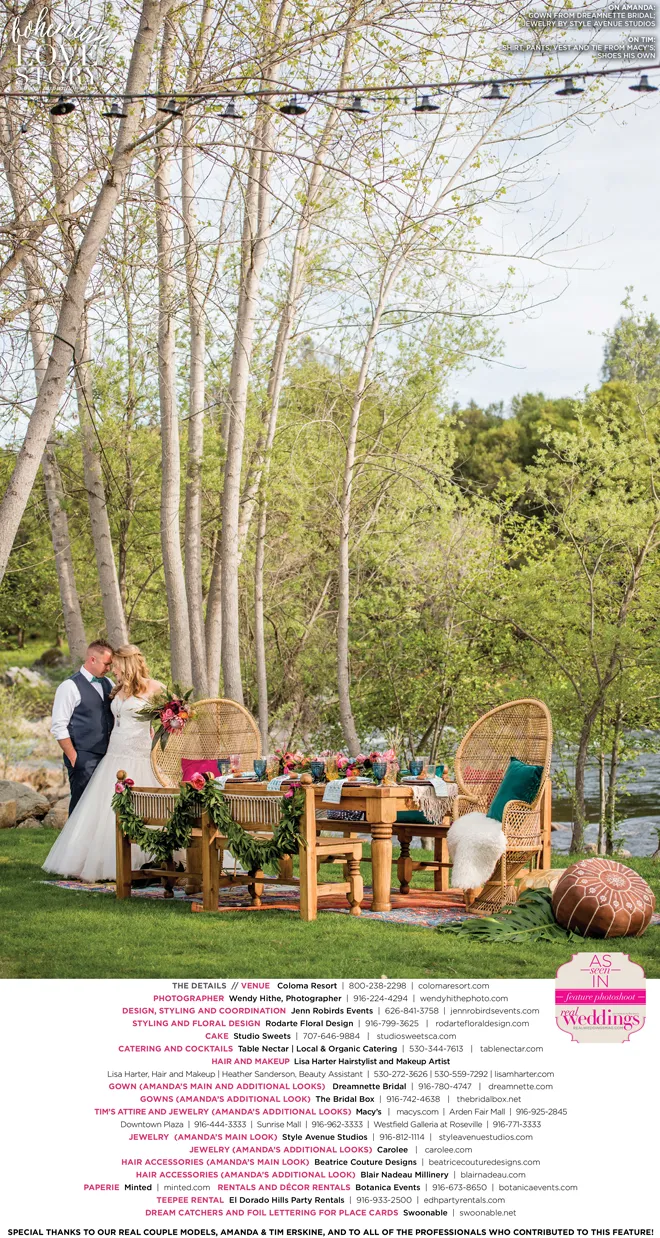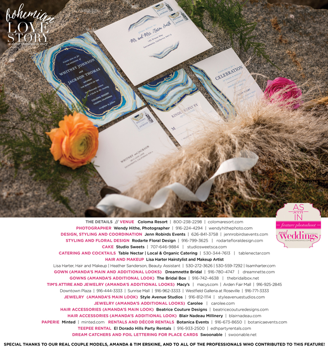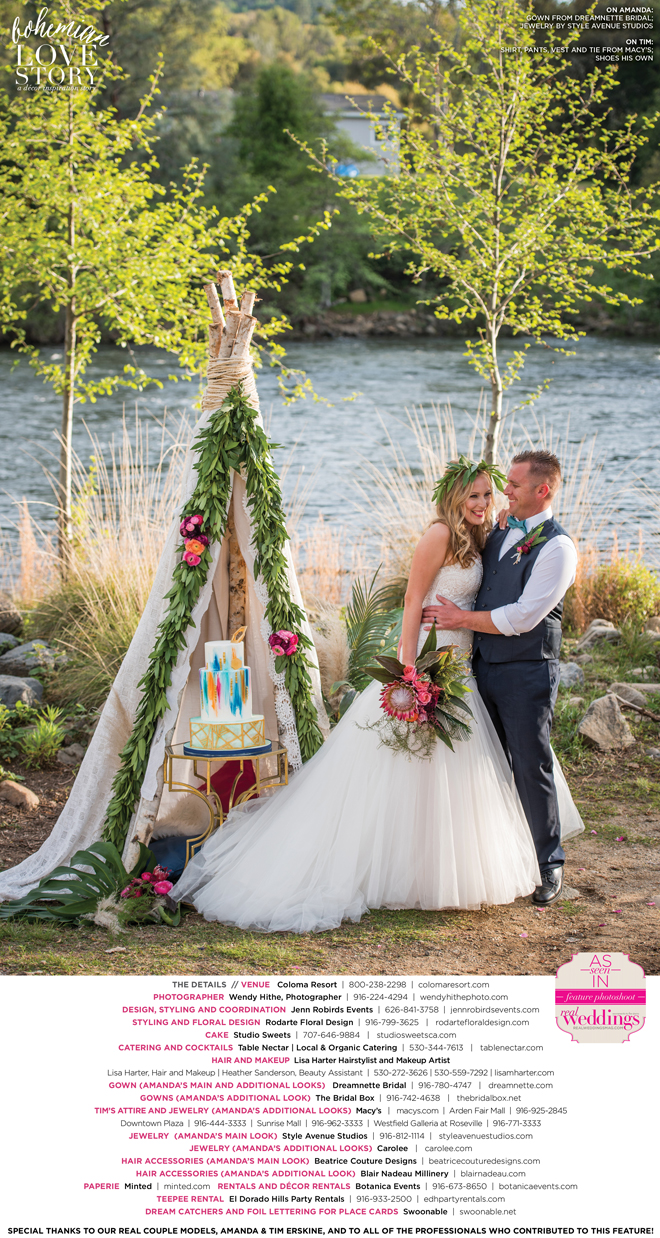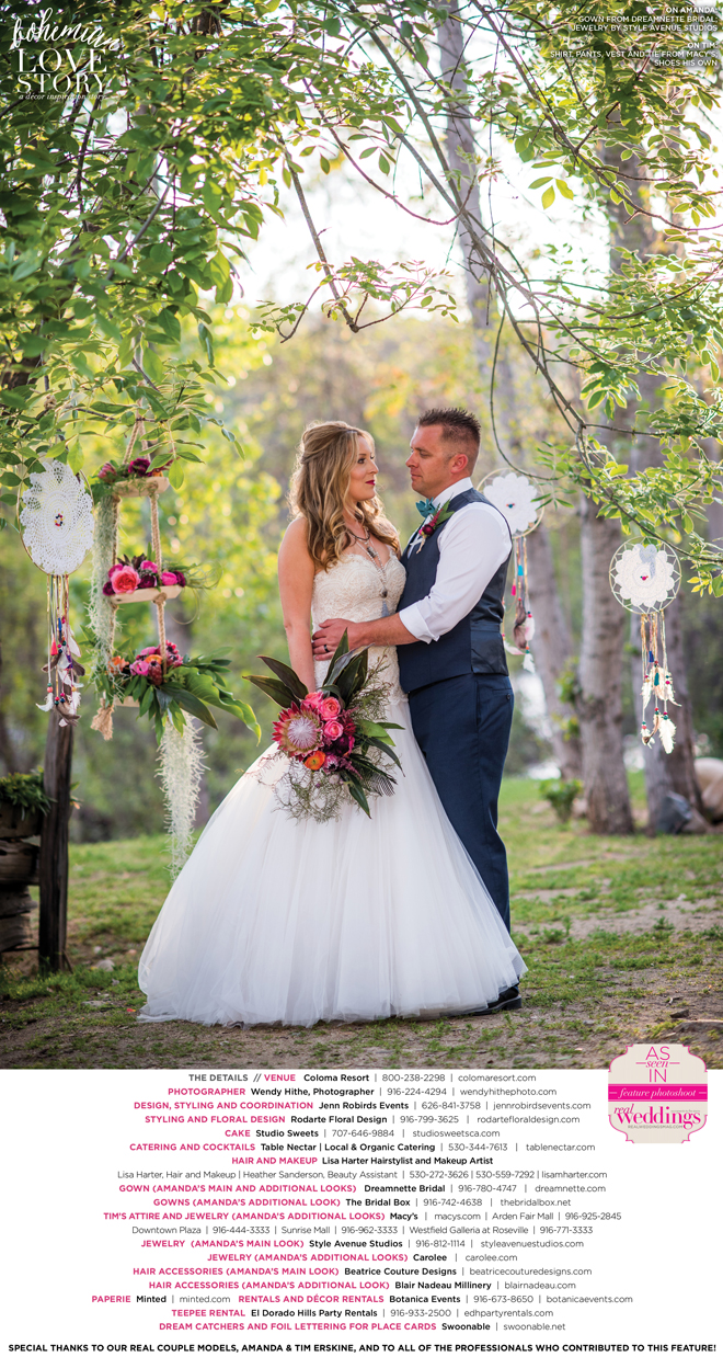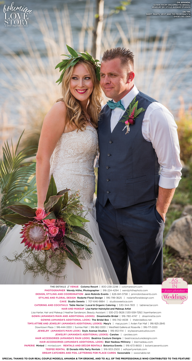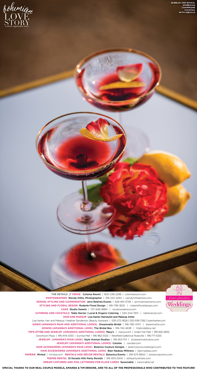“Bohemian Love Story” was produced by Jenn Robirds—Jenn Robirds Events; DeAnn Rodarte—Rodarte Floral Design; Emily Peter, Aaron Roseli and Wendy Sipple—Real Weddings Magazine.