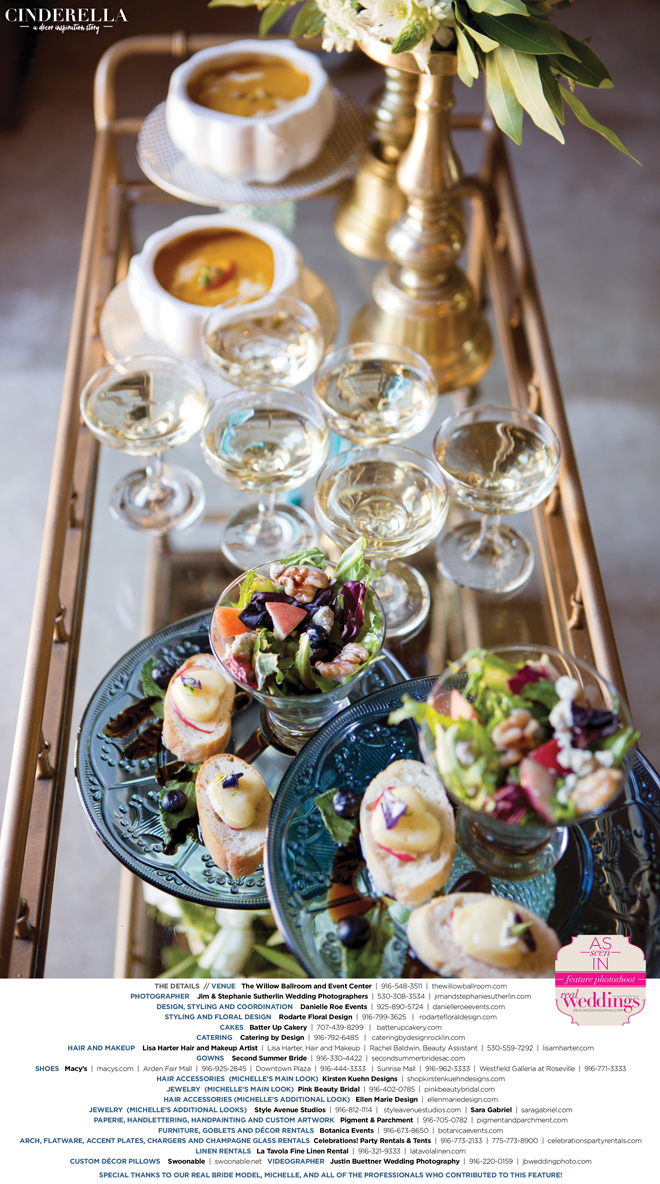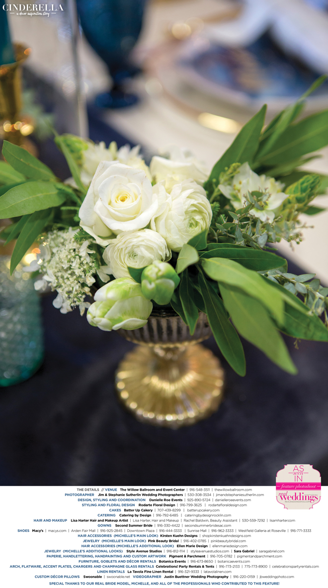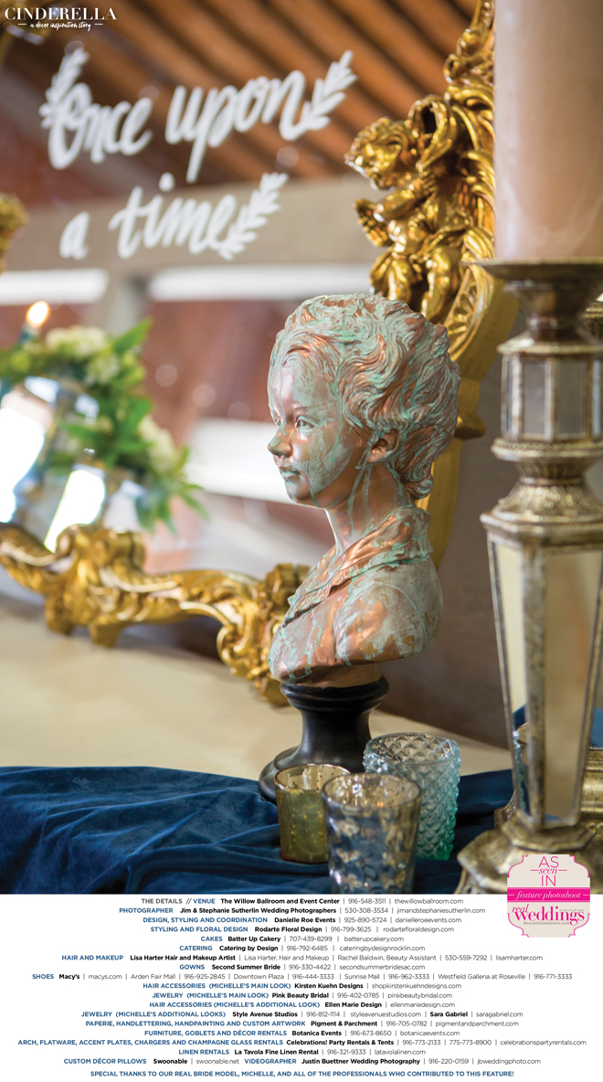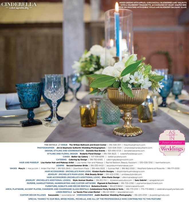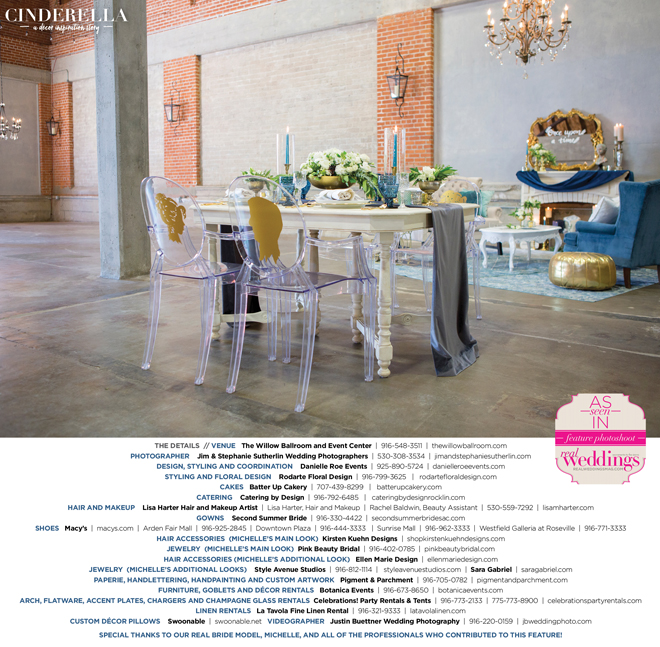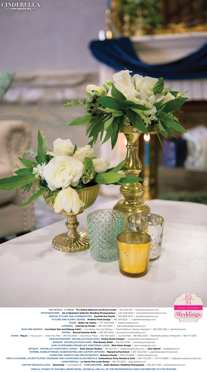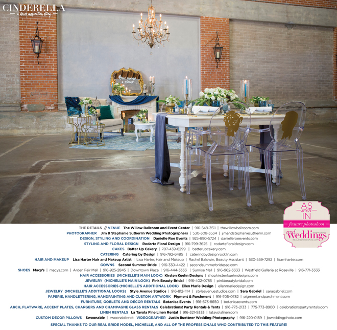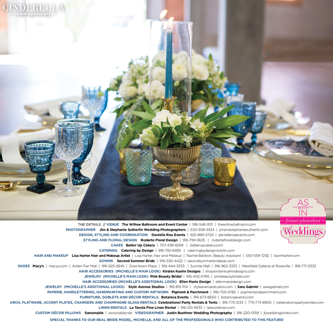 “Cinderella” was produced by Danielle Roe—Danielle Roe Events, DeAnn Rodarte—Rodarte Floral Design, Susie Baggett and Wendy Sipple—Real Weddings Magazine.