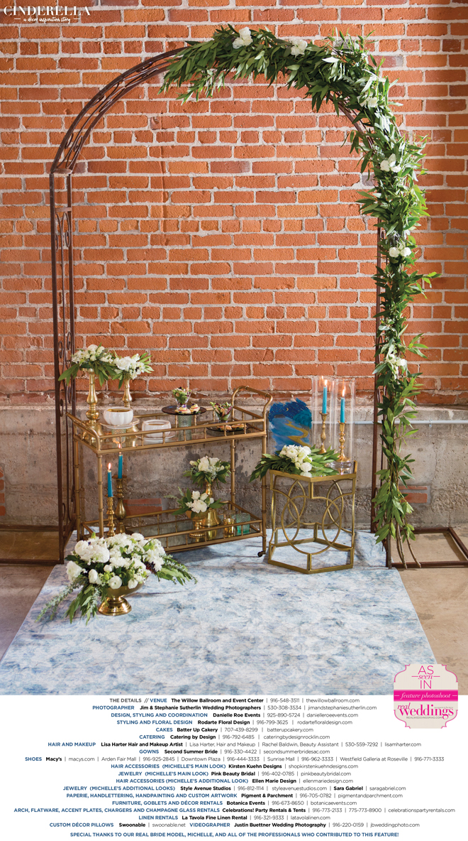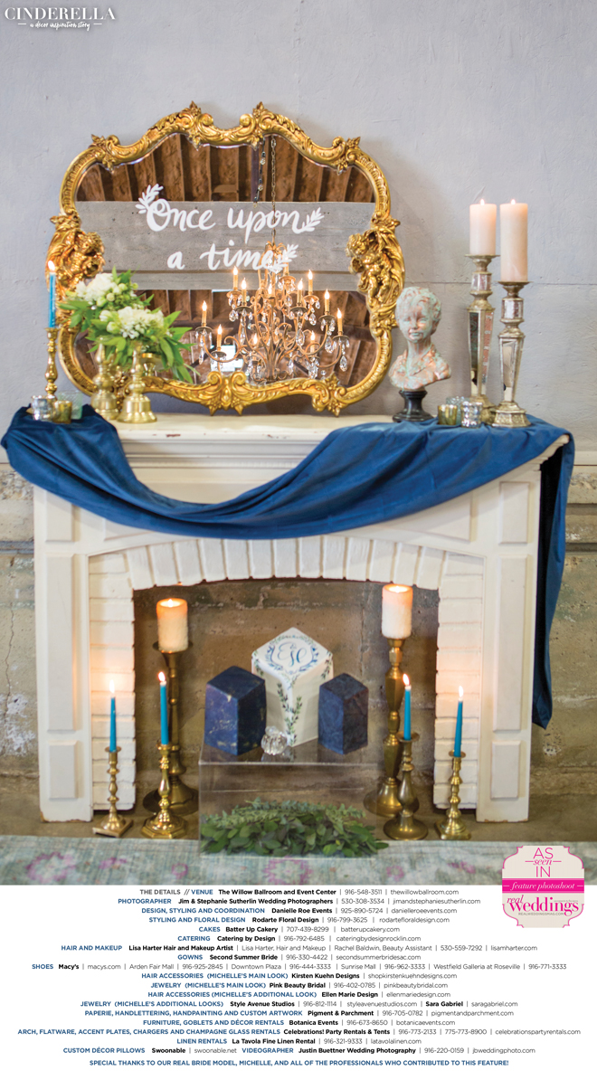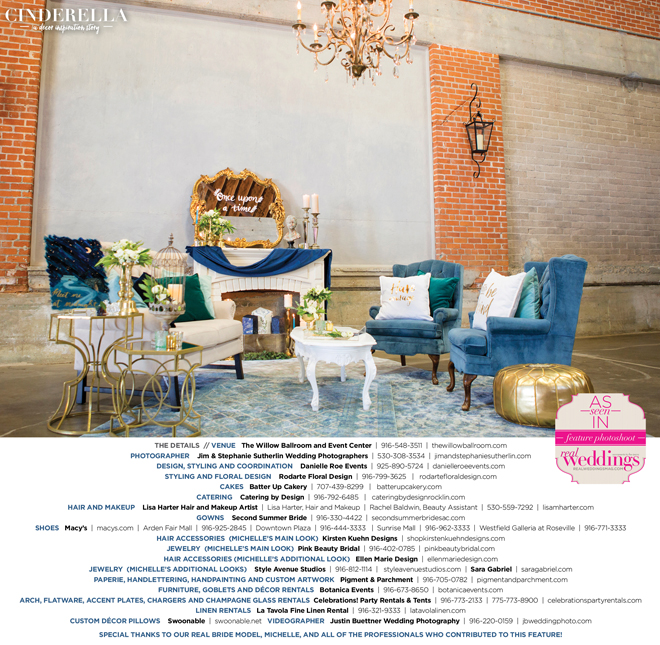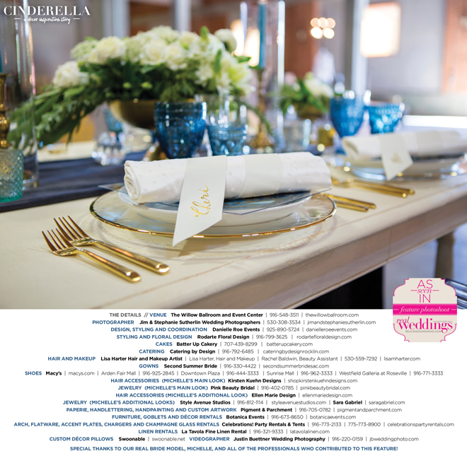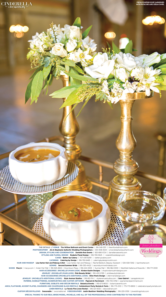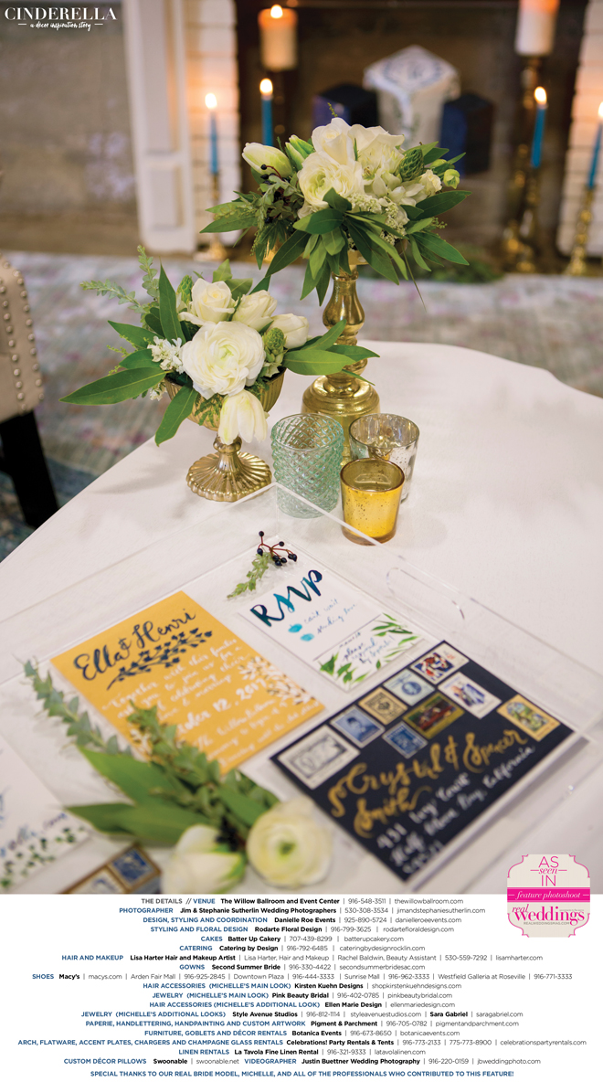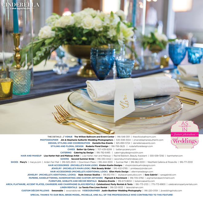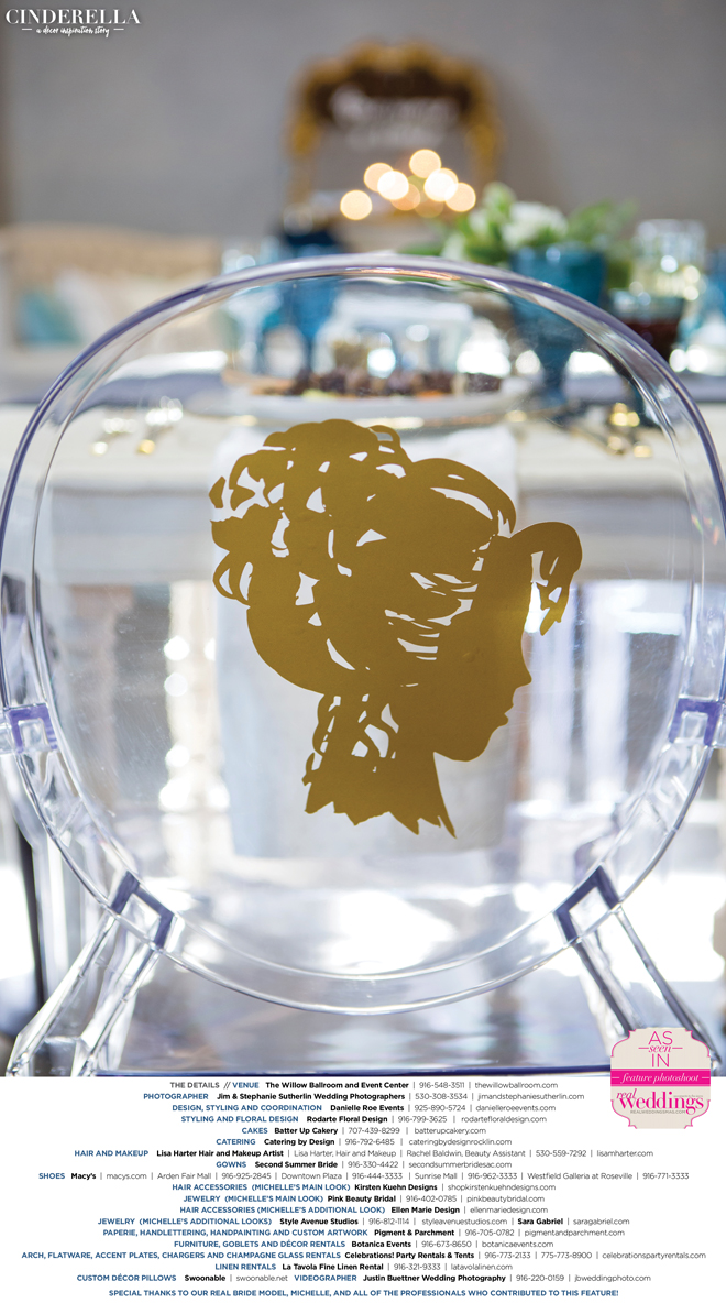 “Cinderella” was produced by Danielle Roe—Danielle Roe Events, DeAnn Rodarte—Rodarte Floral Design, Susie Baggett and Wendy Sipple—Real Weddings Magazine.