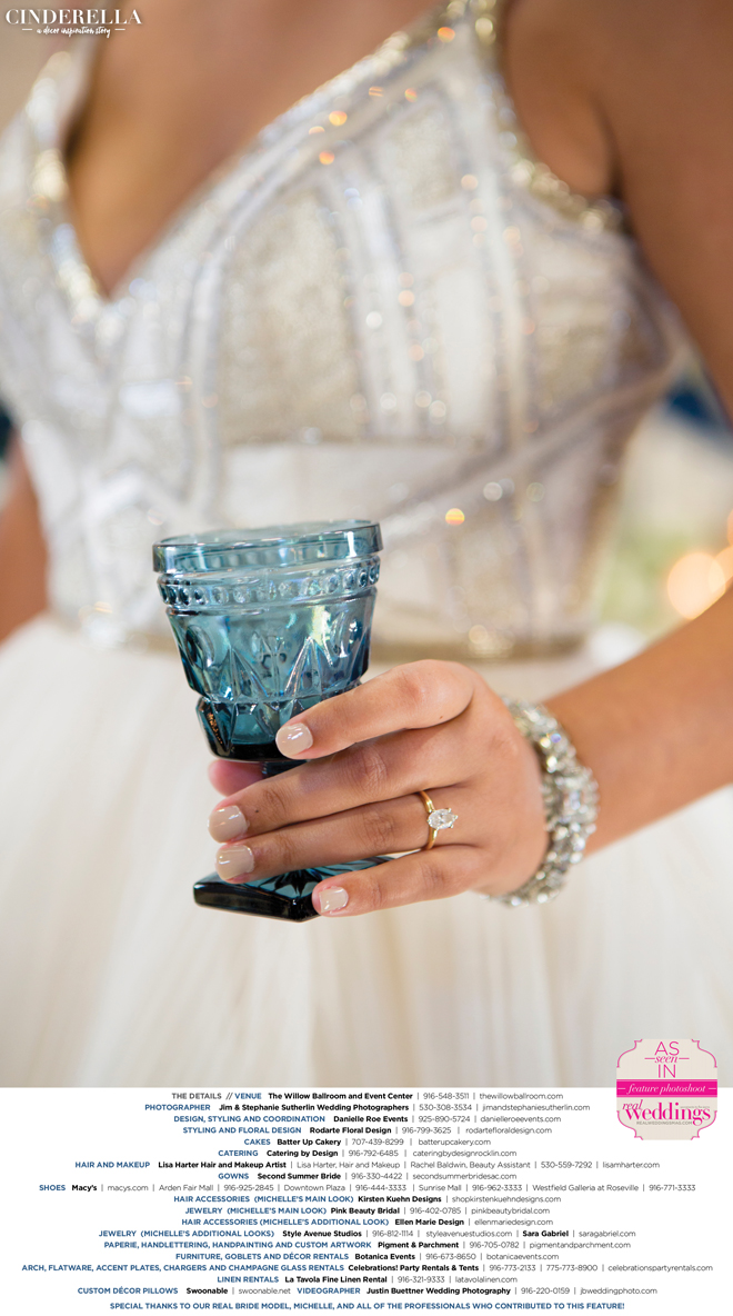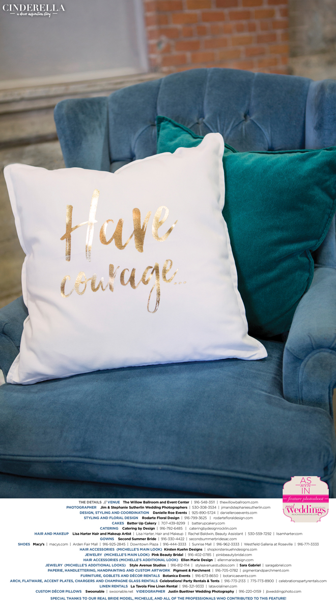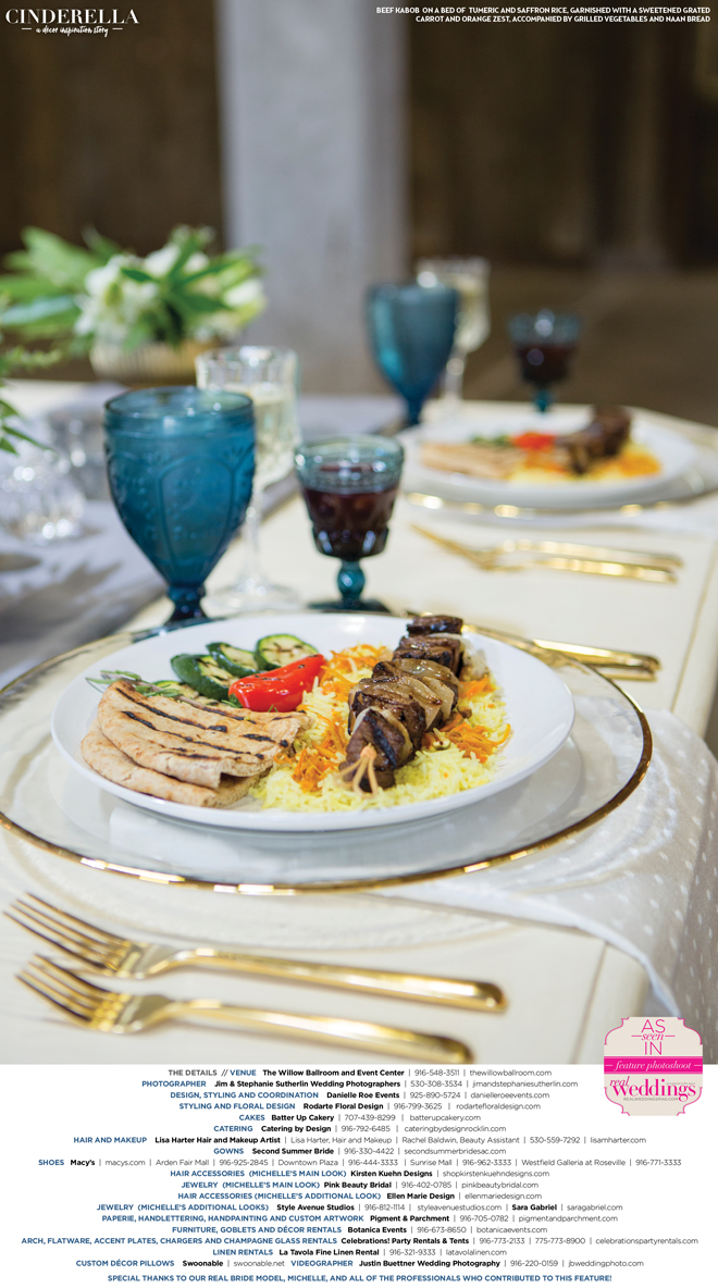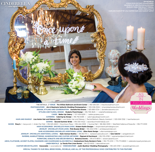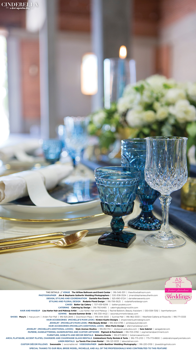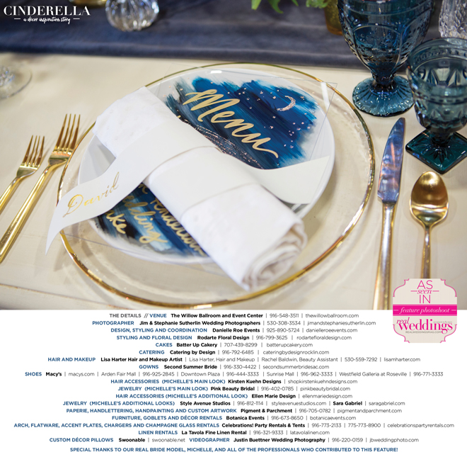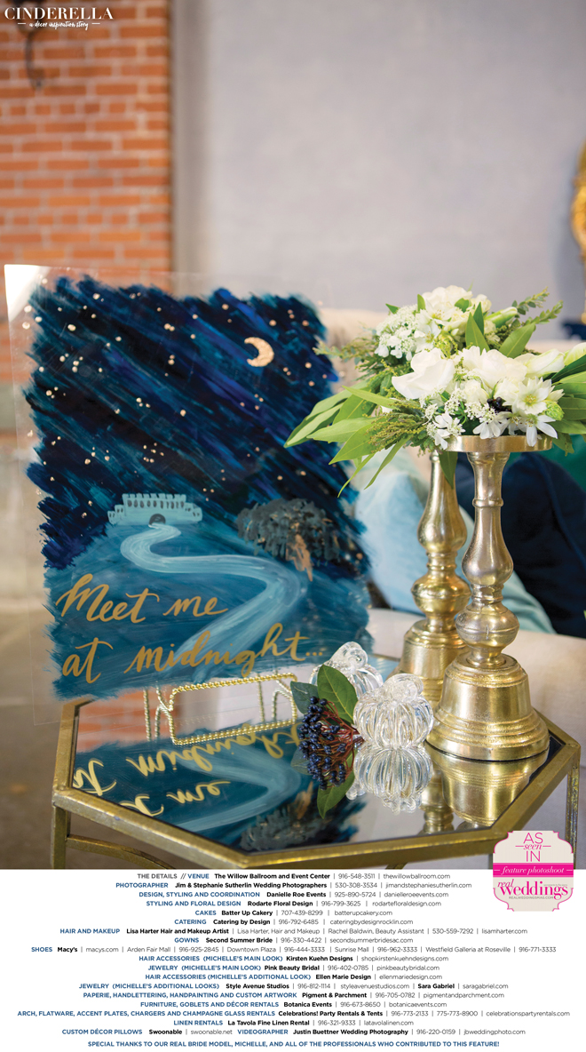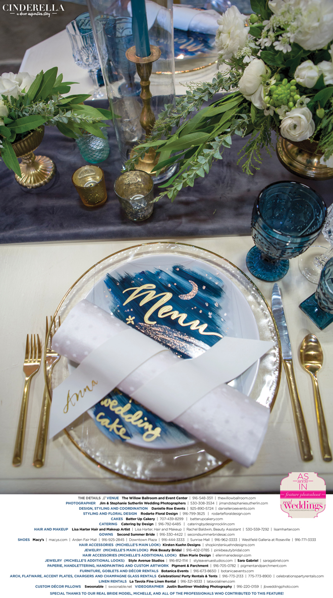 “Cinderella” was produced by Danielle Roe—Danielle Roe Events, DeAnn Rodarte—Rodarte Floral Design, Susie Baggett and Wendy Sipple—Real Weddings Magazine.