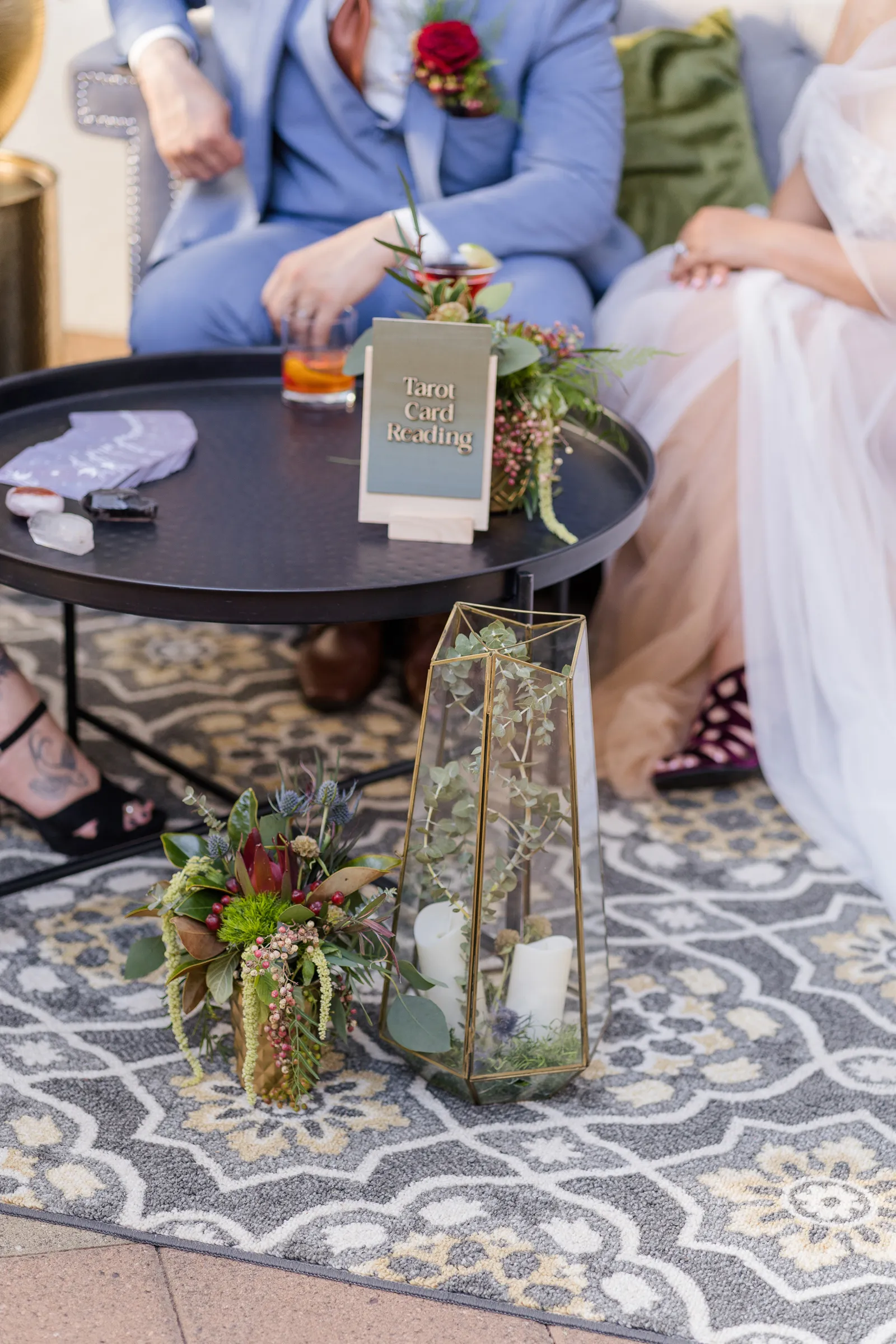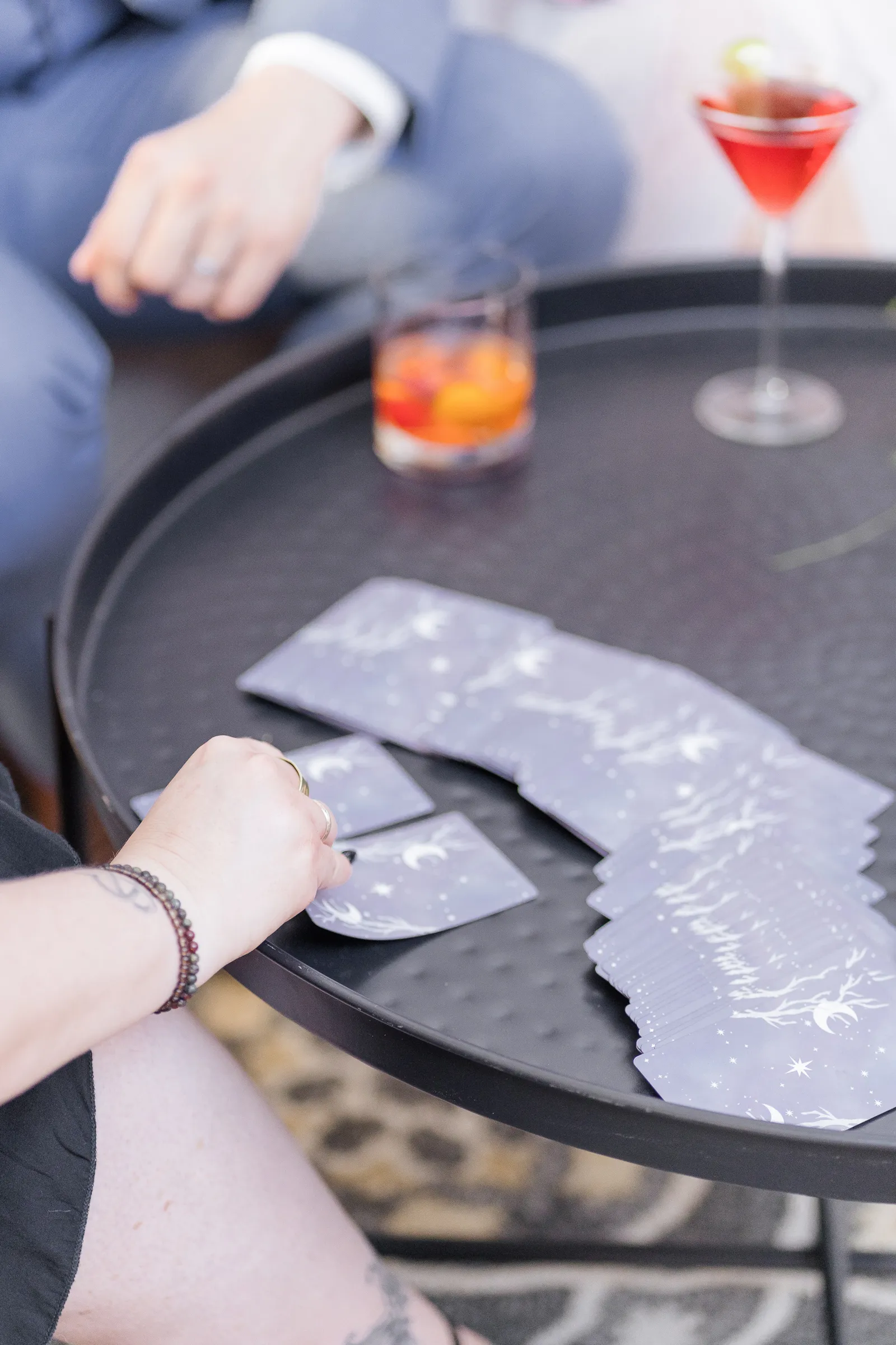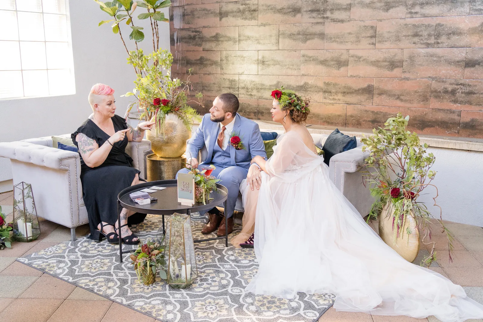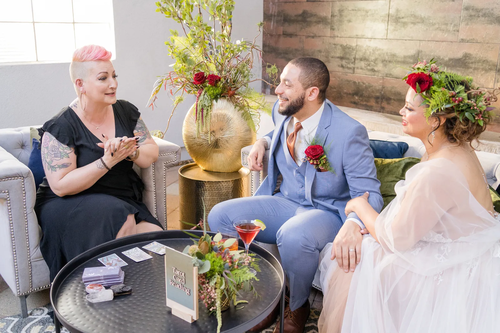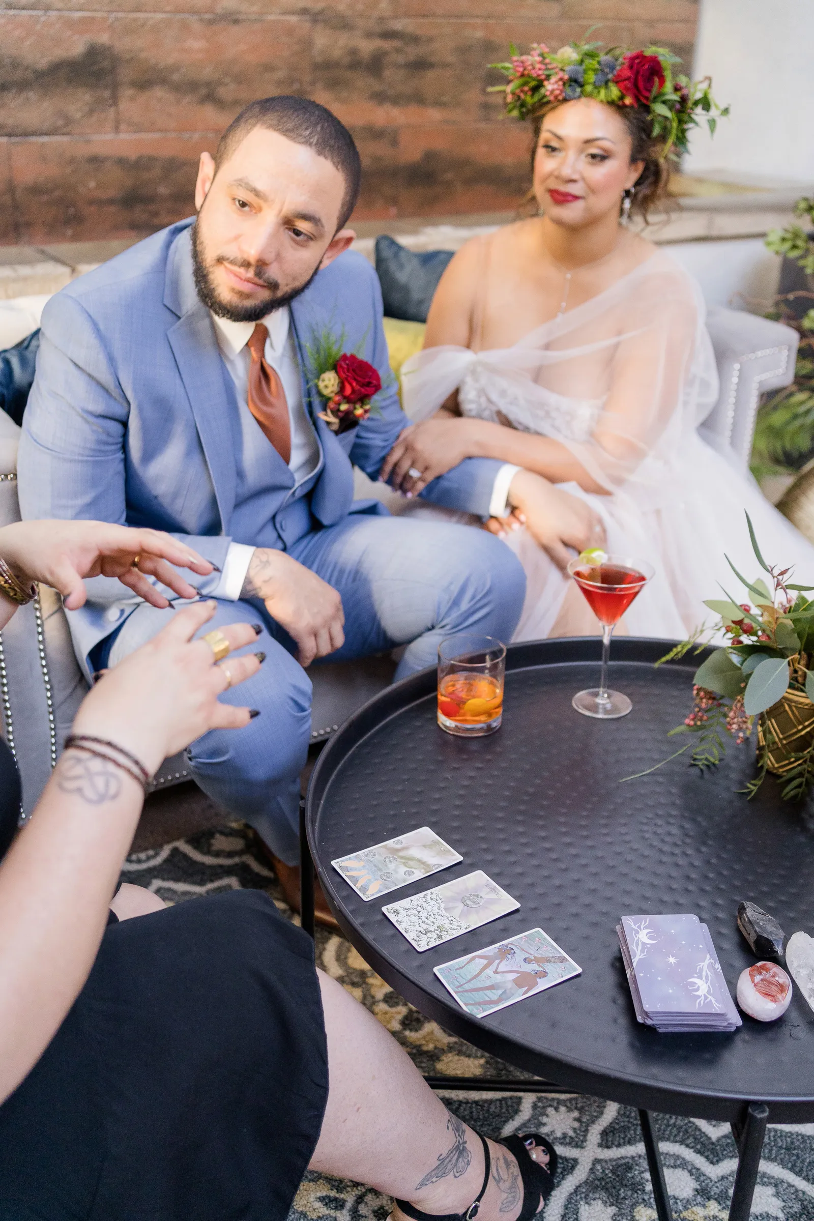 On the day of the shoot, we staged the live Tarot Reading in our beautifully-designed lounge set—complete with real cocktails for the couple (a cosmo for her and an old fashioned for him made by venue director Evan Shelby with The Atrium at Woodlake), and it was, well, enchanting and magical, not only for our real couple models Corina + Arlistel, but for our entire creative team!