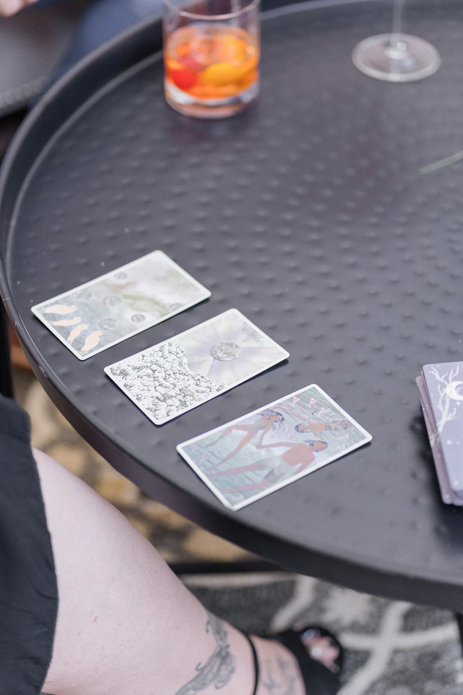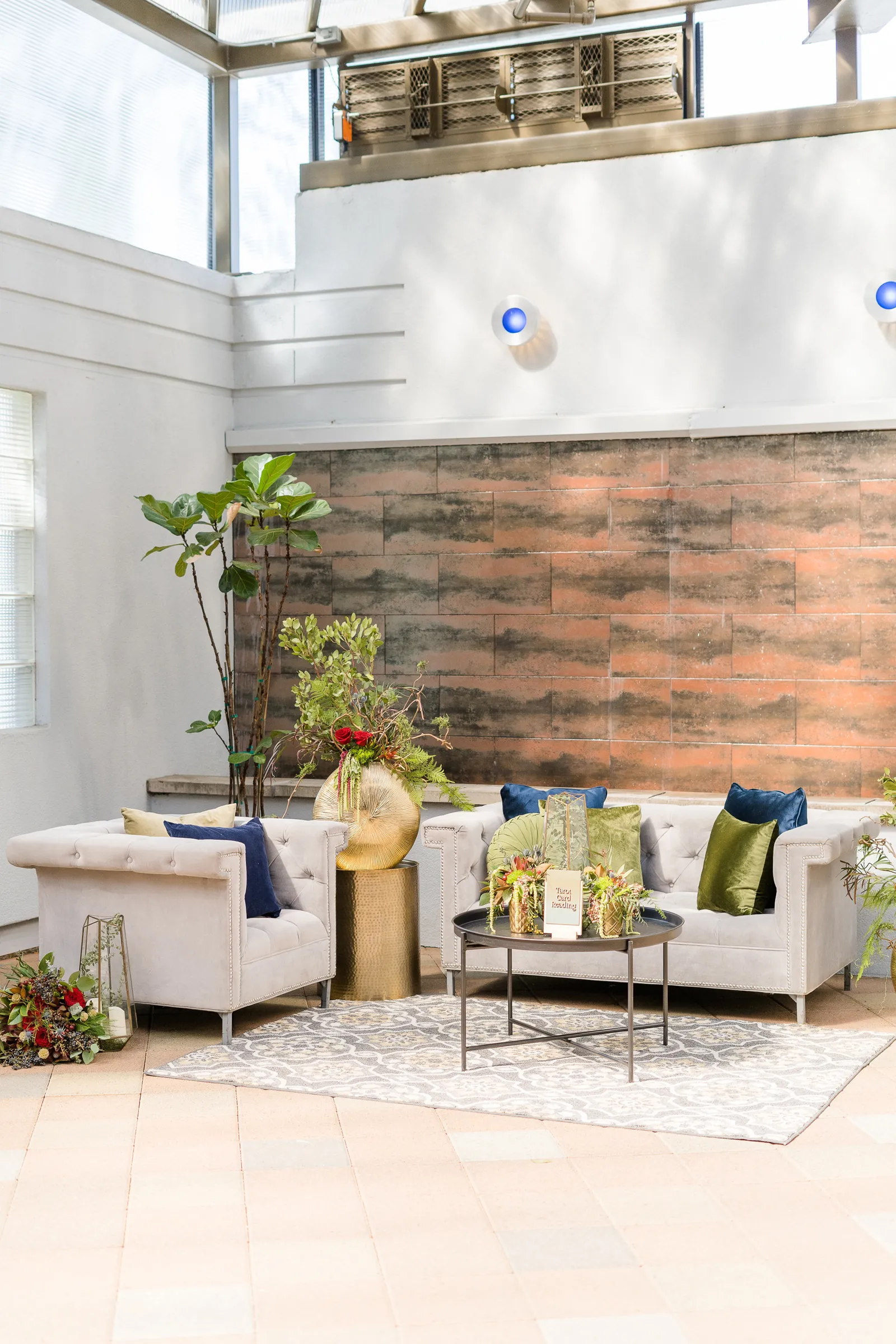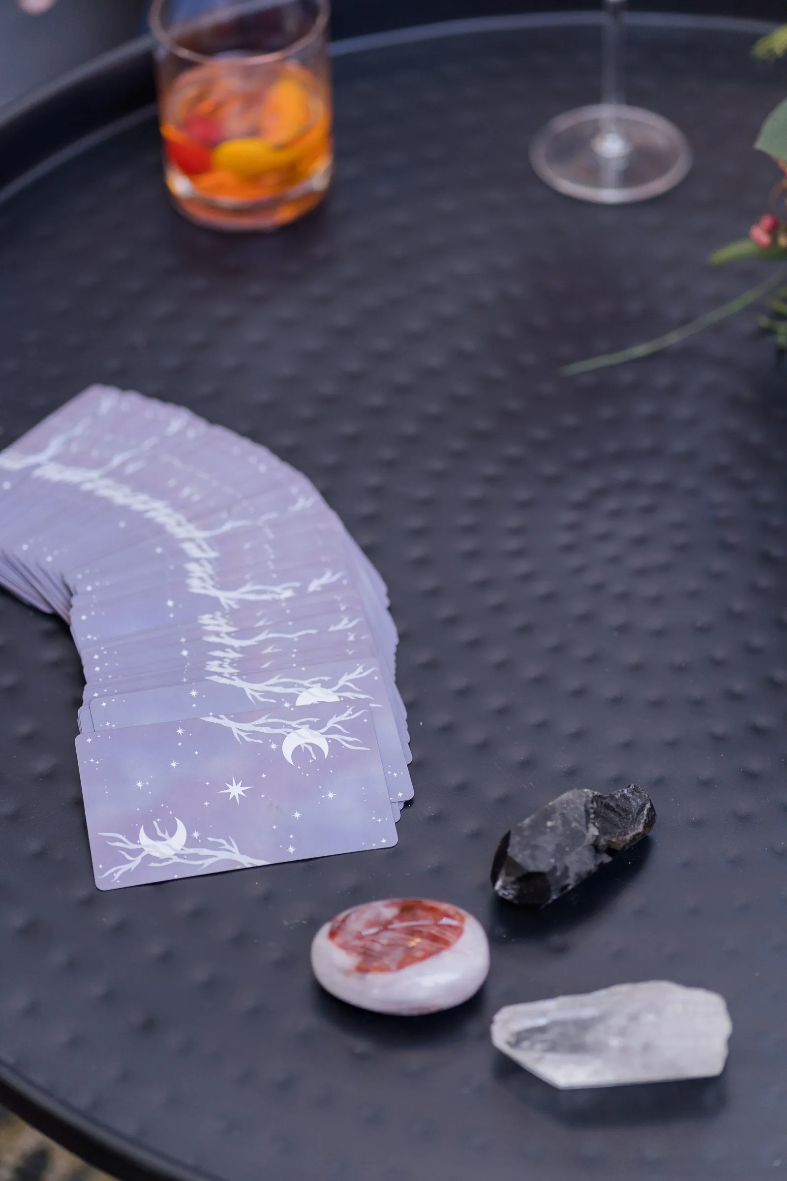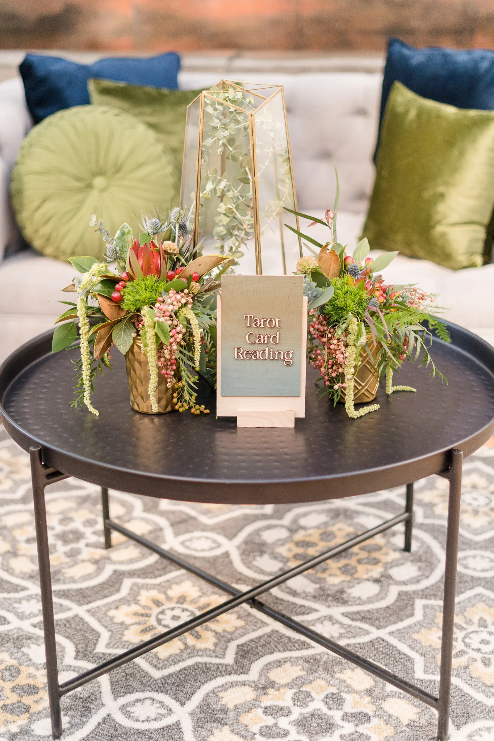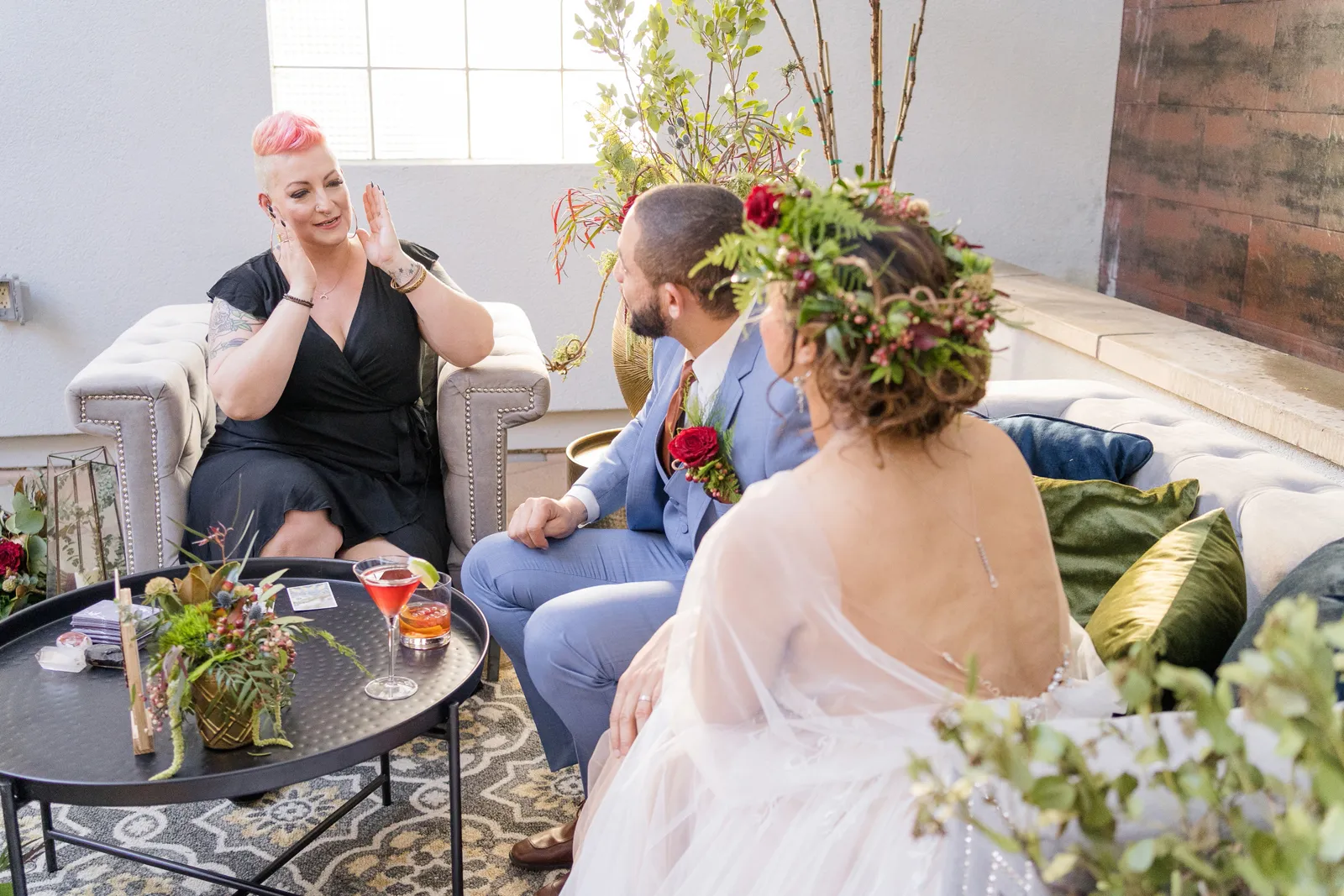 On the day of the shoot, we staged the live Tarot Reading in our beautifully-designed lounge set—complete with real cocktails for the couple (a cosmo for her and an old fashioned for him made by venue director Evan Shelby with The Atrium at Woodlake), and it was, well, enchanting and magical, not only for our real couple models Corina + Arlistel, but for our entire creative team!