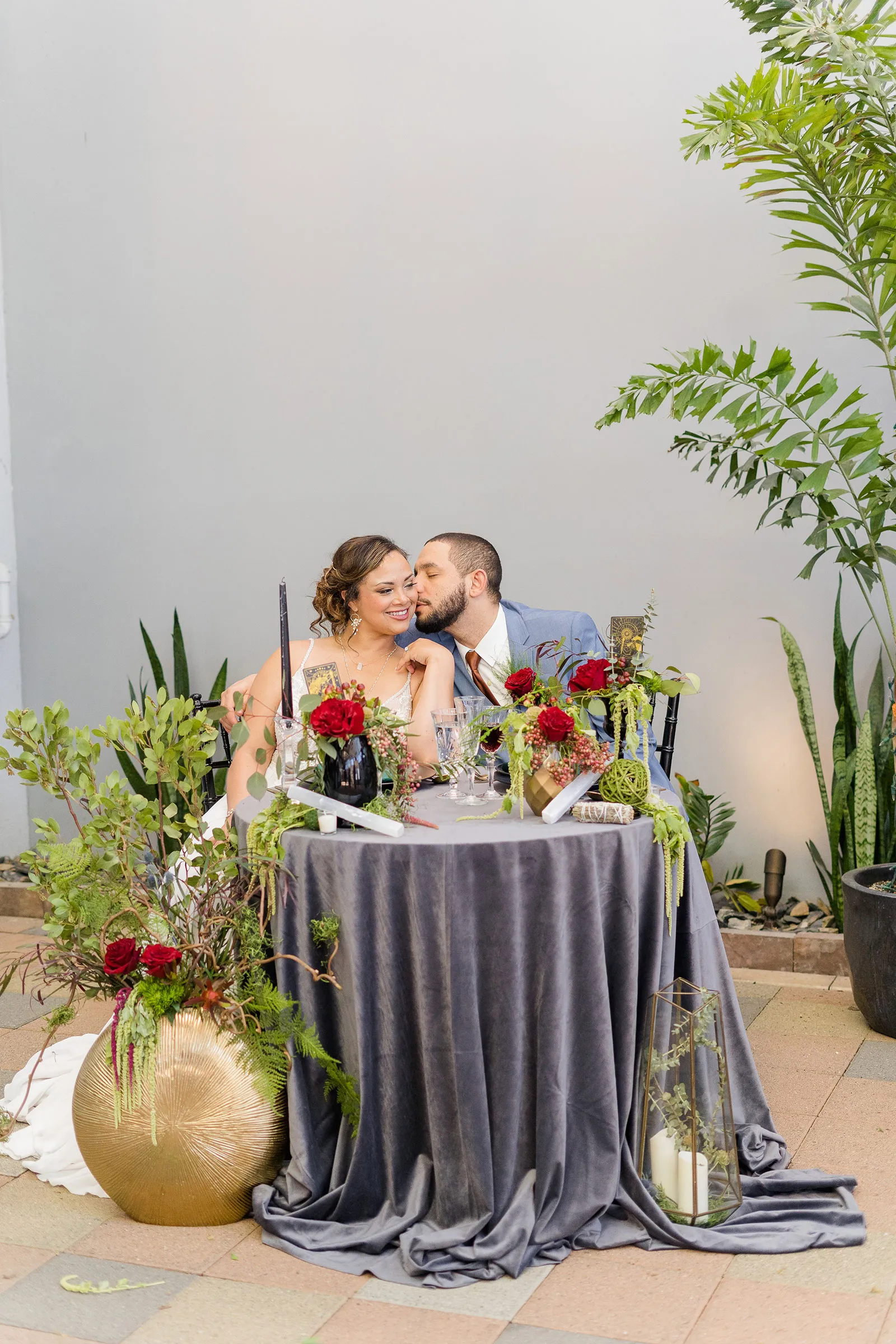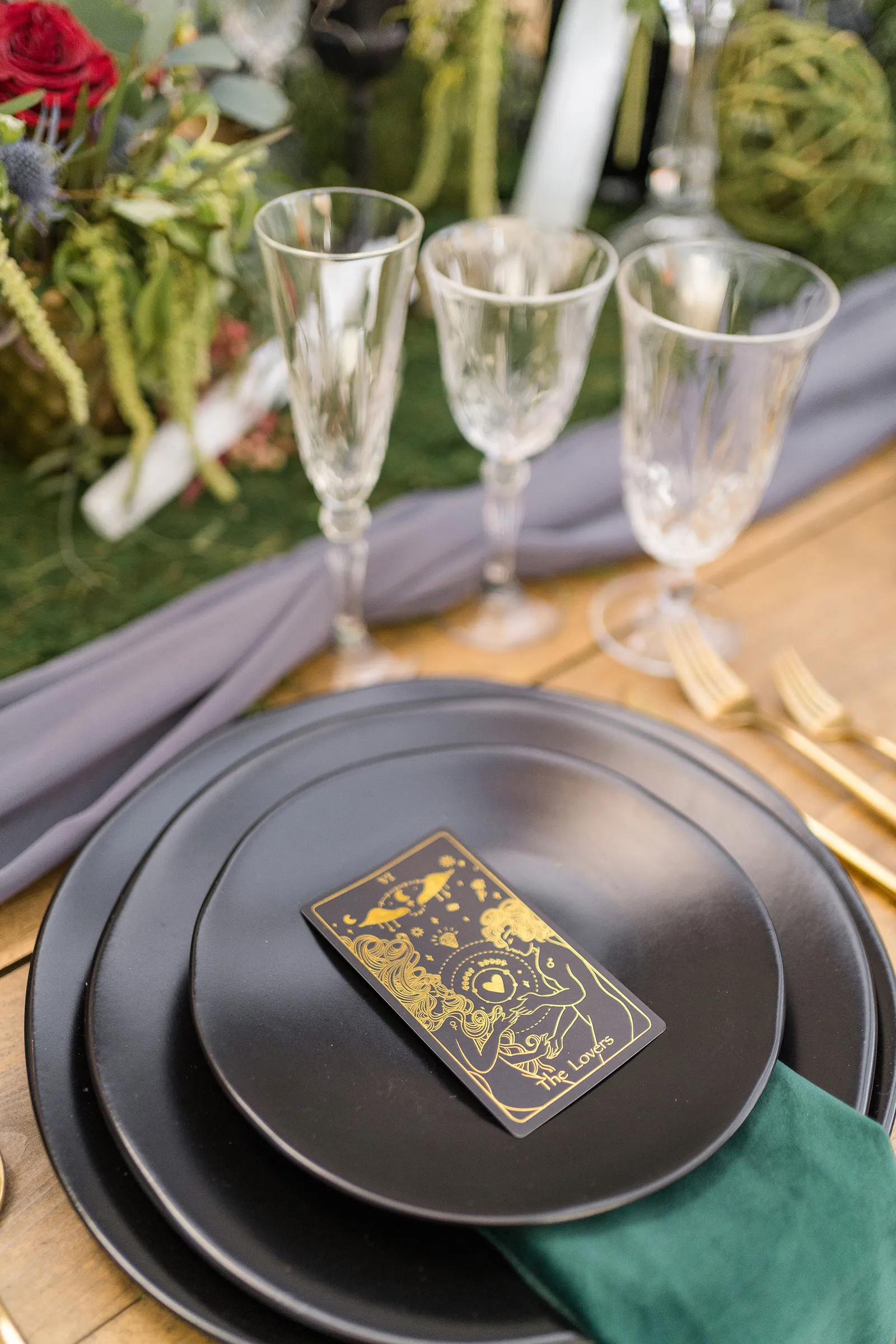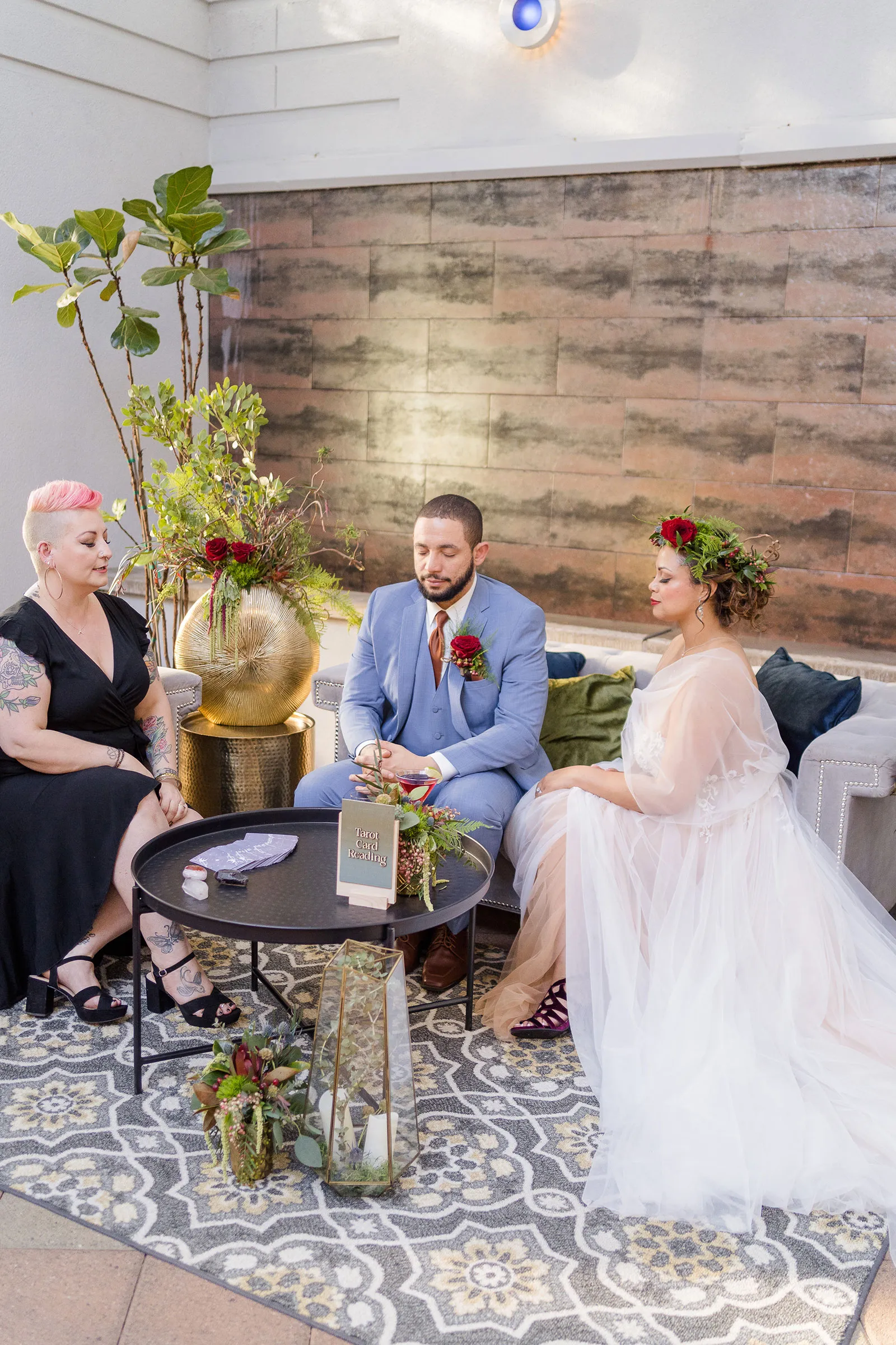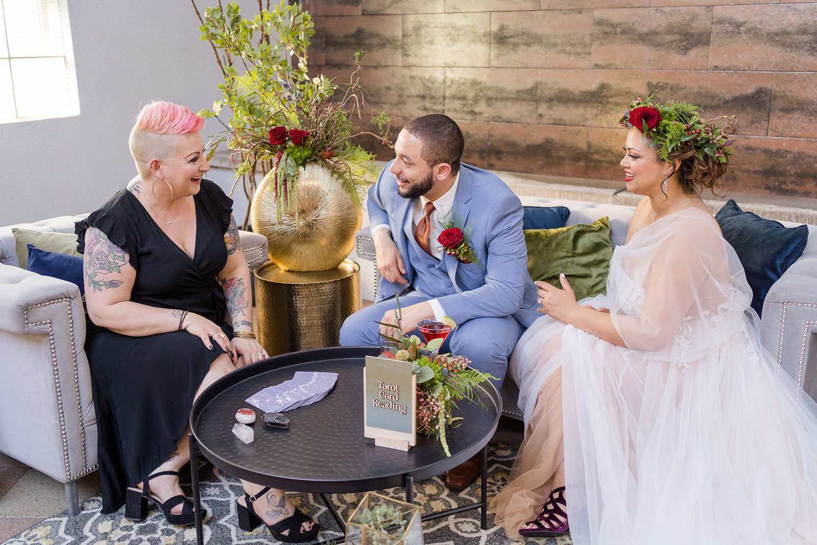 Is there anything more enchanting than vining flowers? Or deep hues of purple and green? Or a truly insightful tarot card reading? Nope! And lucky for you we have all those things (and more!) wrapped up into our “Enchanted Love” styled shoot! The vendor team was so into making this a magical experience for our real couple models, and they walked away feeling connected as newlyweds. Our job is done! Check out the layout from this gorgeous shoot.