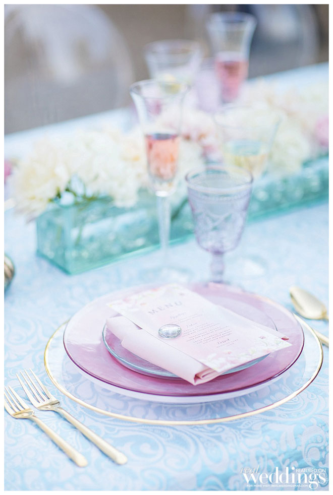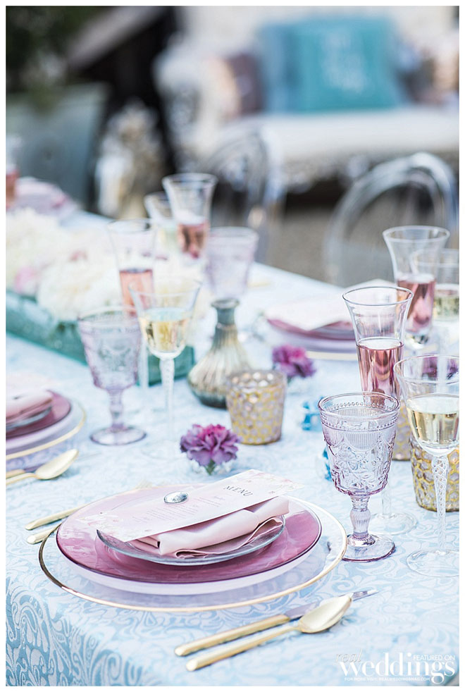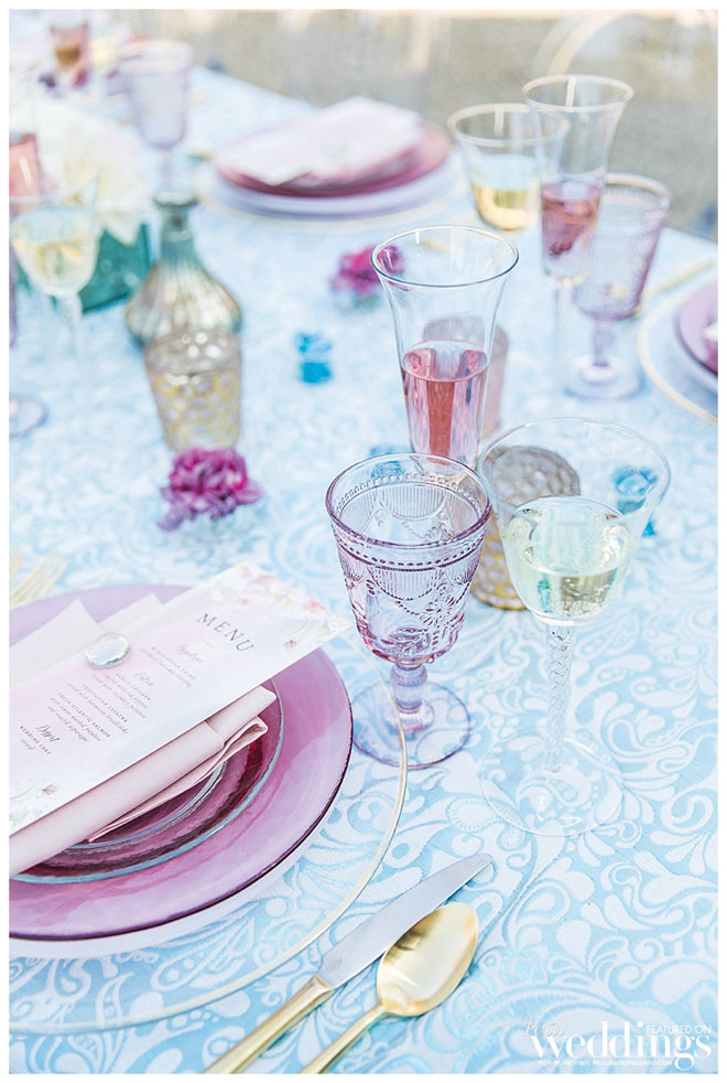 PINK DINNER PLATES, TOASTING FLUTES, BLUE GOBLETS, SPIRAL GLASSWARE, VASES, WHITE PILLARS, LARGE CANDELABRAS AND LOUNGE PILLOWS