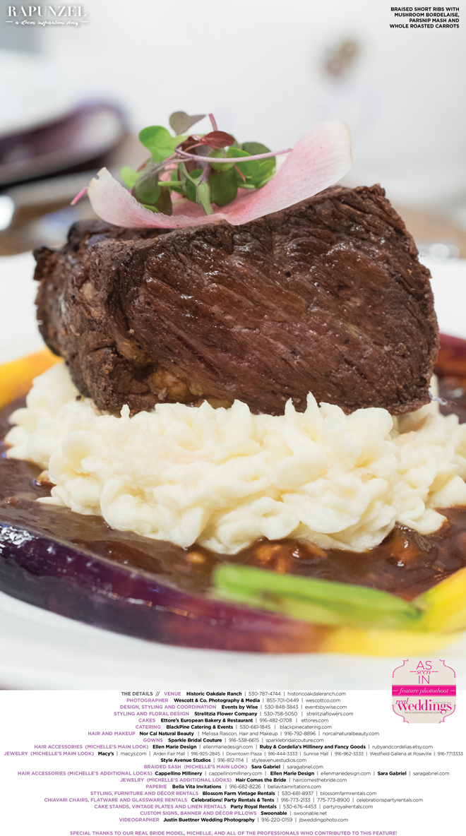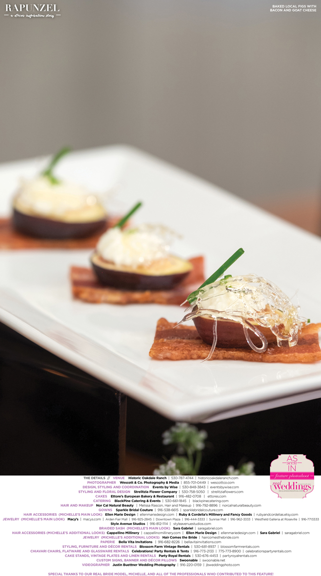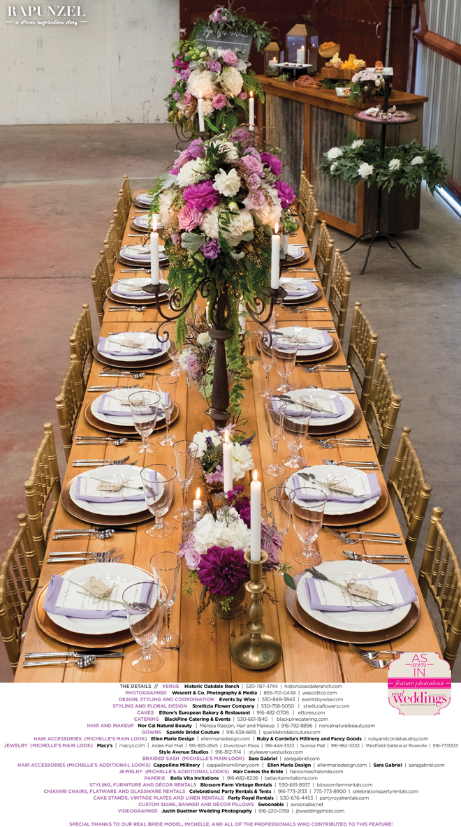 “Rapunzel” was produced by Shari Wise—Events by Wise, Kelly Peart—Blossom Farm Vintage Rentals, Letitia Martin—Strelitzia Flower Company, Susie Baggett and Wendy Sipple—Real Weddings Magazine.