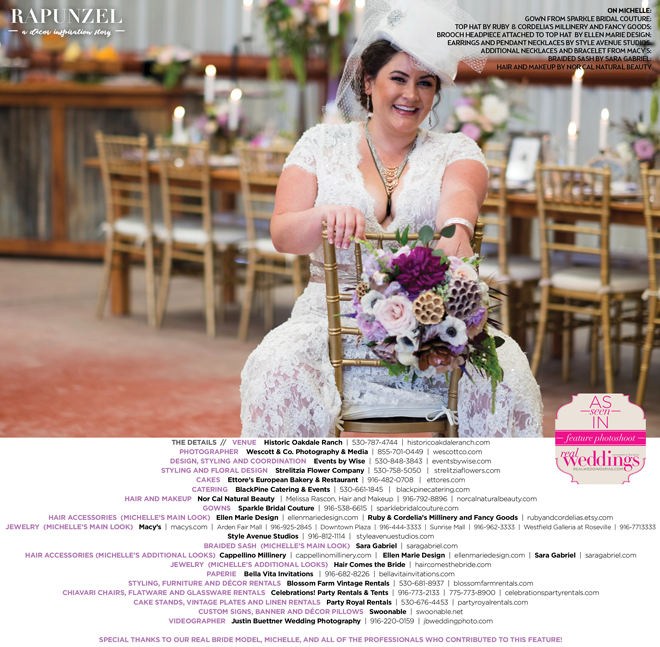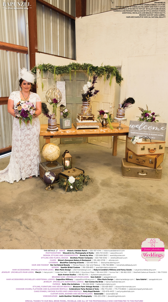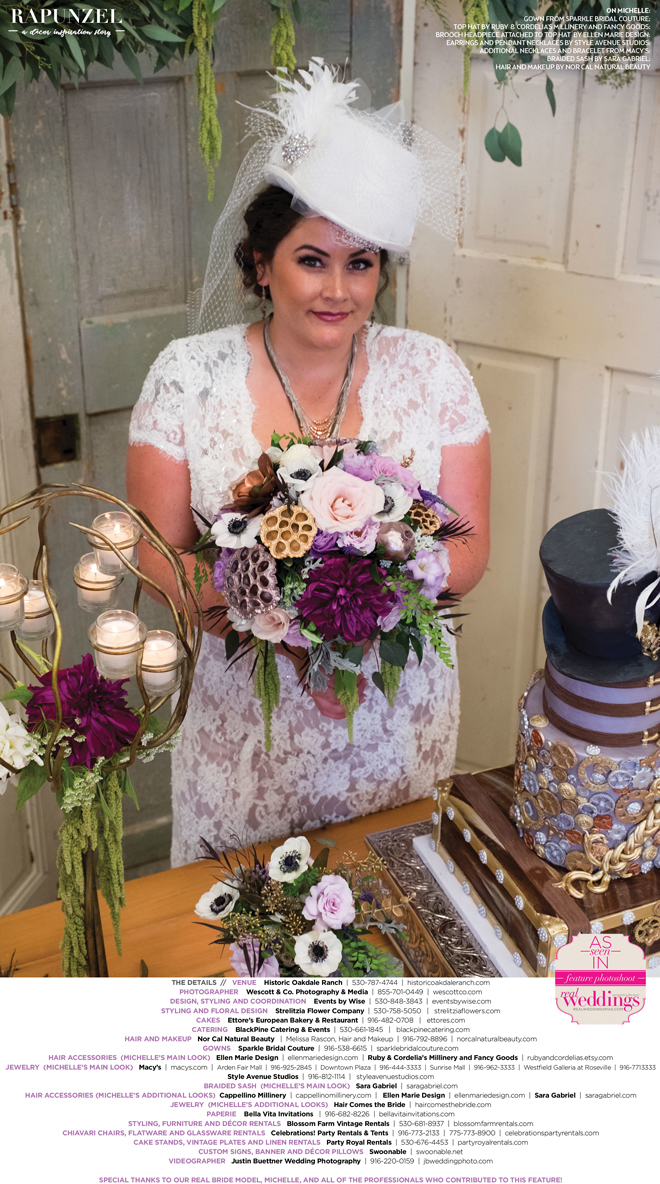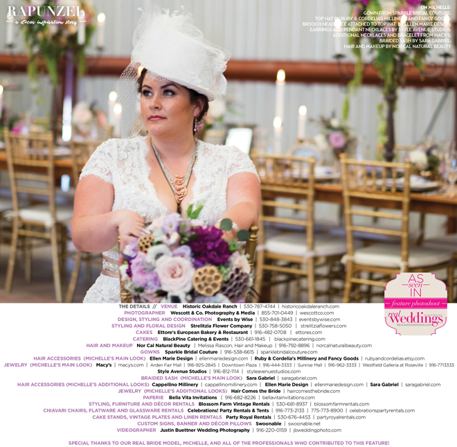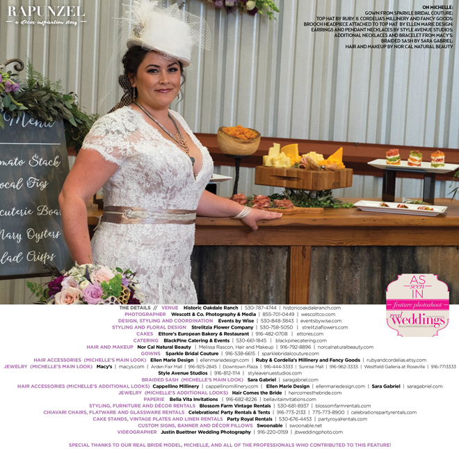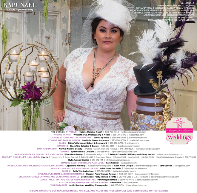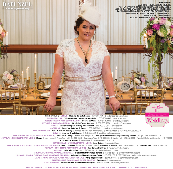“Rapunzel” was produced by Shari Wise—Events by Wise, Kelly Peart—Blossom Farm Vintage Rentals, Letitia Martin—Strelitzia Flower Company, Susie Baggett and Wendy Sipple—Real Weddings Magazine.